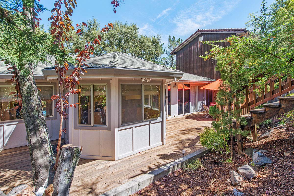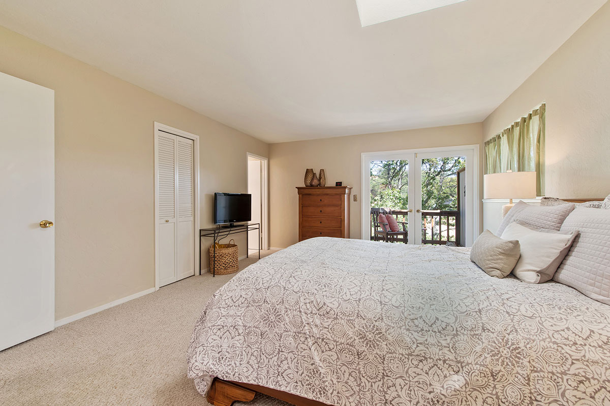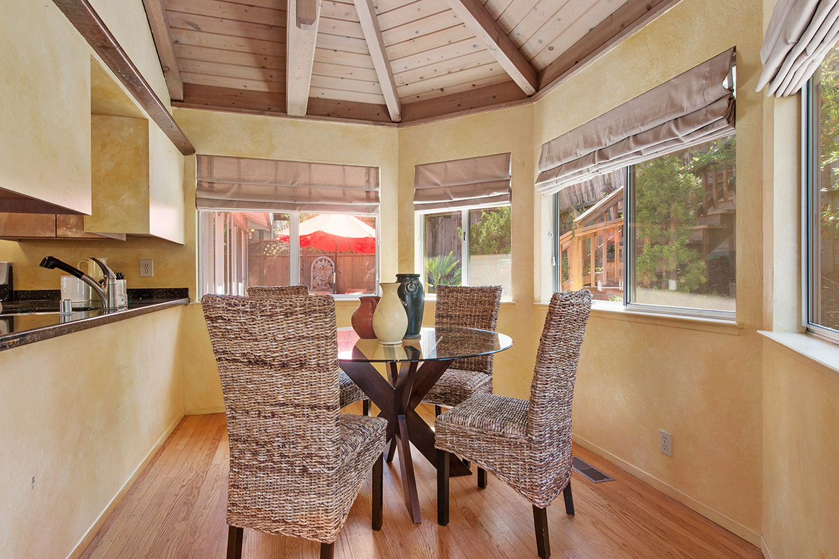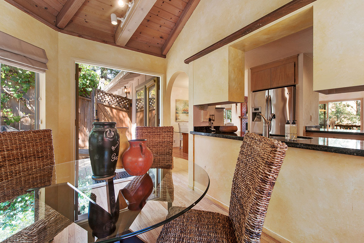 The;open and inviting living-dining room features a wood-burning fireplace and floor-to-ceiling sliding glass doors leading out to a deck with views of the valley and hills. The kitchen offers sleek granite counters, stainless steel appliances, wooden cabinetry, and a bright and cushy breakfast room with an exposed wood beam ceiling and French doors leading out to a deck-patio. Down the hall is a powder room, and the front entryway including a coat closet and stairway leading to the lower level. Additionally, at this level is a private;master suite comprised of two adjoined rooms, a full master bath, a small private viewing deck, along with glass doors that open to the front deck. The charming front garden and deck-patio is perfect for outdoor dining and barbecuing. The attached two-car garage has storage space overhead, and a separate exercise room with sliding glass doors opening to a deck with views.;