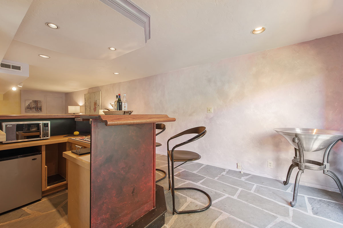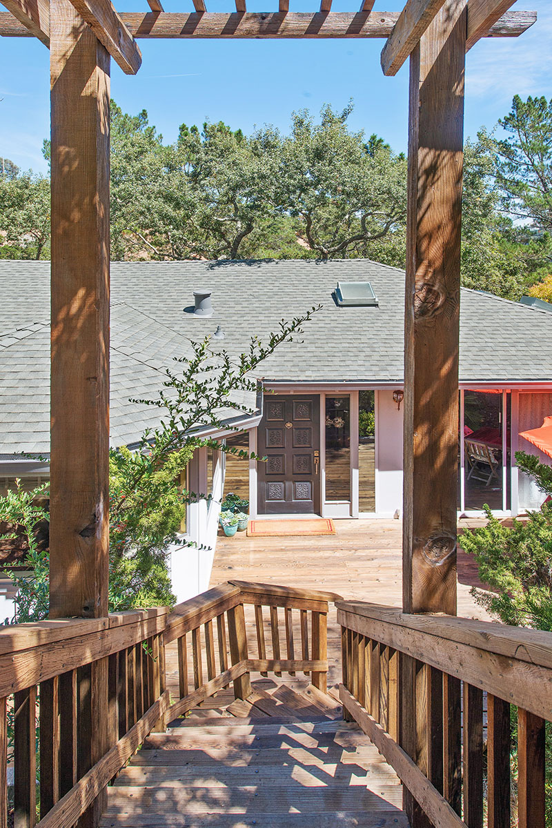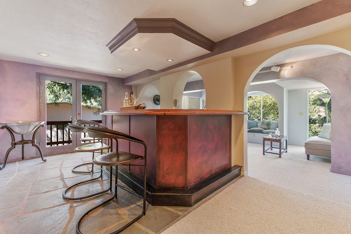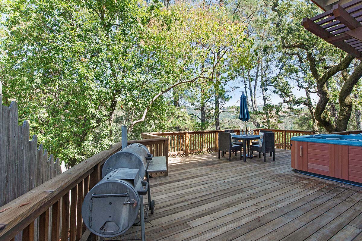 The;open and inviting living-dining room features a wood-burning fireplace and floor-to-ceiling sliding glass doors leading out to a deck with views of the valley and hills. The kitchen offers sleek granite counters, stainless steel appliances, wooden cabinetry, and a bright and cushy breakfast room with an exposed wood beam ceiling and French doors leading out to a deck-patio. Down the hall is a powder room, and the front entryway including a coat closet and stairway leading to the lower level. Additionally, at this level is a private;master suite comprised of two adjoined rooms, a full master bath, a small private viewing deck, along with glass doors that open to the front deck. The charming front garden and deck-patio is perfect for outdoor dining and barbecuing. The attached two-car garage has storage space overhead, and a separate exercise room with sliding glass doors opening to a deck with views.;