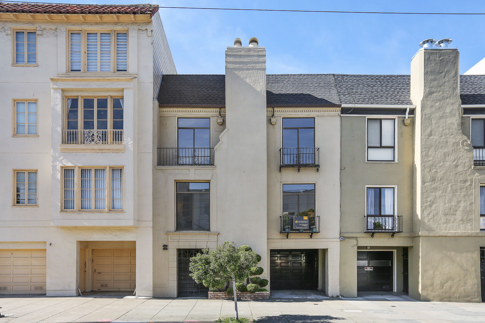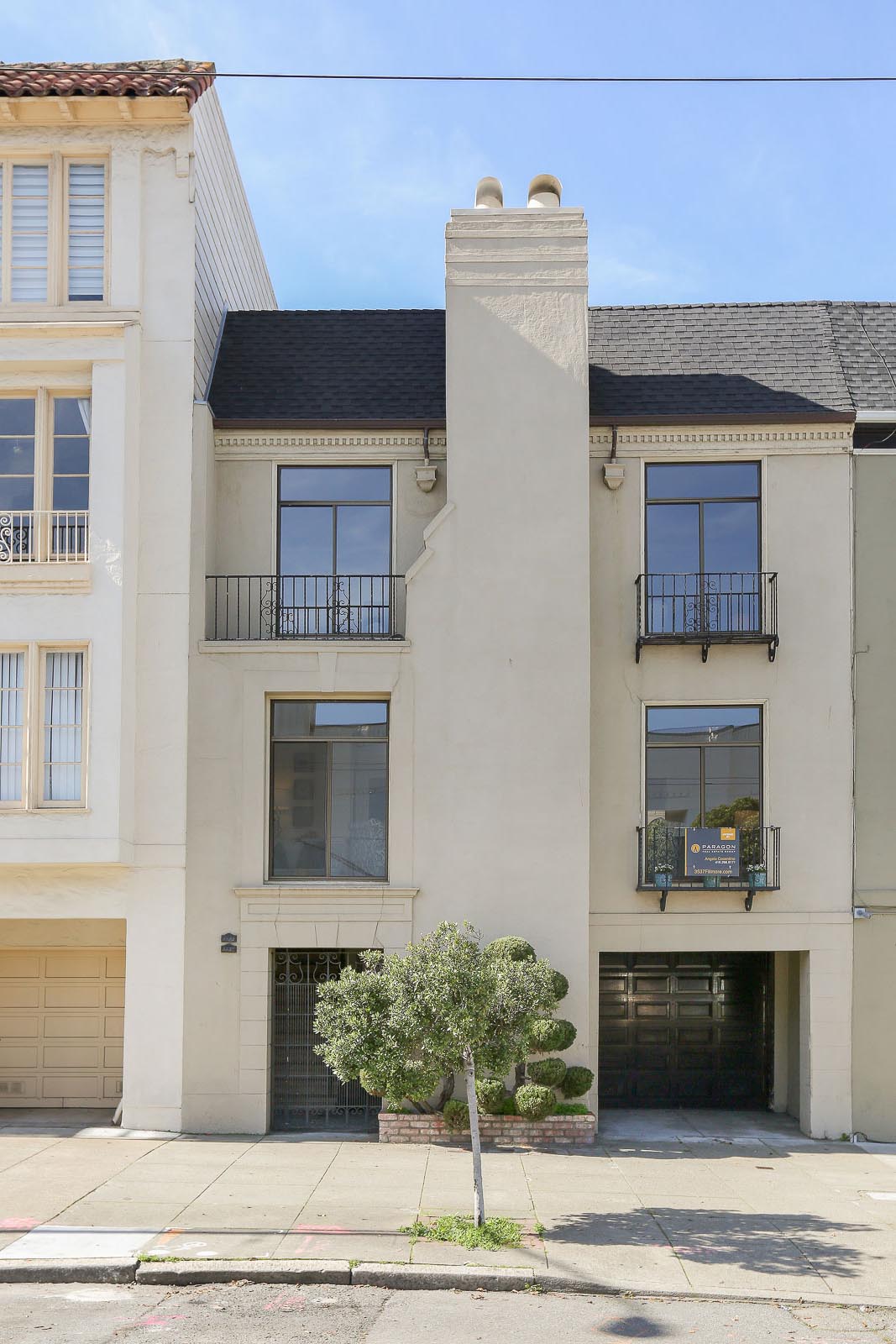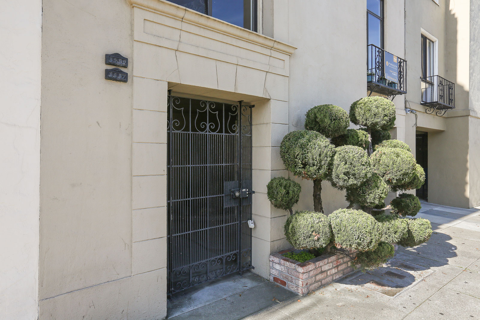 3537 Fillmore Street has an elegant front entry gate forged of wrought iron;and a welcoming entry area. Additionally, the property has a three-car garage, a laundry area, storage, an interior stairwell and an elevator, and a charming garden with a patio. The front windows feature delicate wrought iron garden balconies, adding to the overall charm of the property.