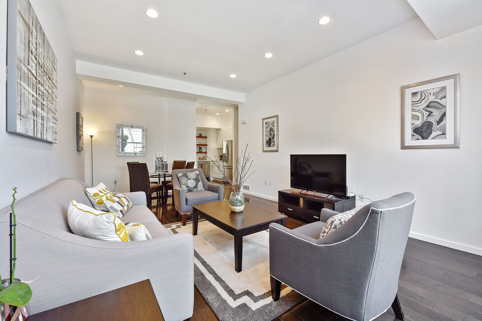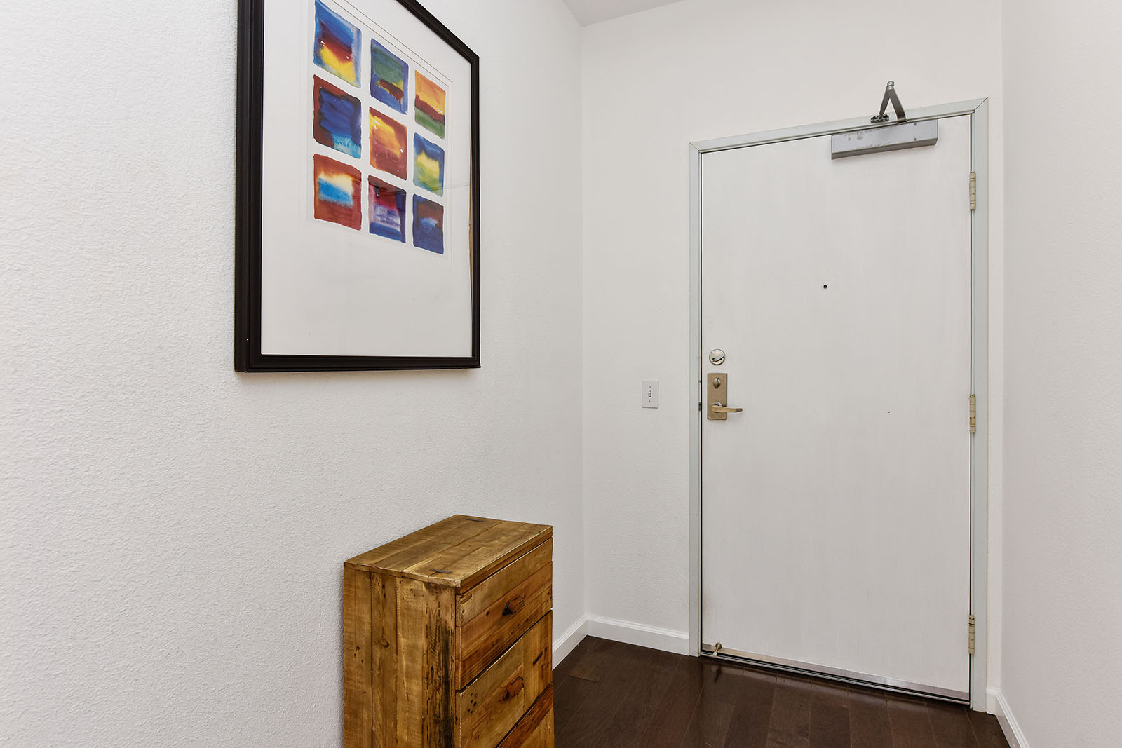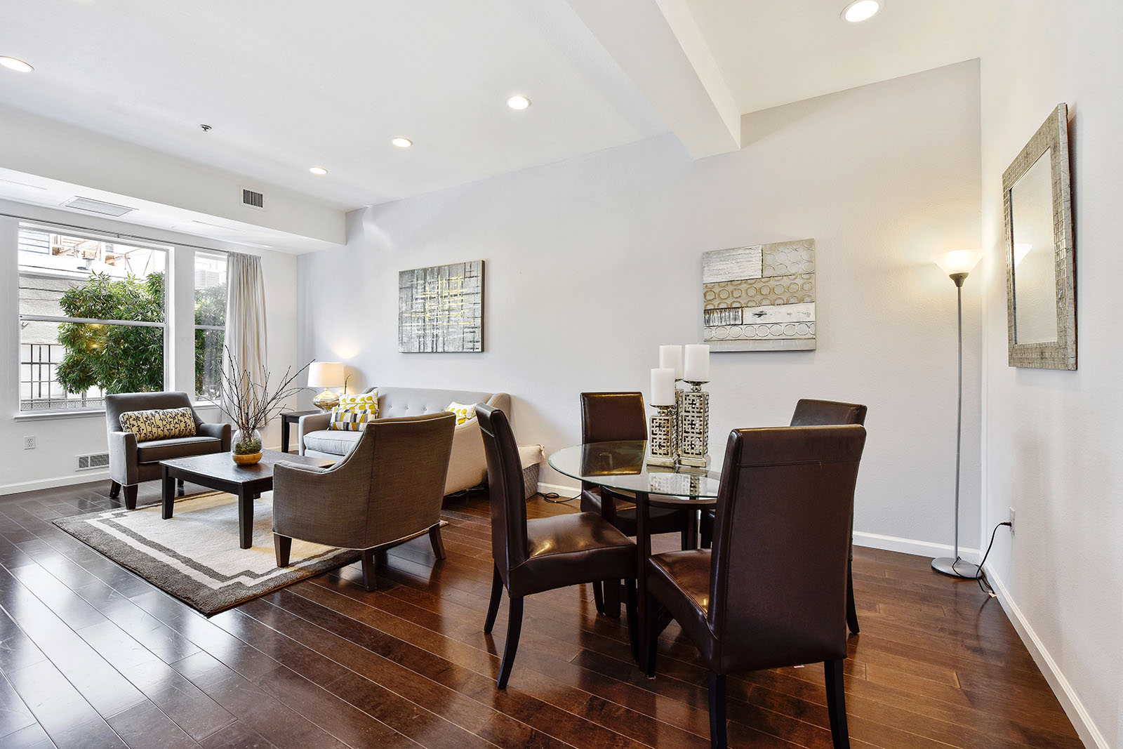 This stylish condo offers refined modern living in the sought-after trendy neighborhood of SOMA near Hayes Valley, San Francisco. The newly modernized interior boasts vaulted ceilings, rich espresso toned floors, and striking kitchen and bath amenities.