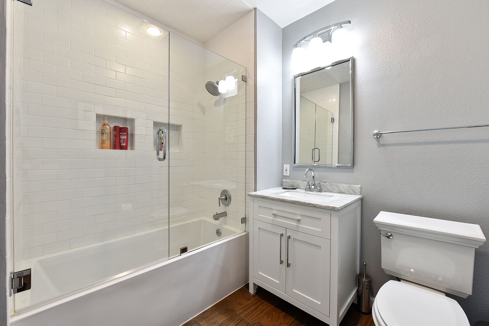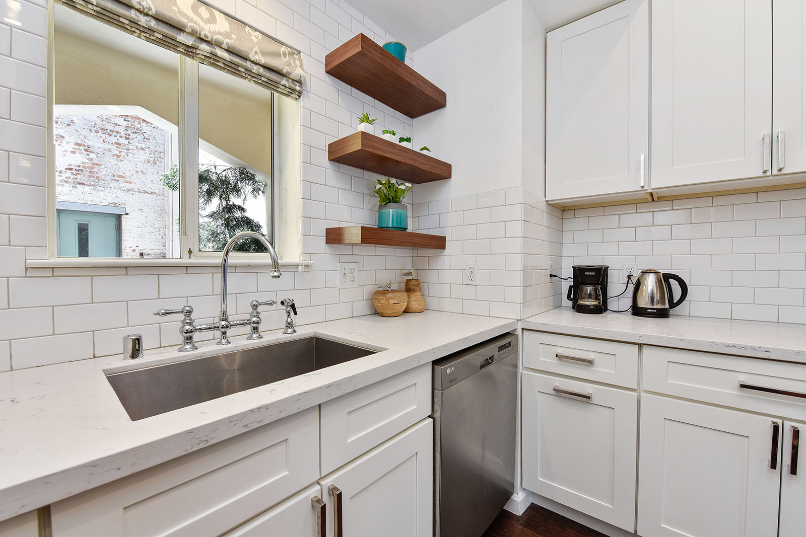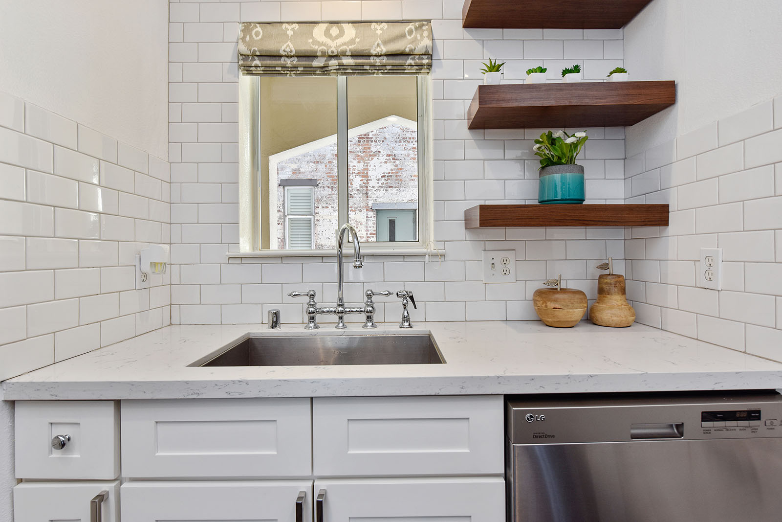 The state-of-the-art kitchen includes classic white-on-white subway tile with bright white cabinets, quartz countertops, wooden accent shelves, and stainless steel appliances. Both bathrooms feature white subway tile and Carrera marble topped vanities, and the full bath has a frameless glass shower enclosure over the bathtub and a rainfall shower head. The open and inviting living-dining room has vaulted ceilings and recessed lighting, and the spacious bedrooms offer high ceiling fans and lots of natural light. You'll fall in love with the comfortable, convenient lifestyle this condo affords.;