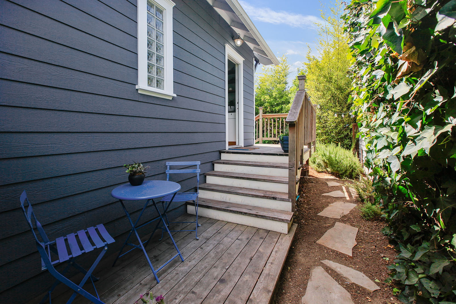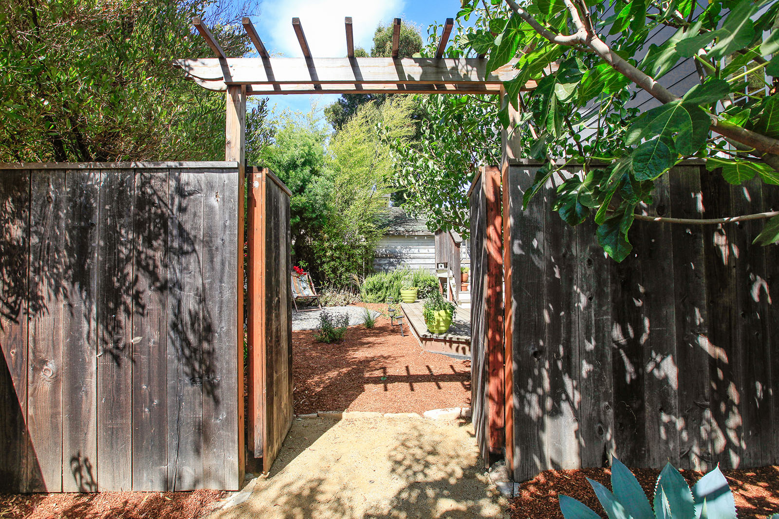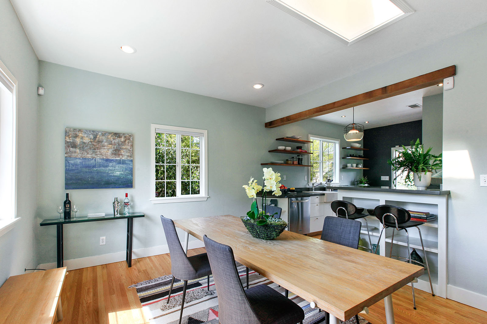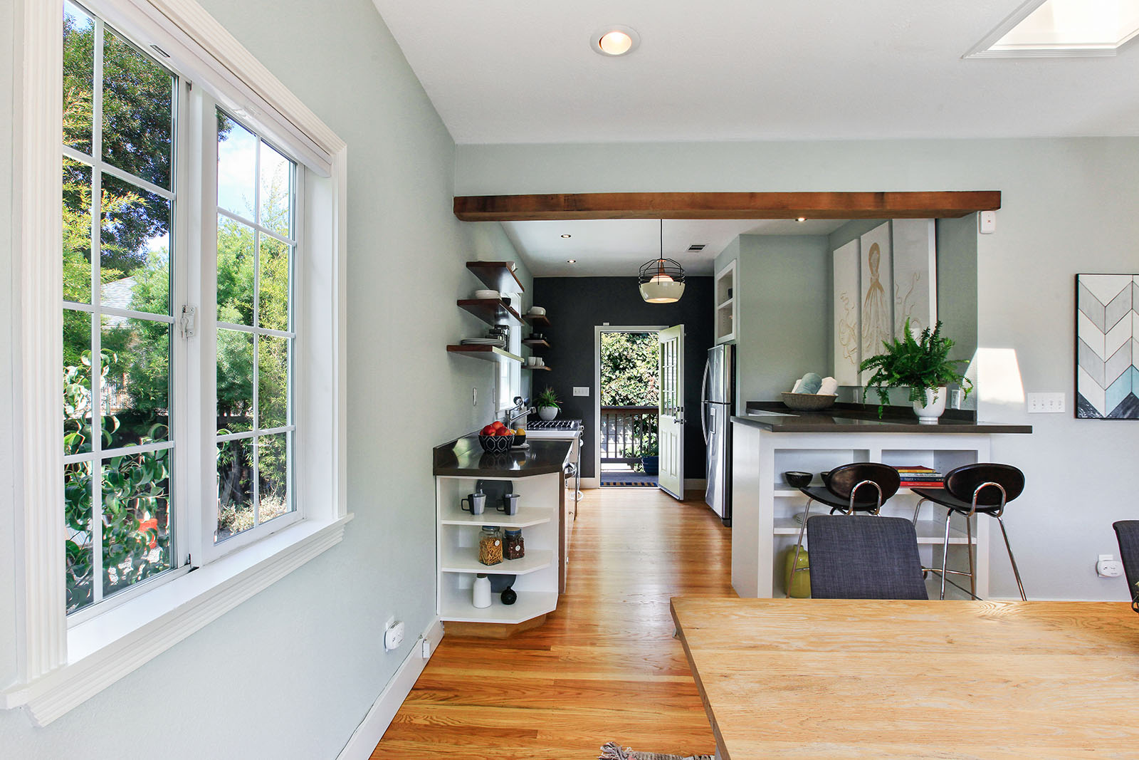 Remodeled and modern bungalow with dual pane windows and wood floors throughout. Sunny and open floorplan, tall ceilings with an appropriately placed skylight. Seamless connection between the living and large dining area. Spacious light-filled bedroom has a walk-in closet. Sensational bathroom with an Indonesian teak doors entryway, handsome wall mounted sink and claw foot tub.