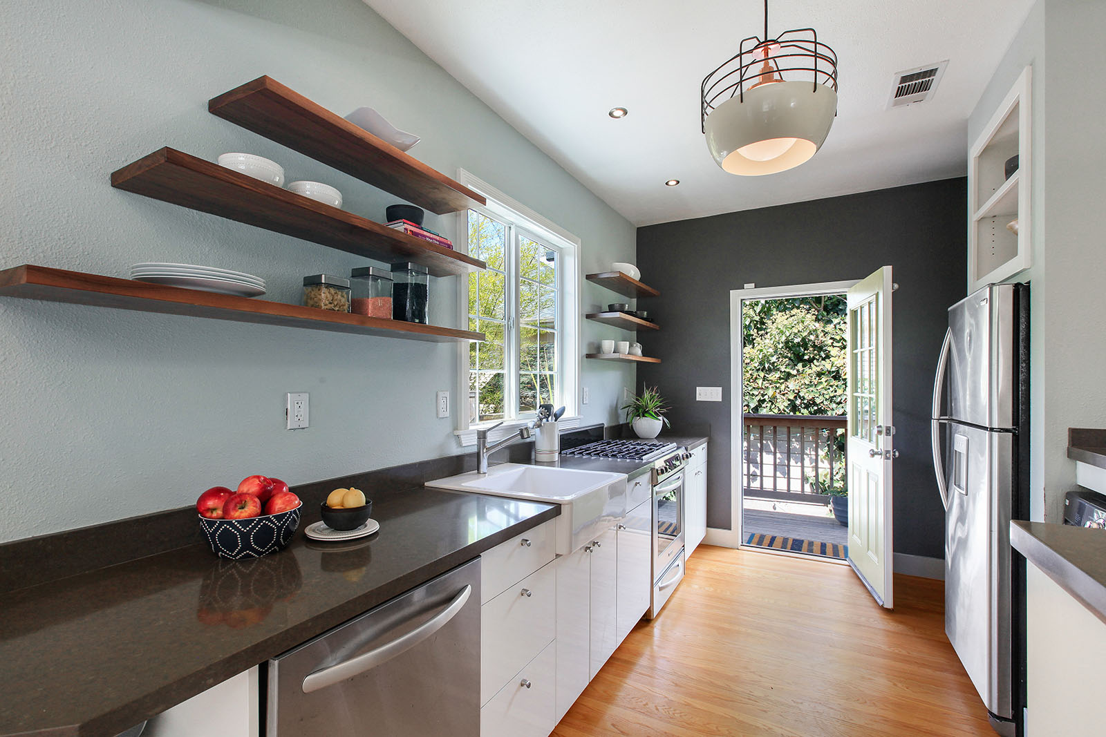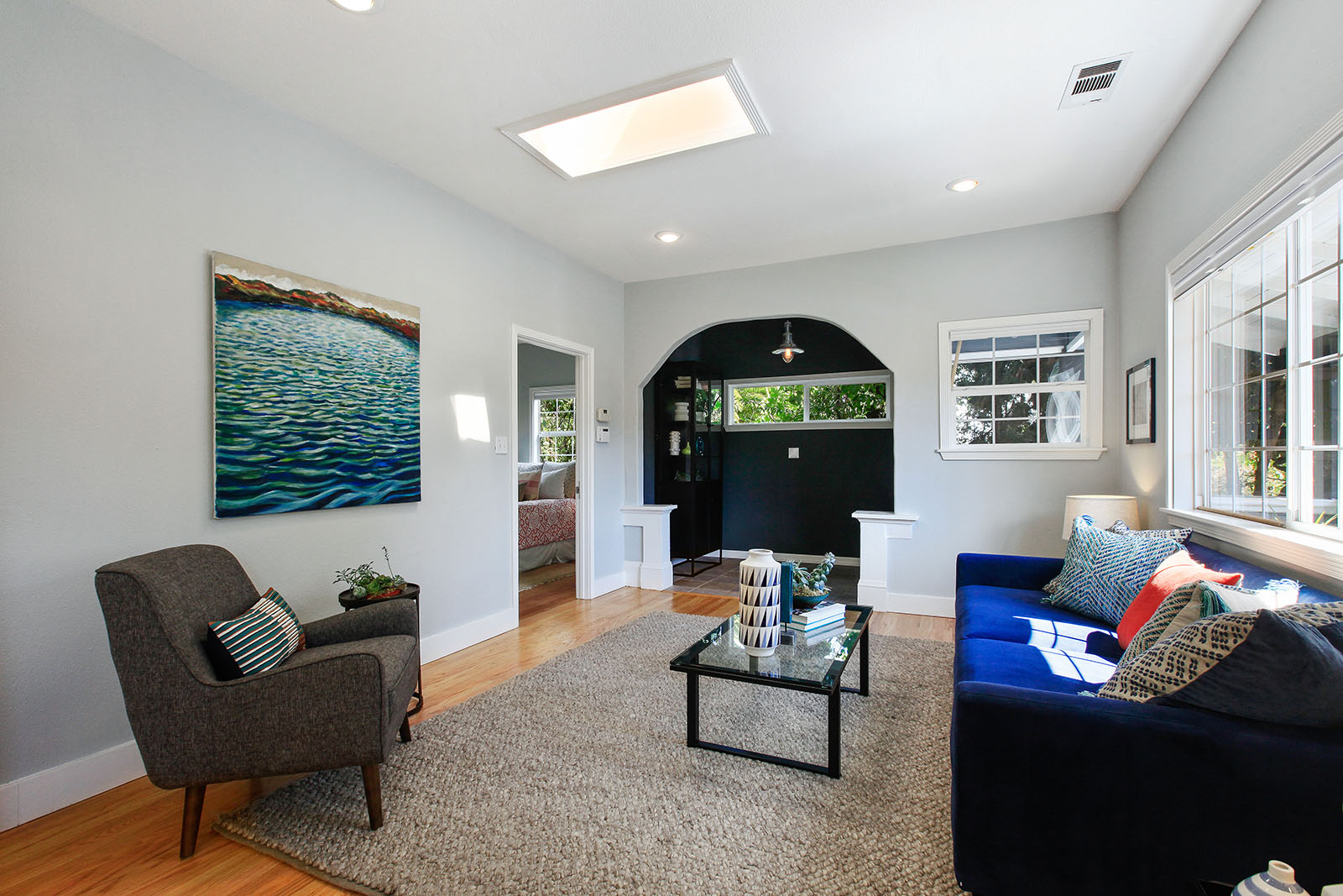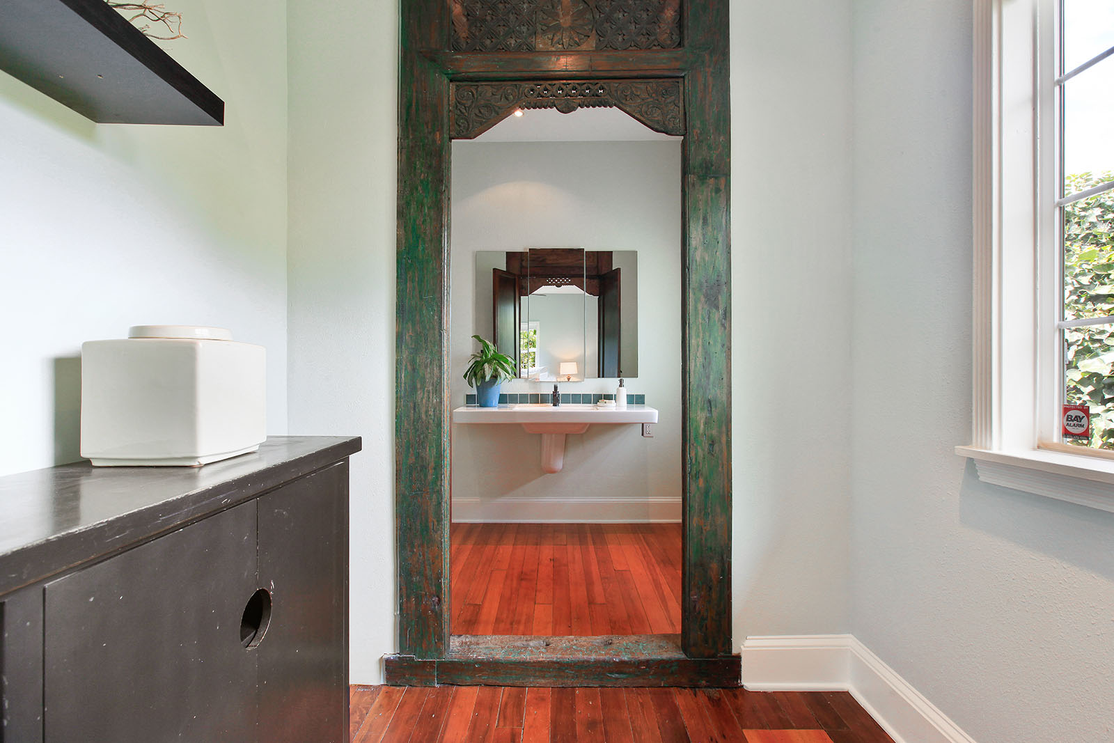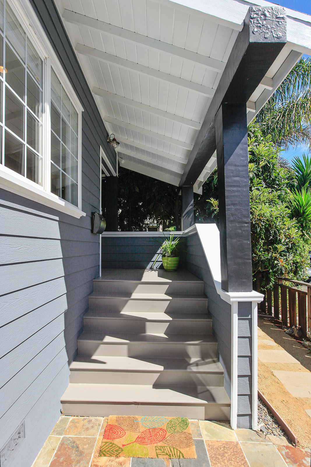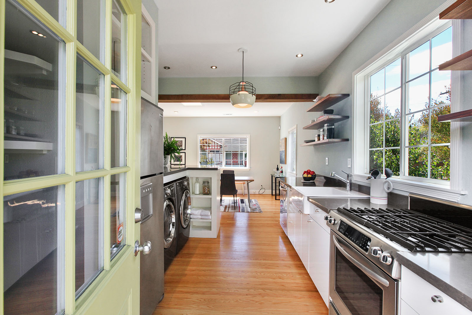 Remodeled and modern bungalow with dual pane windows and wood floors throughout. Sunny and open floorplan, tall ceilings with an appropriately placed skylight. Seamless connection between the living and large dining area. Spacious light-filled bedroom has a walk-in closet. Sensational bathroom with an Indonesian teak doors entryway, handsome wall mounted sink and claw foot tub.