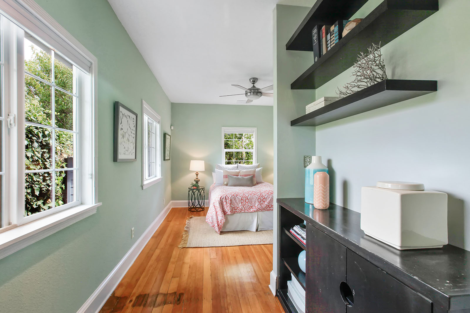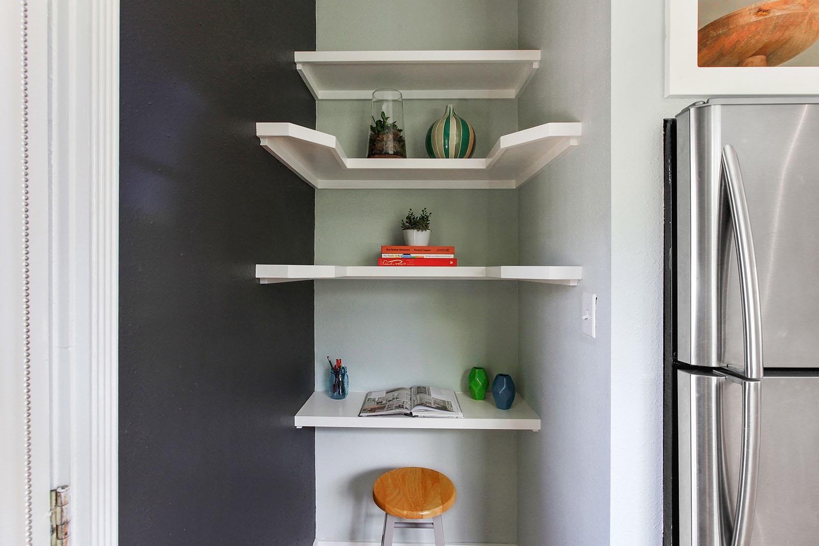 - Custom walnut shelving