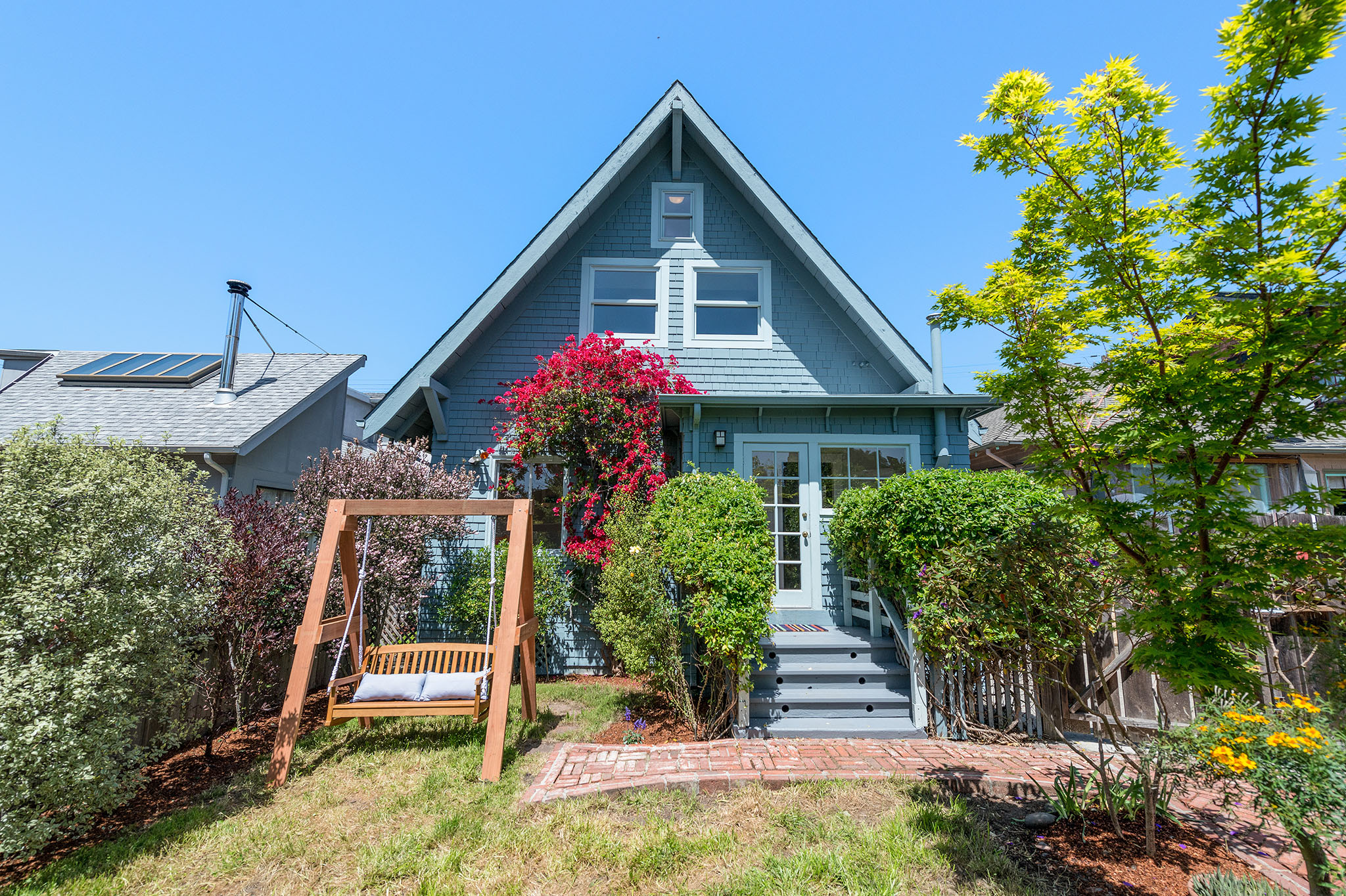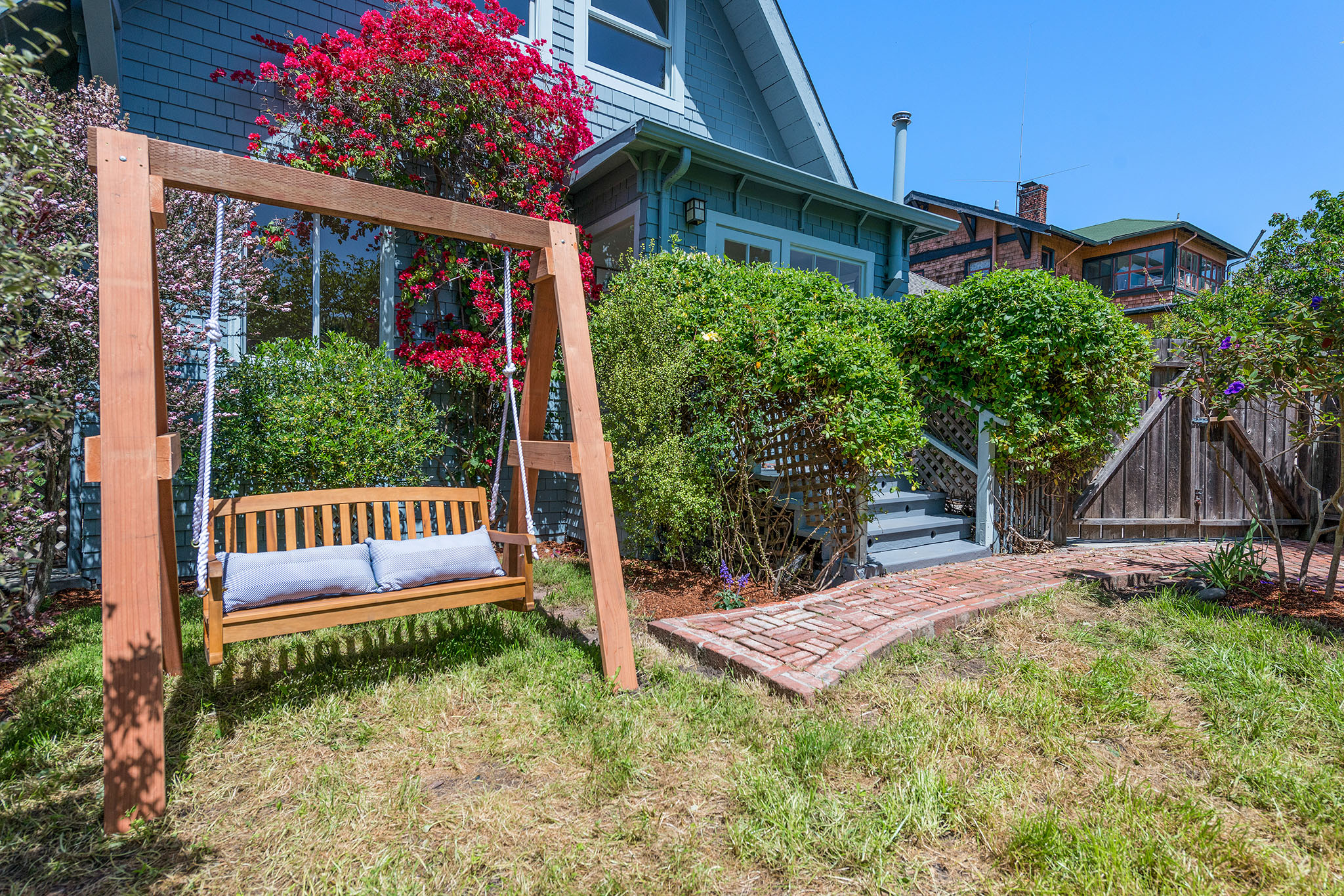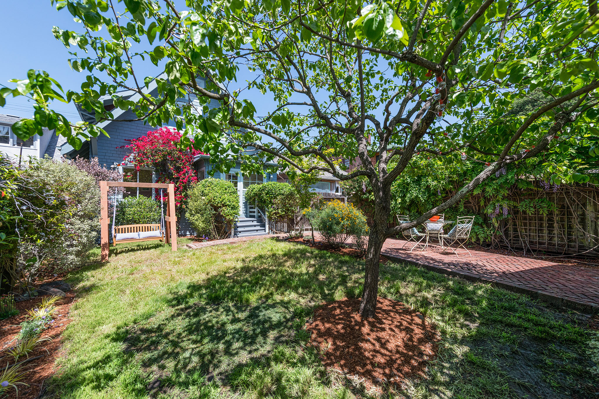 Private, fenced backyard is handsomely landscape with native plantings and versatile for true indoor outdoor living – as there is a lawn, plus brick patio for dining and a custom redwood swing –; an spot ideal for remembering why we live in the Bay Area.