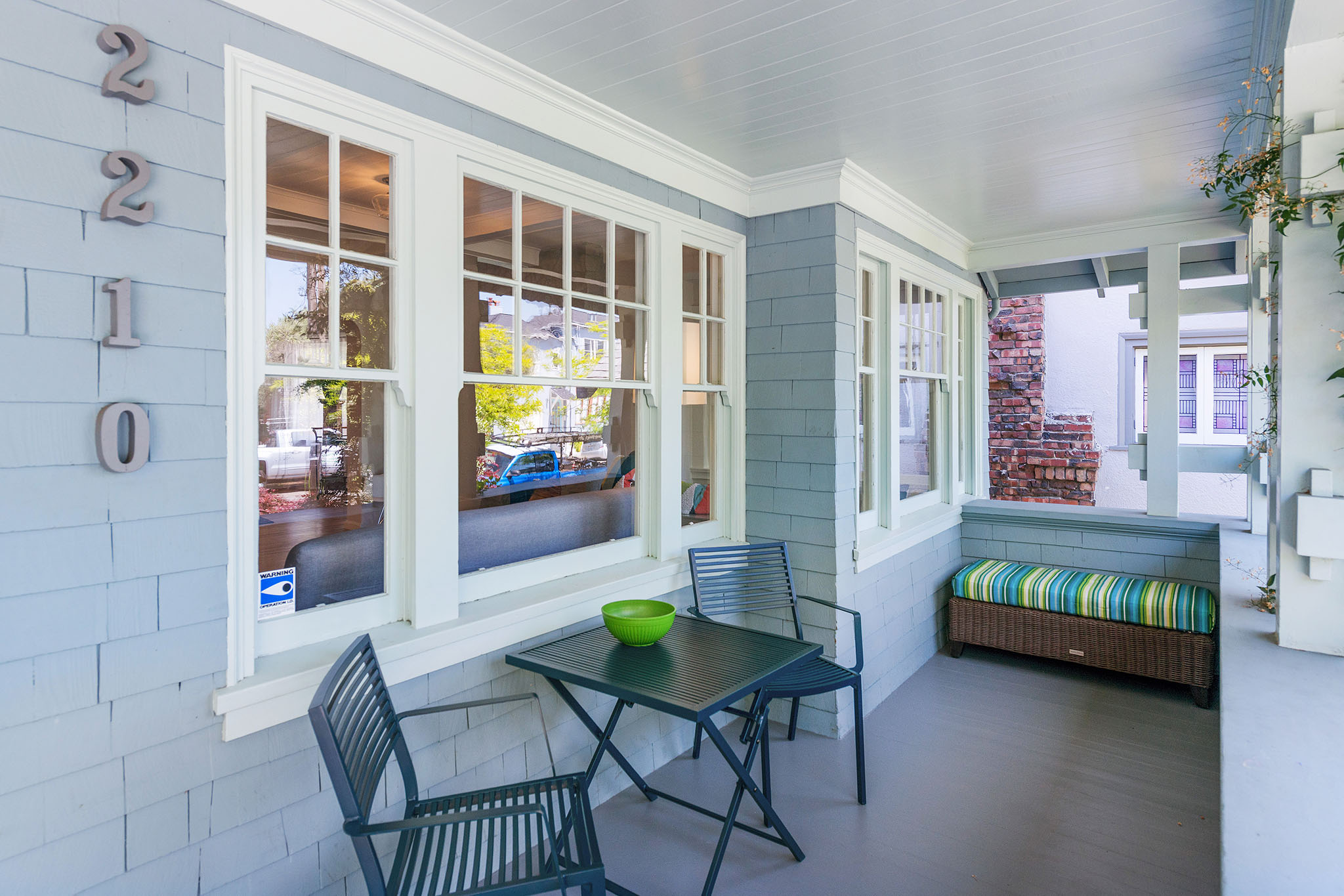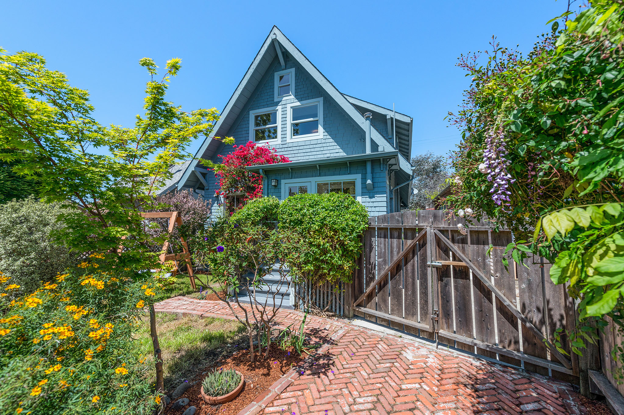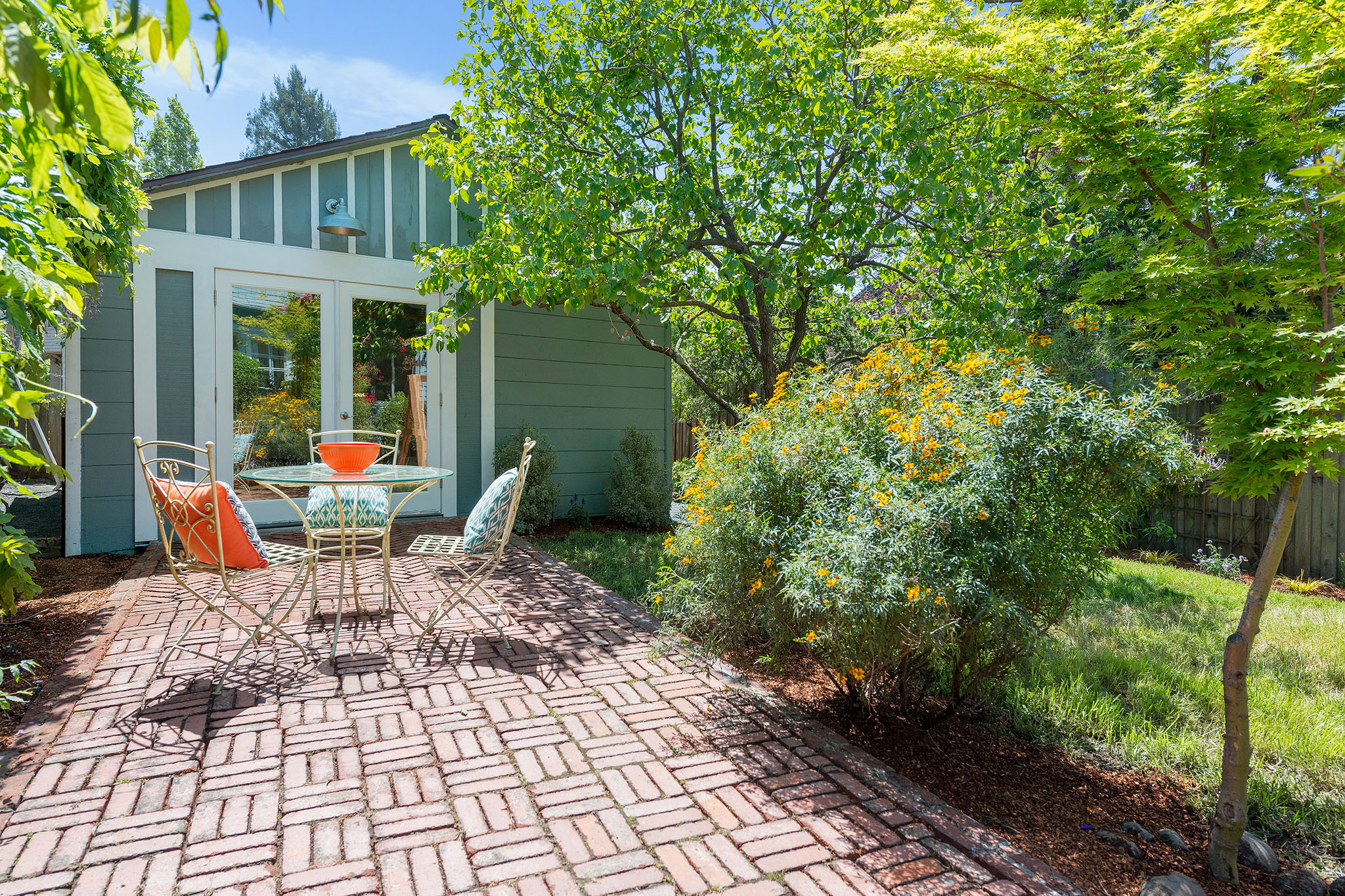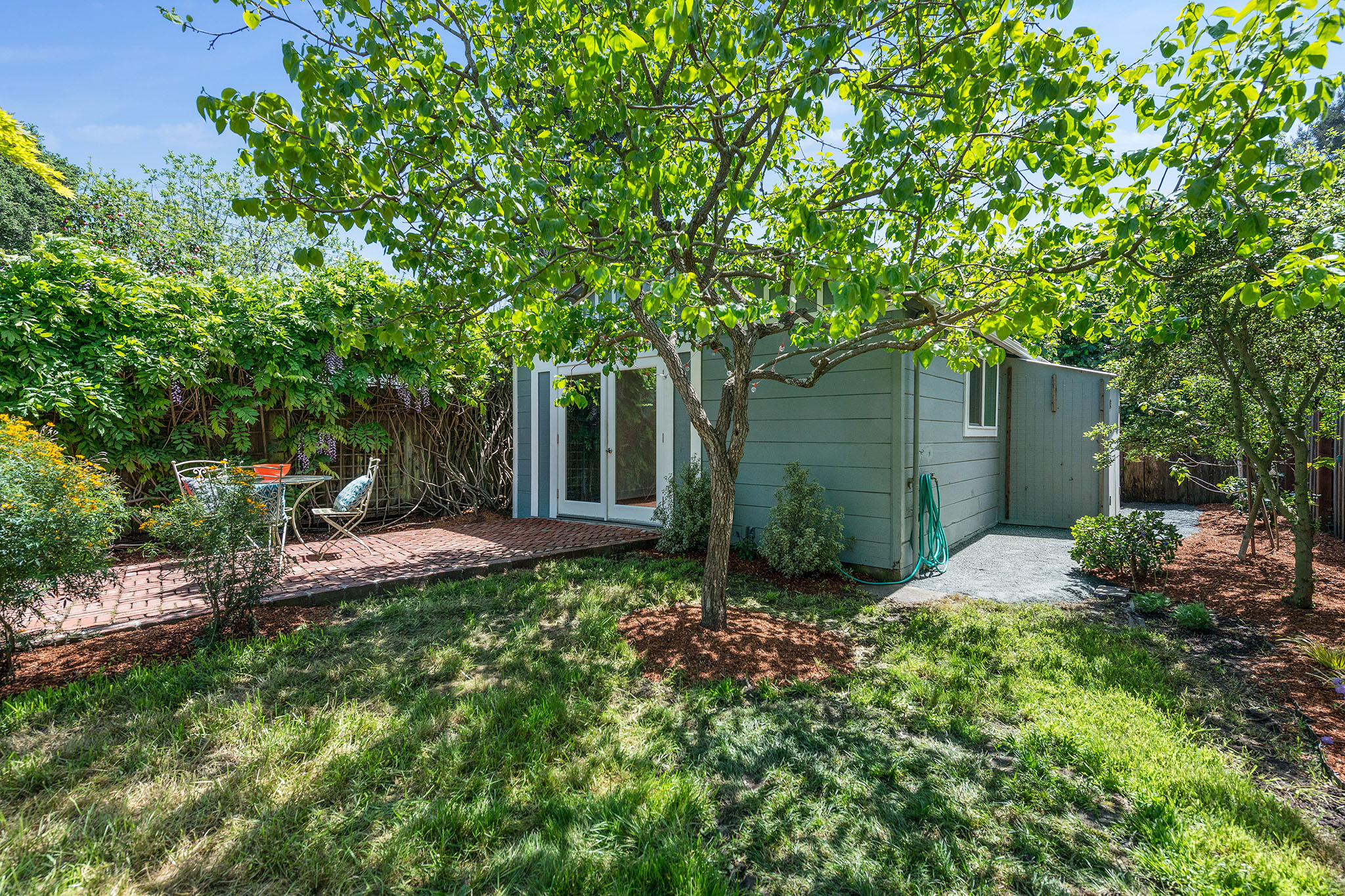 Private, fenced backyard is handsomely landscape with native plantings and versatile for true indoor outdoor living – as there is a lawn, plus brick patio for dining and a custom redwood swing –; an spot ideal for remembering why we live in the Bay Area.