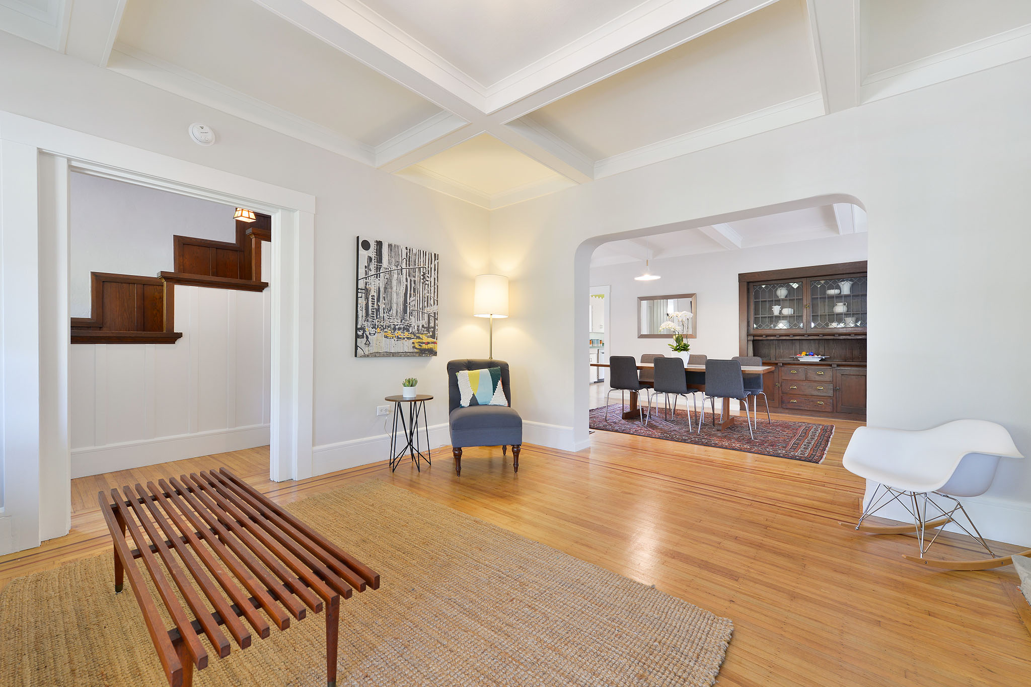 Classic Berkeley home in the Elmwood neighborhood. Large front porch, ideal for relaxing and shooting the breeze. Formal entry features dramatic, wooden staircase leading to three large upstairs bedrooms. High ceilings showcase the box-beamed ceilings and generously sized dining and living room. Other details include window seat, classic brass hardware, stone fireplace and well proportioned vintage built-in cabinet.