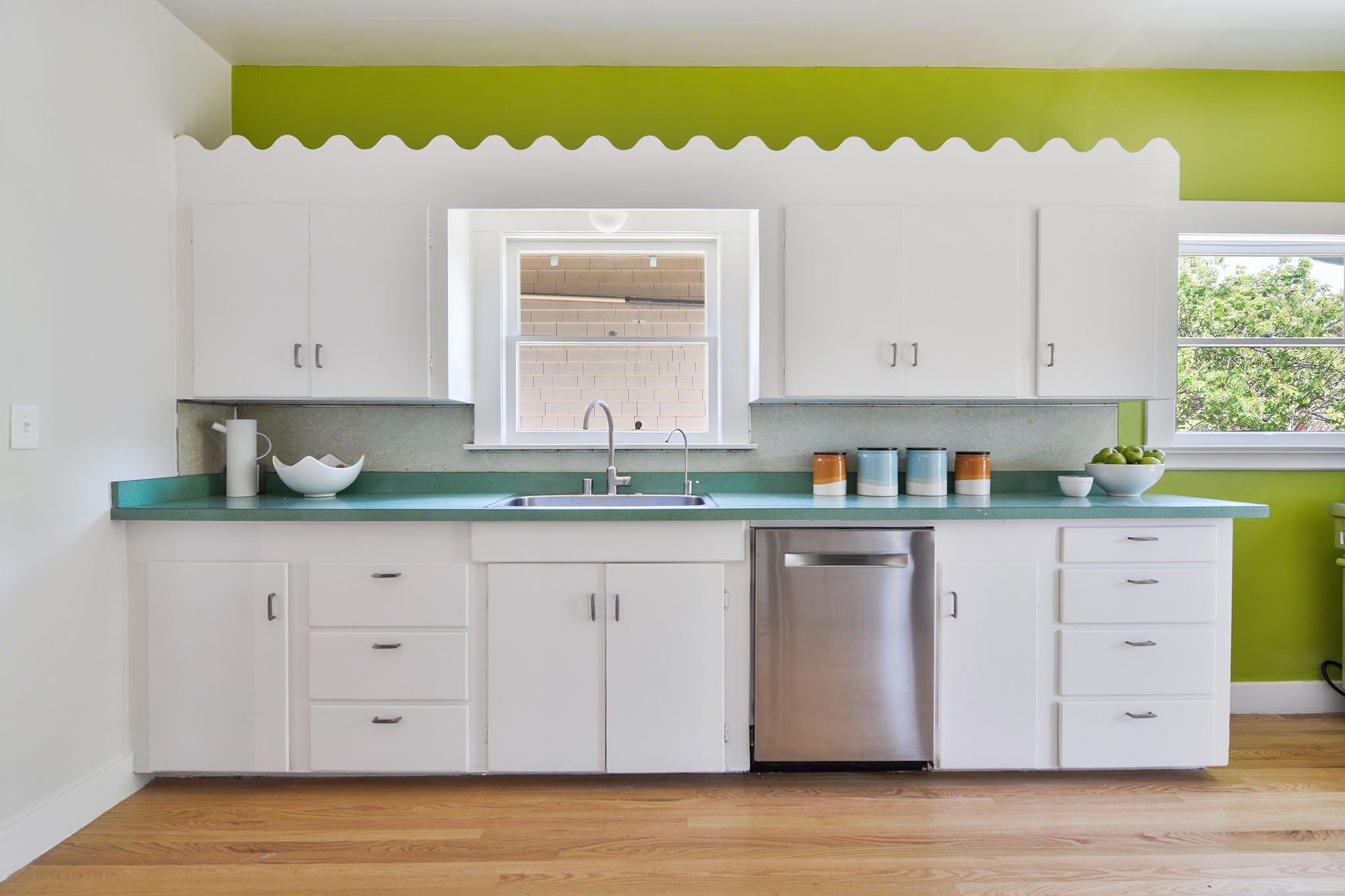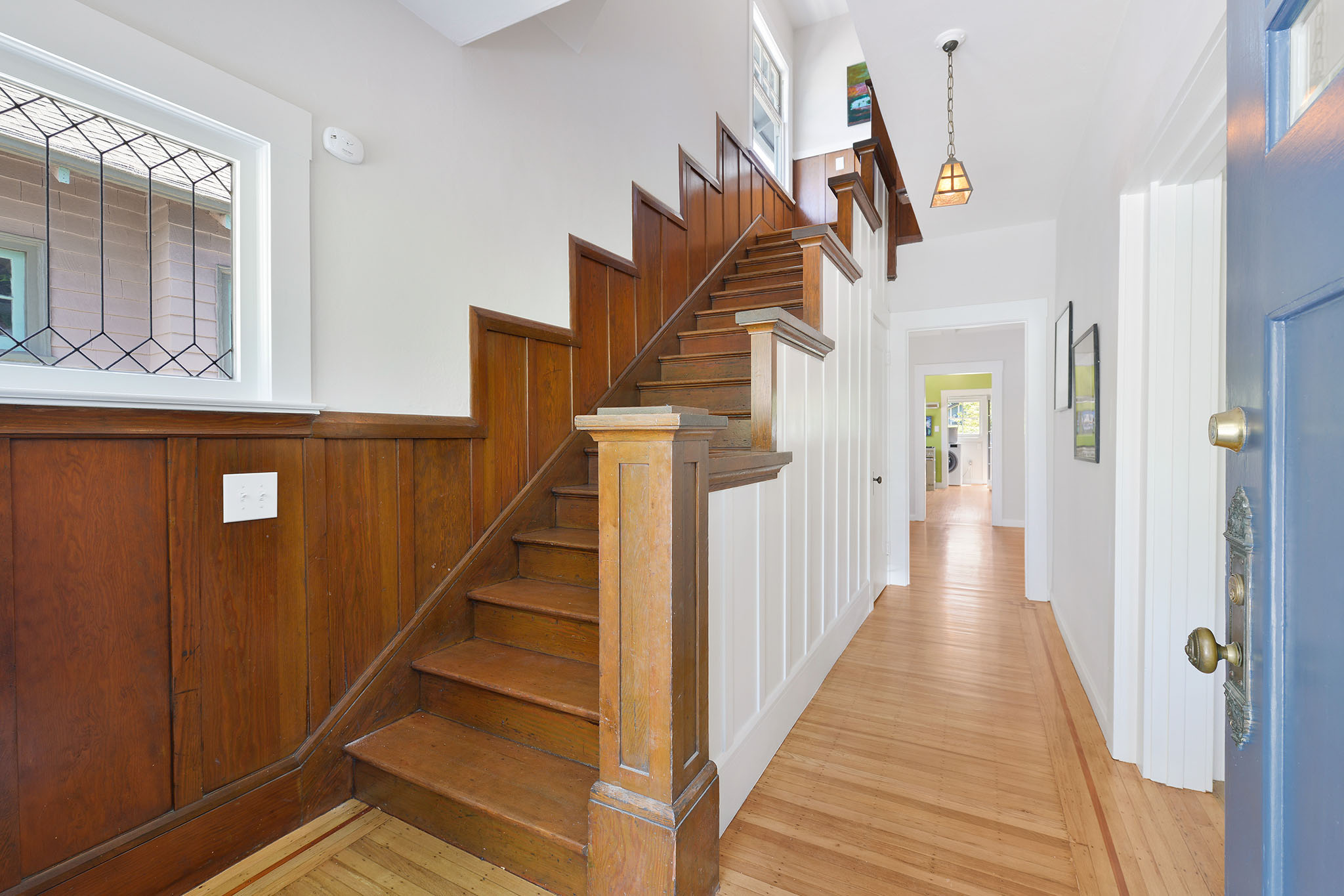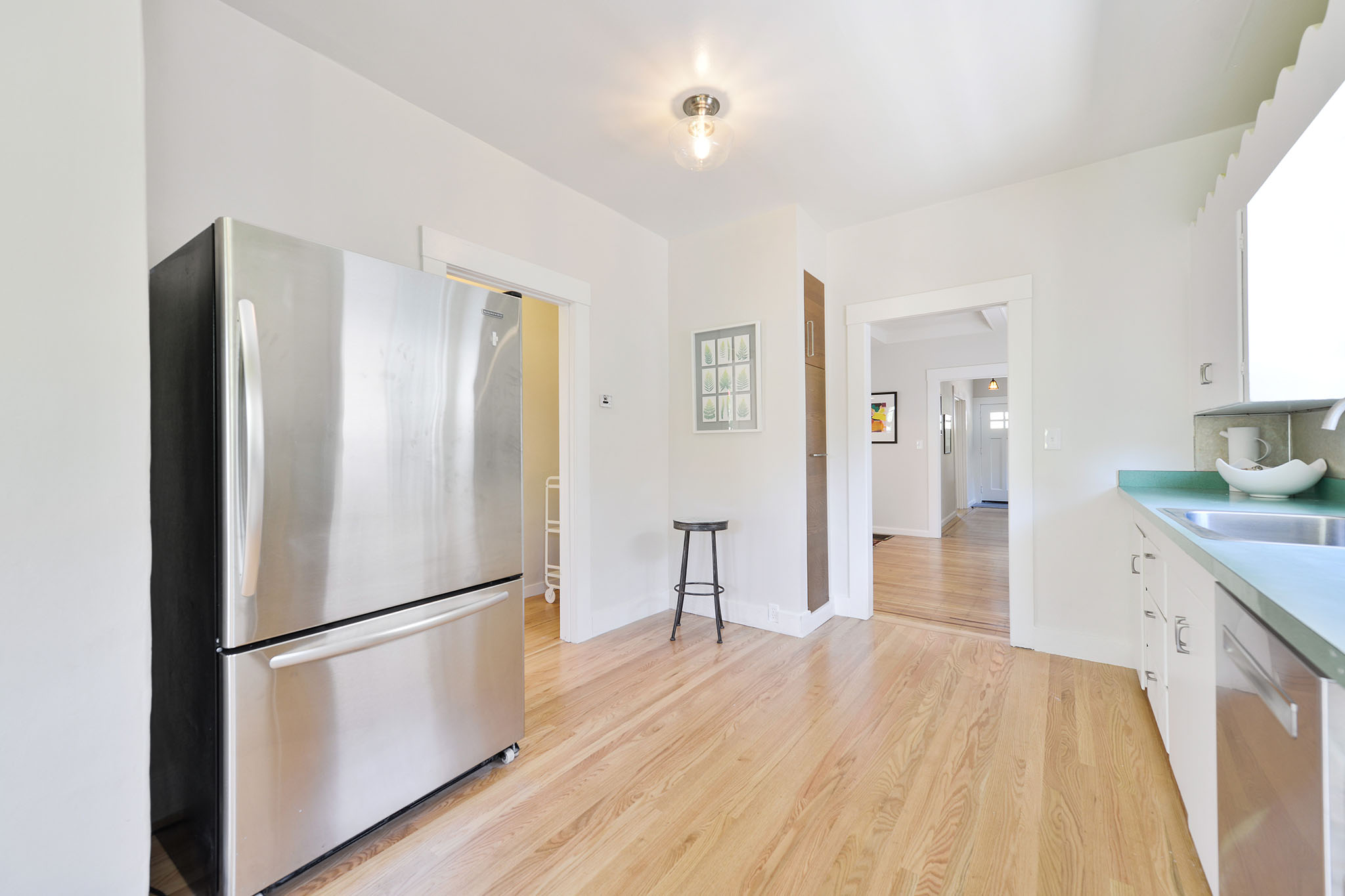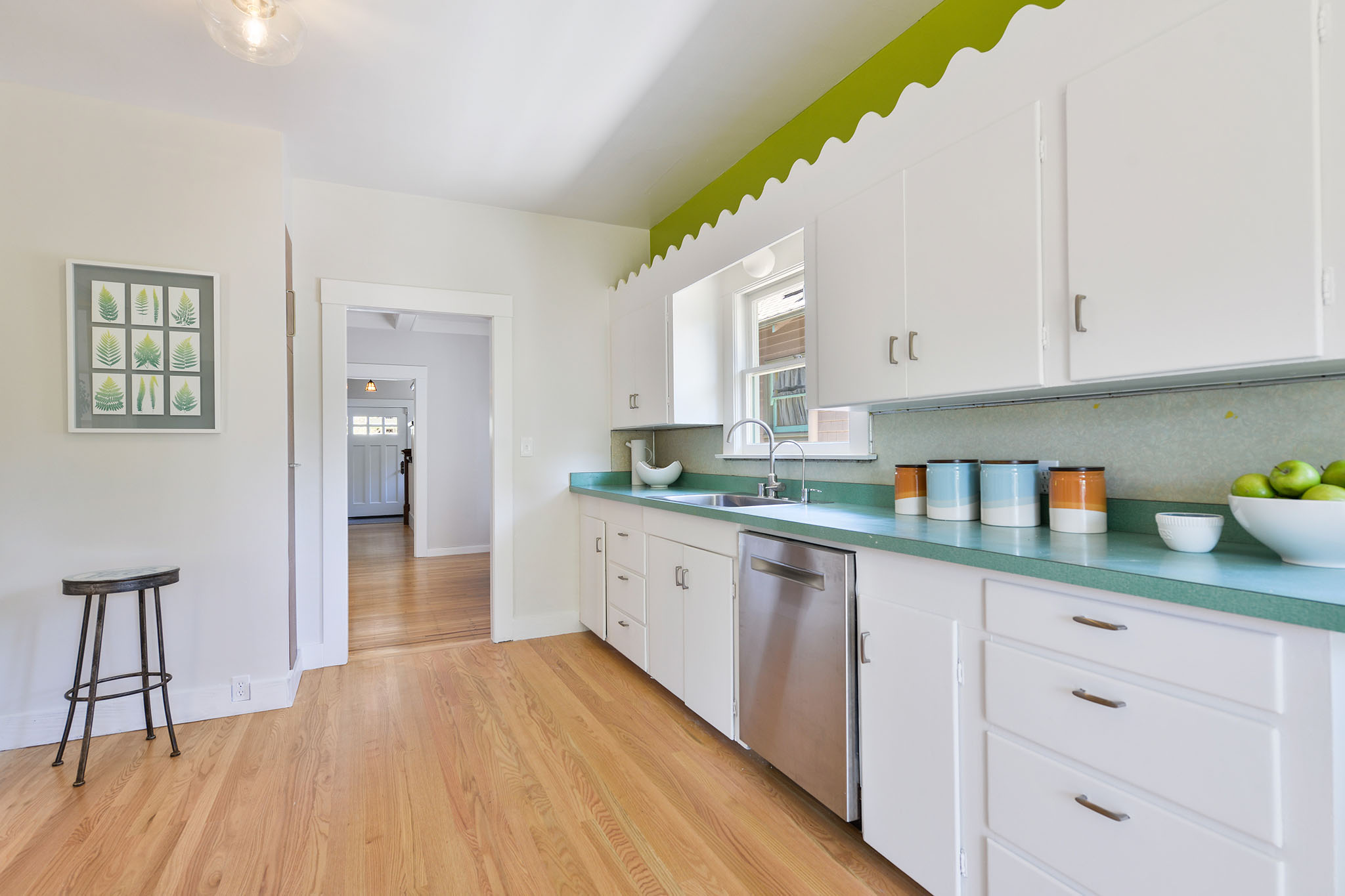 New paint on the interior and exterior combine with refinished hardwood floors throughout and new oak wood flooring. Cheery kitchen has retro scalloped detailing on the cabinets and newer stainless appliances. Off the kitchen the adjoining laundry room opens to an expansive and sunny, south facing backyard. The first floor bedroom and redone bathroom are adjacent to the kitchen.