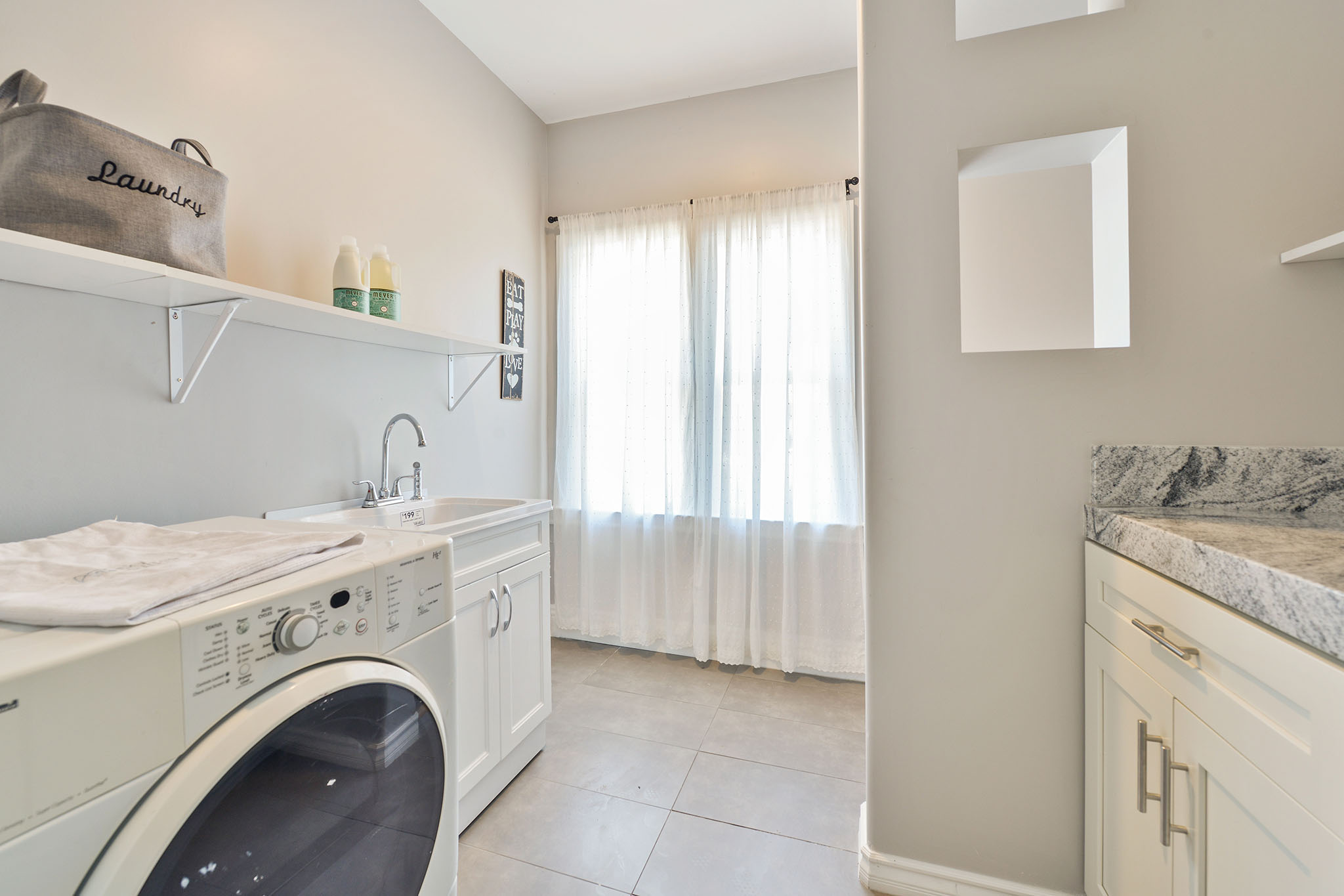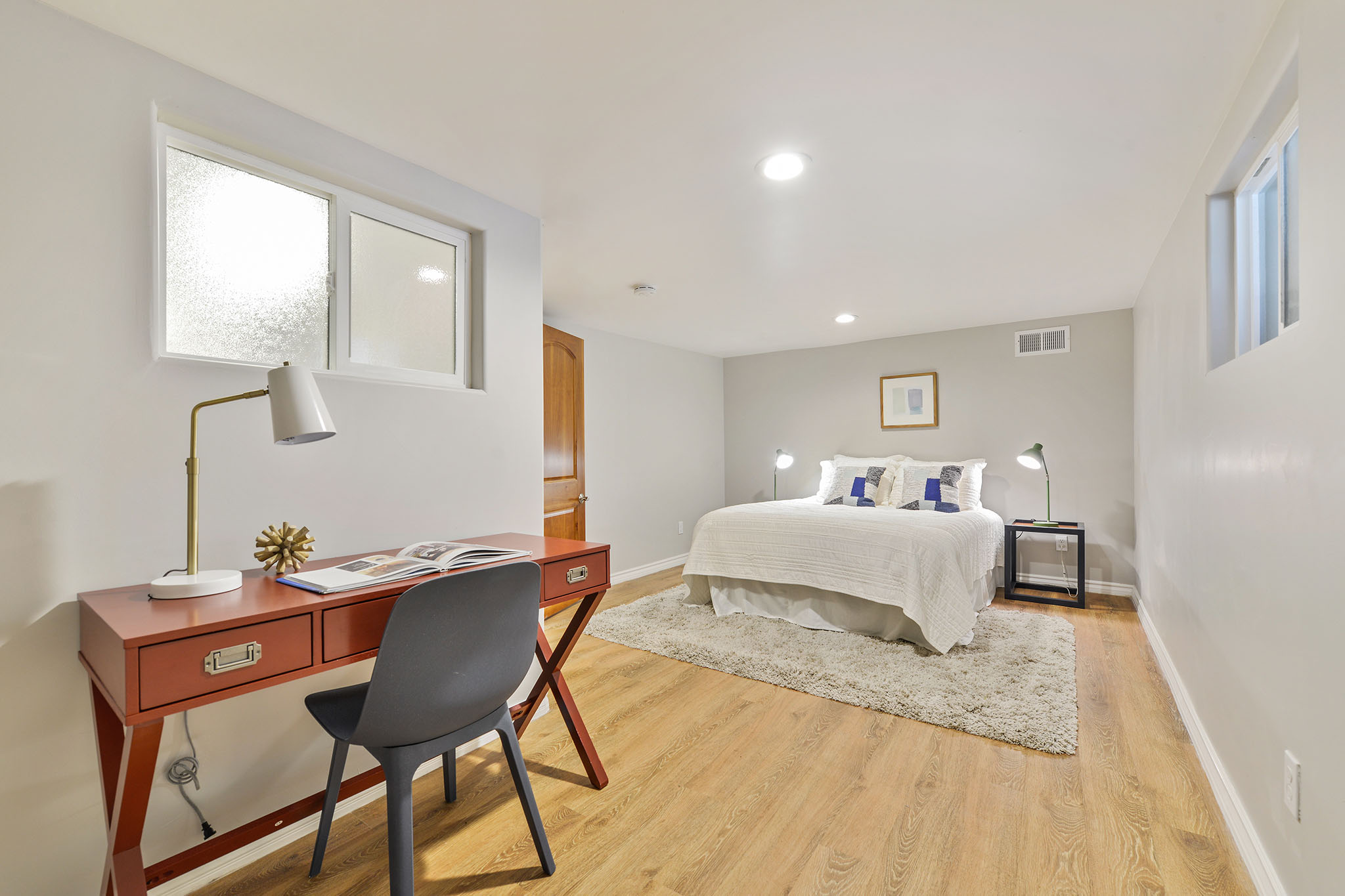 Nicely sized laundry room includes ample cupboard space/pantry and a counter for folding clothes. Access to the lower level is here, as well as to the backyard. Downstairs has been built-out with two rooms, a bedroom and extra room that could act as an office or media cave. In addition, throughout the home you will find bull-nosed wall detailing, new paint and flooring and recessed lighting.