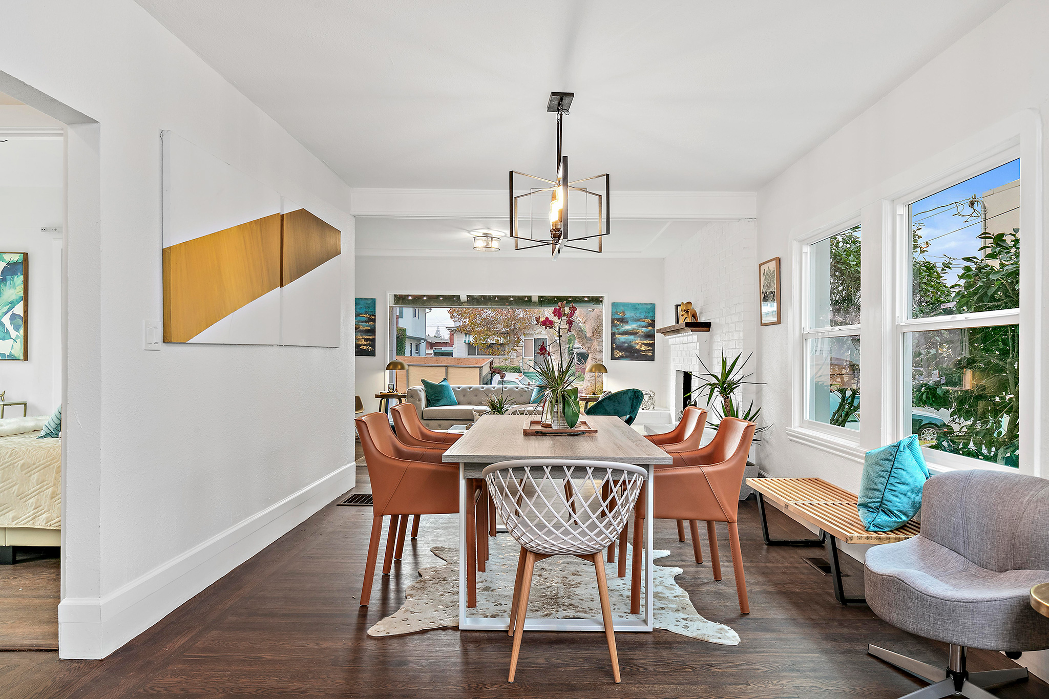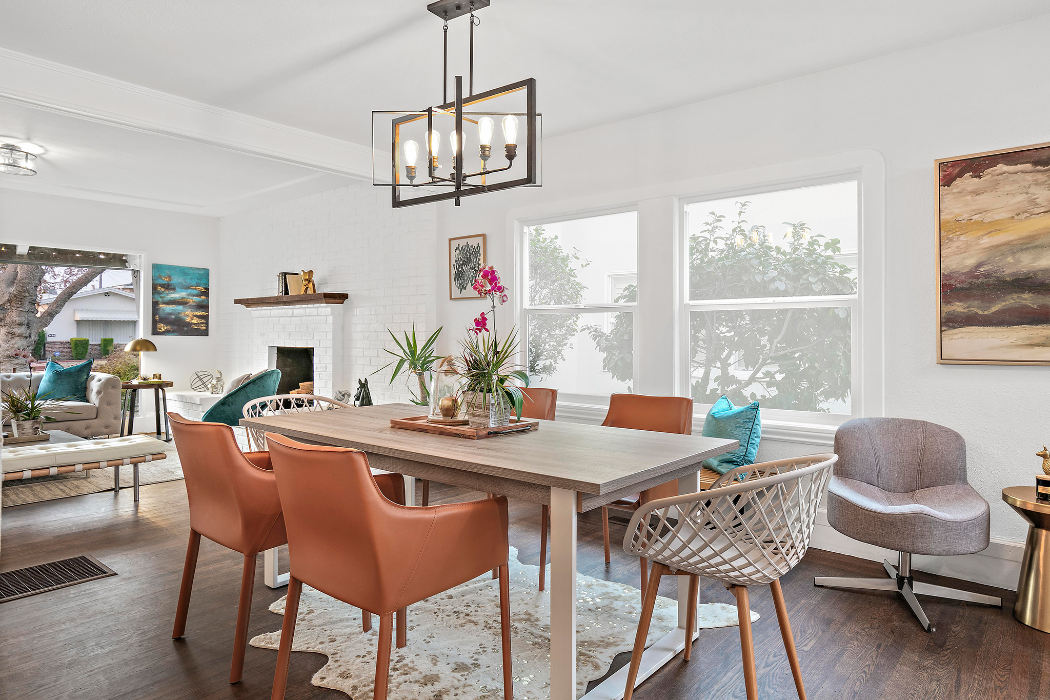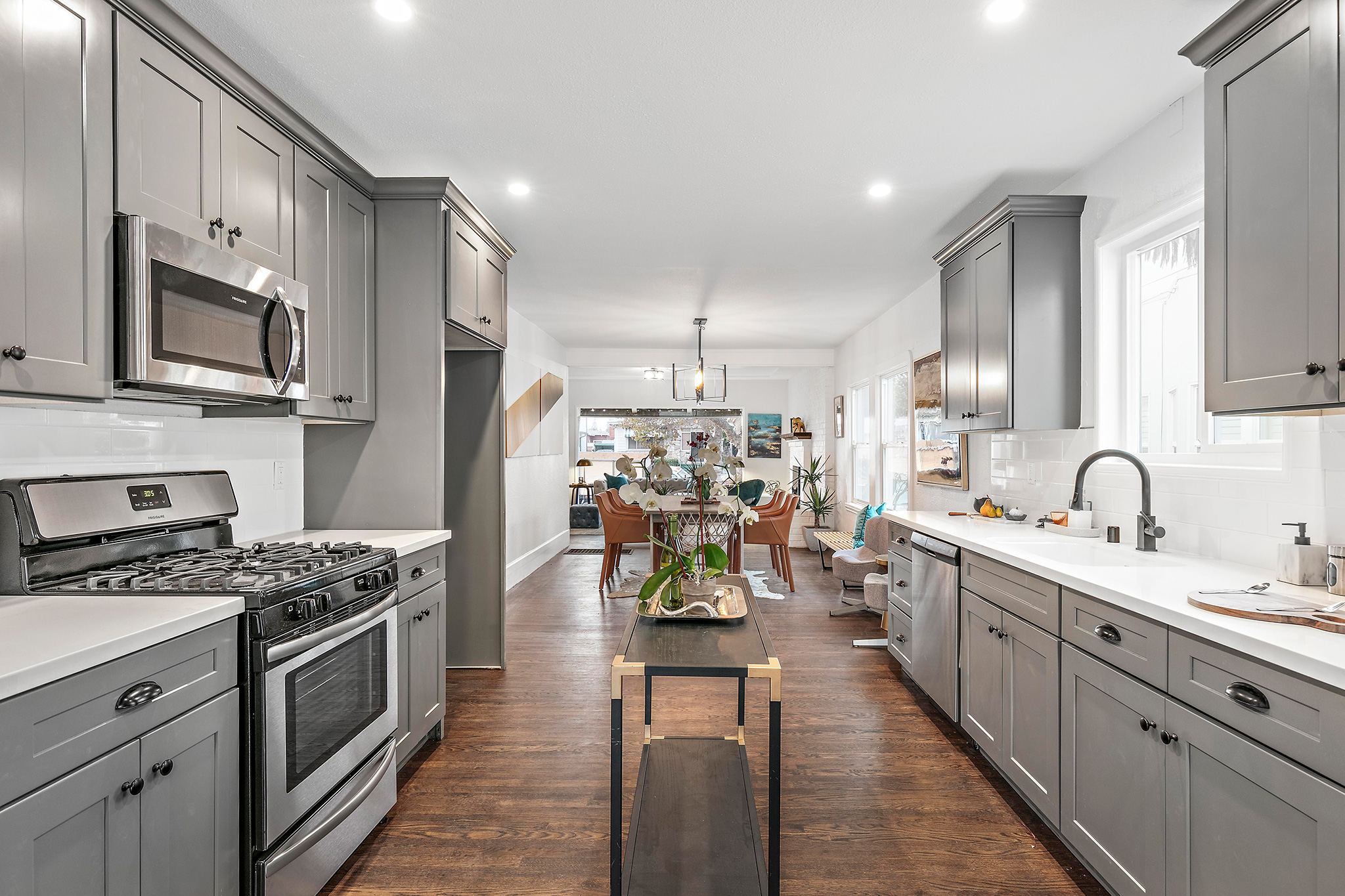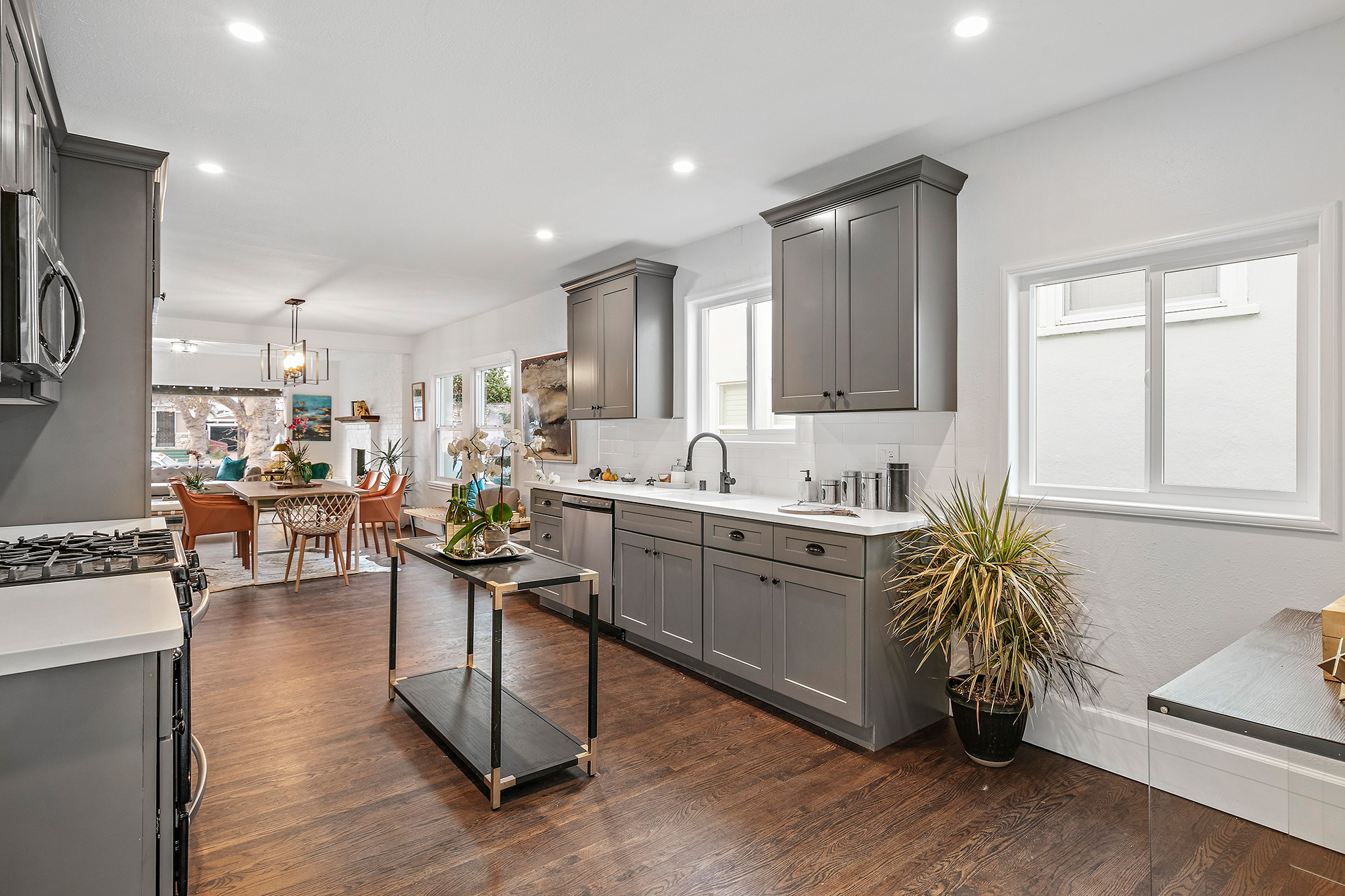 This spacious 2BD/2BA remodeled bungalow has a formal entry opening to spacious living room with an impressive 10-foot picture window and stunning brick fireplace. Original molding accents freshly painted walls. Adjacent dining area boasts a dramatic light fixture and lends to the newly remodeled kitchen.
