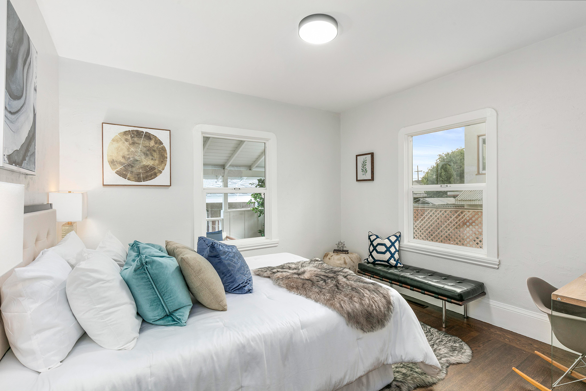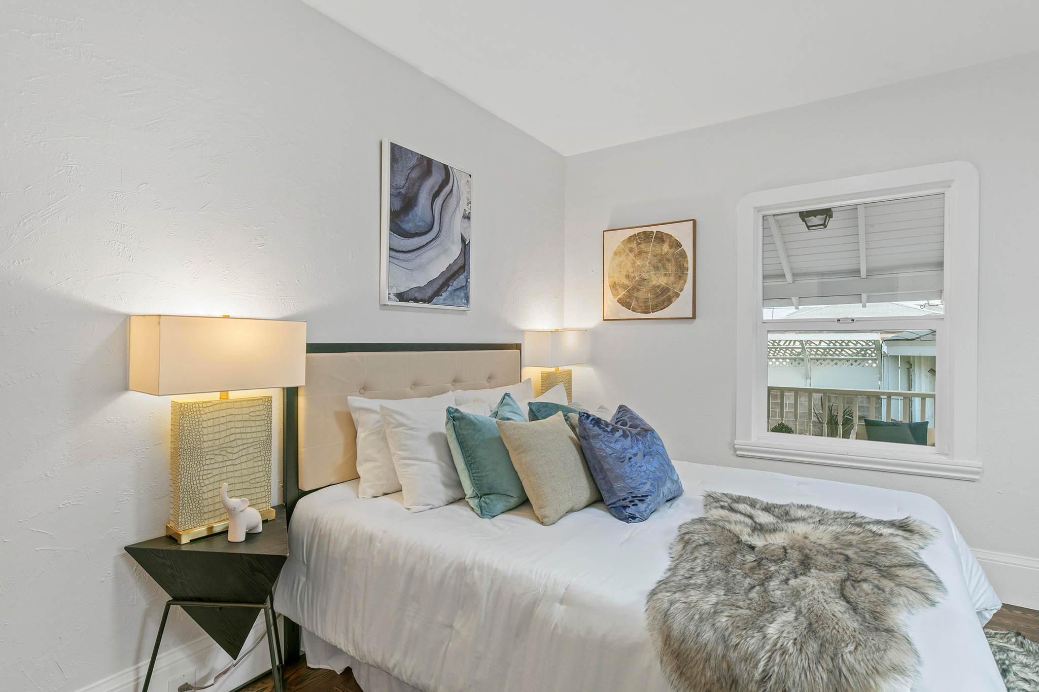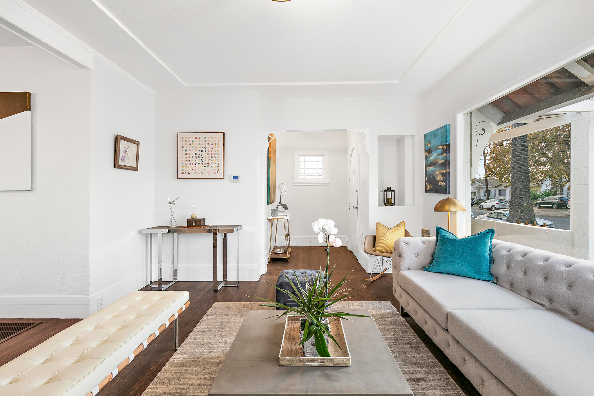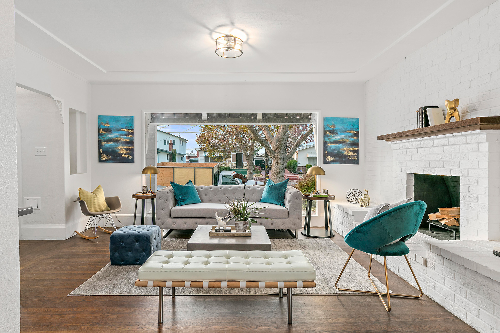 This spacious 2BD/2BA remodeled bungalow has a formal entry opening to spacious living room with an impressive 10-foot picture window and stunning brick fireplace. Original molding accents freshly painted walls. Adjacent dining area boasts a dramatic light fixture and lends to the newly remodeled kitchen.