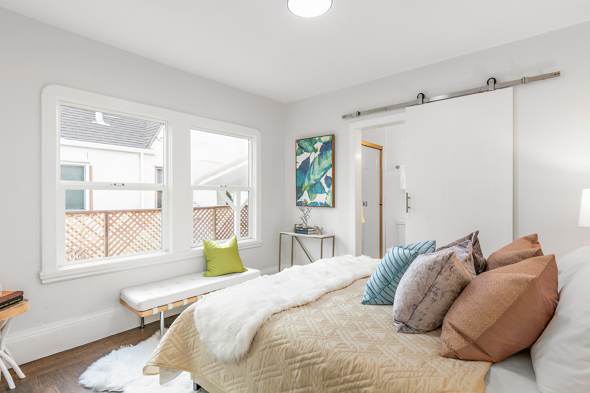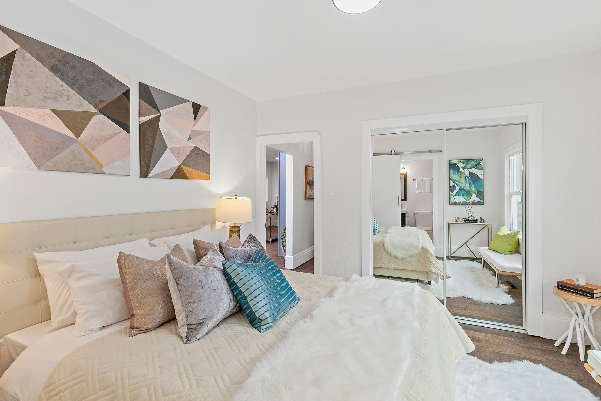 Two bedrooms, including a master ensuite, have hardwood floors, new doors and lighting. The master bedroom has a mirrored closet and attached bathroom with all new tile and fixtures.