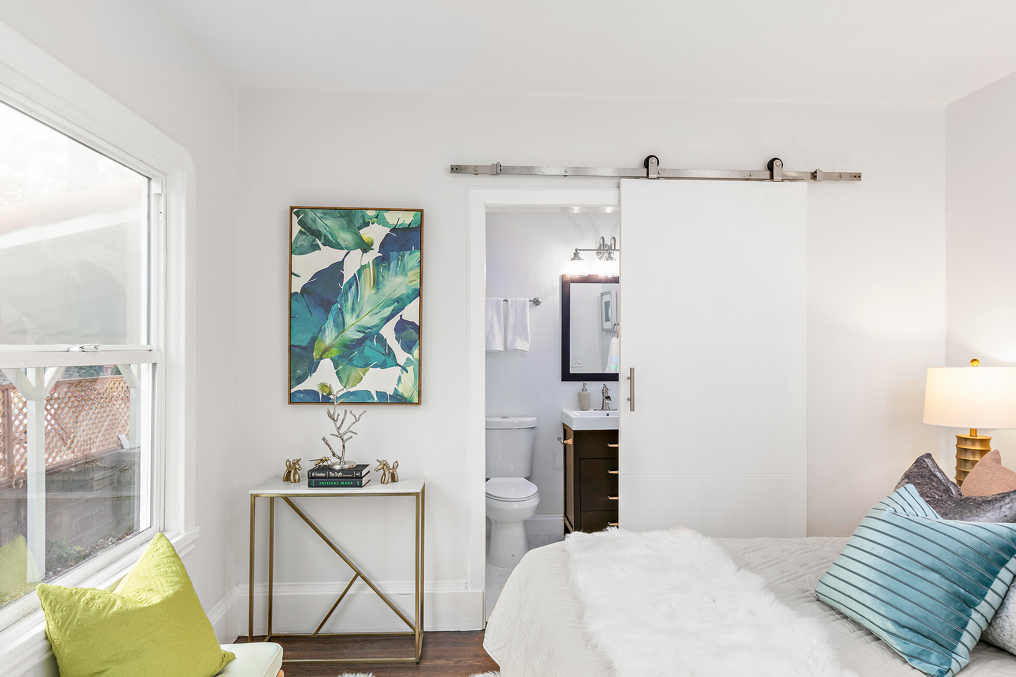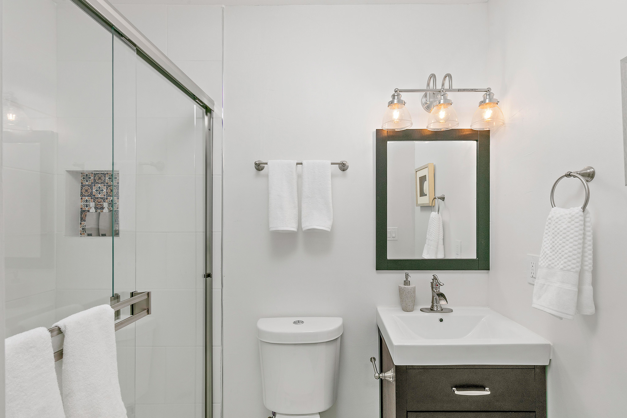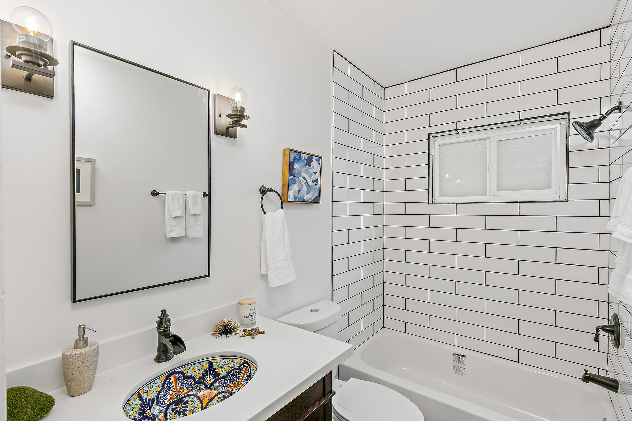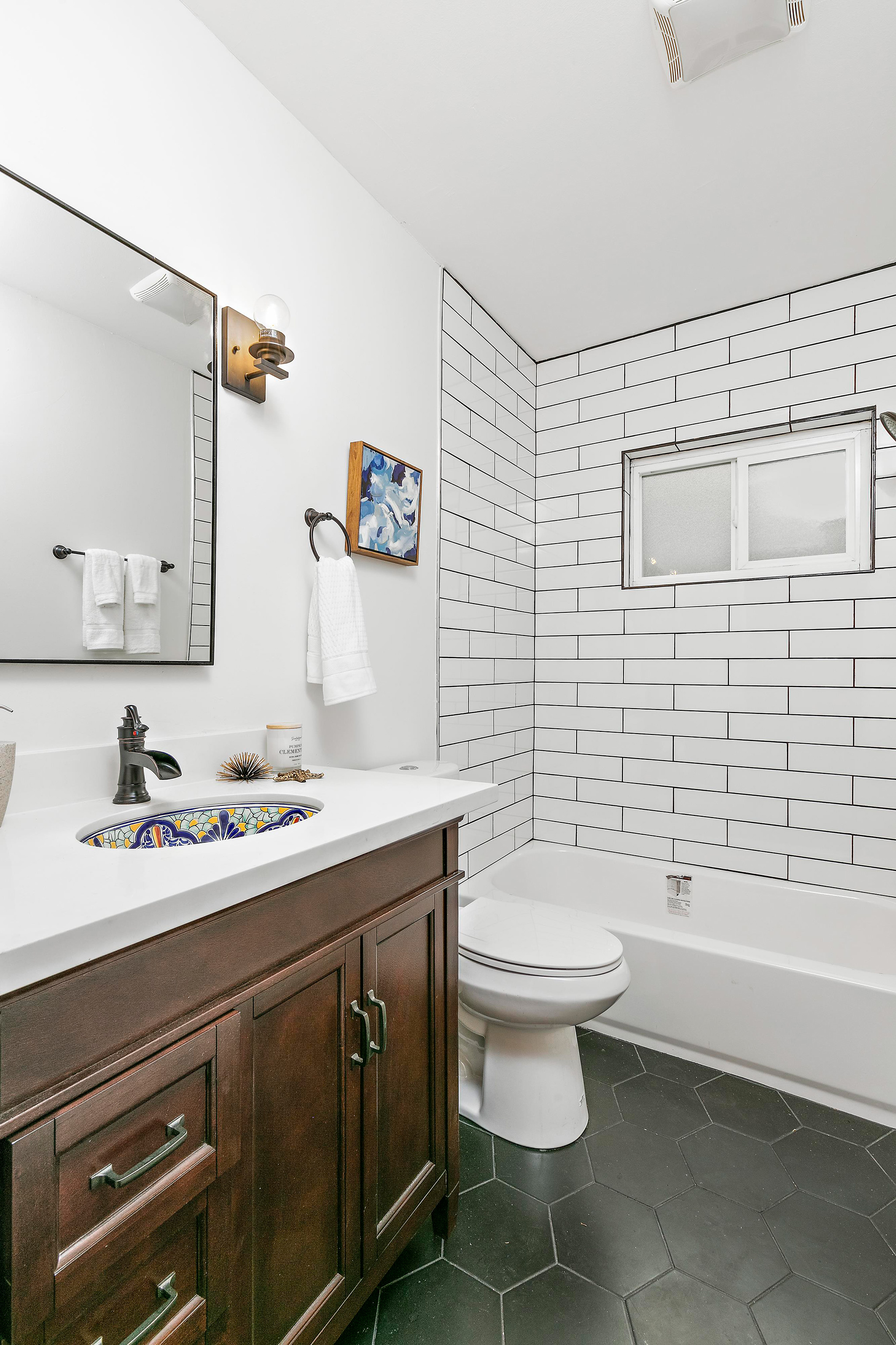In the hall bathroom, the colorfully tiled sink characterizes the attention to detail throughout the home. Sleek tile outfit the shower-over-tub, new tile floors gleam and all new fixtures make this bathroom picture perfect.