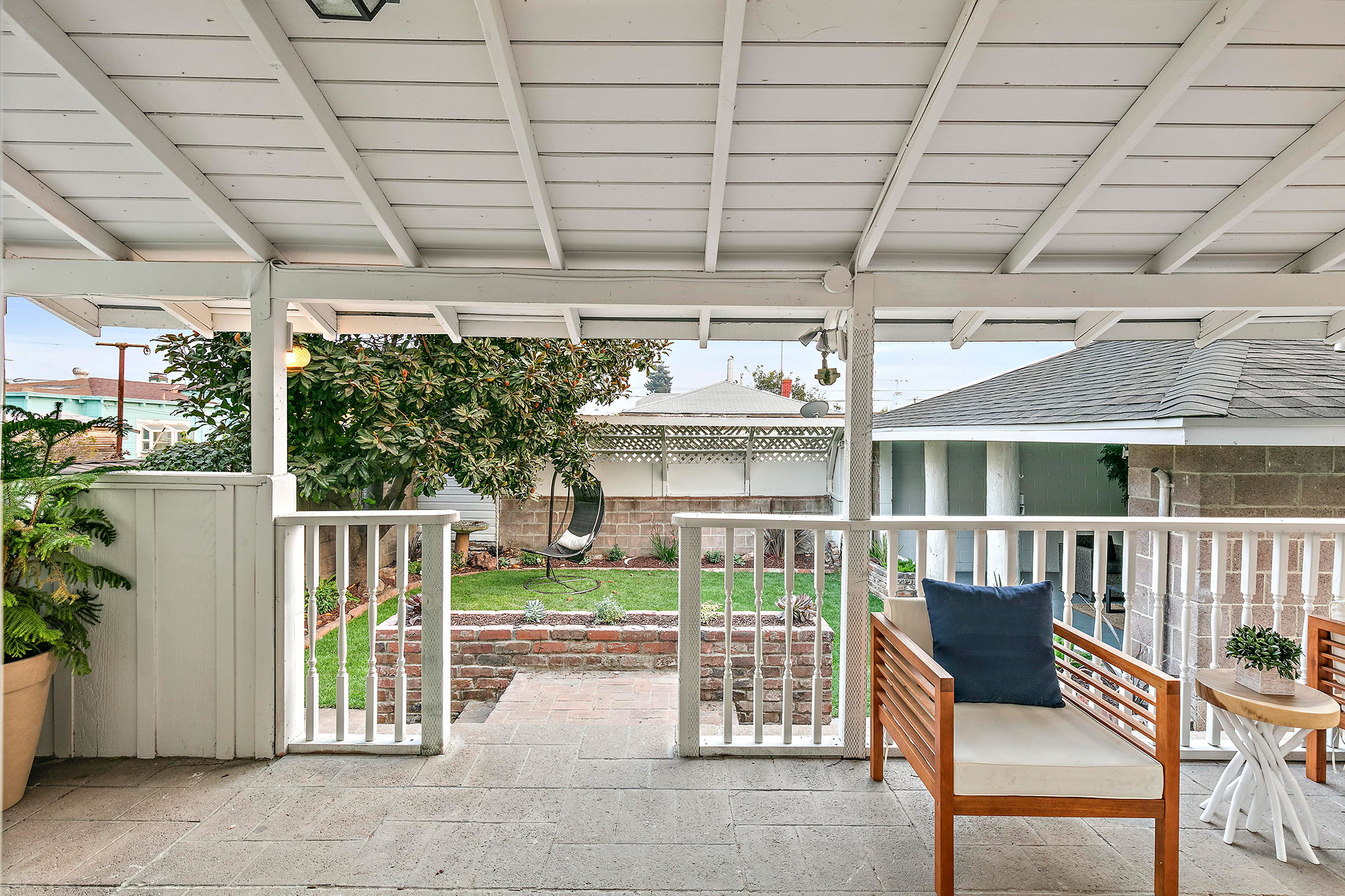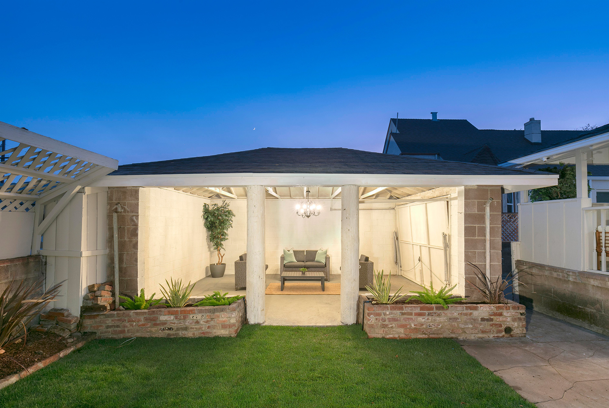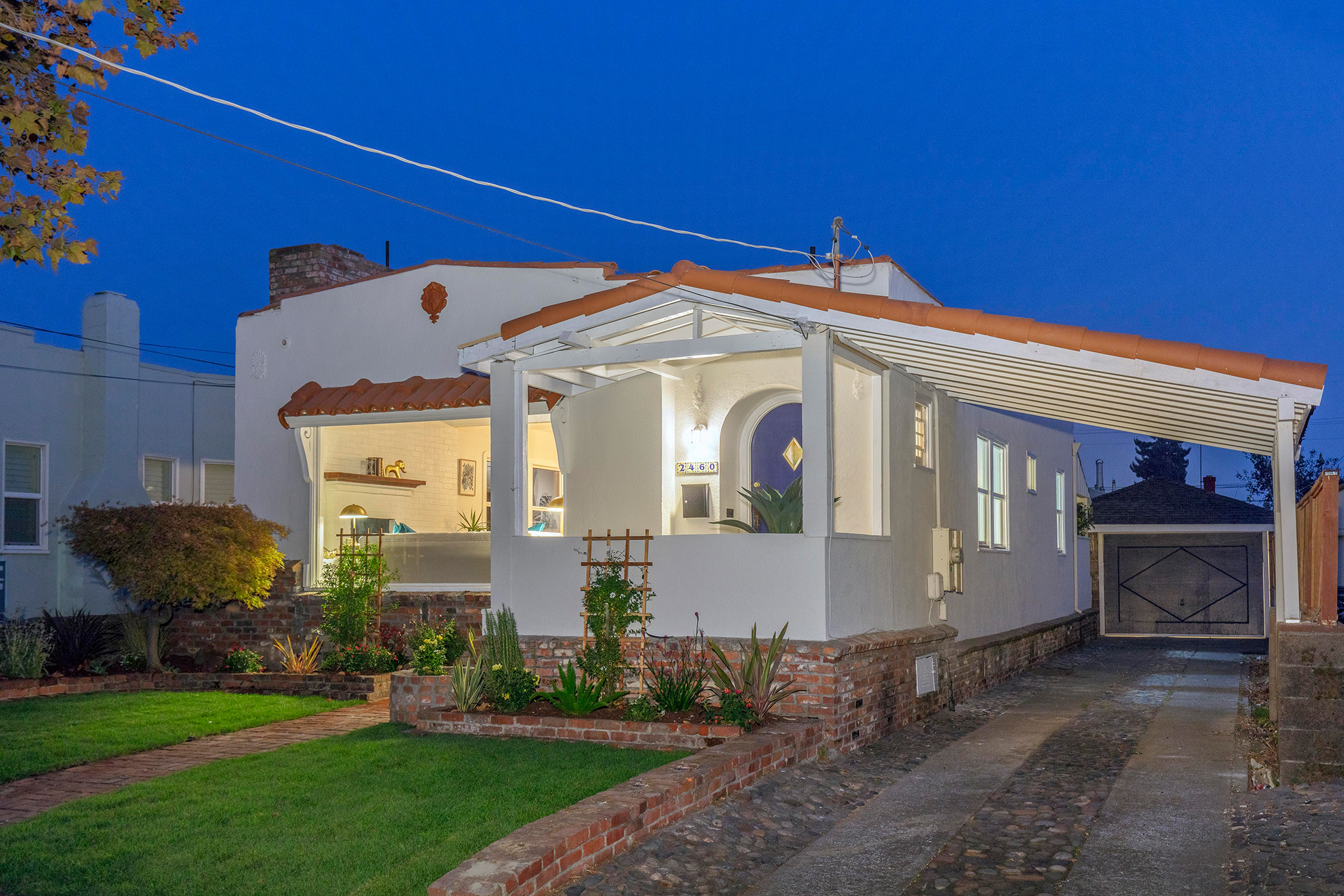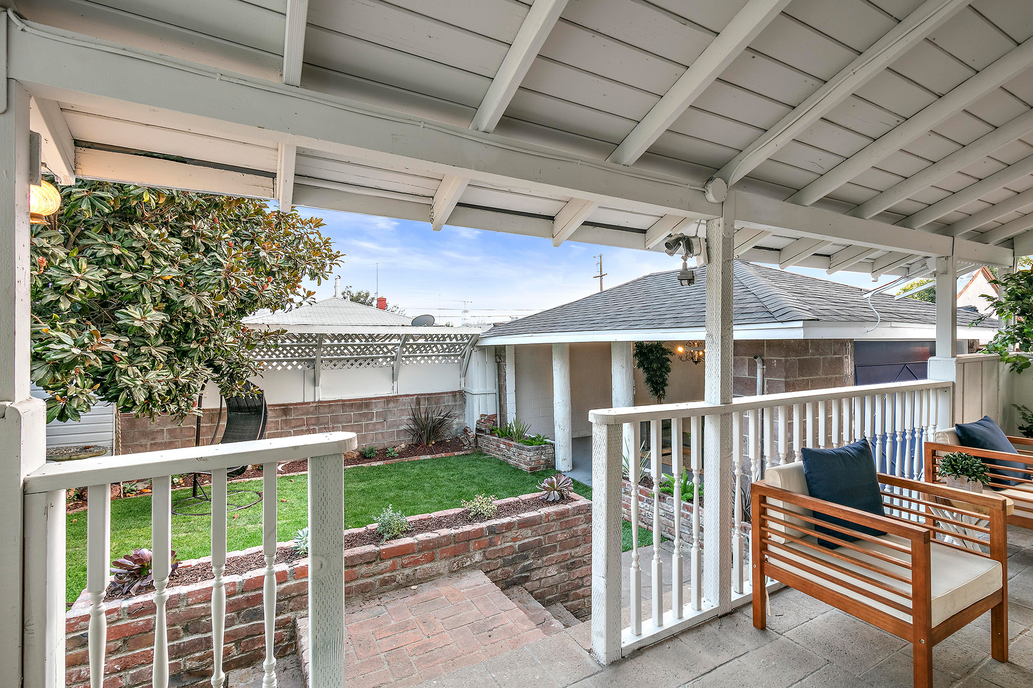 Outside, enjoy the private and well-appointed backyard which has been newly landscaped with grass. The detached one-car garage has a unique open-architectural feel where parties and gatherings seem almost necessary. The long driveway, accented with original stone work, is partially covered with a refurbished carport allowing off-street parking.