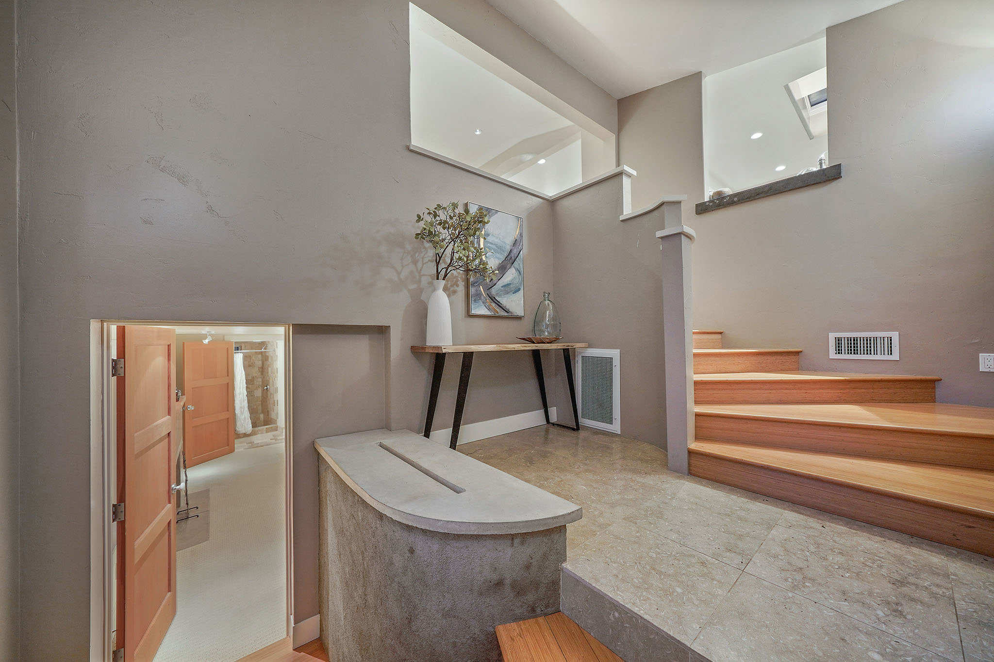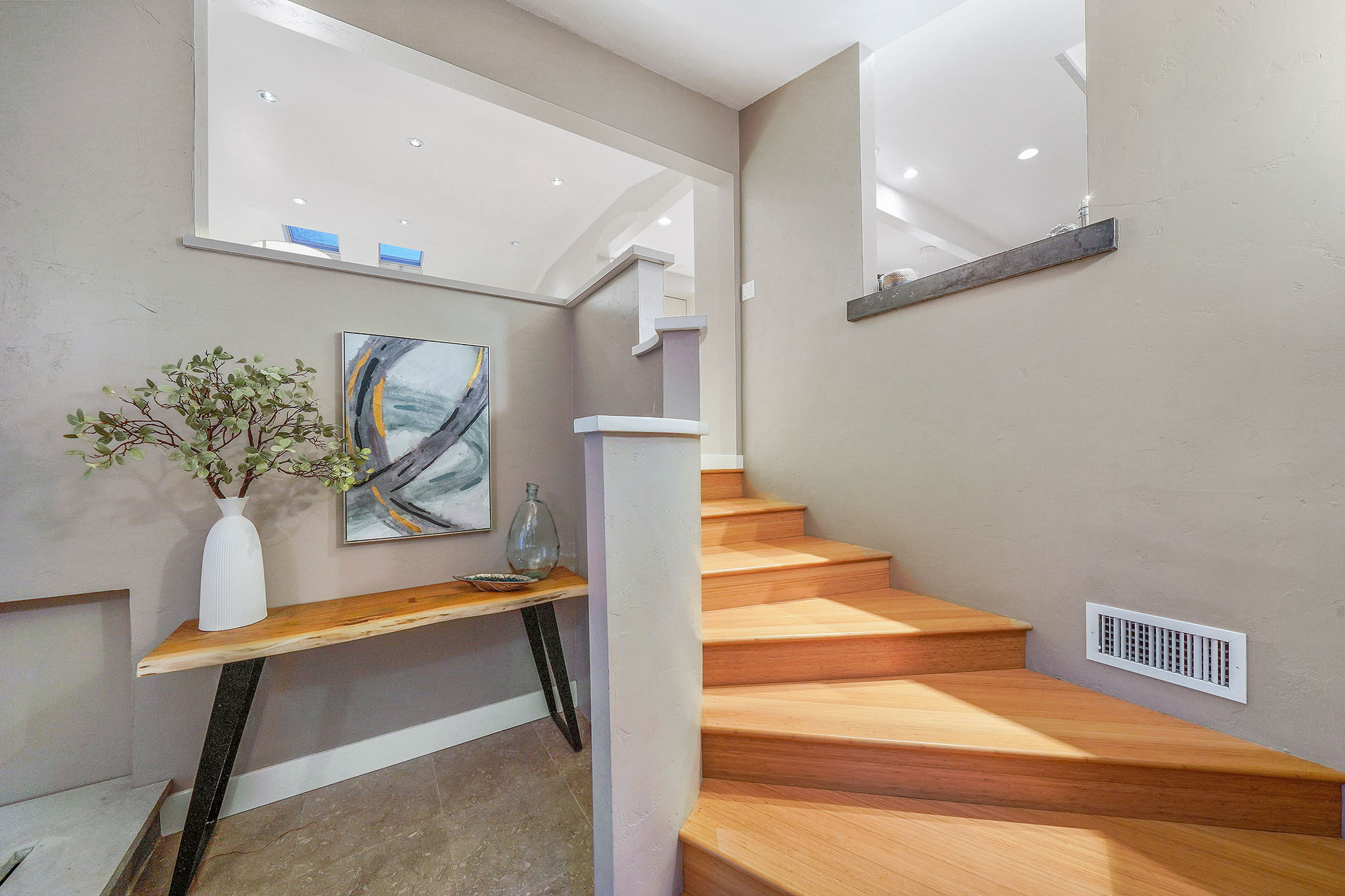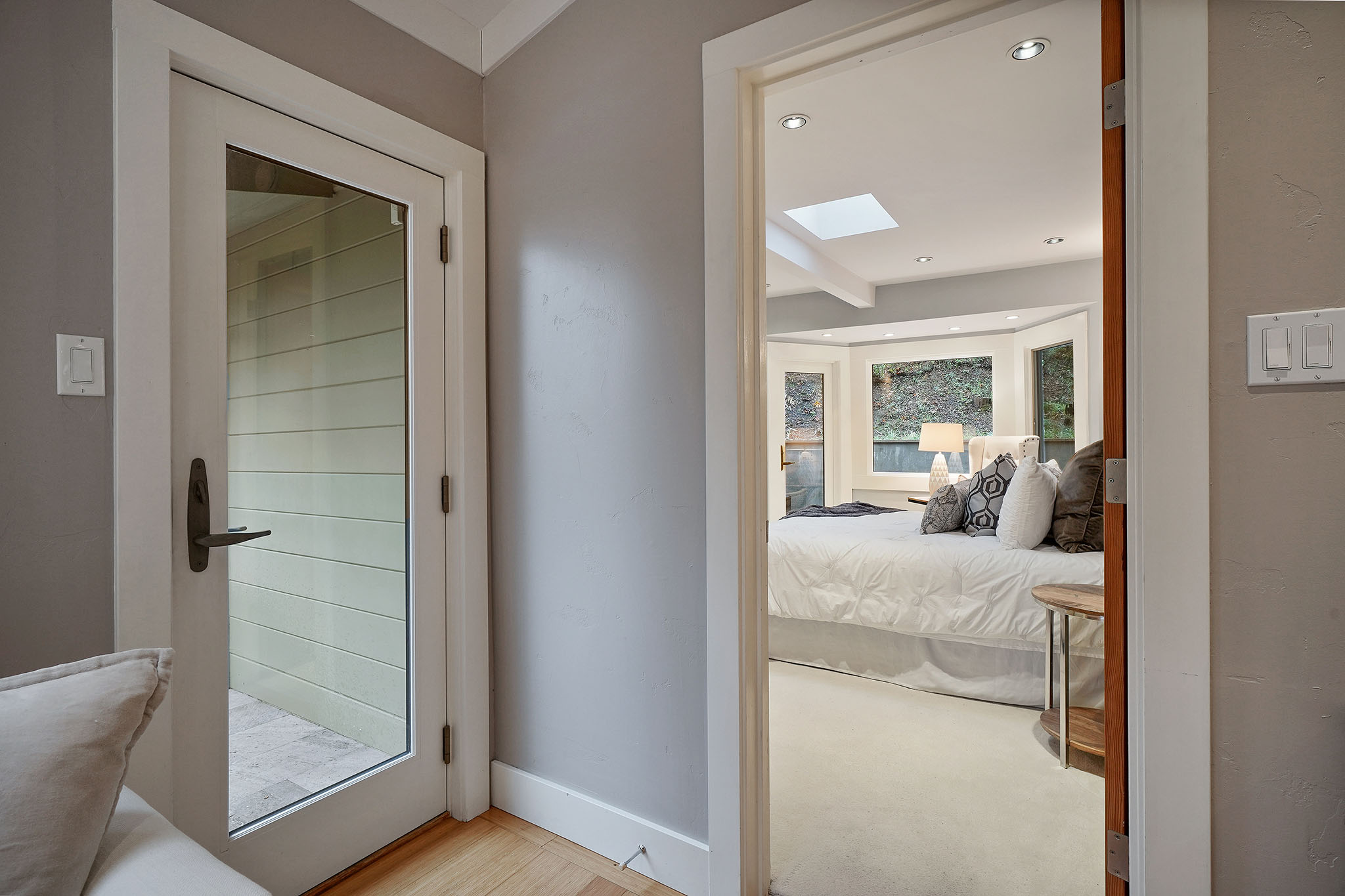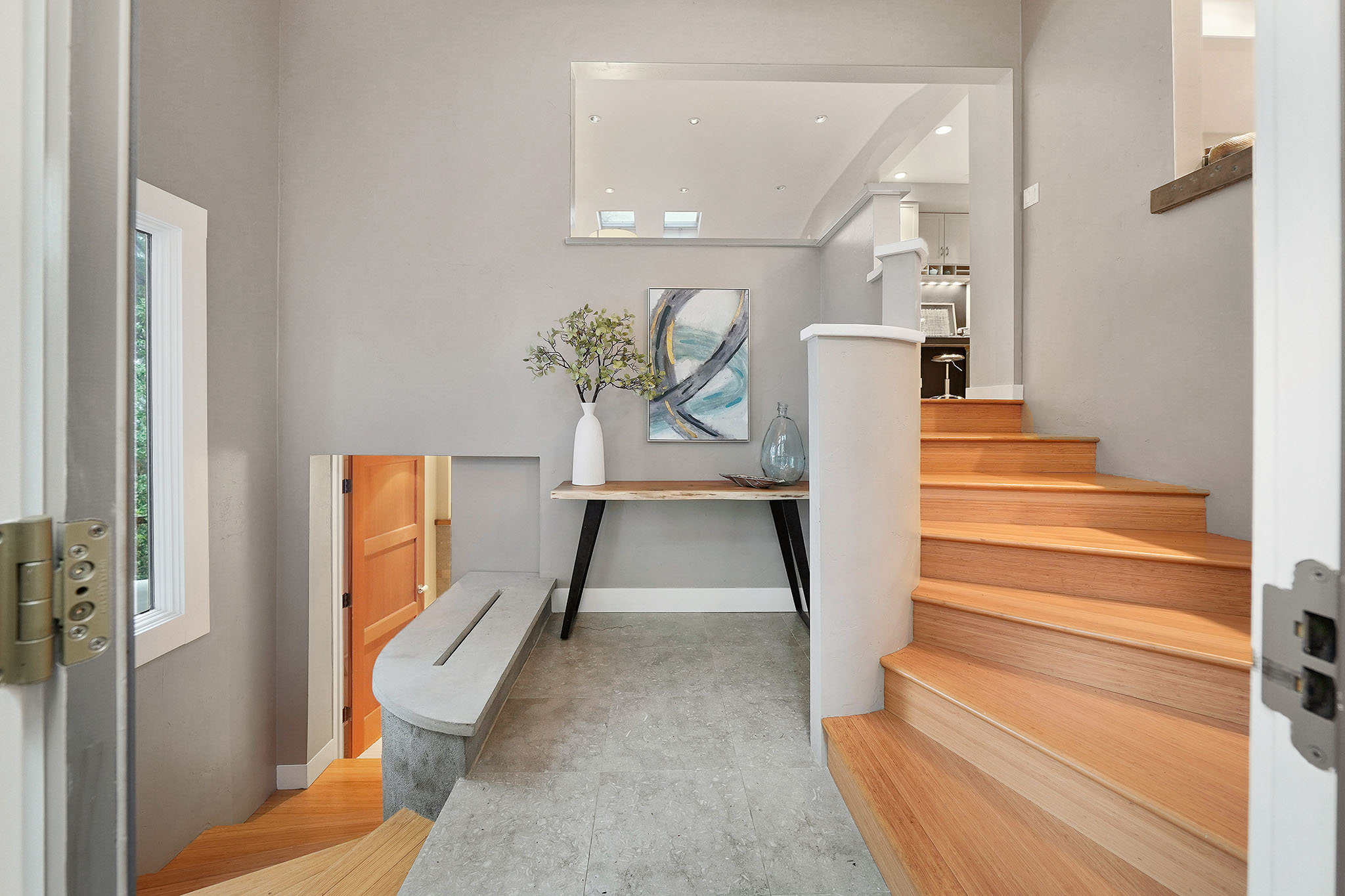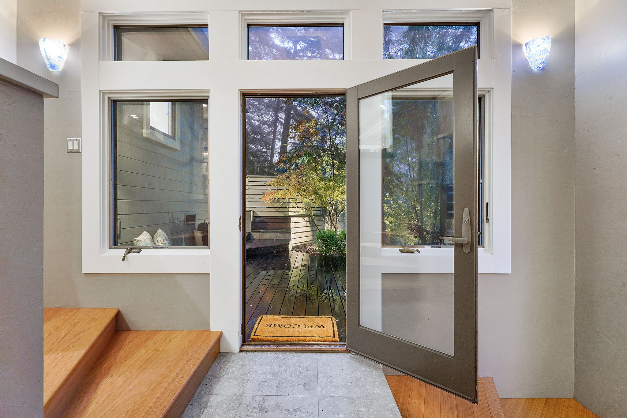 The front entry deck welcomes you into a light and modern foyer with polished stone floors, grand windows, a skylight, and an arched stairway leading up to the living room or down to the garden-level bedroom suite.