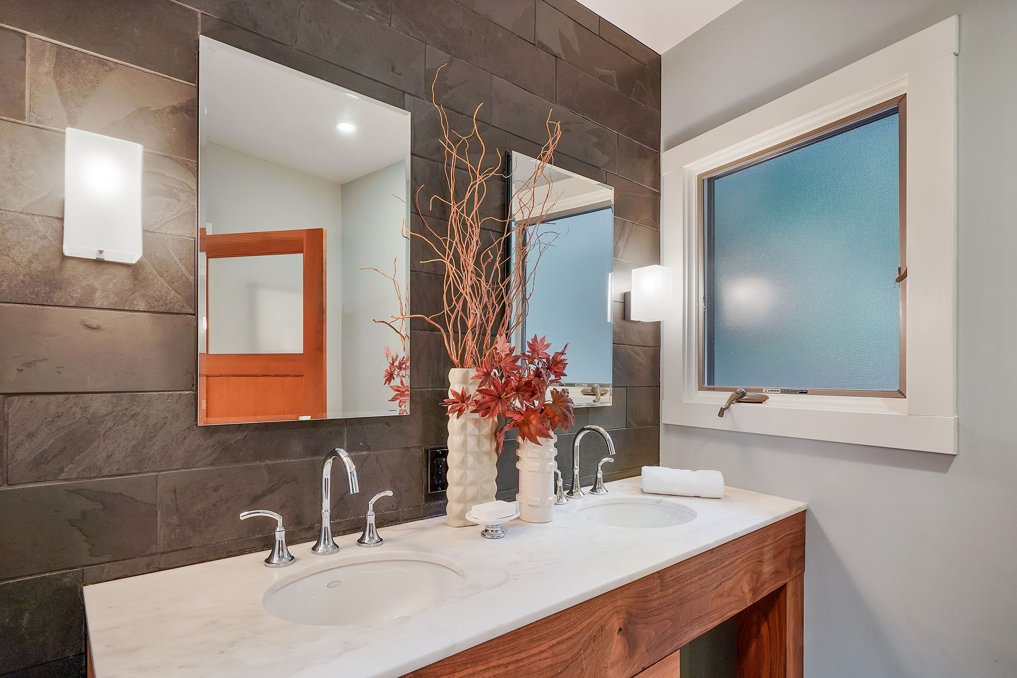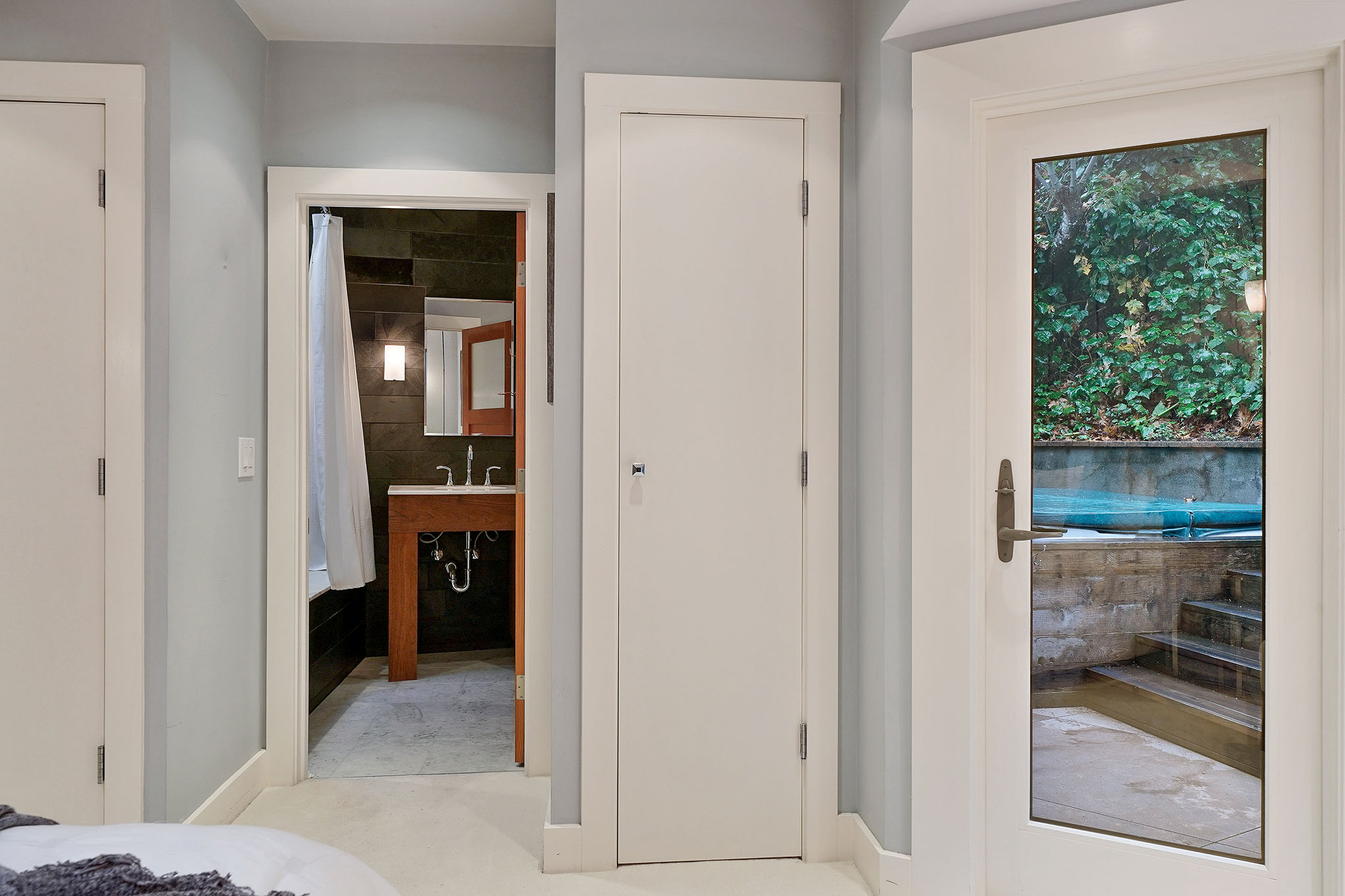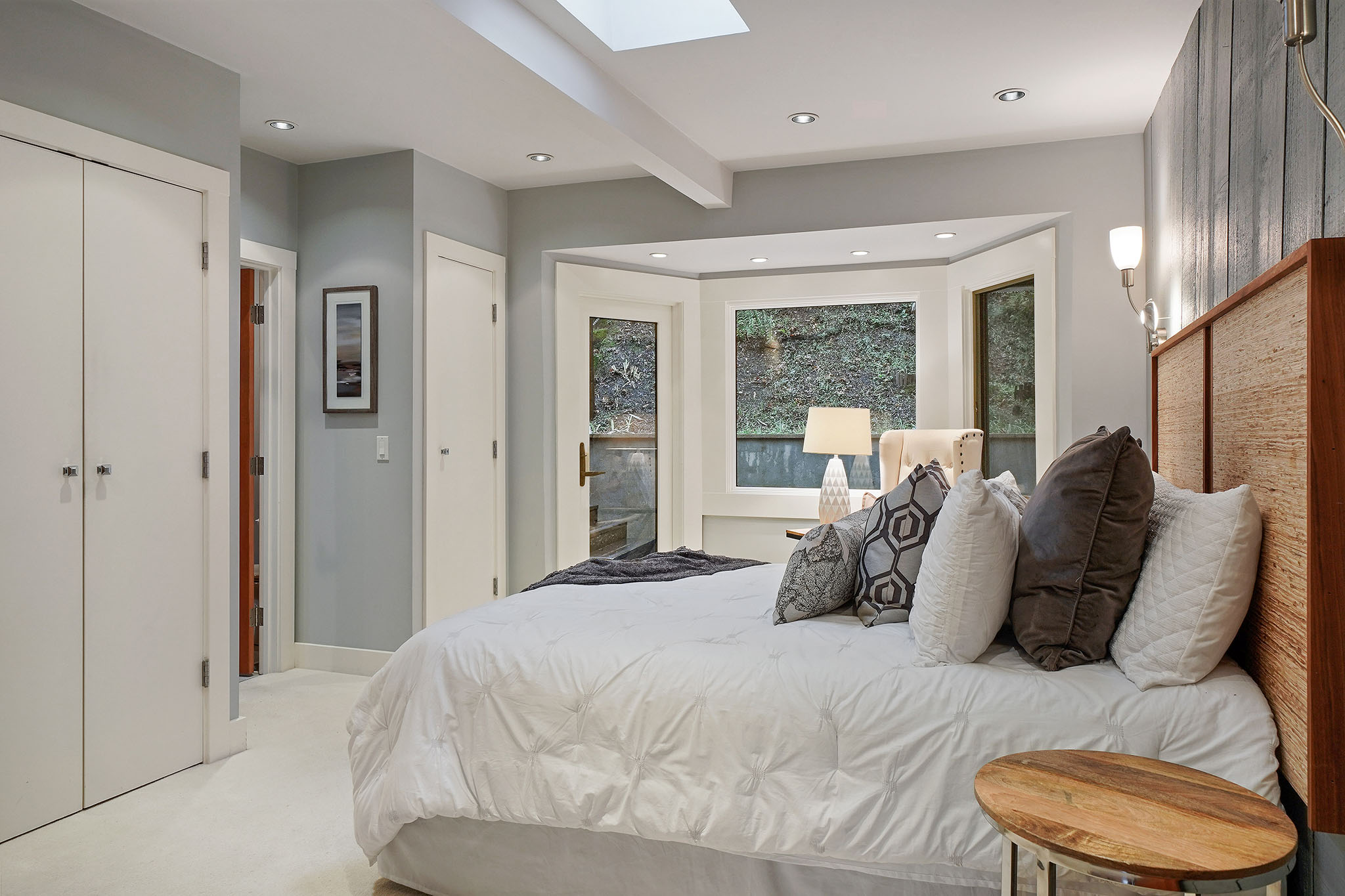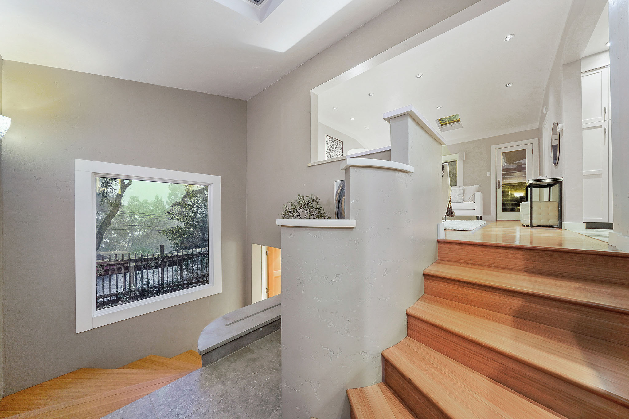 The front entry deck welcomes you into a light and modern foyer with polished stone floors, grand windows, a skylight, and an arched stairway leading up to the living room or down to the garden-level bedroom suite.