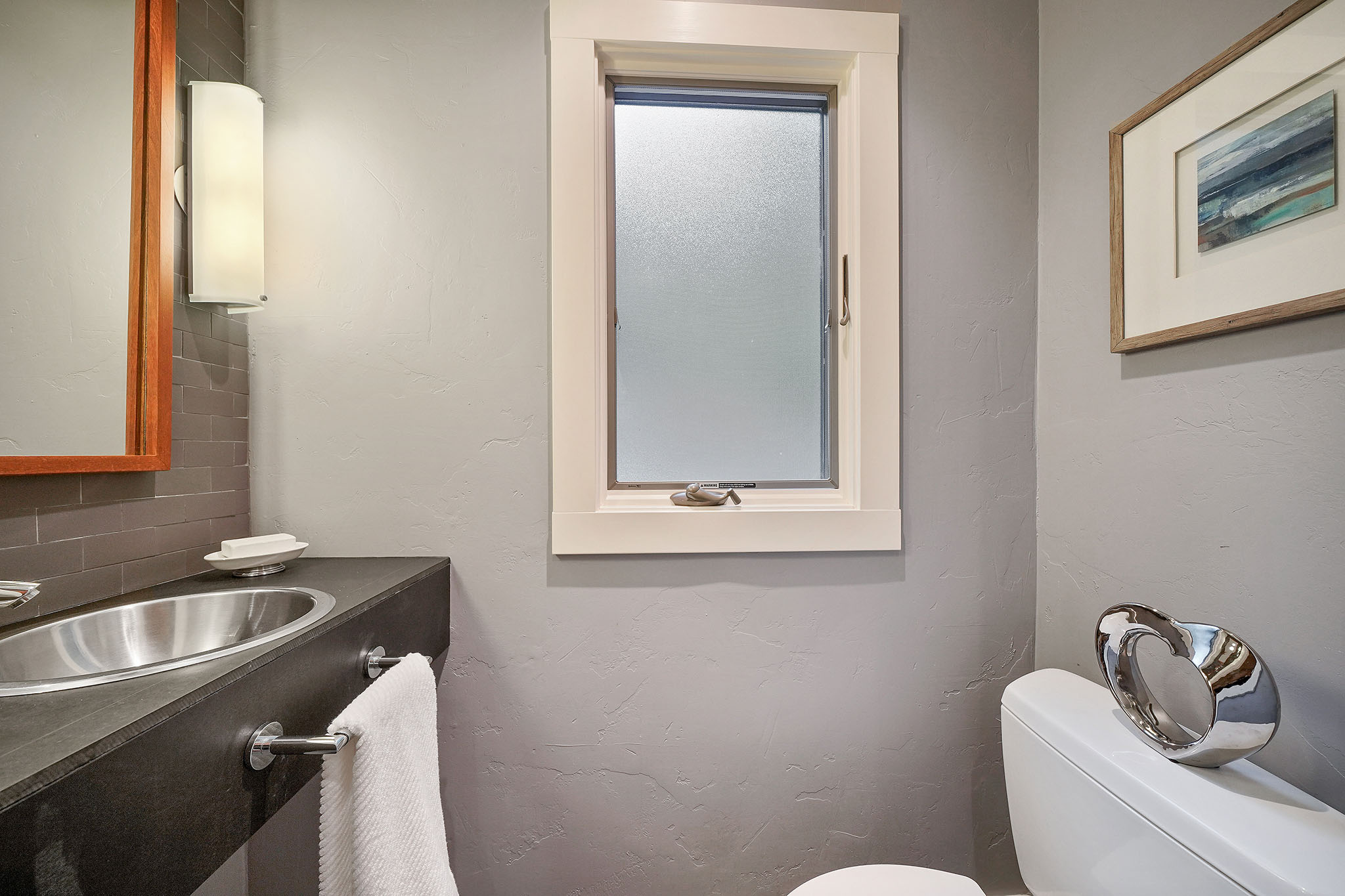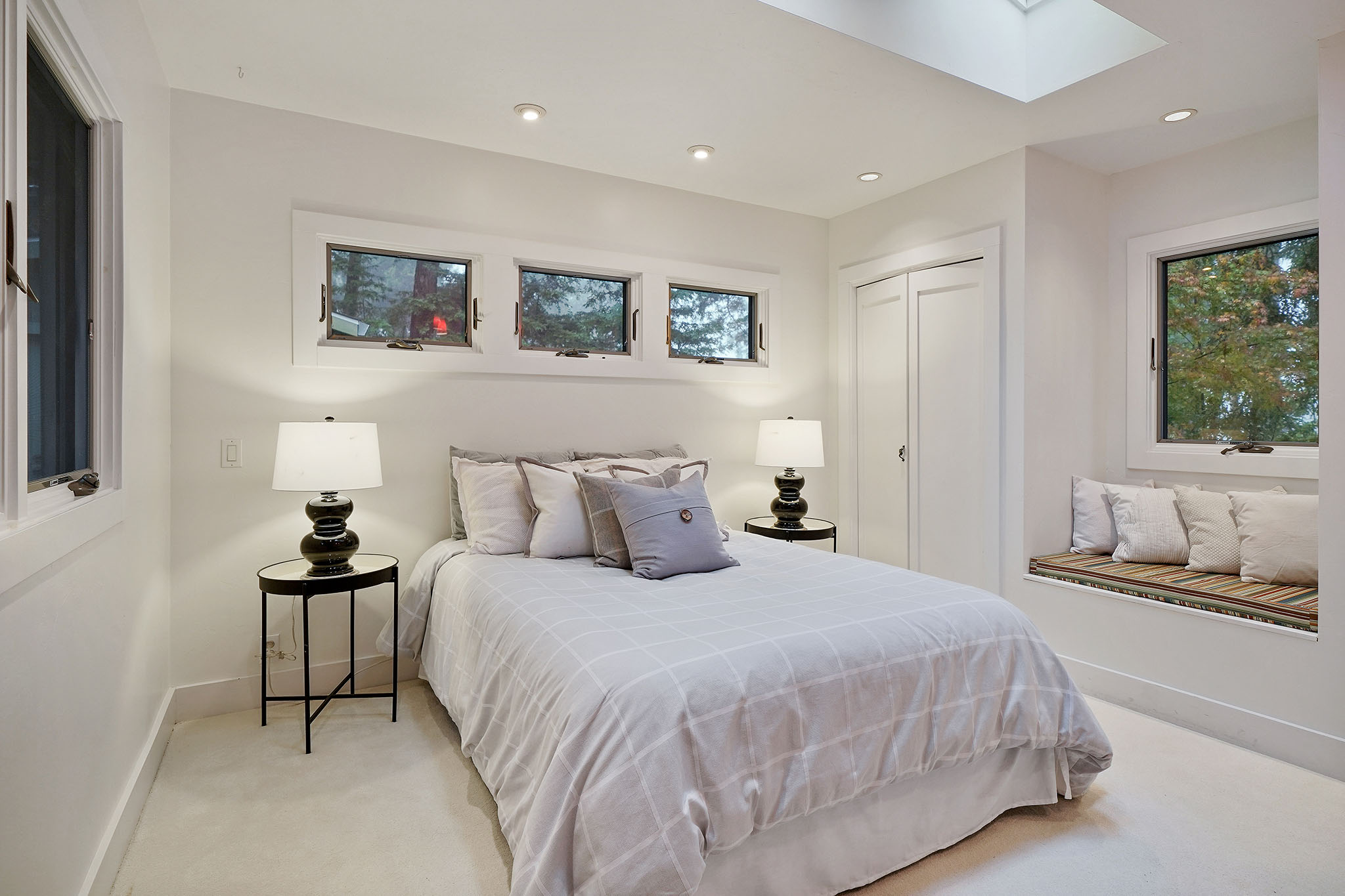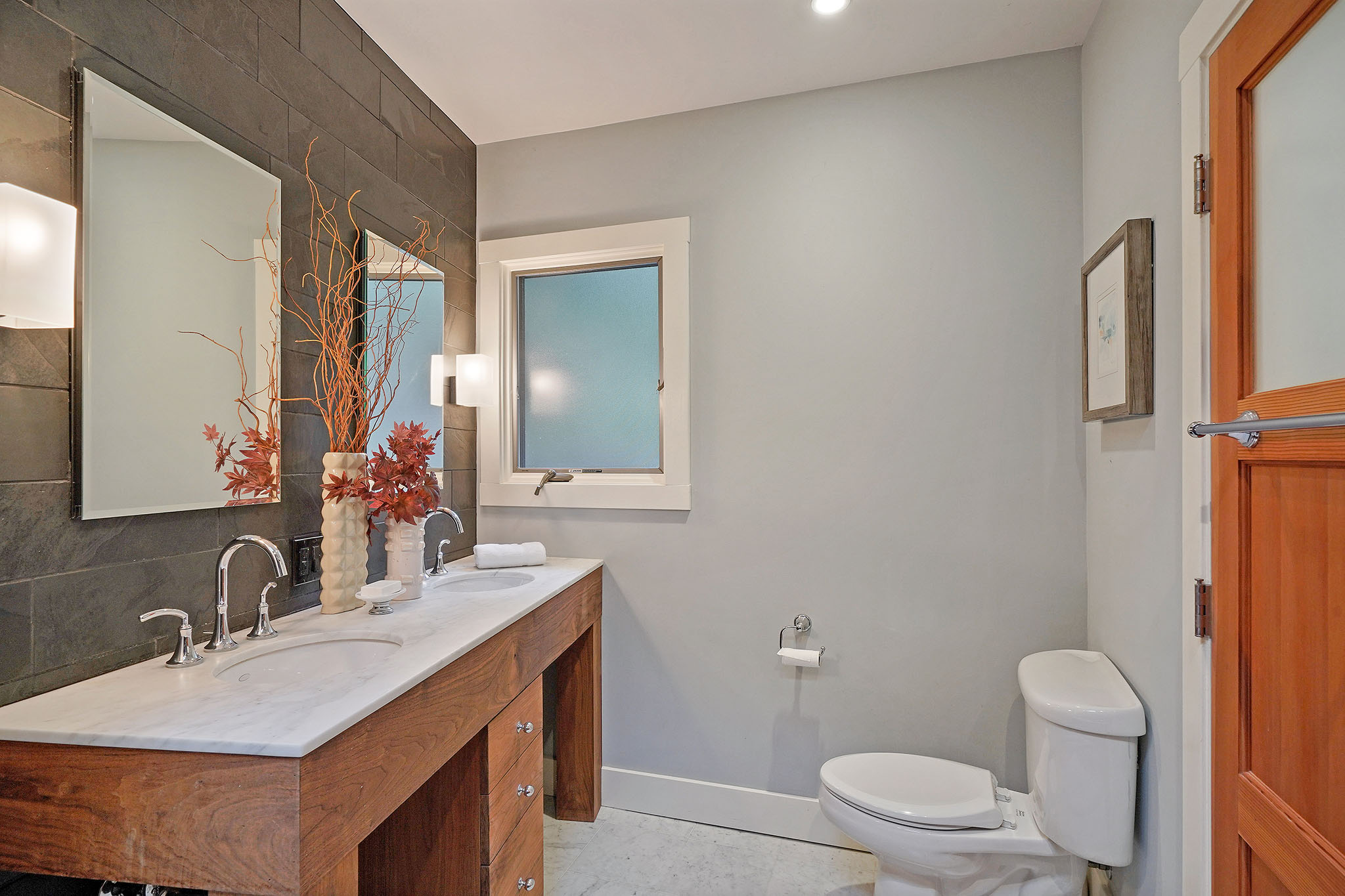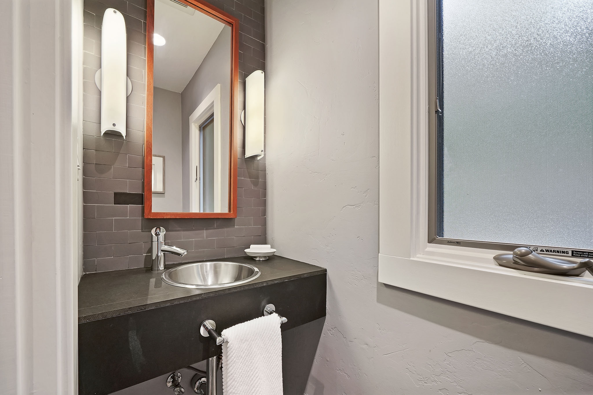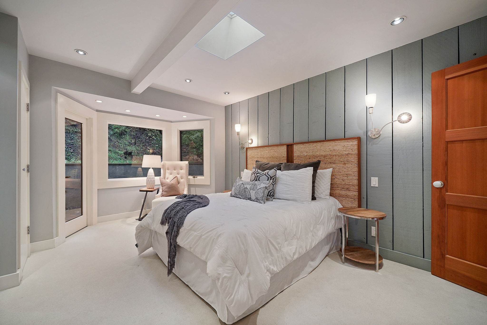 The front entry deck welcomes you into a light and modern foyer with polished stone floors, grand windows, a skylight, and an arched stairway leading up to the living room or down to the garden-level bedroom suite.