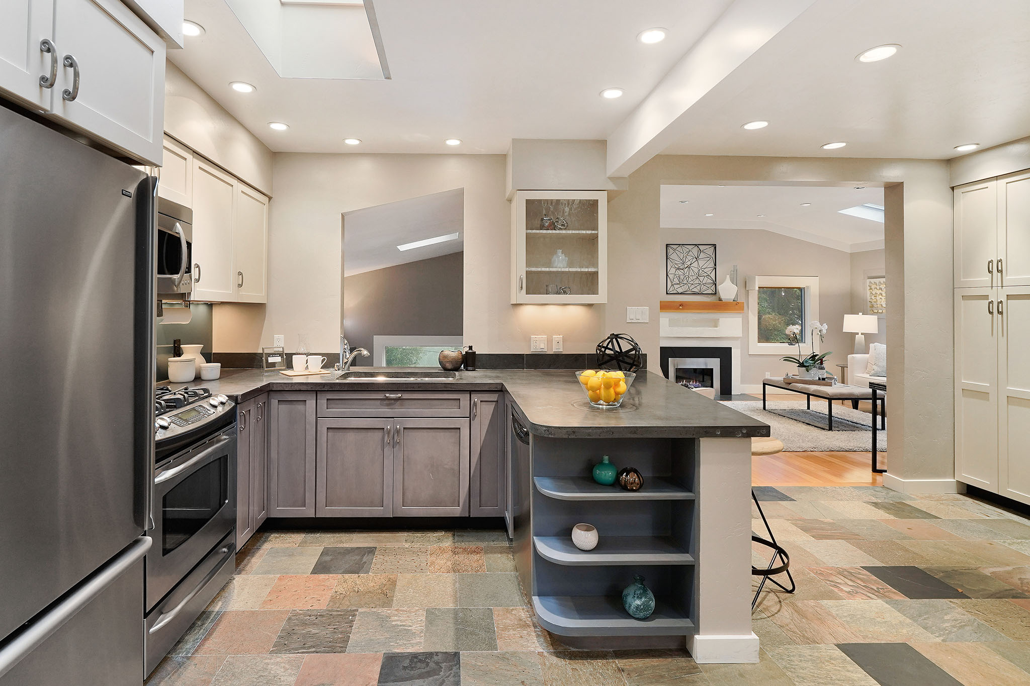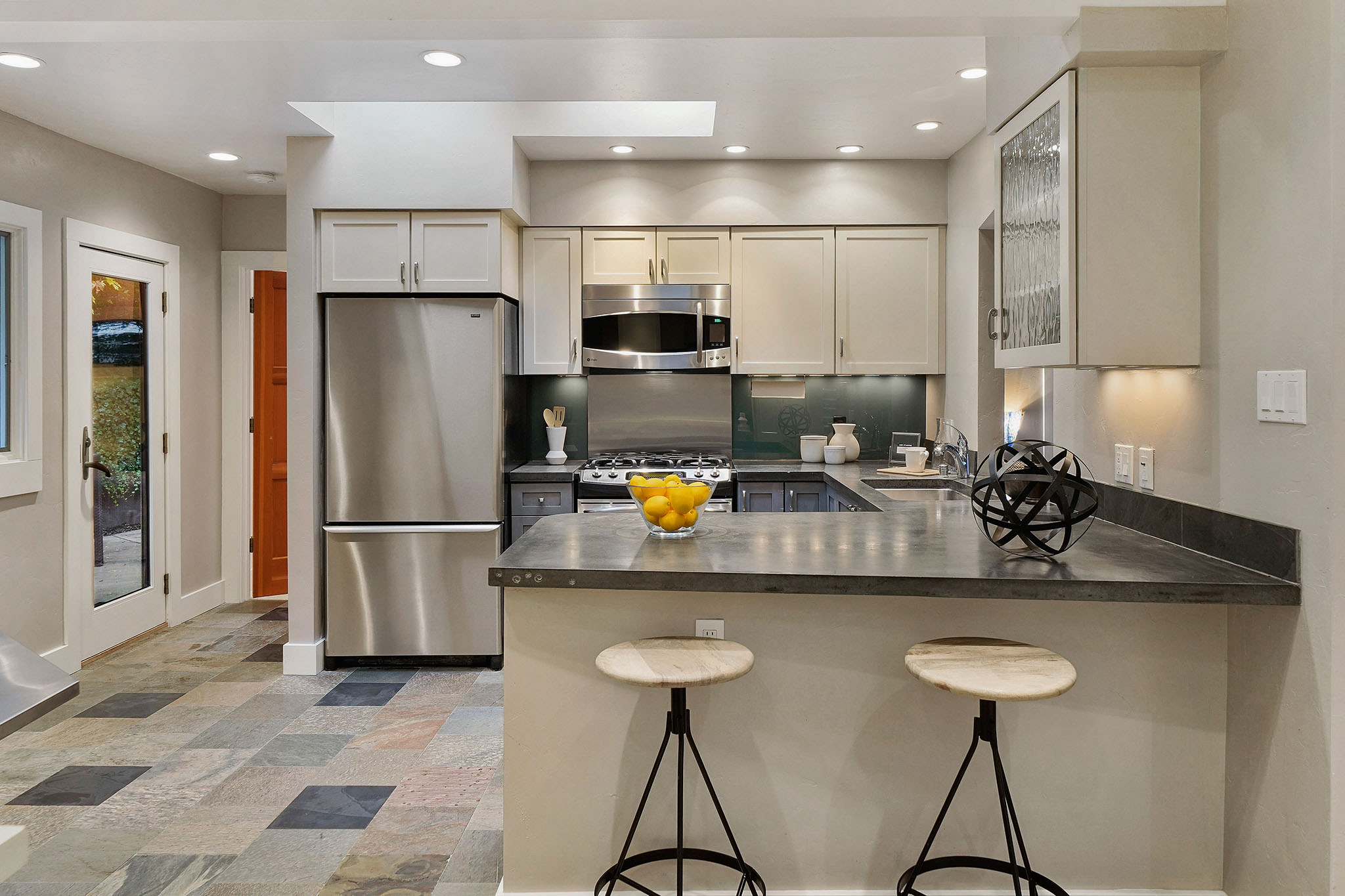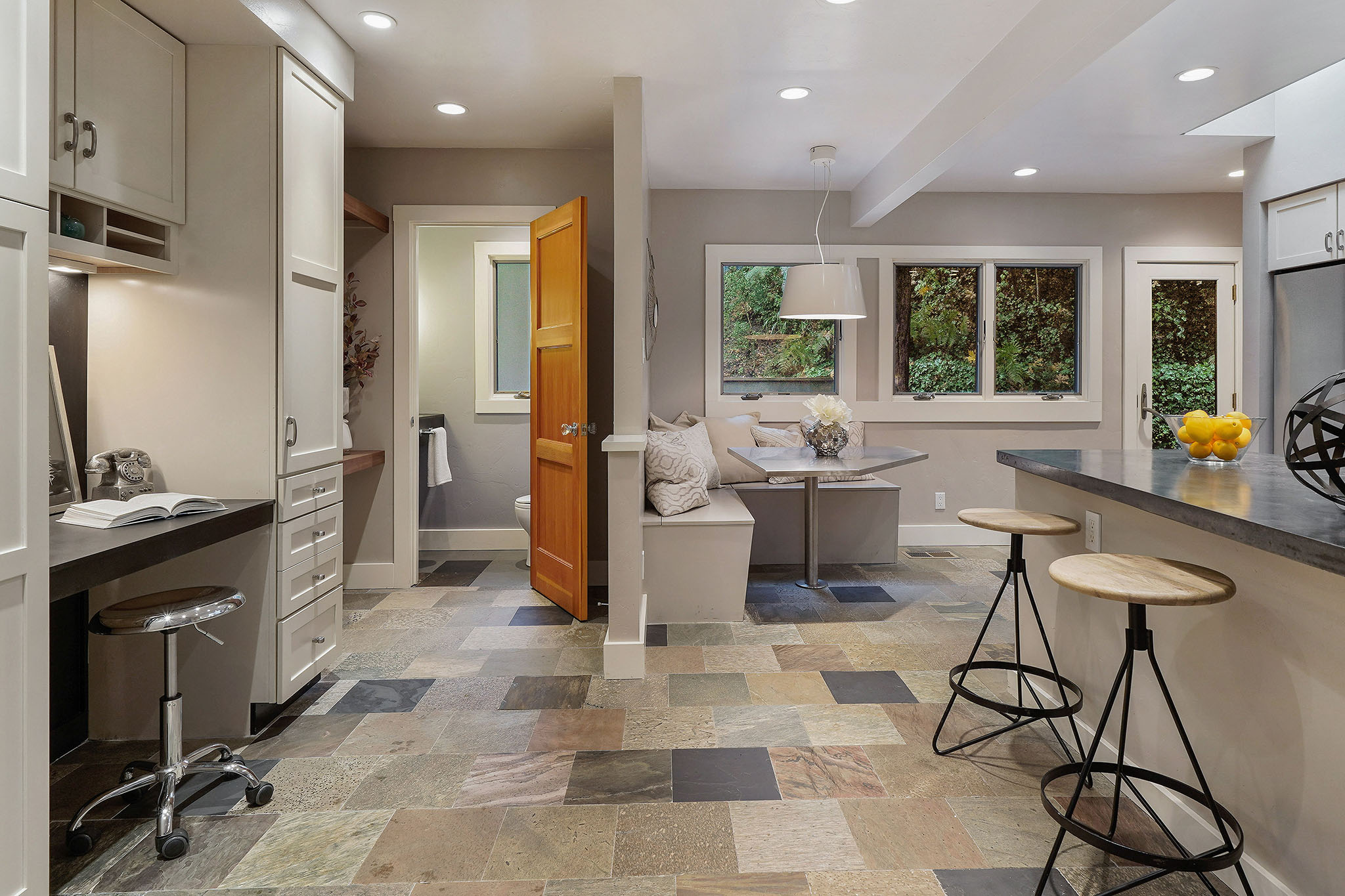 - Eat-In Kitchen: Slate Floors, Concrete Counters, Painted Cabinetry, Stainless Steel Appliances, Built-In Desk;