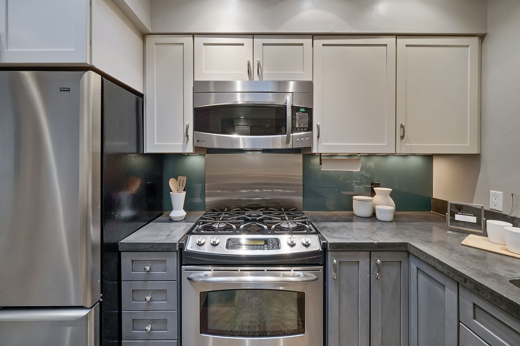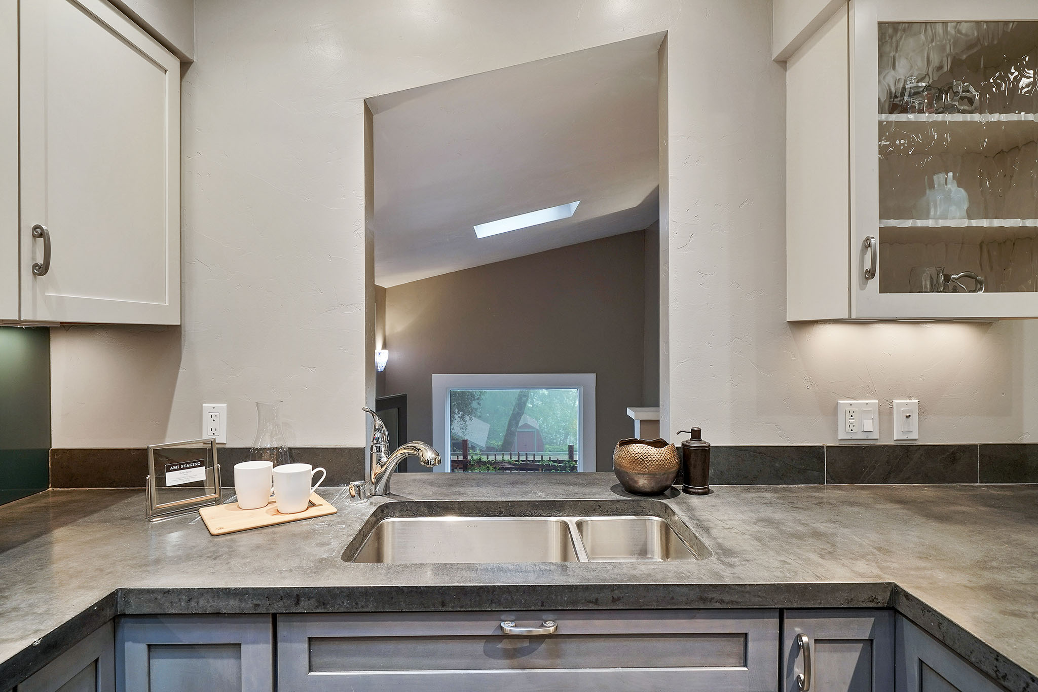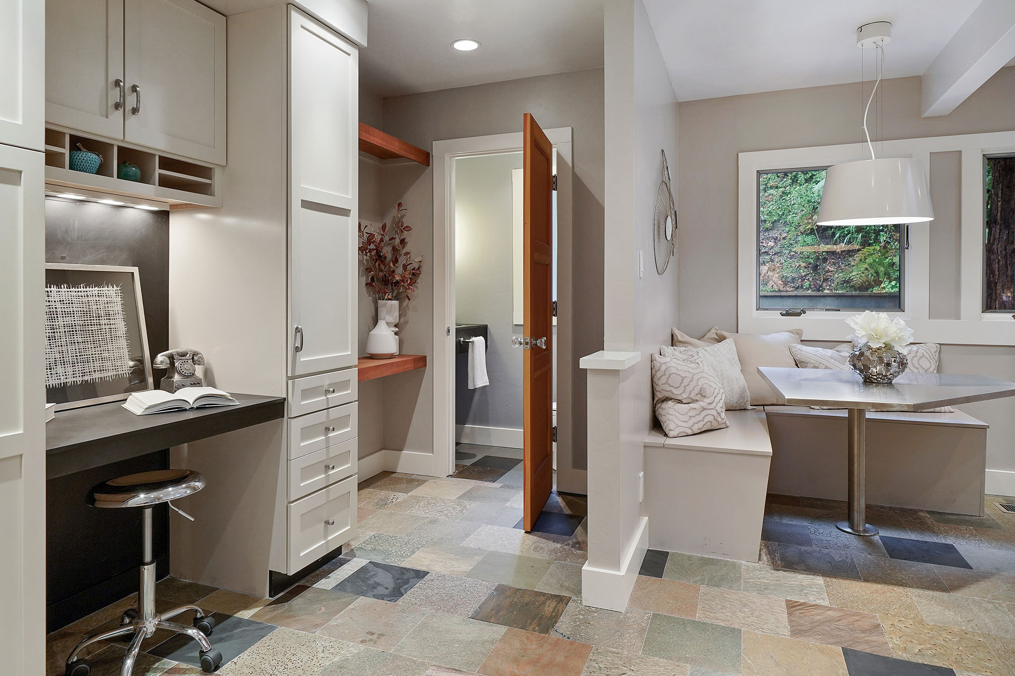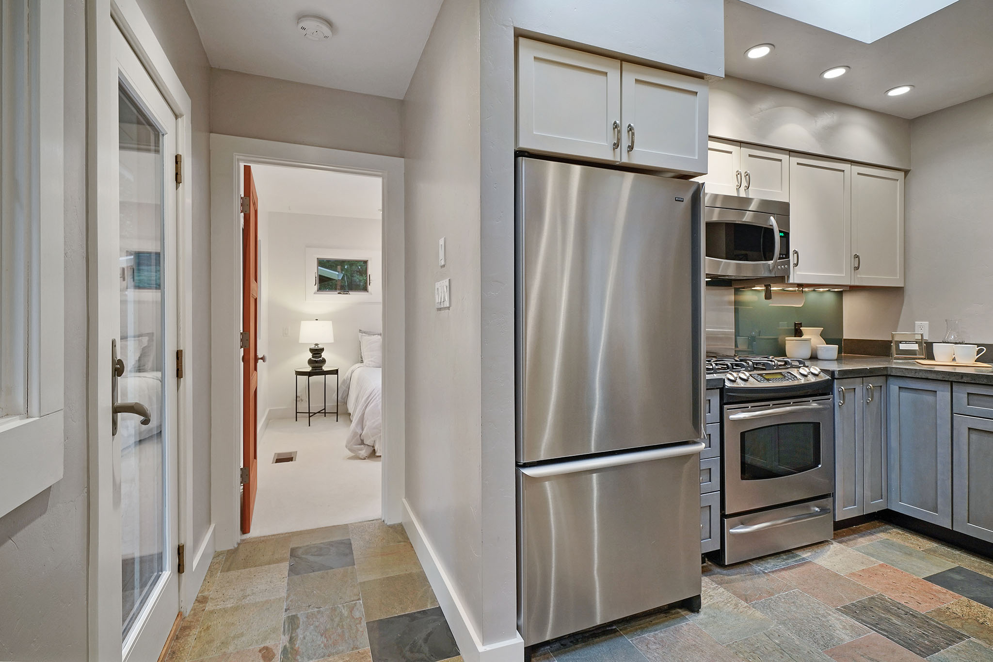 - Eat-In Kitchen: Slate Floors, Concrete Counters, Painted Cabinetry, Stainless Steel Appliances, Built-In Desk;