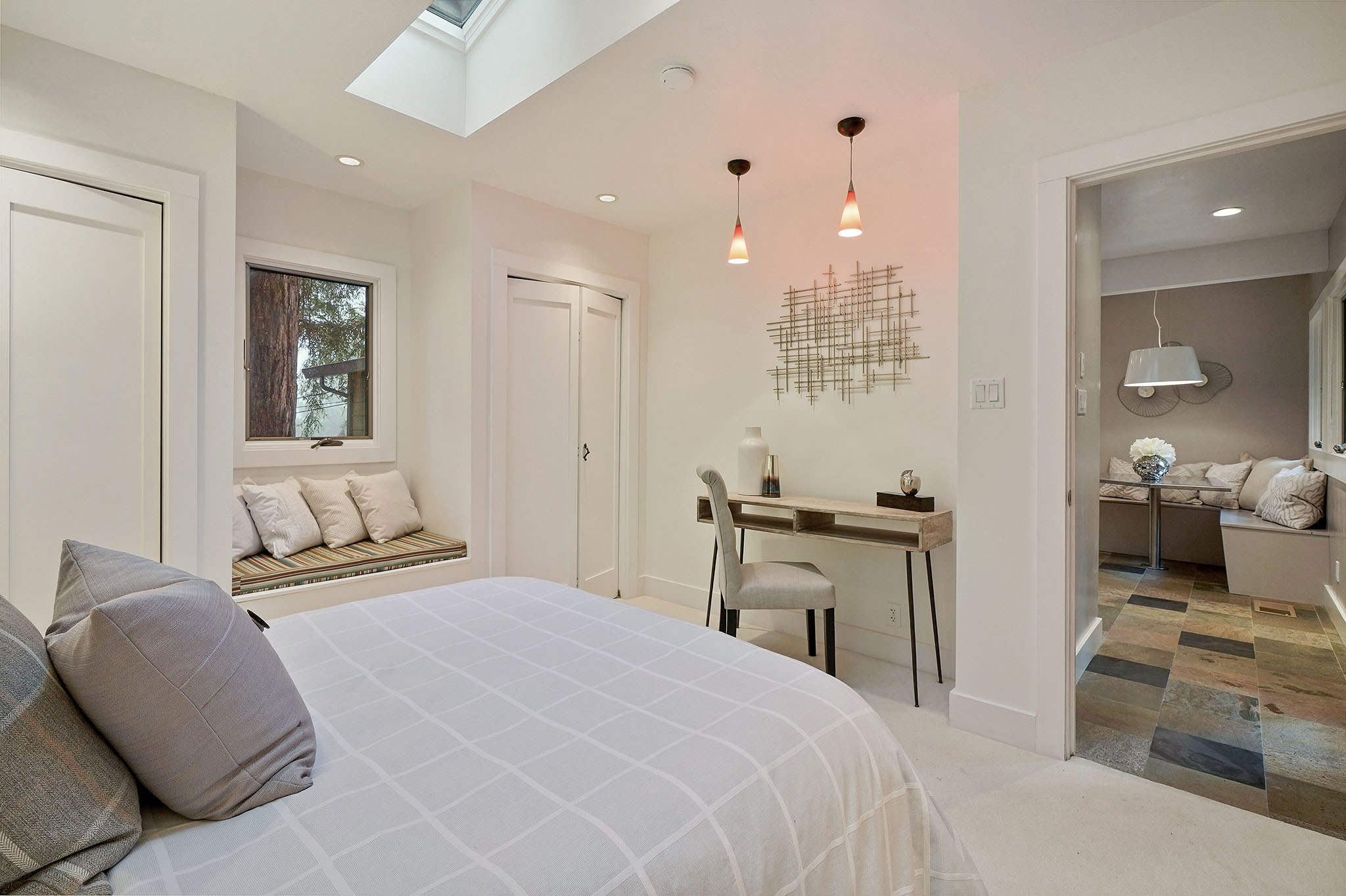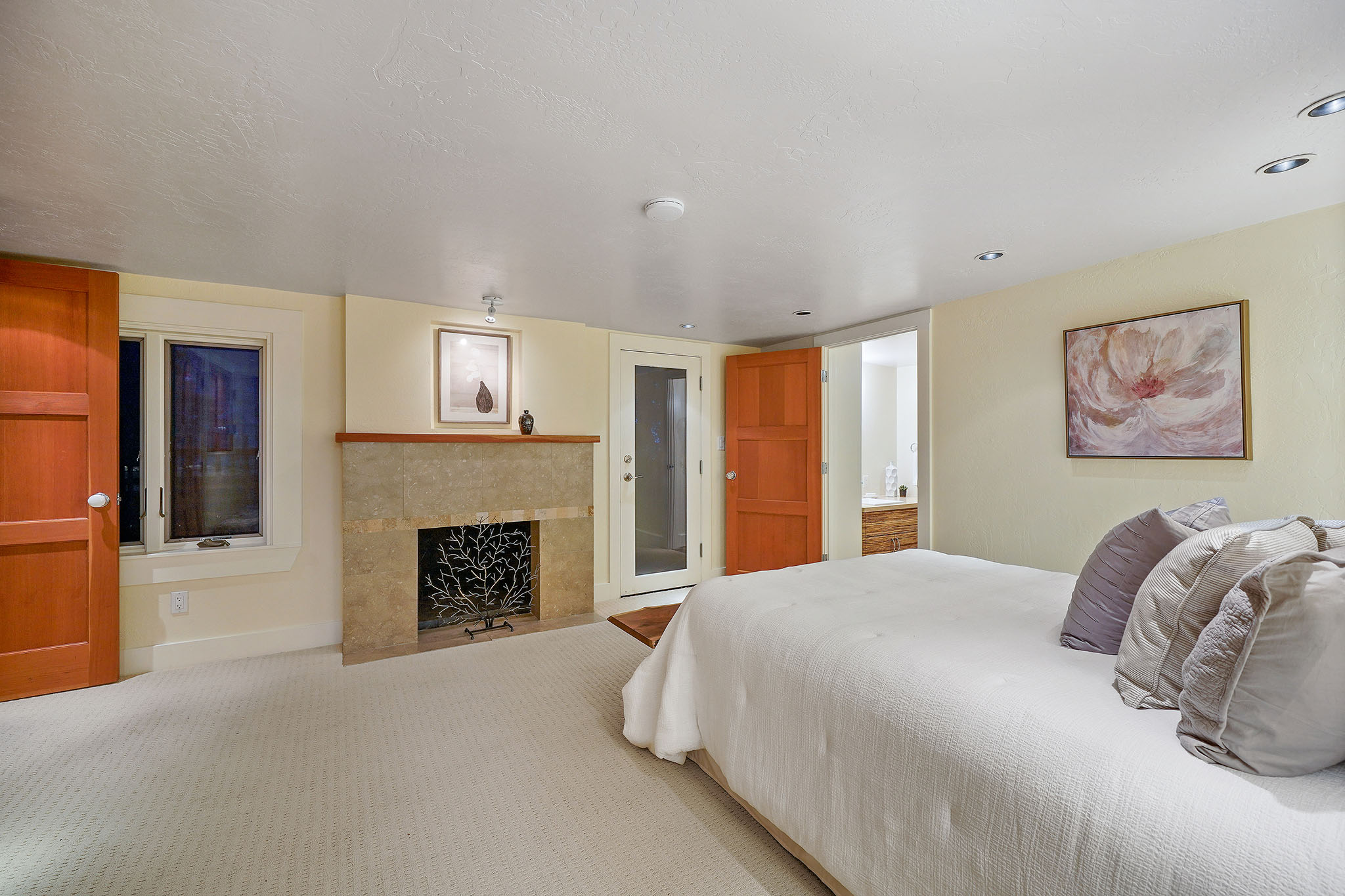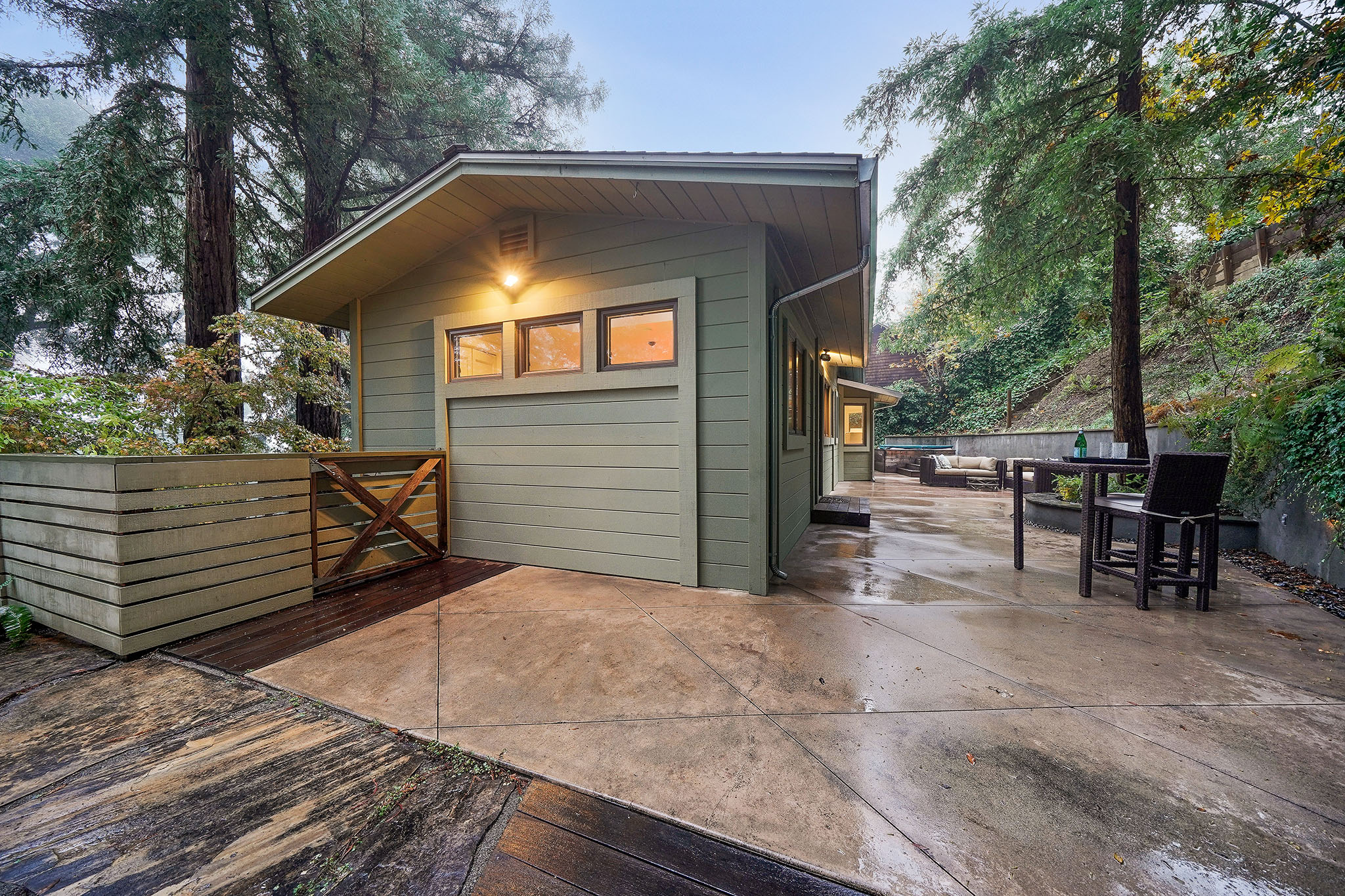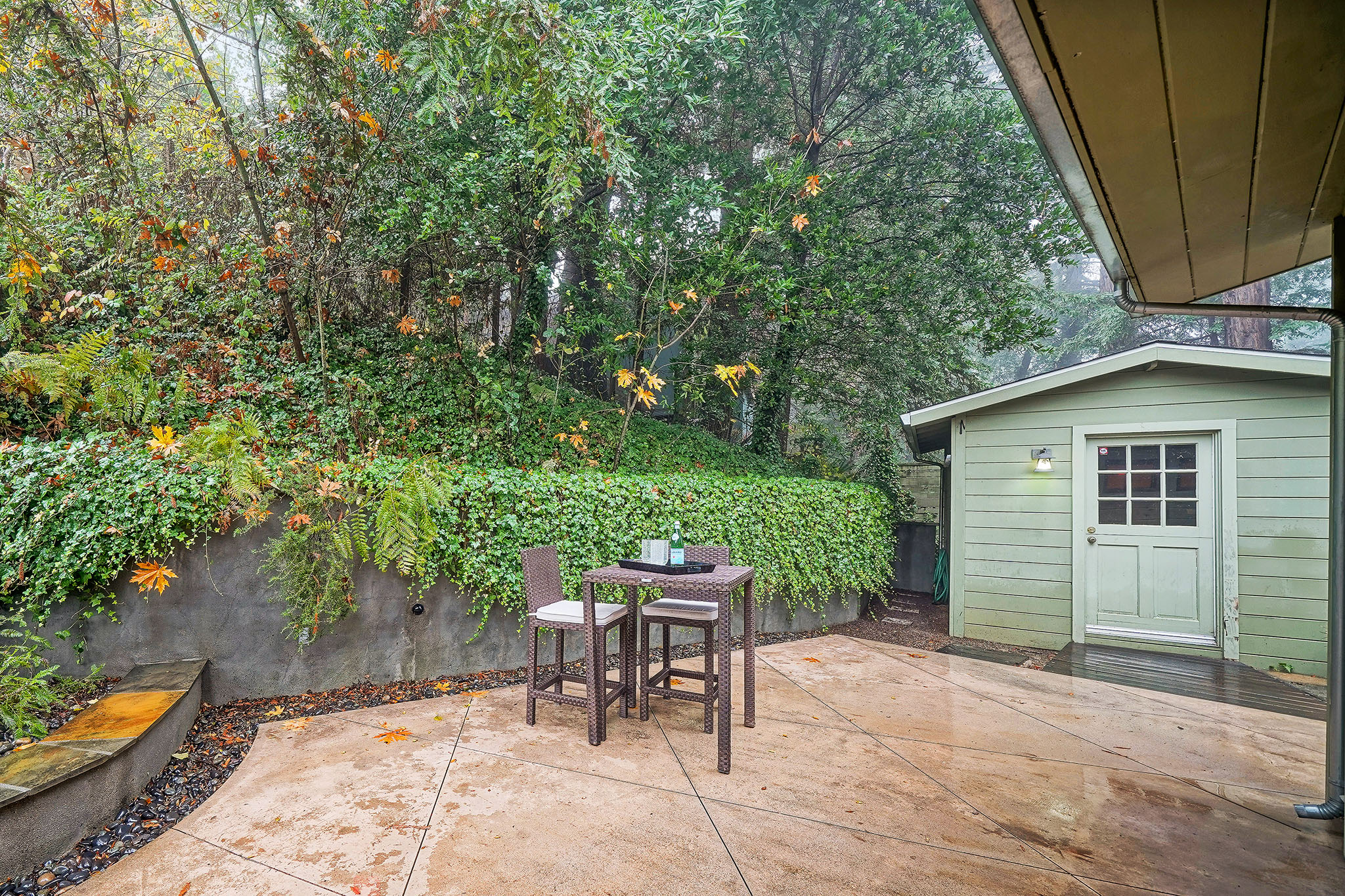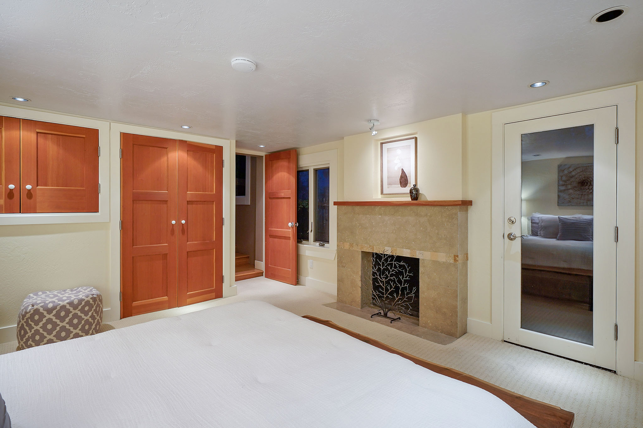Downstairs, you'll find a third bedroom suite with a decorative fire place and a full en suite bath. This bedroom offers direct exterior access to a garden level patio with Redwood trees, and a storage utility room around the side of the house. A full laundry/storage room is accessed from this bedroom suite.