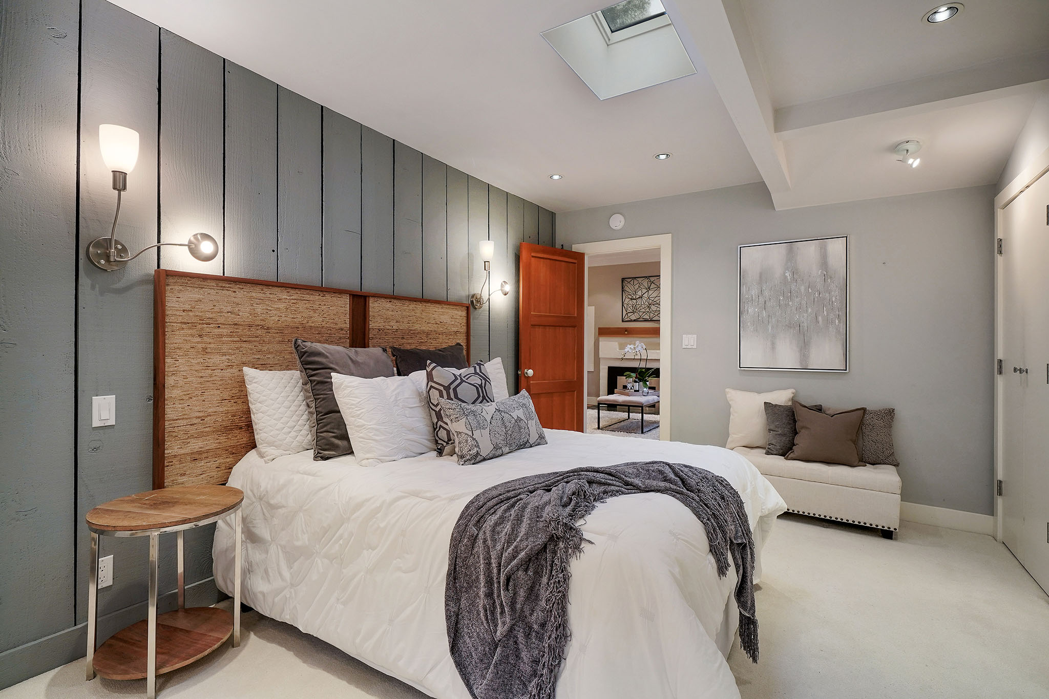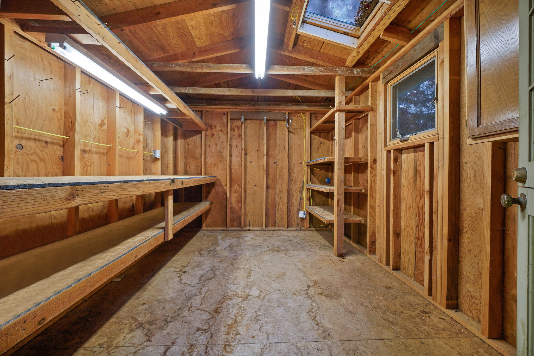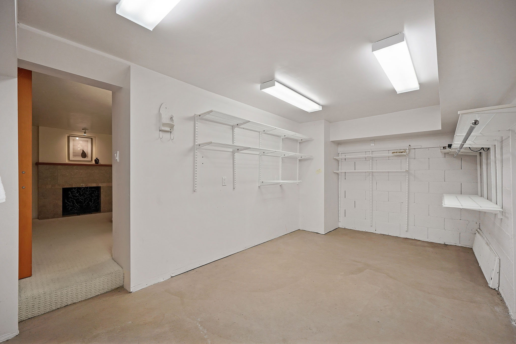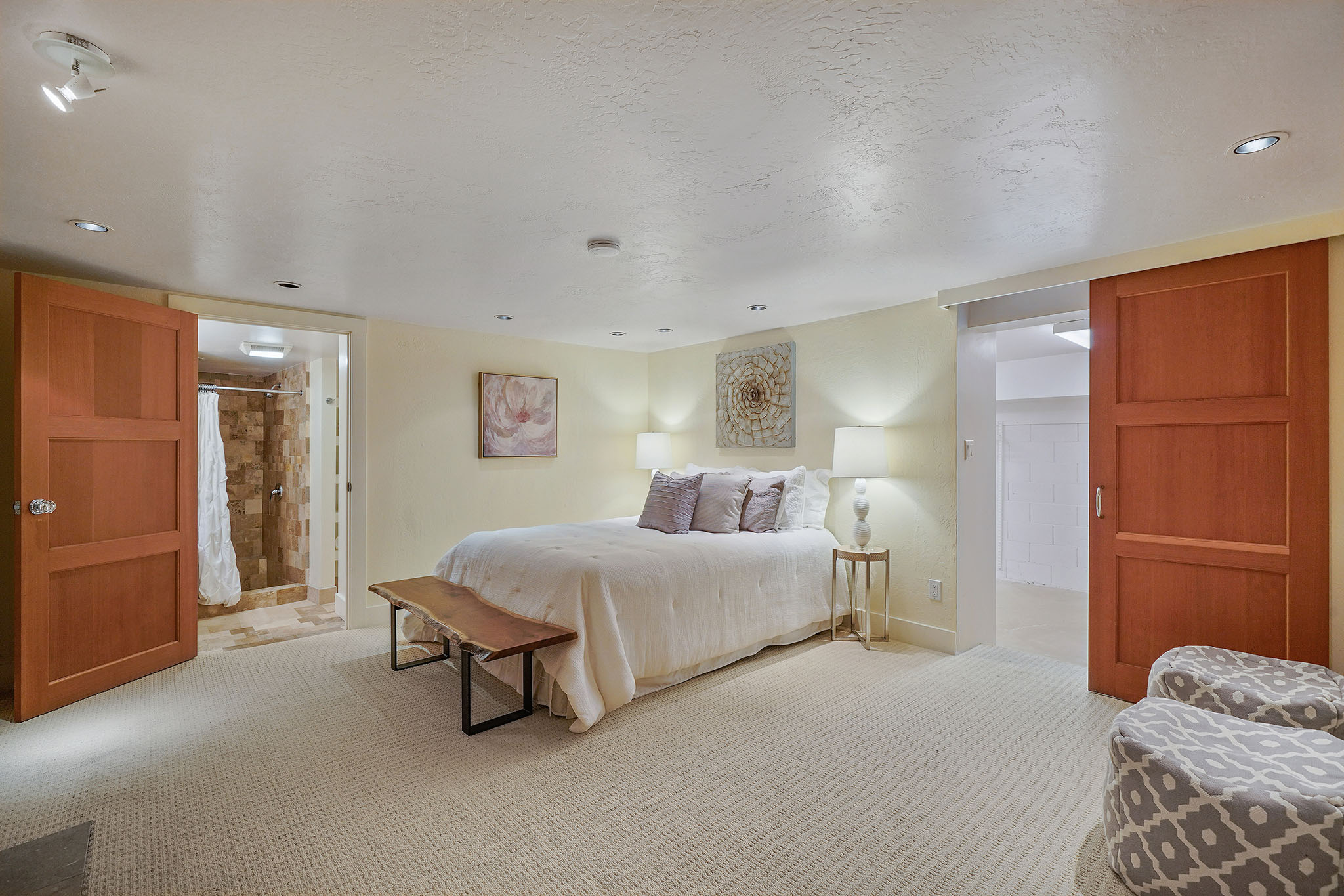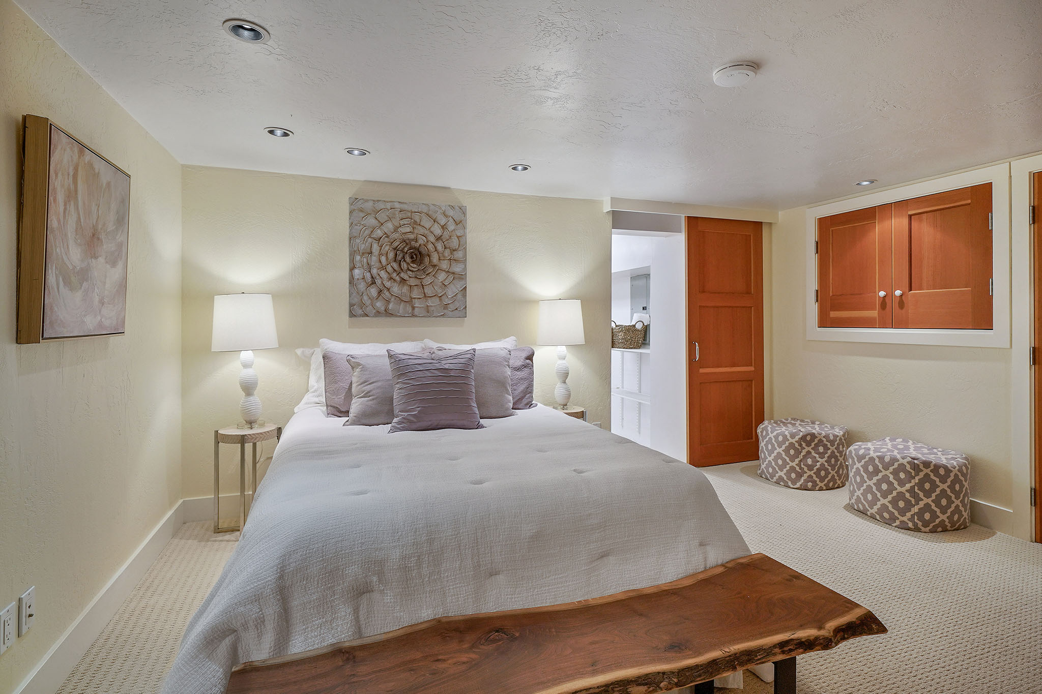 Downstairs, you'll find a third bedroom suite with a decorative fire place and a full en suite bath. This bedroom offers direct exterior access to a garden level patio with Redwood trees, and a storage utility room around the side of the house. A full laundry/storage room is accessed from this bedroom suite.