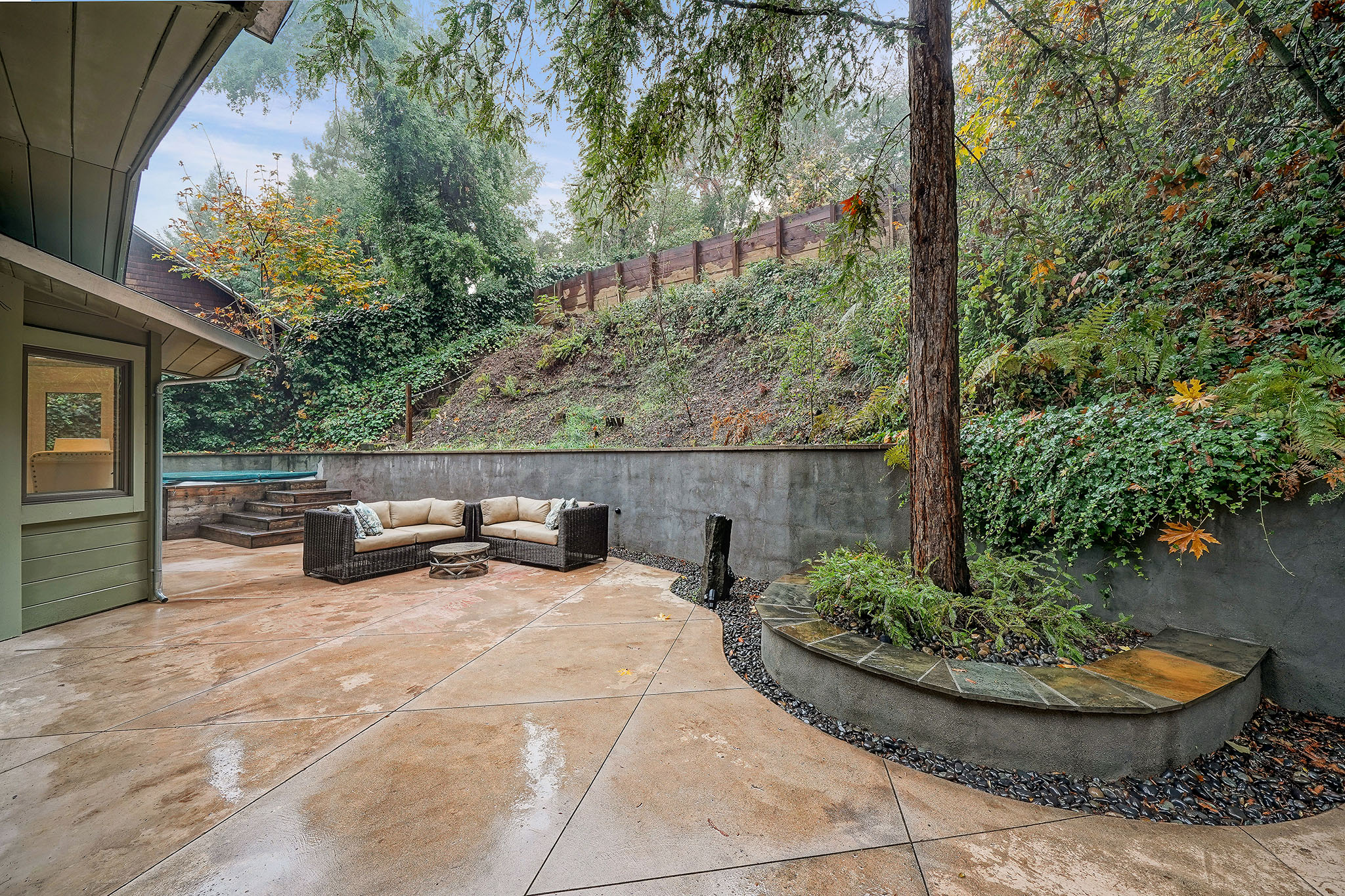 Off the back, the kitchen opens to an expansive patio deck terrace with a private hot tub spa, hot-outdoor shower, railroad tie stairs up to a top-terrace space with views as far as San Pablo Bay. Additionally, the patio features a stone sculpture fountain, distinguished Redwood tree with a stone seating well, a large deluxe garden shed with a skylight and interior lighting, and an expansive stone fire-pit-patio with seating. The patio terrace level is fully gated and fenced with multiple indoor-outdoor lounge areas for comfortable easy living. The natural beauty surrounding this home is as dramatic as it is serene.