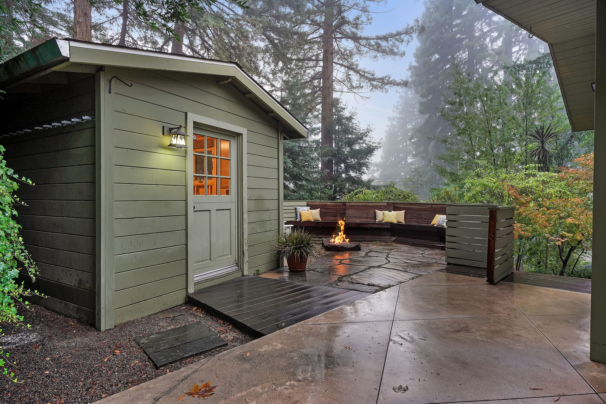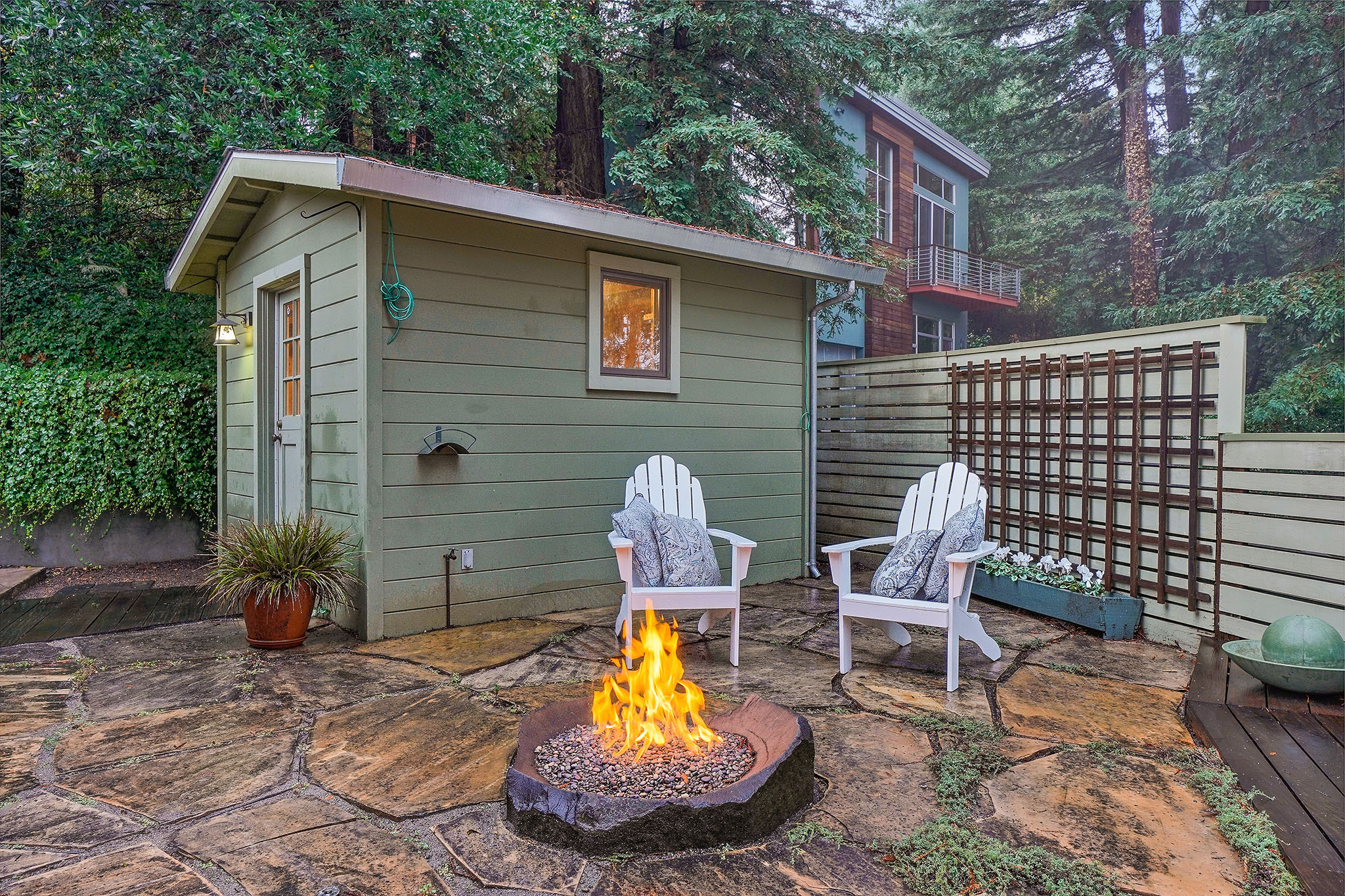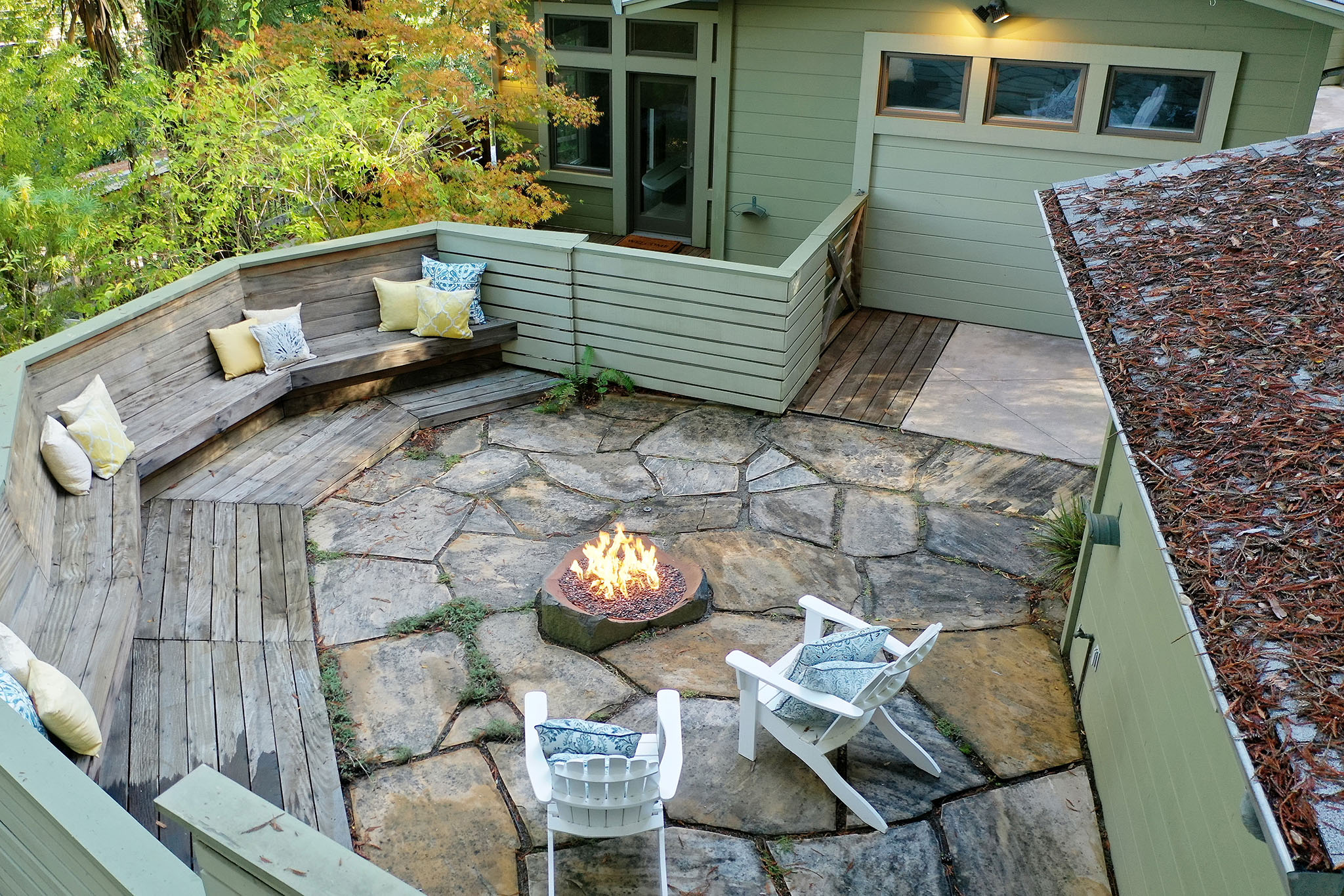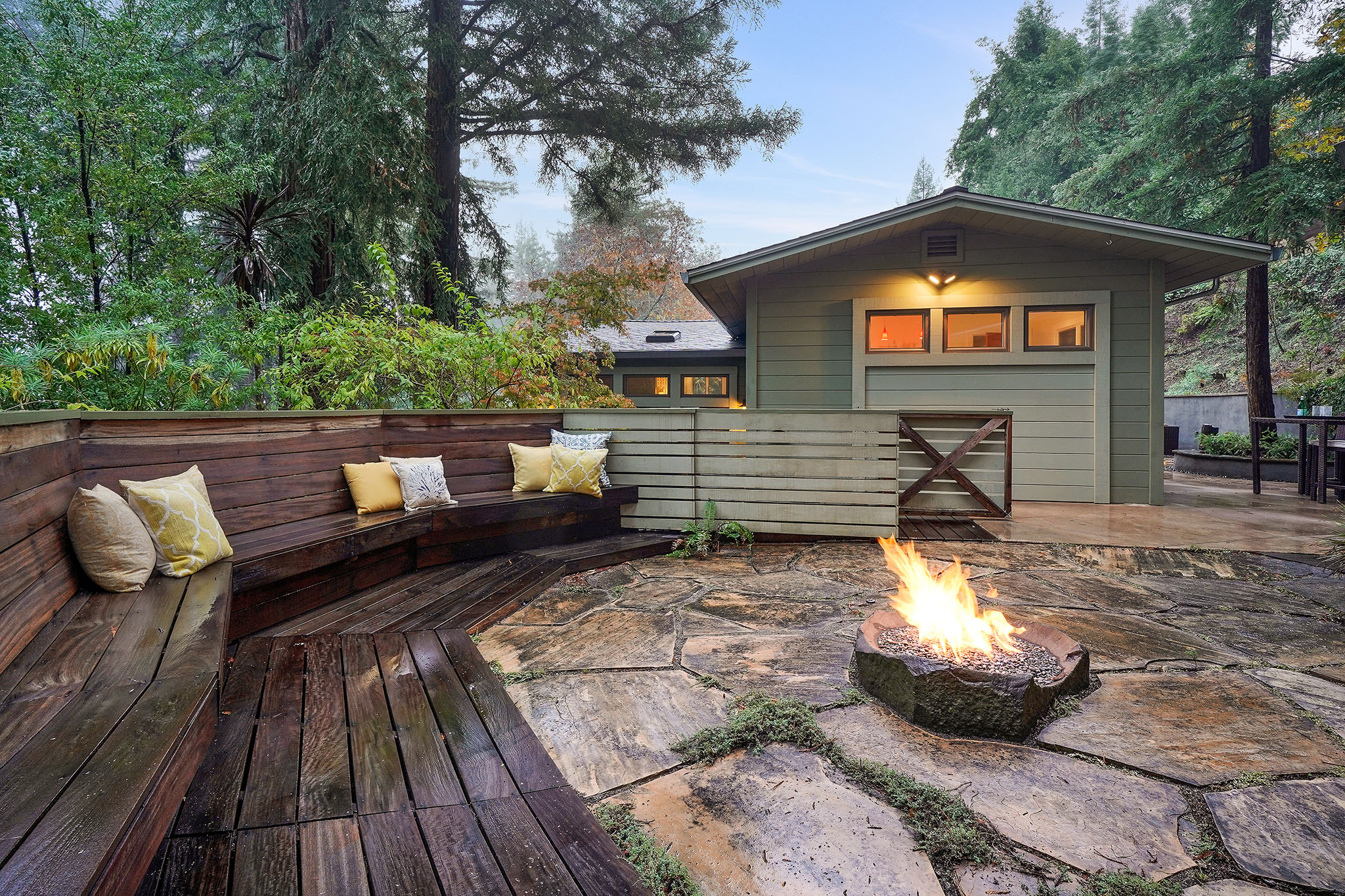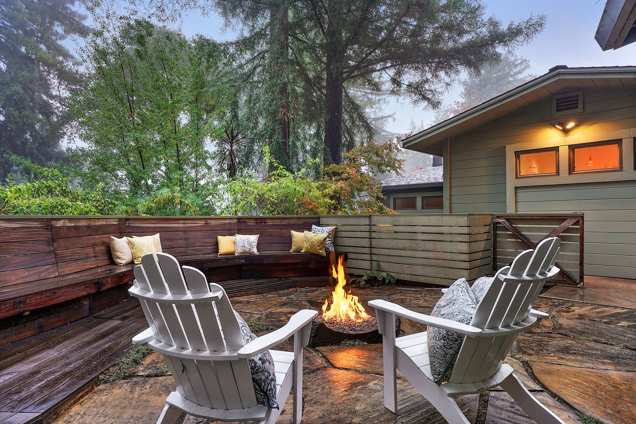 - Gas Fire Pit Patio With Seating, Sculptural Fountain, Redwood Trees