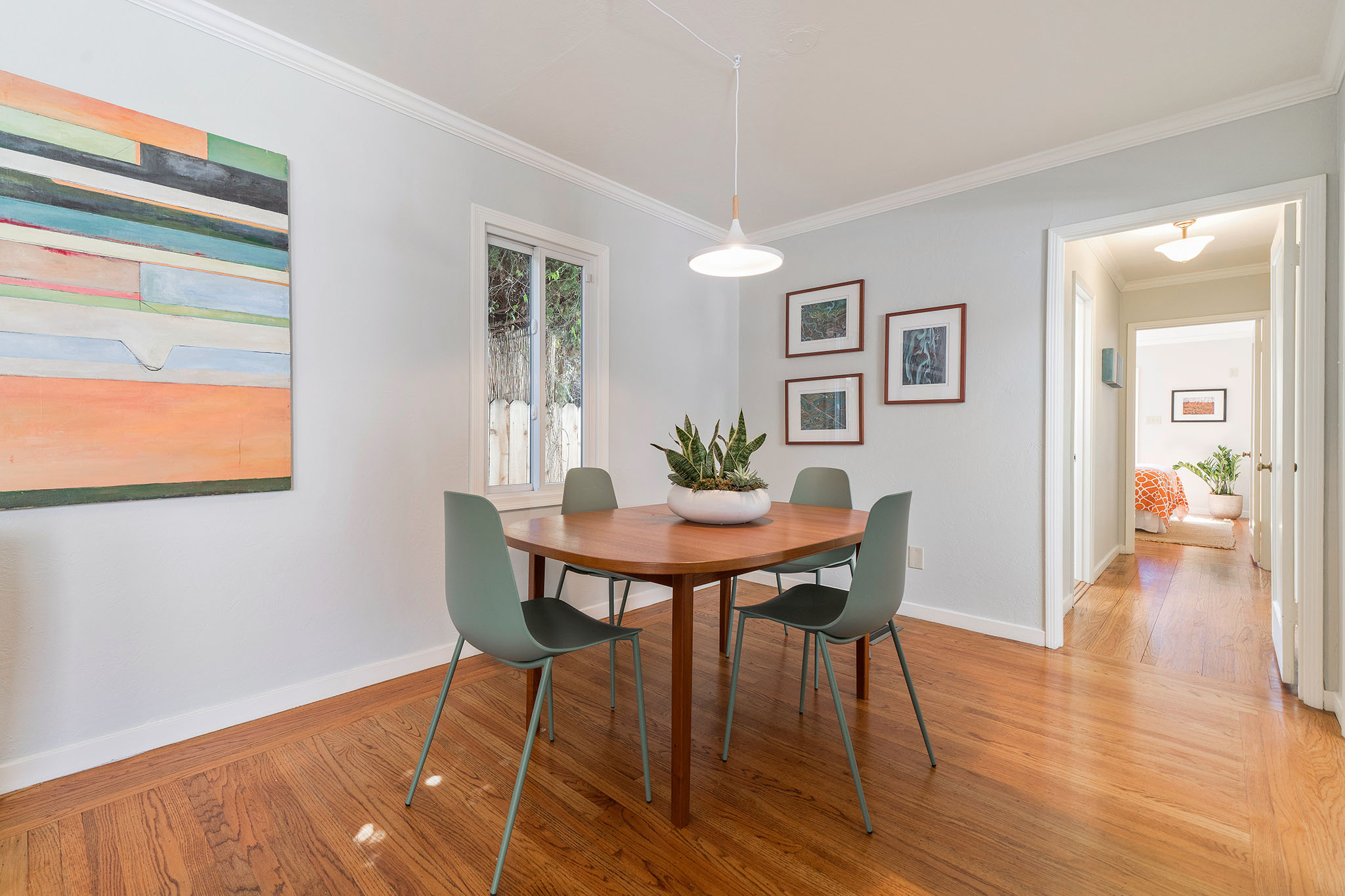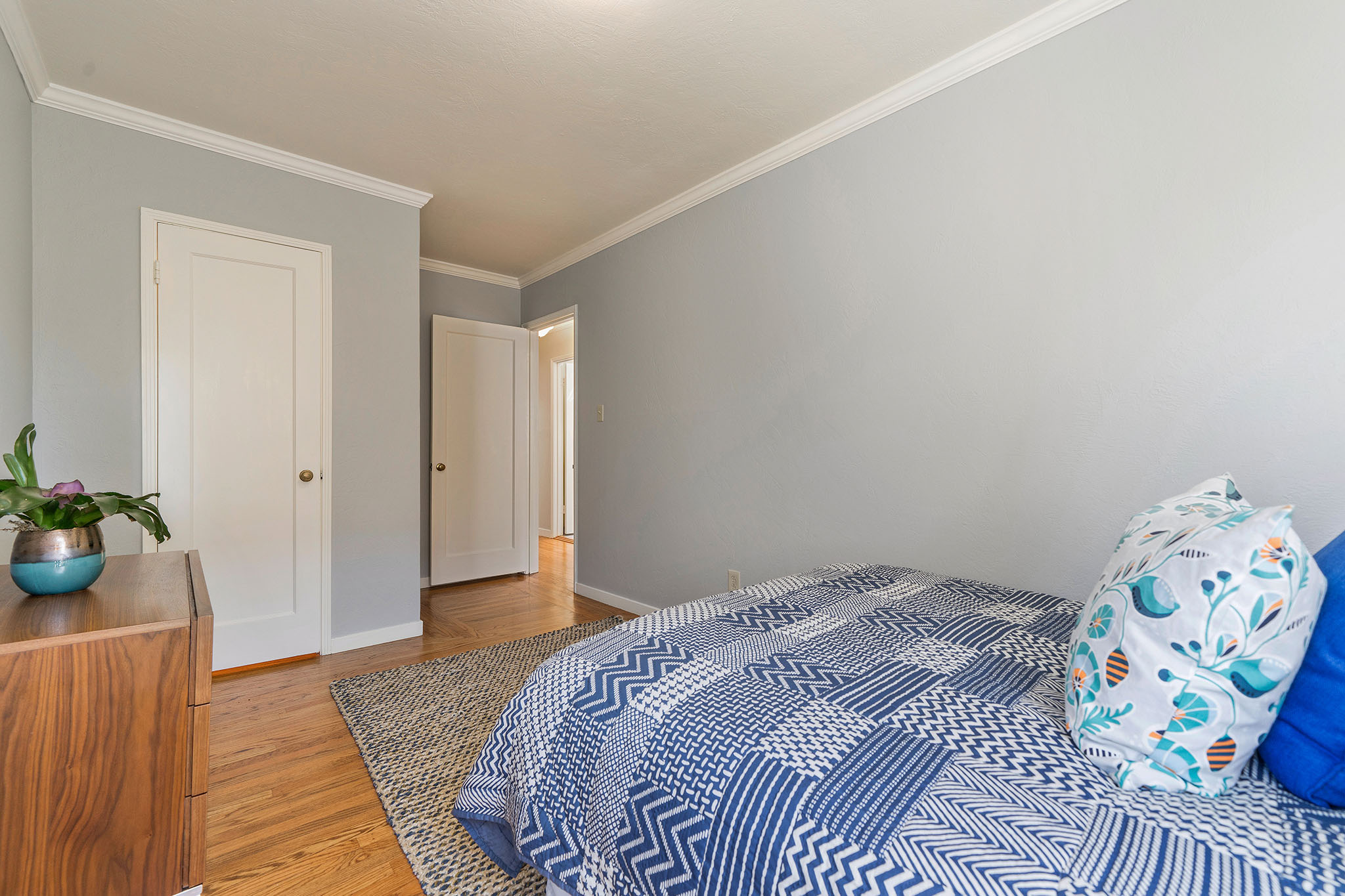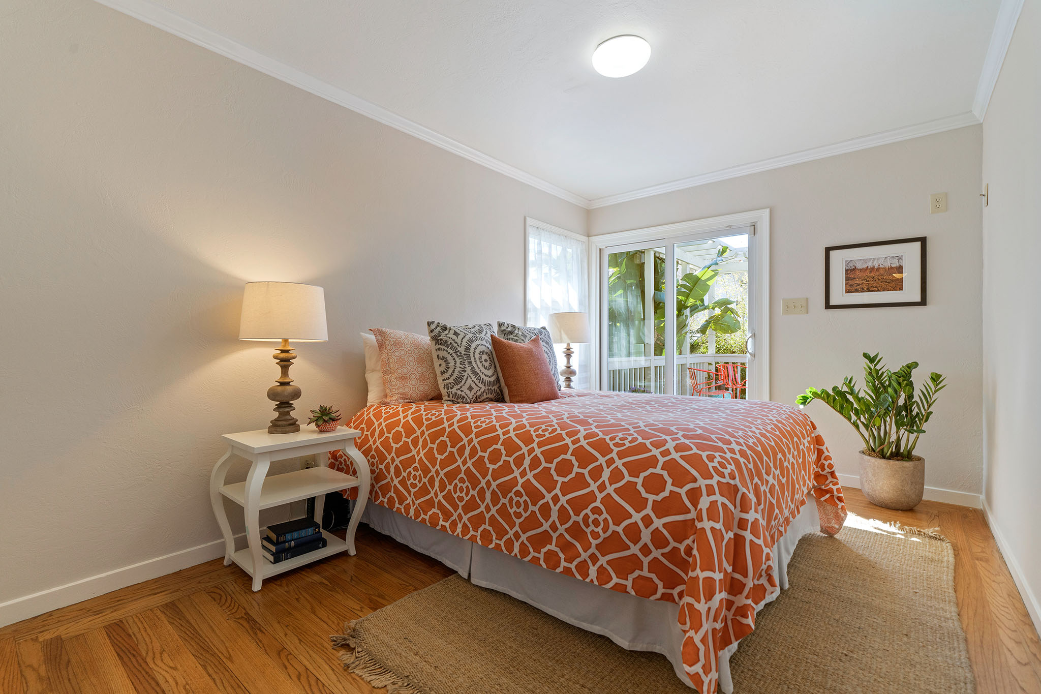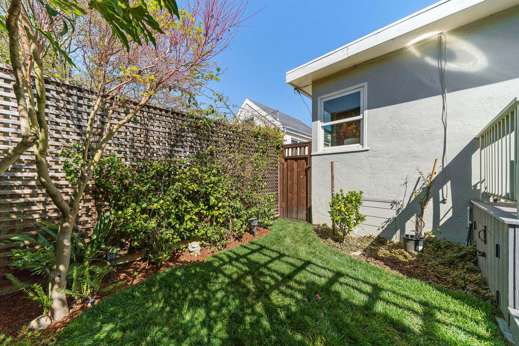 Peaceful Albany stunner nestled off the street. This two bedroom, one-plus bathroom home has hardwood floors and crown molding throughout, plus fresh paint on the interior. Open style living/dining rooms feature recessed and new lighting (2019). Efficient kitchen with handsome glass-tiled backsplash, gas stove, skylight, Bosch dishwasher and lovely garden-box window. Adjacent laundry room has full-size washer/dryer and an on-demand water heater. Sunny master with big closet and newer sliding glass door opens onto rear deck and charming backyard with new grass (2019) and colorful landscape. Complete with a view of Albany Hill. Second bedroom has new paint (2019), a nicely-sized closet and a west-facing window. Recently redone half bath with new sink, light fixtures and fresh paint (2019). Across the hall you’ll find a full bathroom, bright colors, newer tile and fixtures, plus a shower over tub. Other upgrades include a newer roof and newer windows.
