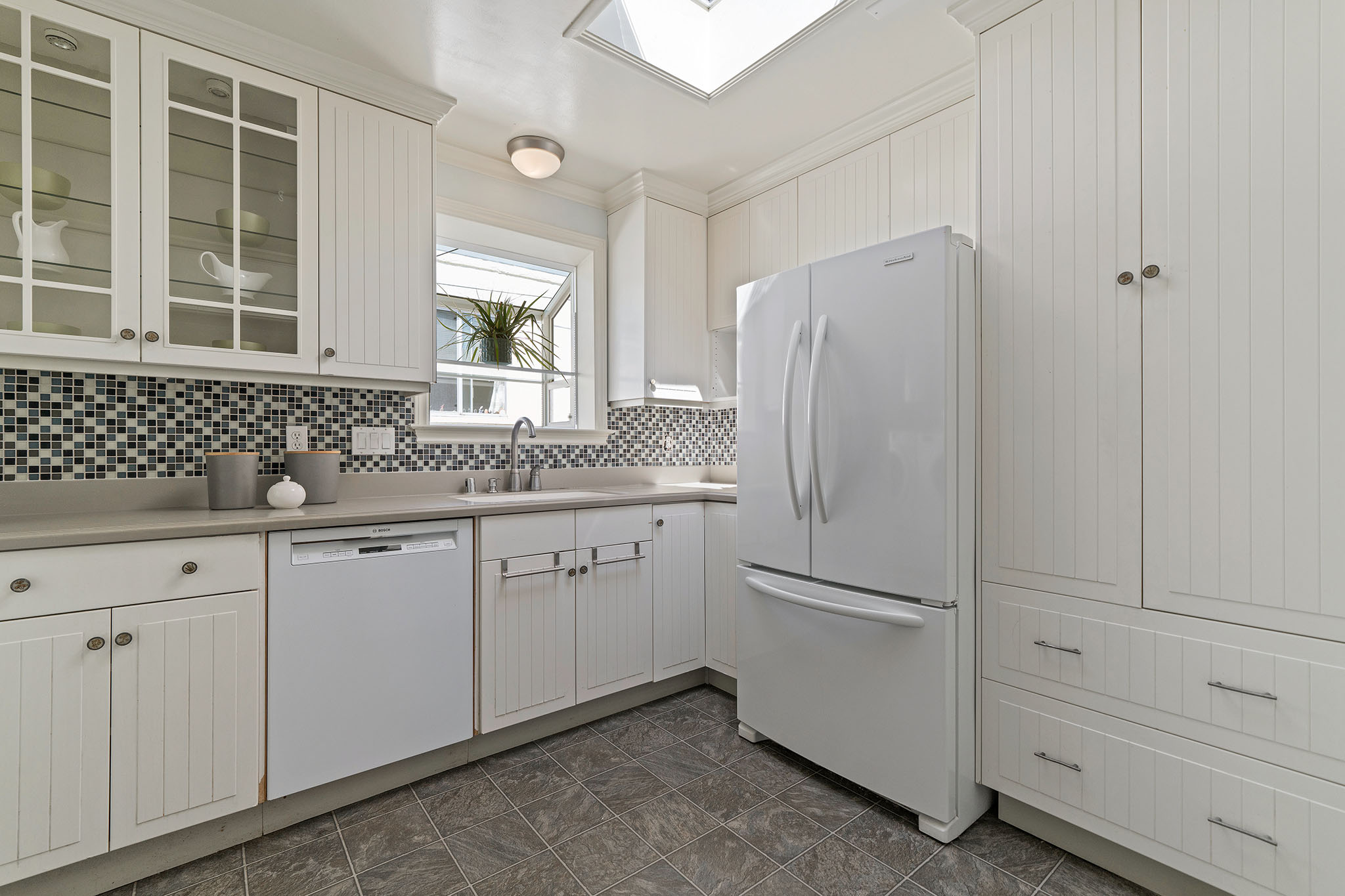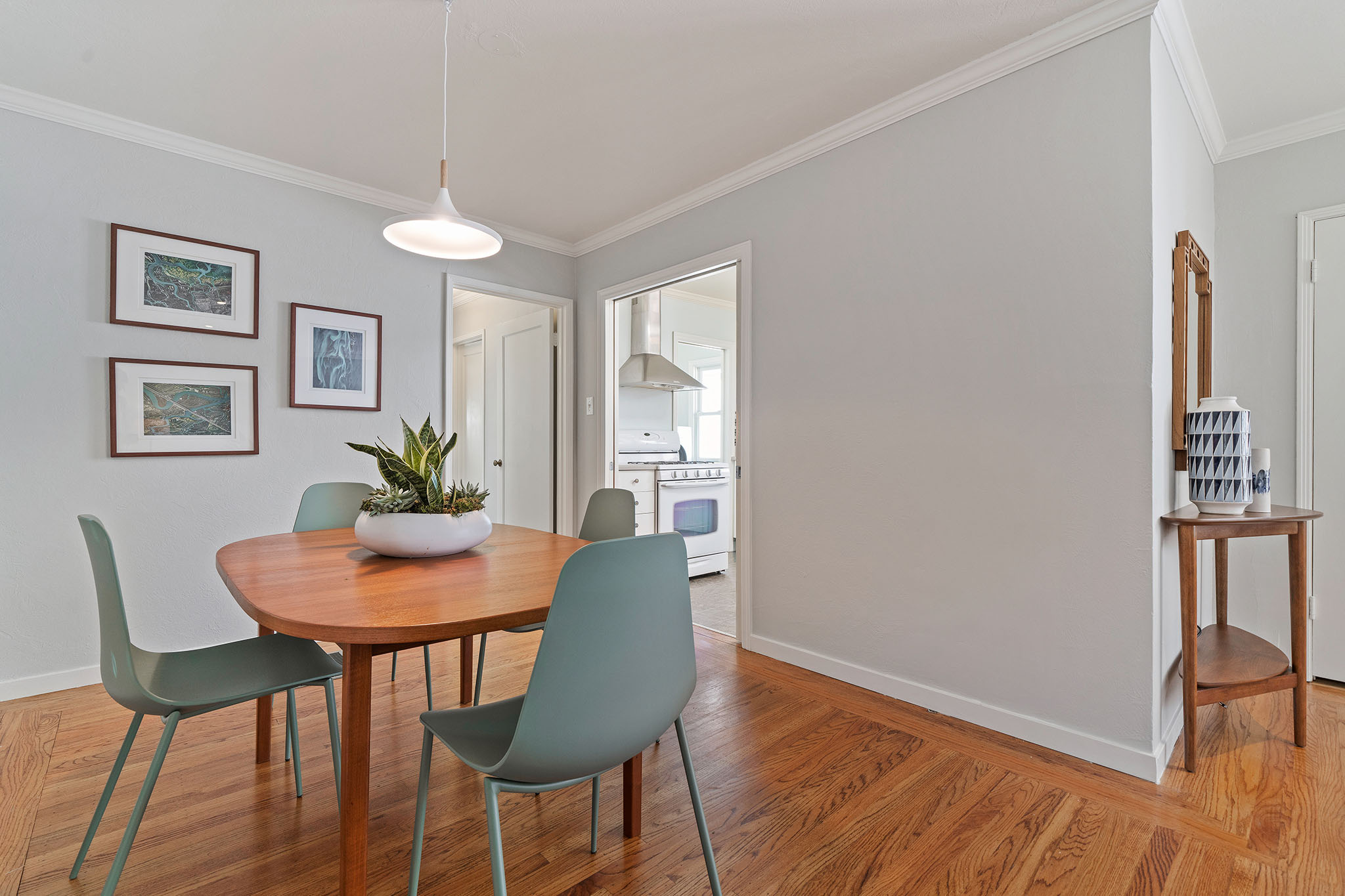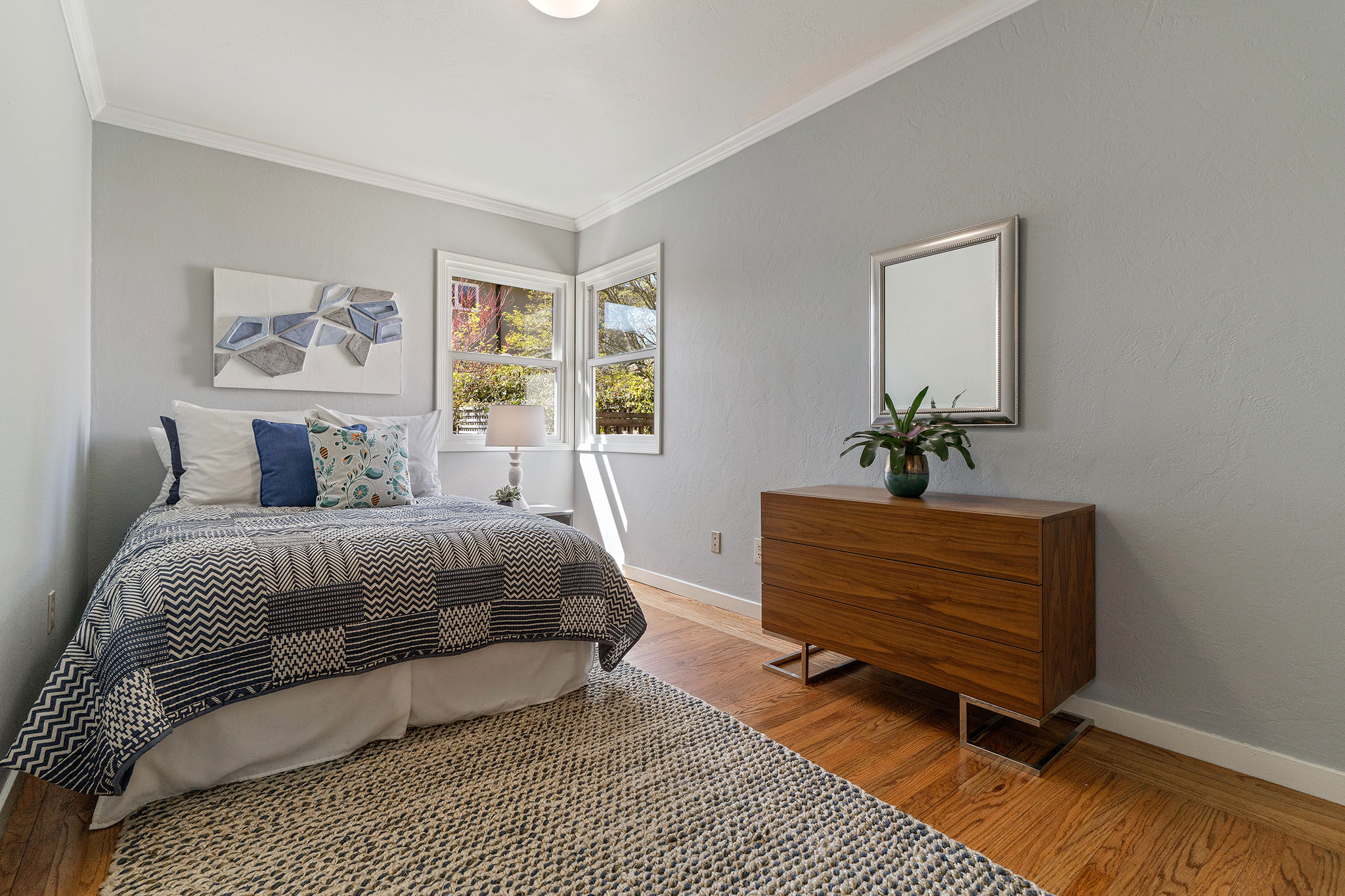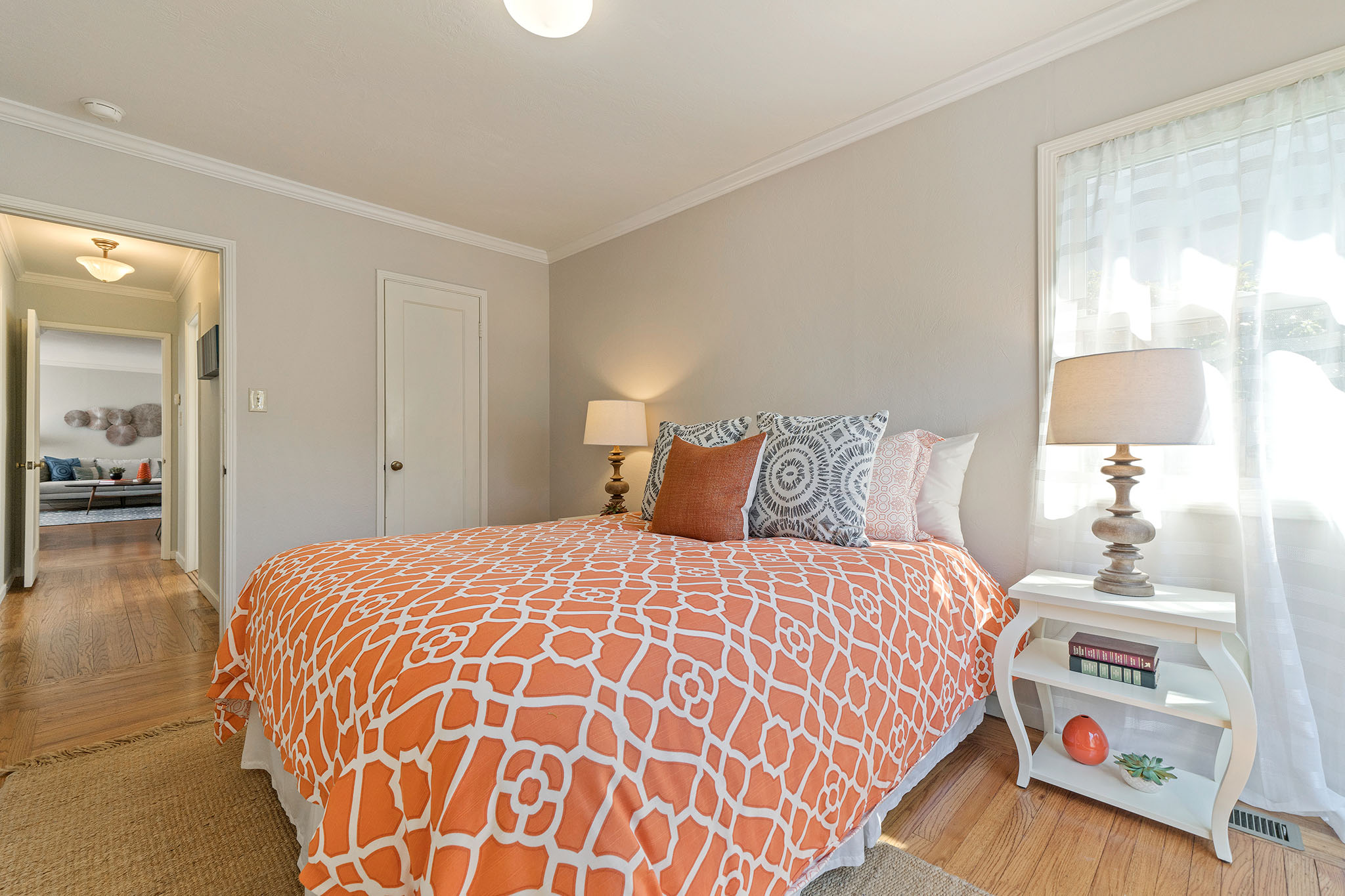 Peaceful Albany stunner nestled off the street. This two bedroom, one-plus bathroom home has hardwood floors and crown molding throughout, plus fresh paint on the interior. Open style living/dining rooms feature recessed and new lighting (2019). Efficient kitchen with handsome glass-tiled backsplash, gas stove, skylight, Bosch dishwasher and lovely garden-box window. Adjacent laundry room has full-size washer/dryer and an on-demand water heater. Sunny master with big closet and newer sliding glass door opens onto rear deck and charming backyard with new grass (2019) and colorful landscape. Complete with a view of Albany Hill. Second bedroom has new paint (2019), a nicely-sized closet and a west-facing window. Recently redone half bath with new sink, light fixtures and fresh paint (2019). Across the hall you’ll find a full bathroom, bright colors, newer tile and fixtures, plus a shower over tub. Other upgrades include a newer roof and newer windows.