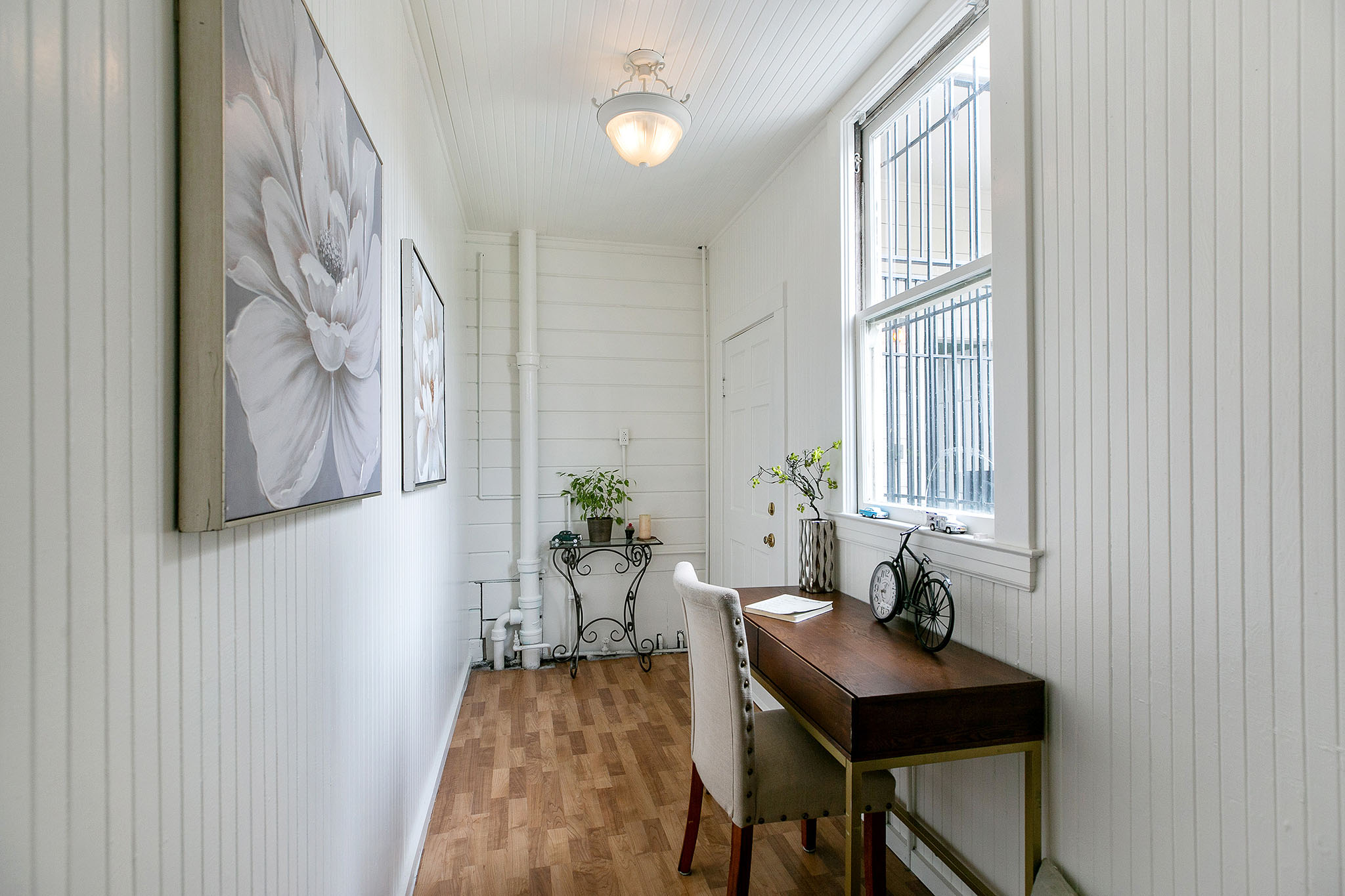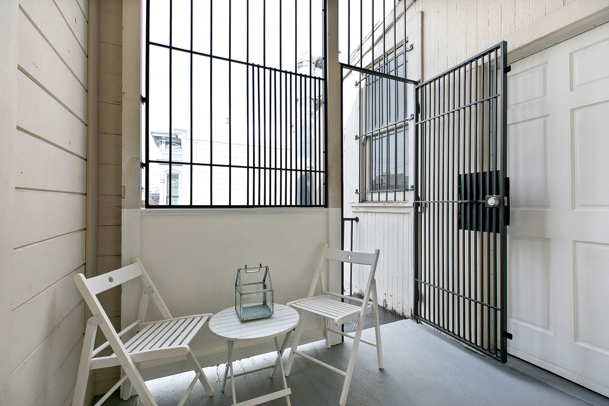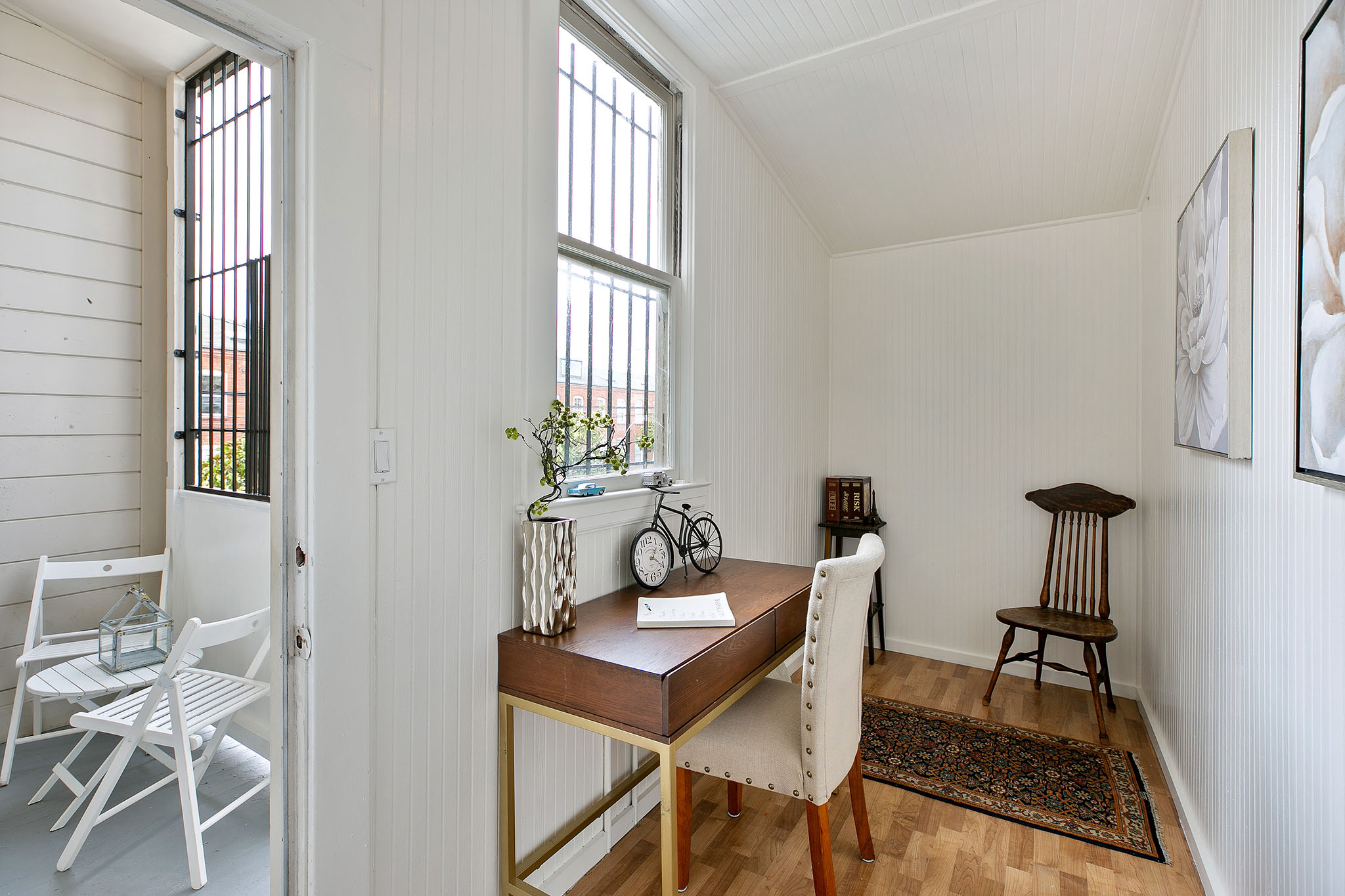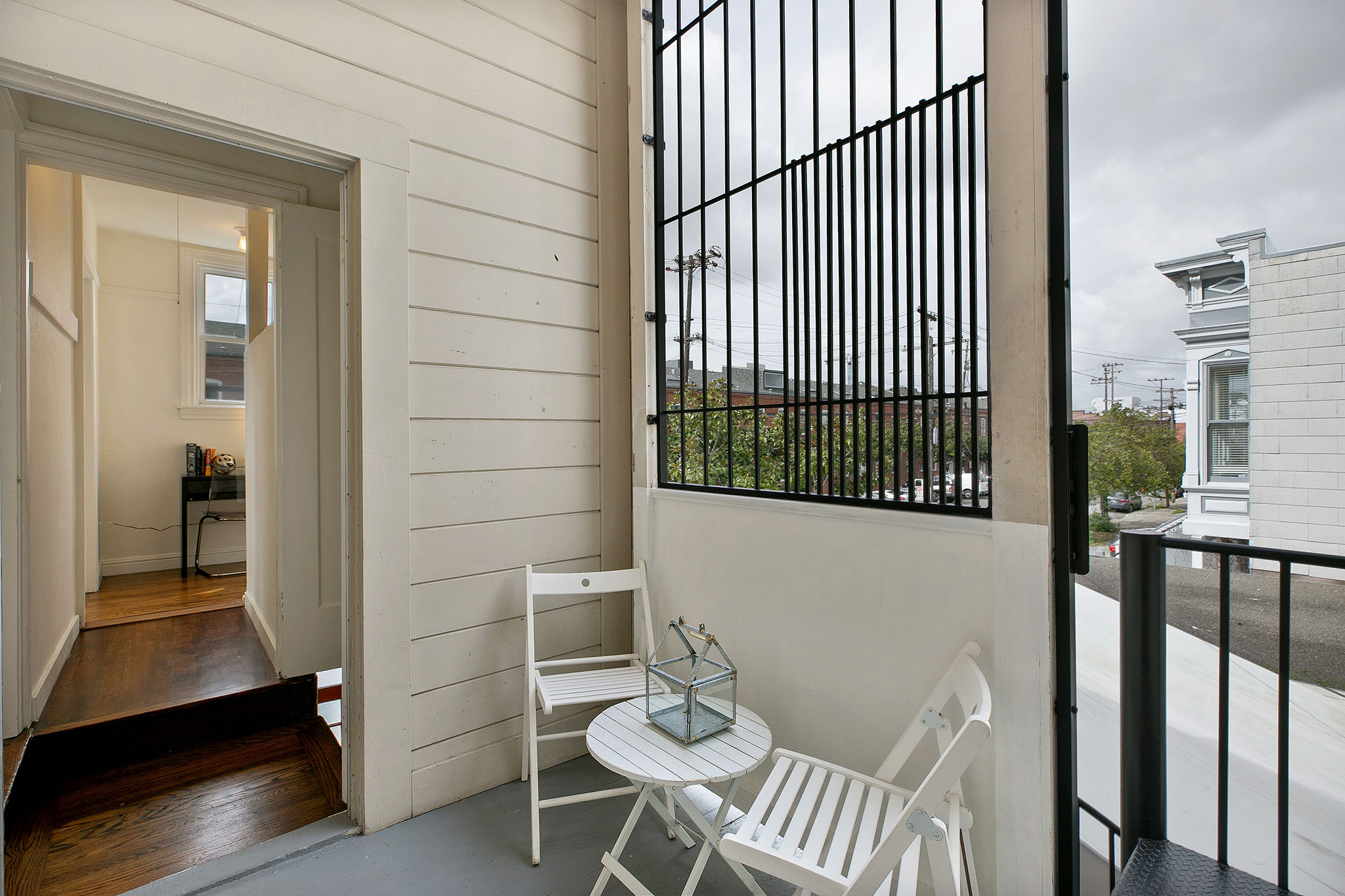 The second story comprises of two bright and airy one-bedroom, one-bath apartments - each with a private front entrance and interior stairway. Polished wood floors, period details, and elegant bay windows make these units warm and inviting. At the back is a shared porch overlooking the neighborhood, a bar office (formerly a laundry room), and a spiral stairway leading to the patio.