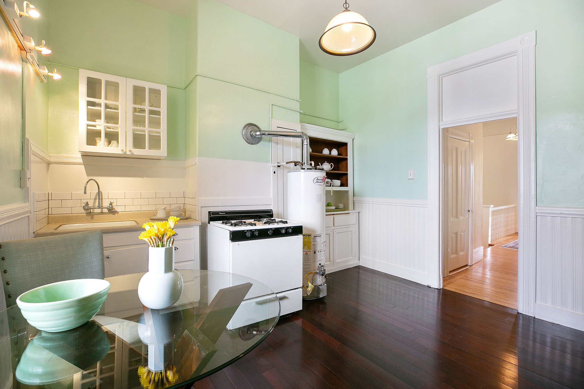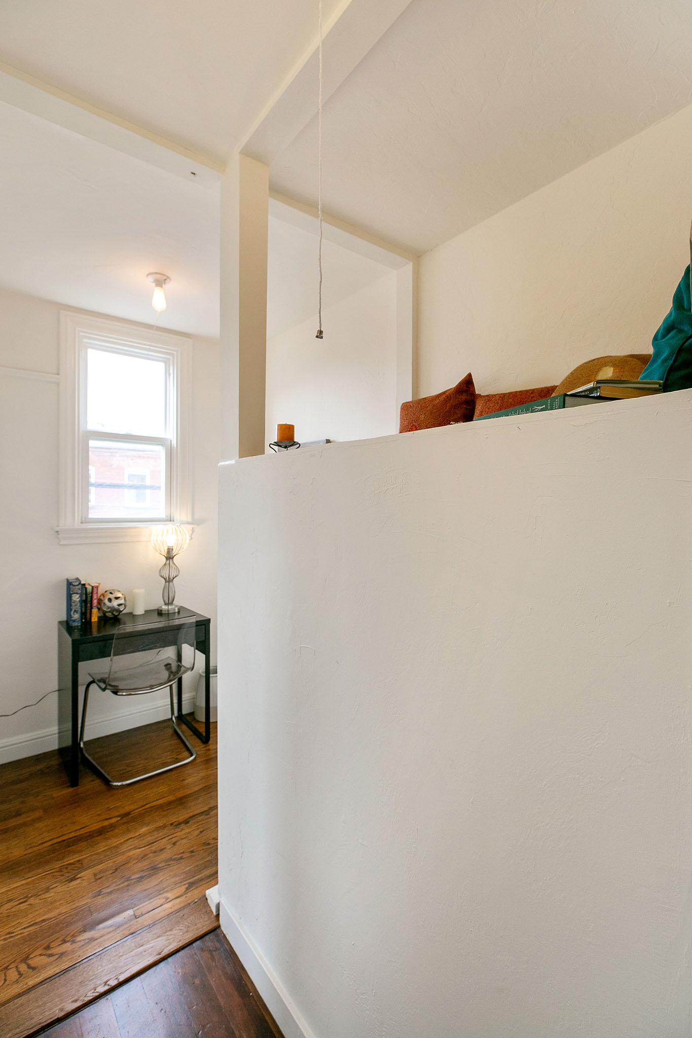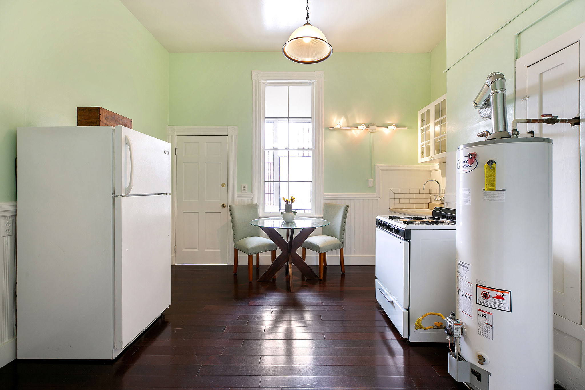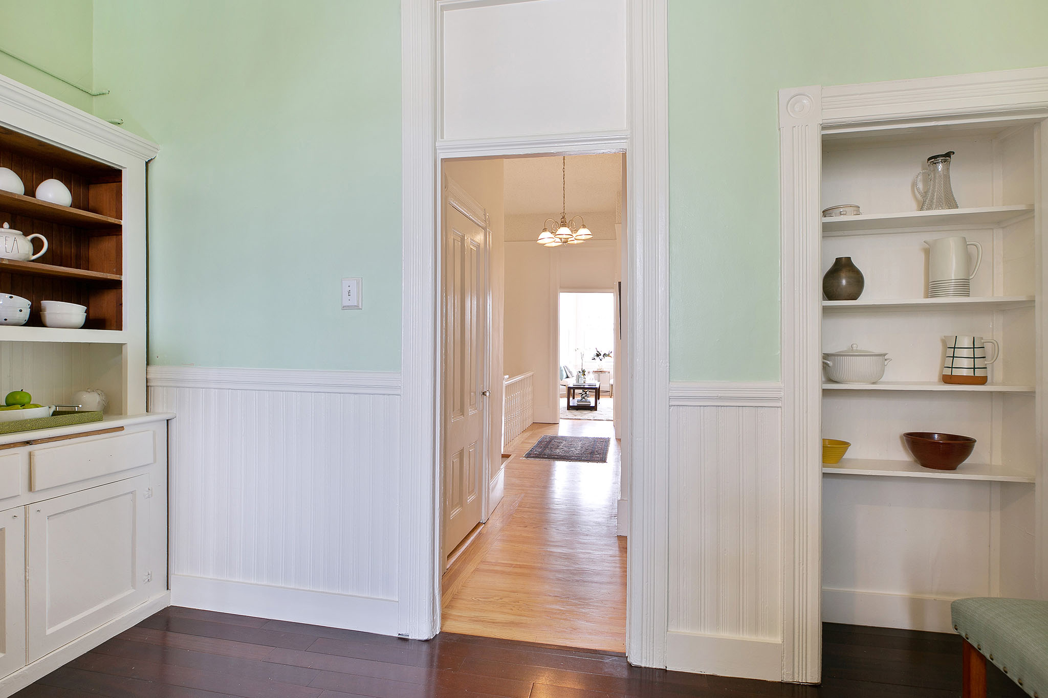 The second story comprises of two bright and airy one-bedroom, one-bath apartments - each with a private front entrance and interior stairway. Polished wood floors, period details, and elegant bay windows make these units warm and inviting. At the back is a shared porch overlooking the neighborhood, a bar office (formerly a laundry room), and a spiral stairway leading to the patio.