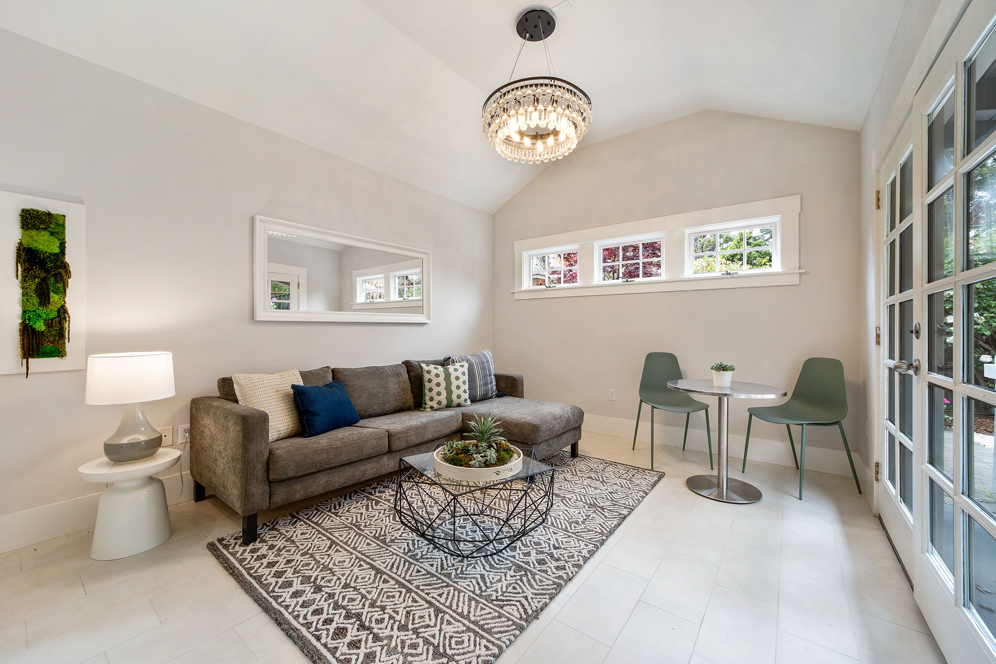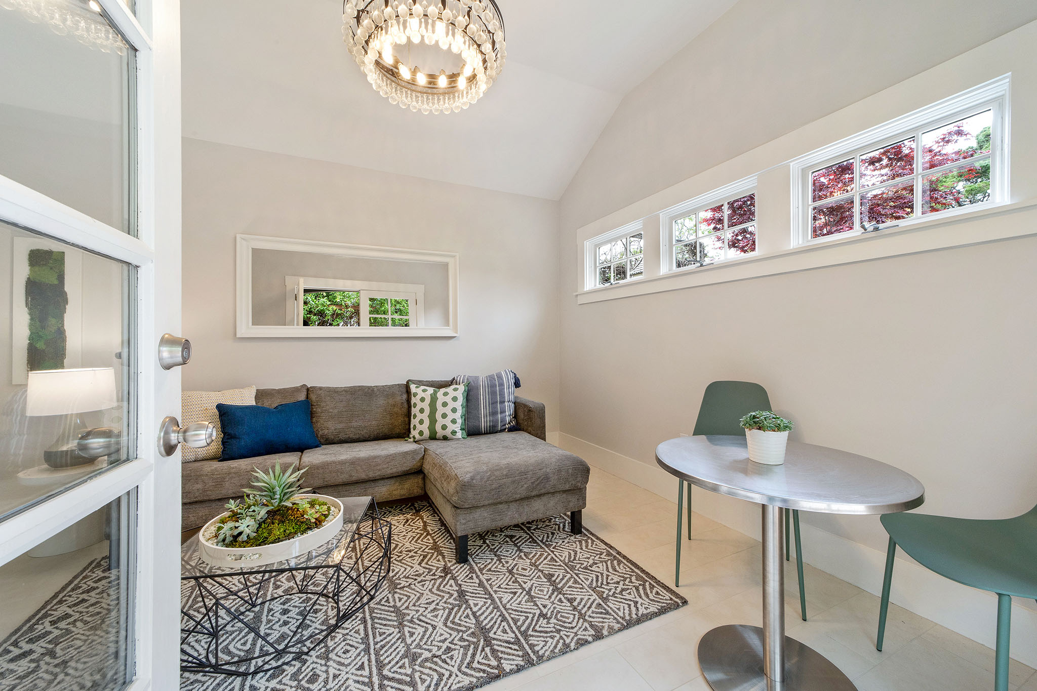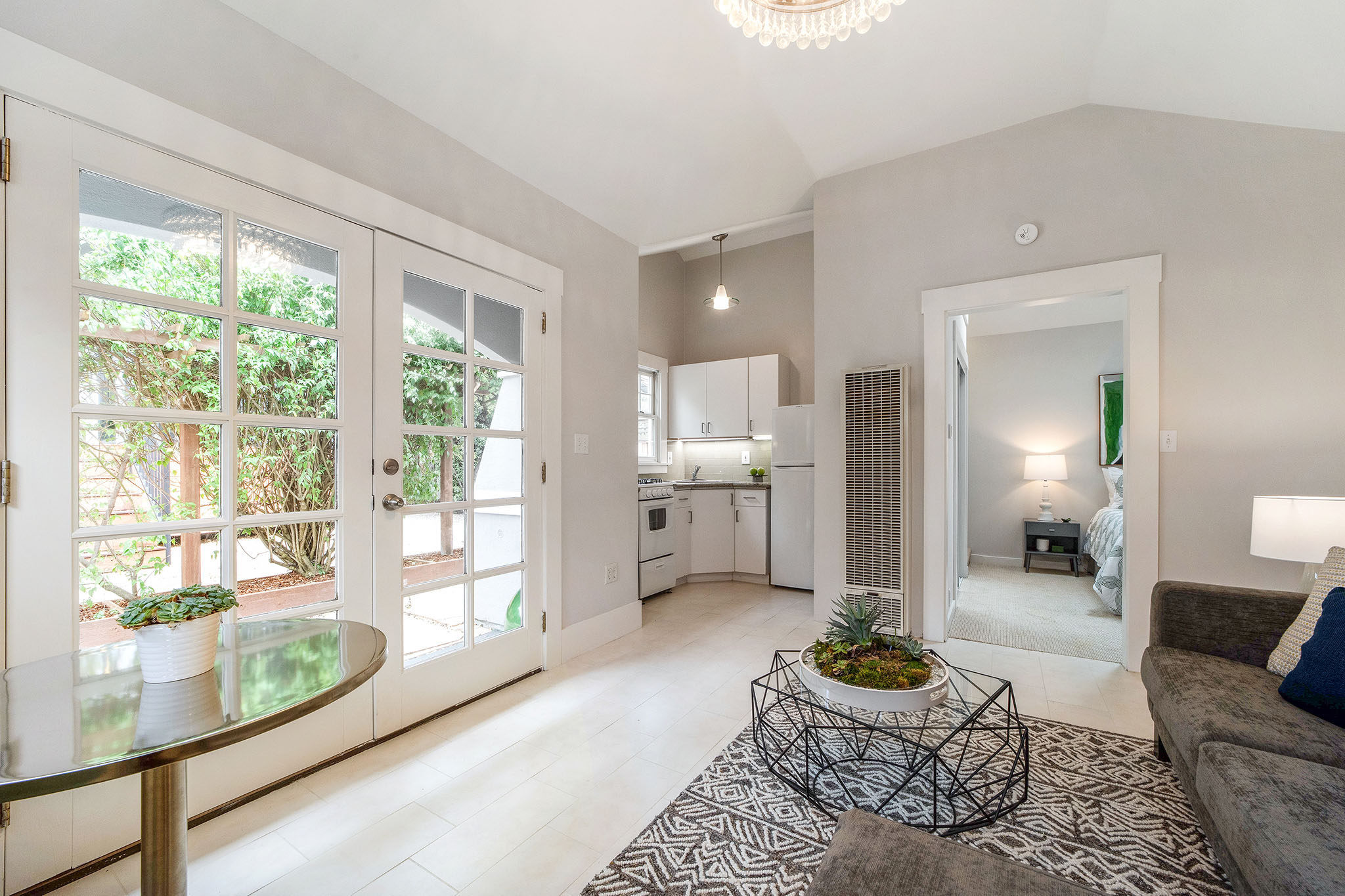 To the rear is an adorable (and legal) cottage built with permits in 1994. One bedroom, one bathroom and a living area with french doors to its own garden patio.; So many ways to settle in!
