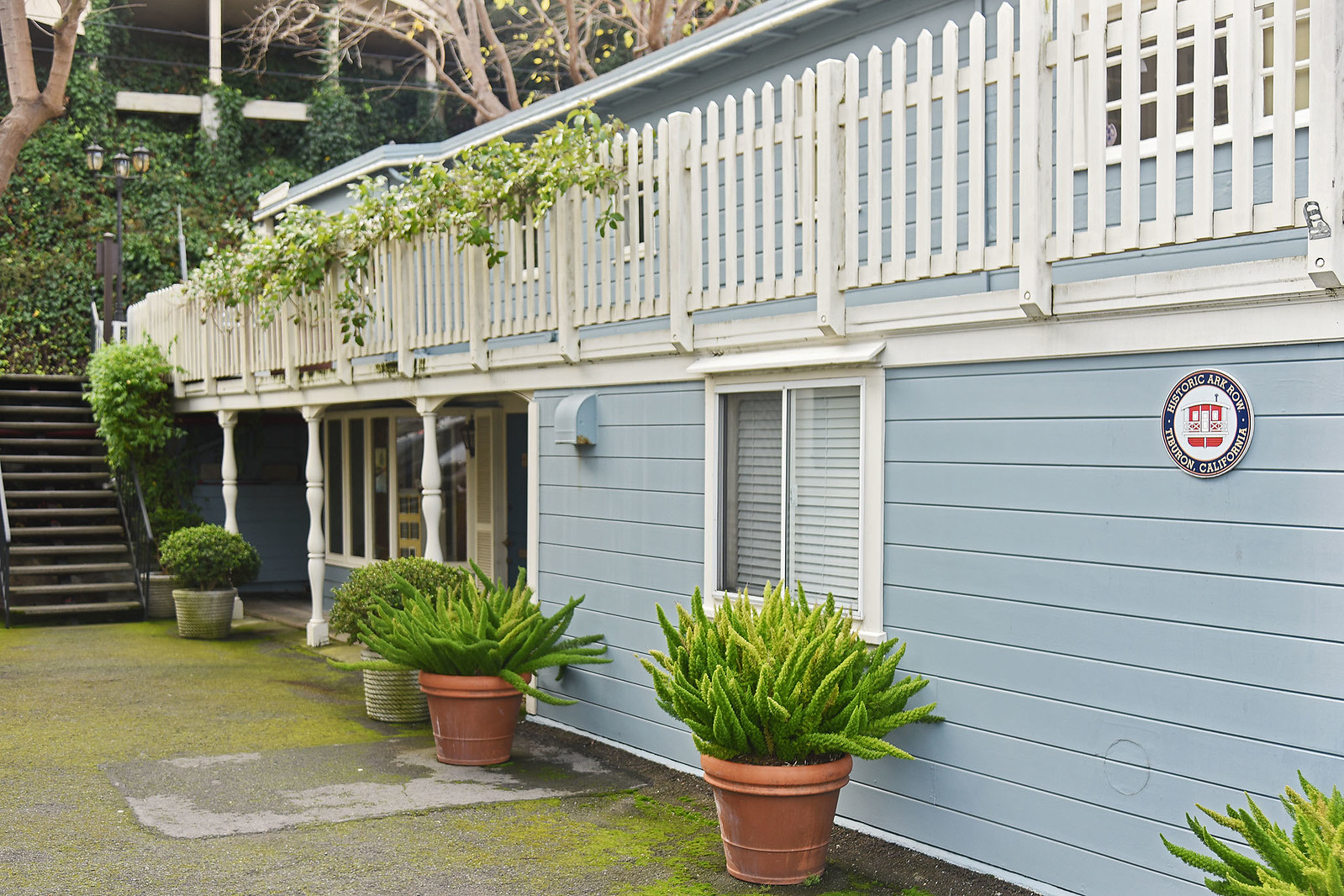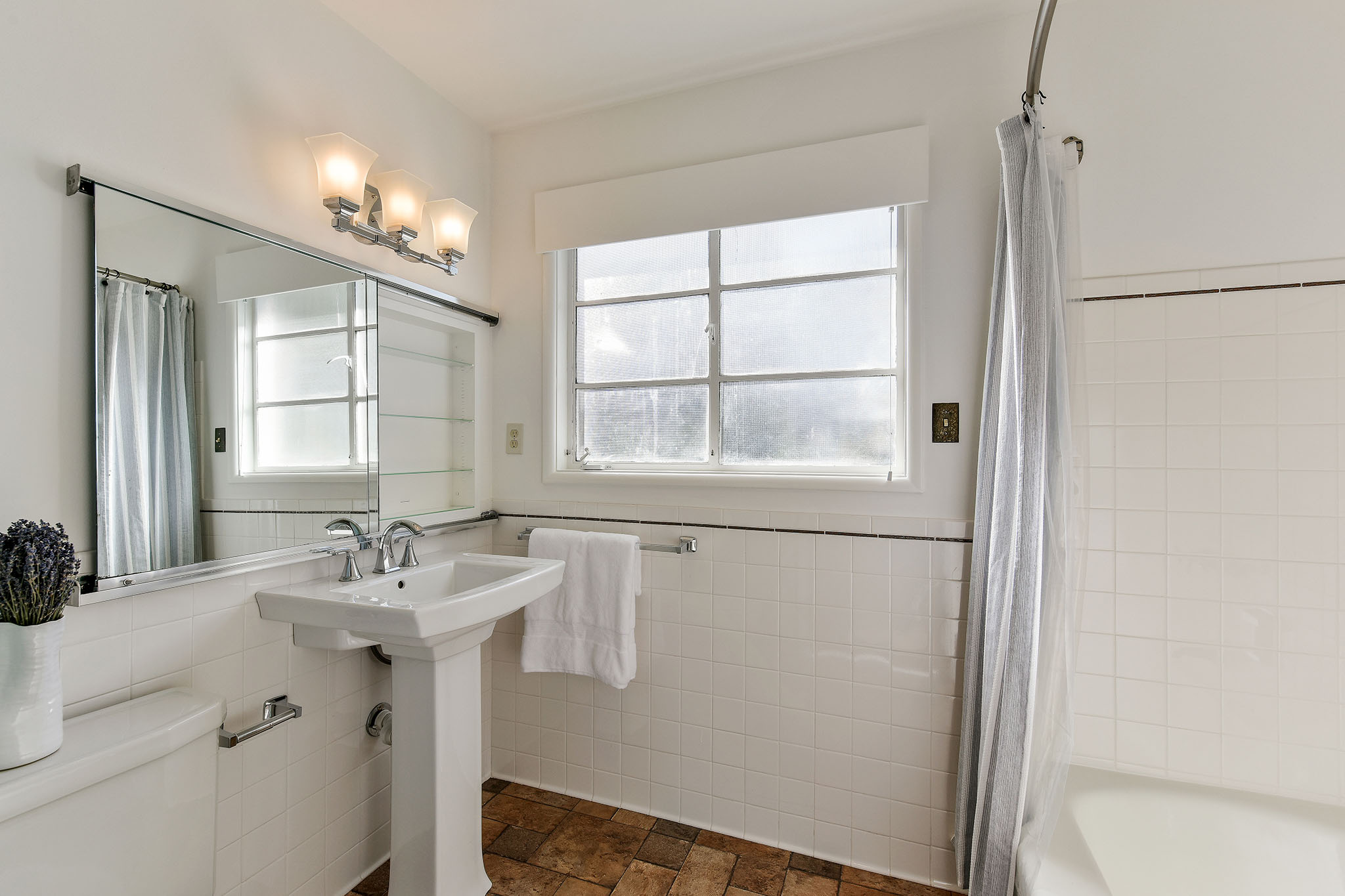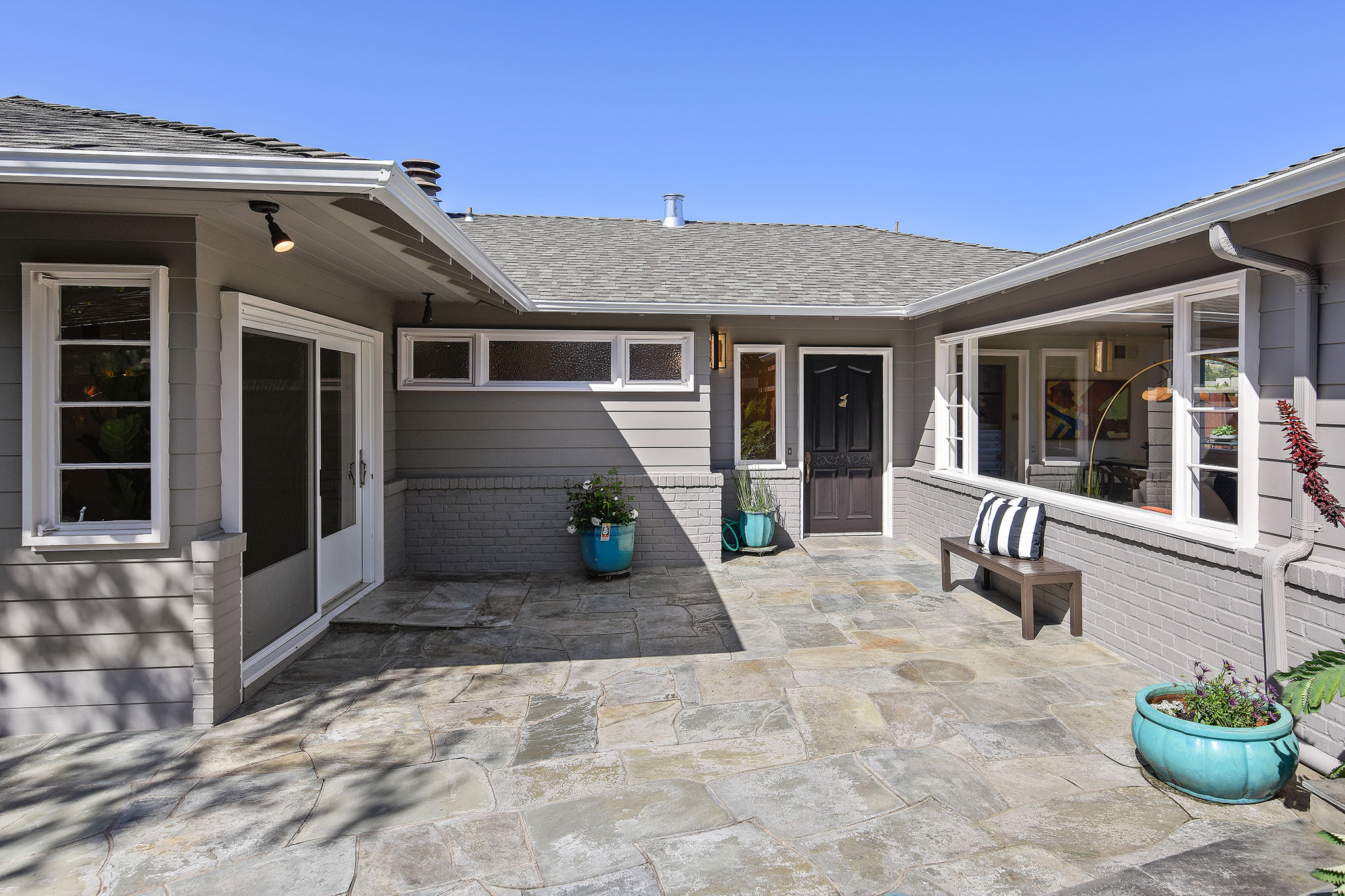 In the private wing is a generous master bedroom with a fireplace, cherry wide plank floors, ;and a tiled master bathroom with access to the inner courtyard. There are two additional good sized bedrooms plus a third tiled bathroom. The hall bathroom has laundry facilities and access to the yard.