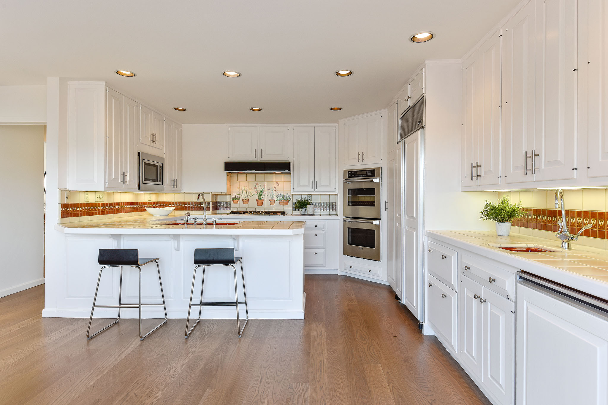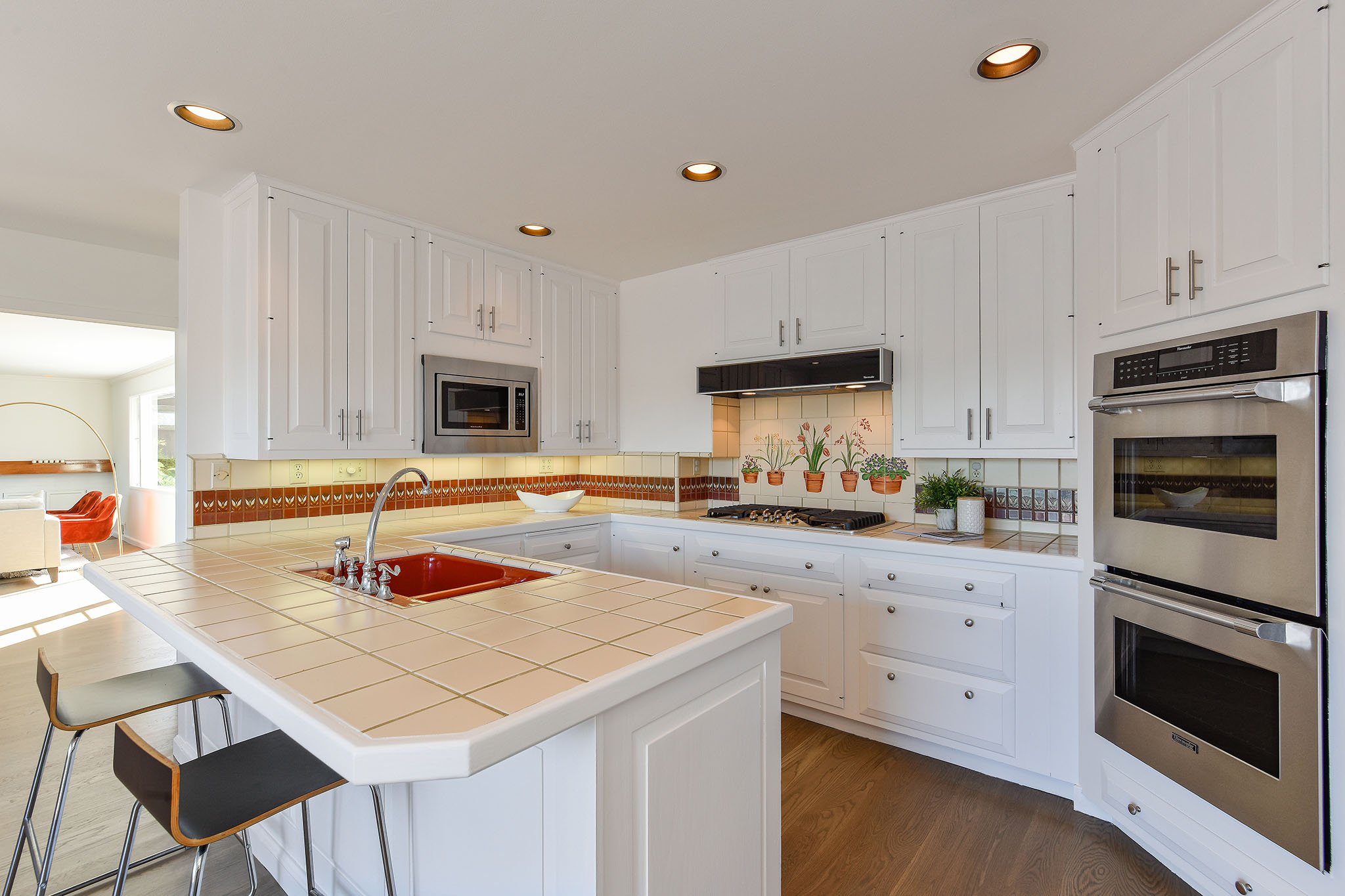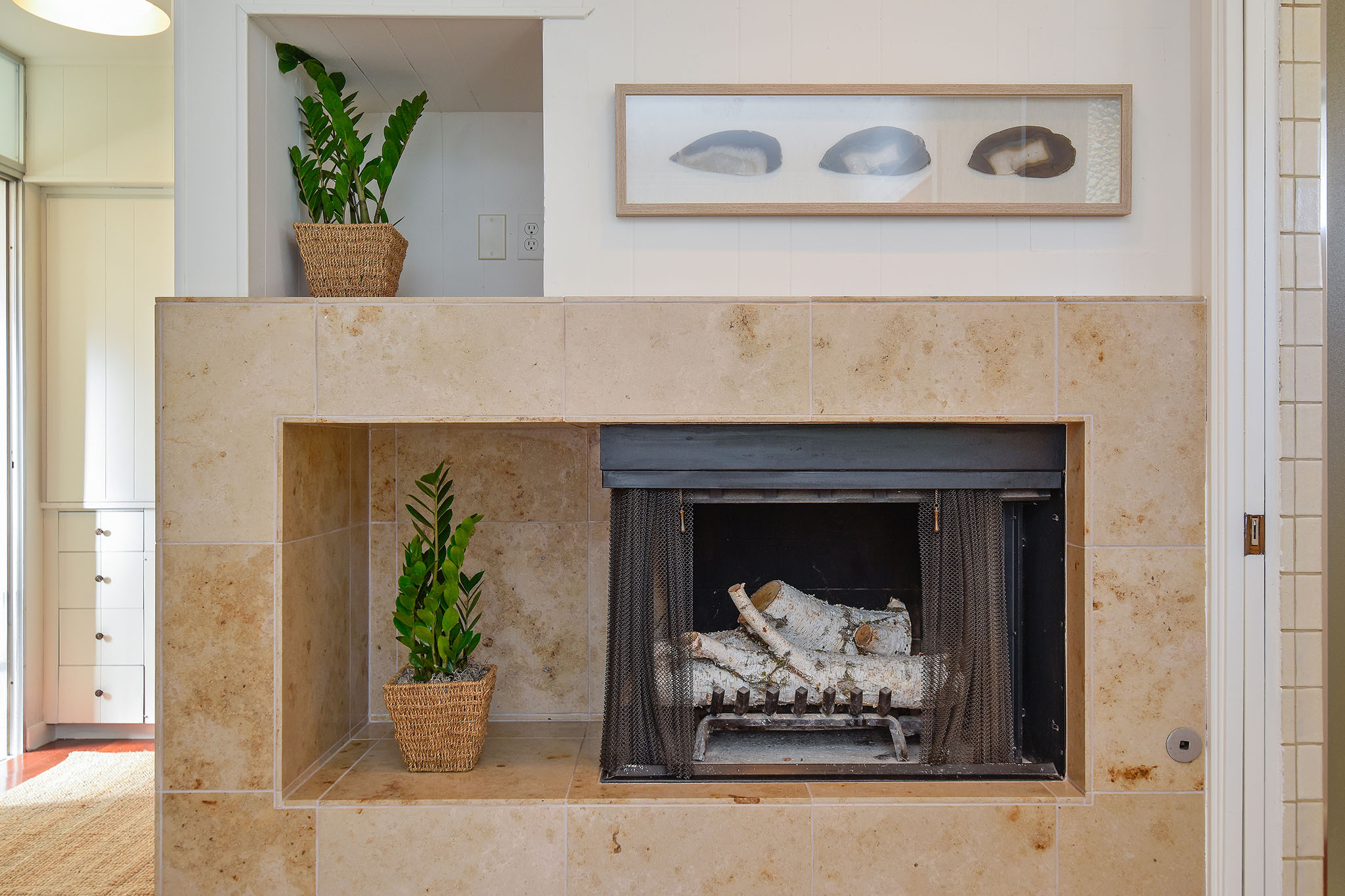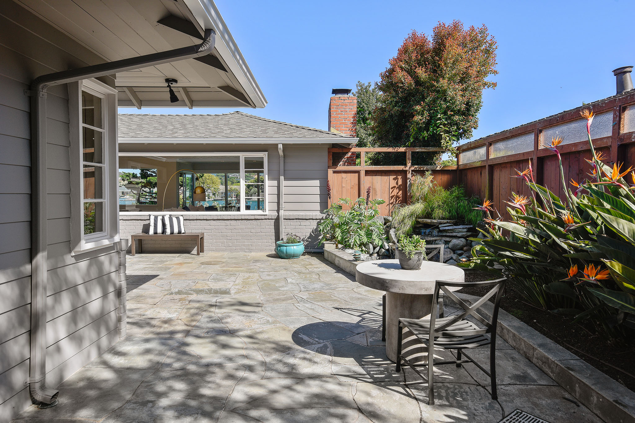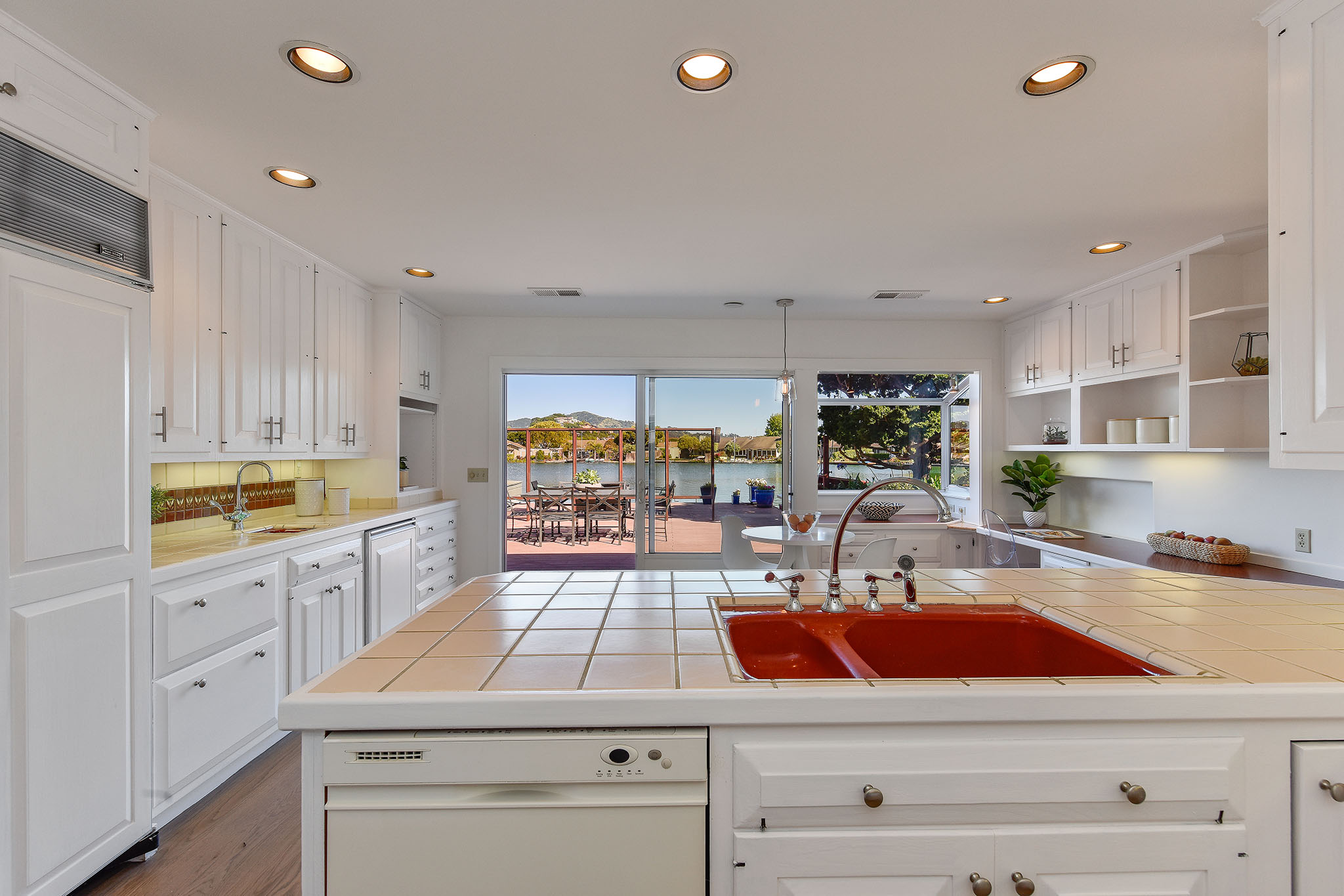 You enter the home through a picket fence into a private inner courtyard with a fountain. The open floor plan living and dining room is filled with light, has a wood burning fireplace and sliding doors to the garden with views of the lagoon. The large remodeled kitchen with a Sub-Zero refrigerator and wine cooler, stainless appliances, tiled counters, built-in desk, and a casual eating area with direct access to the garden, deck, and dock. There are wide plank oak floors throughout these public rooms. ;