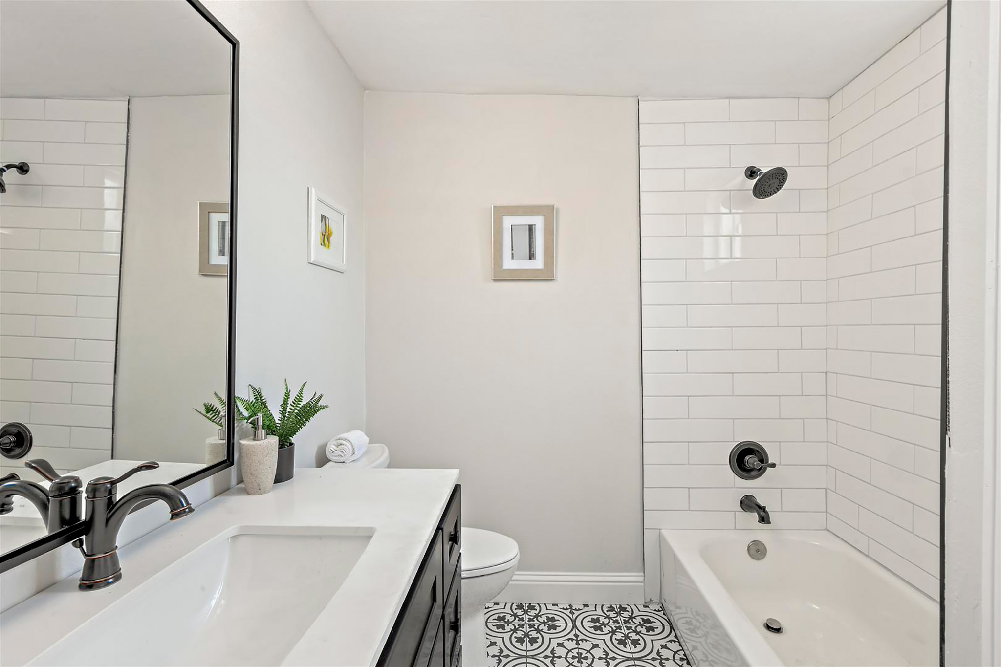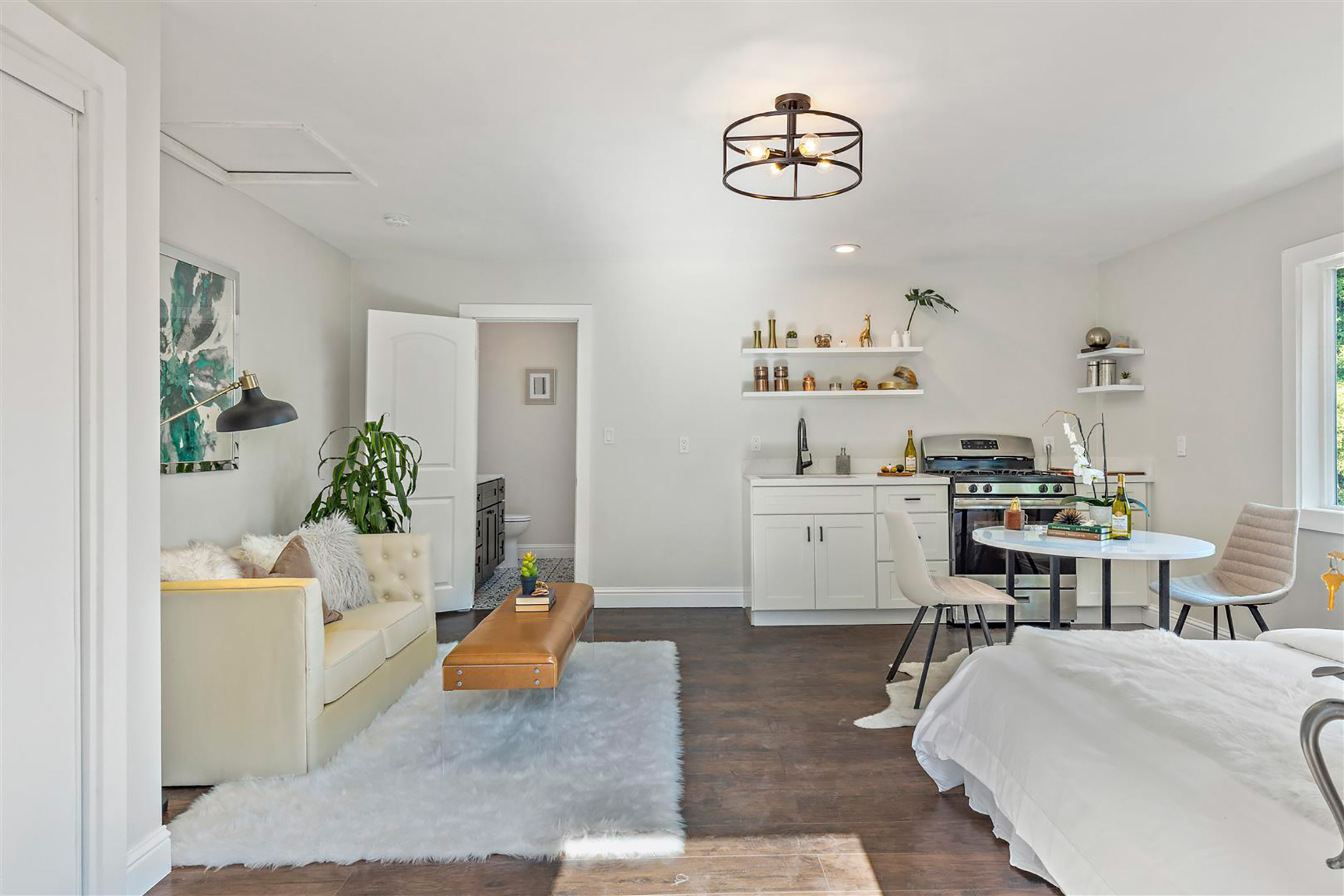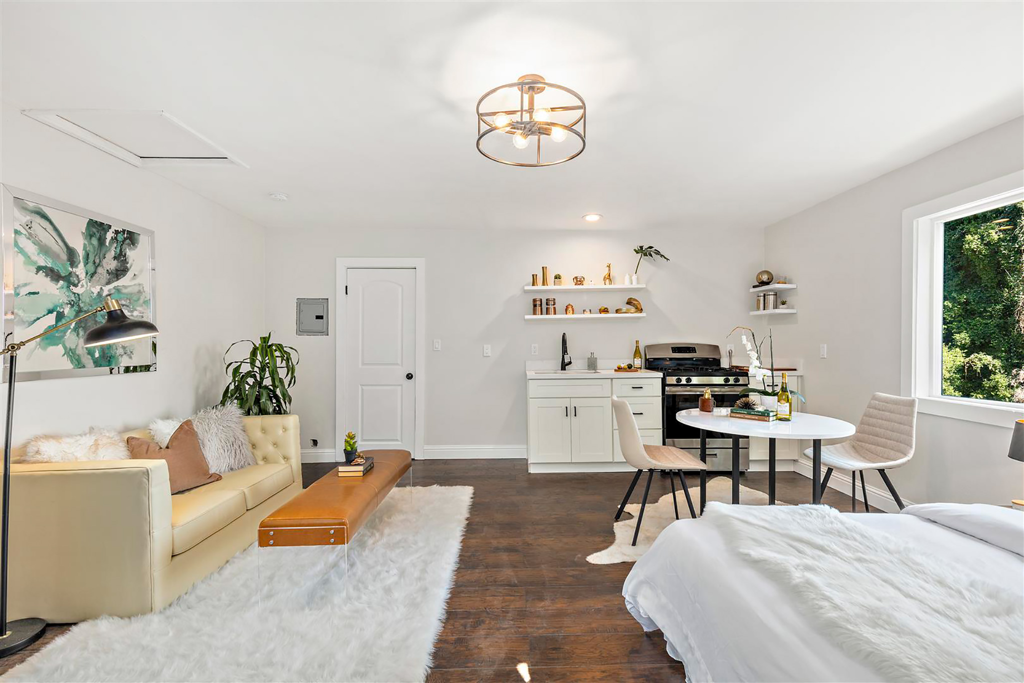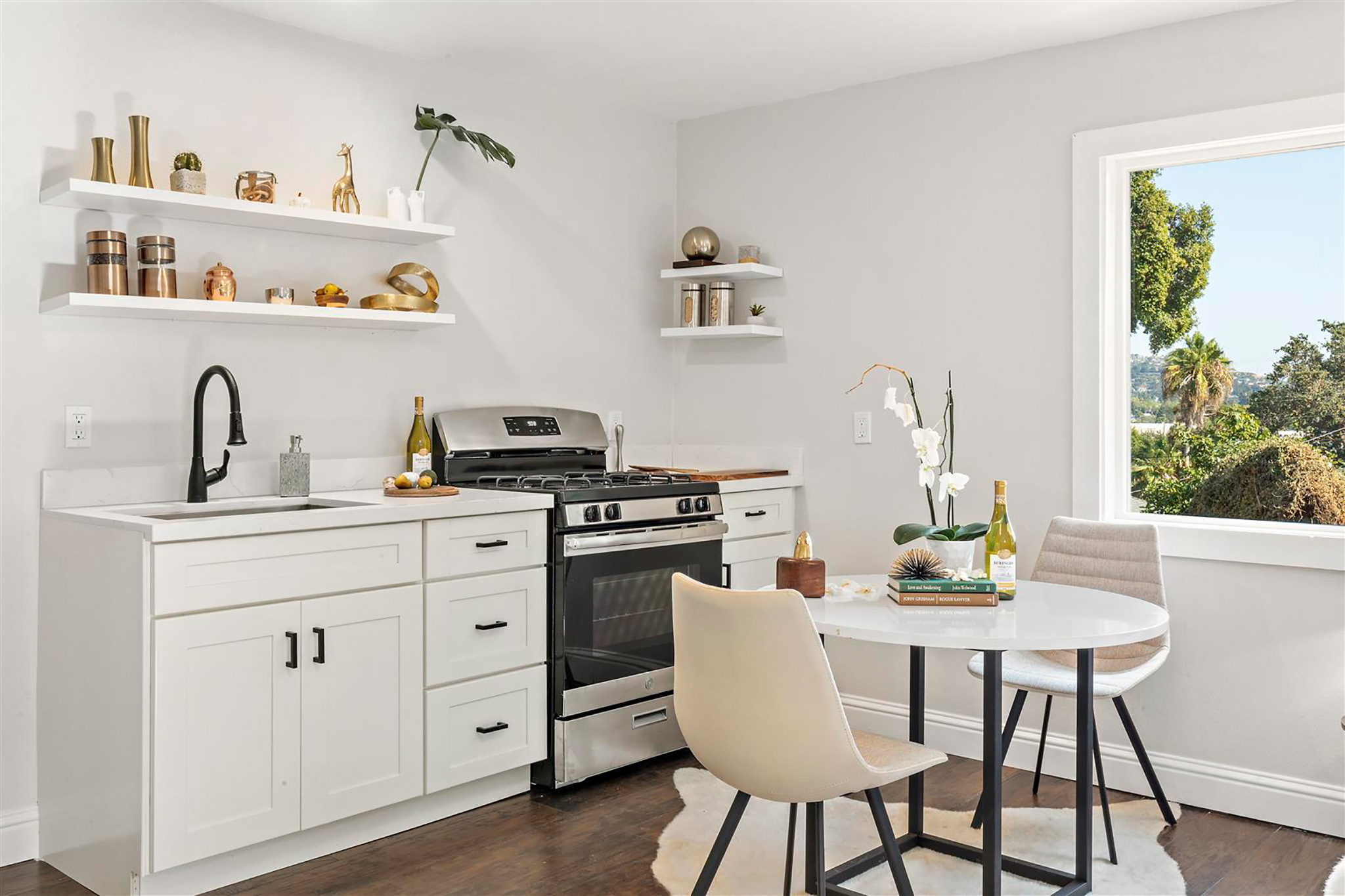 The in-law unit has plenty of space and provides calming views of the backyard. In-law has its own private patio area. The new kitchen (2019) has a gas stove and contemporary shelving to store your cooking supplies. In addition, there is a new gas wall heater, tankless water heater and new bathroom with a shower over the tub (2019).