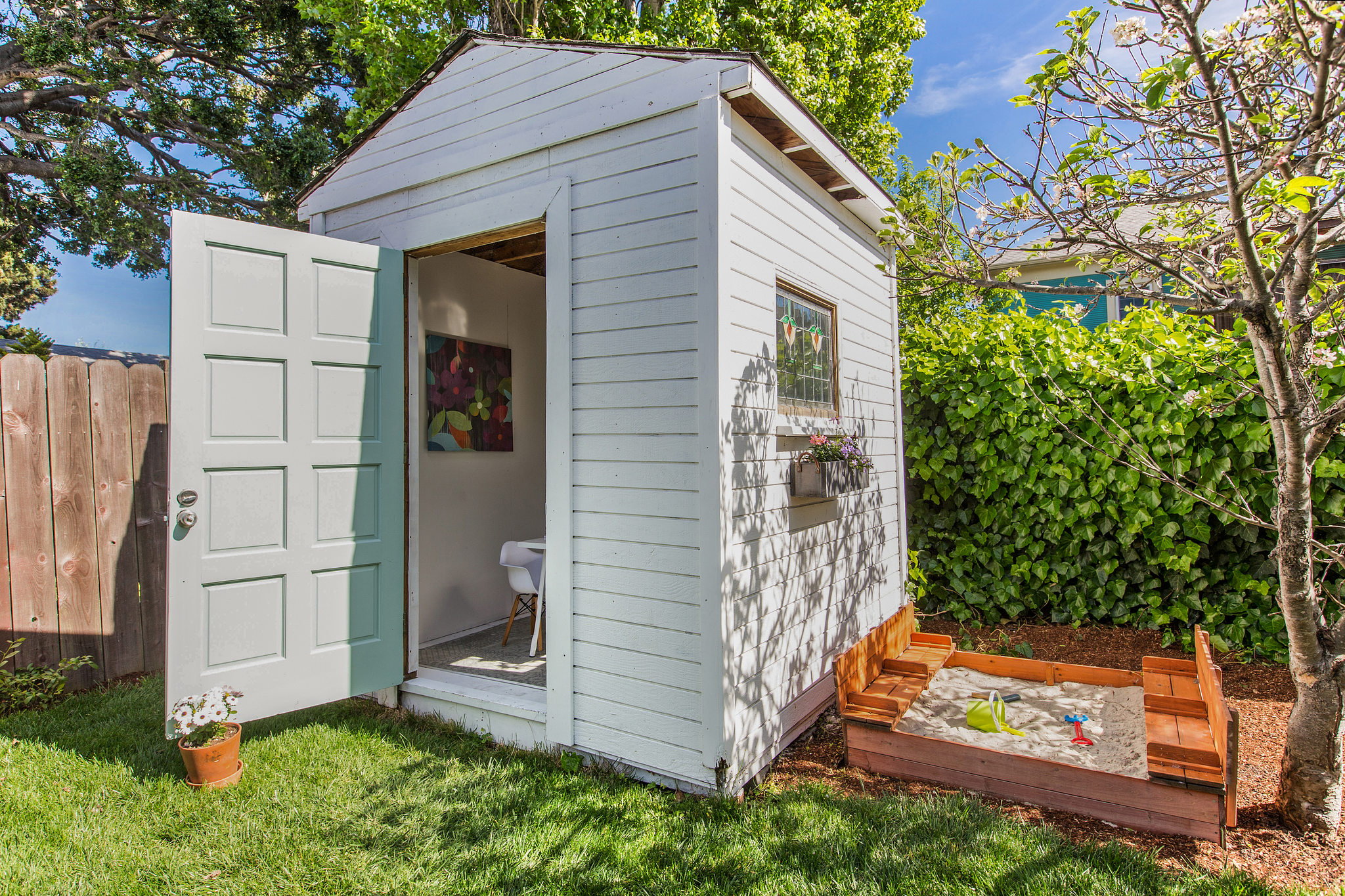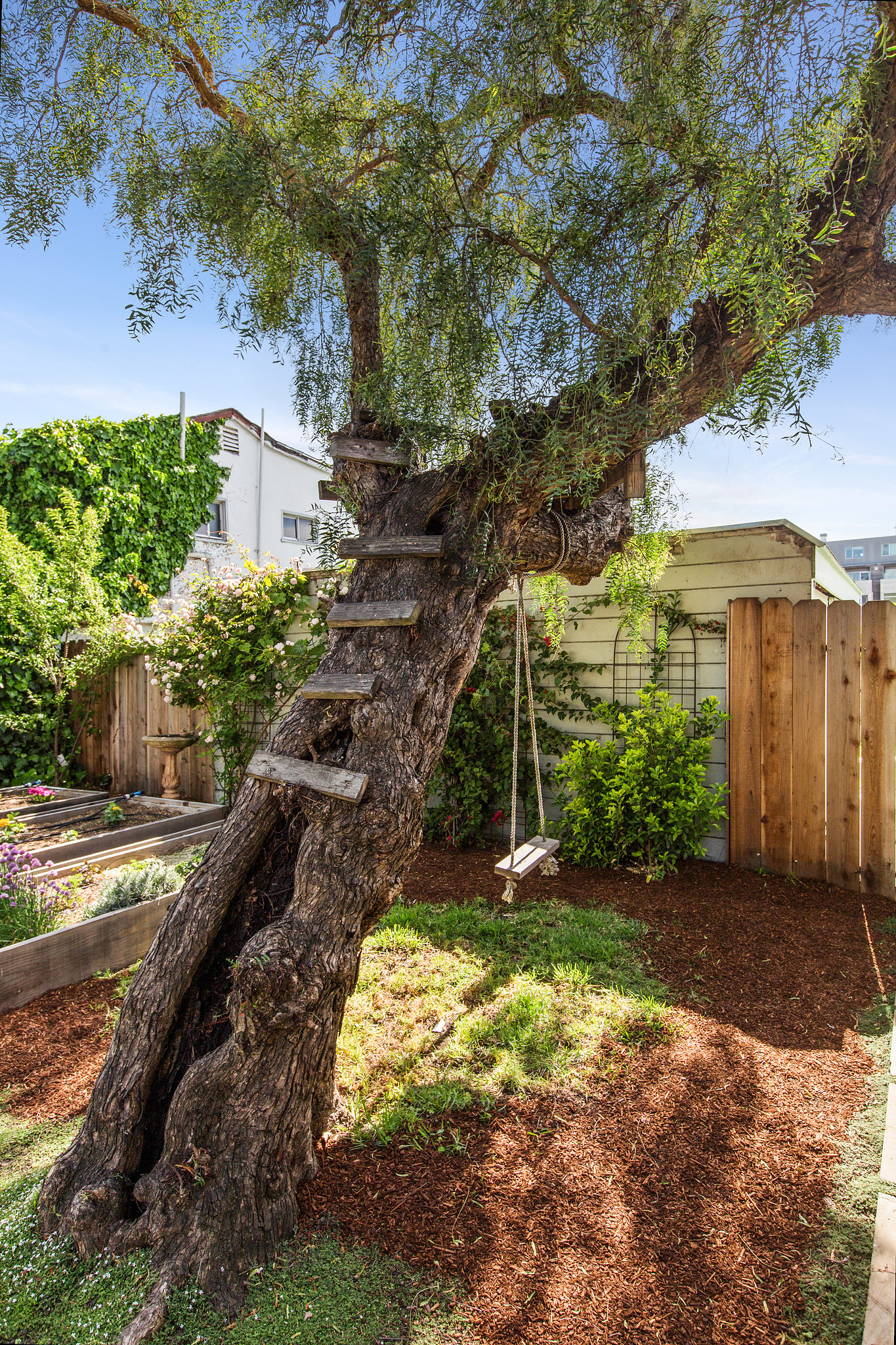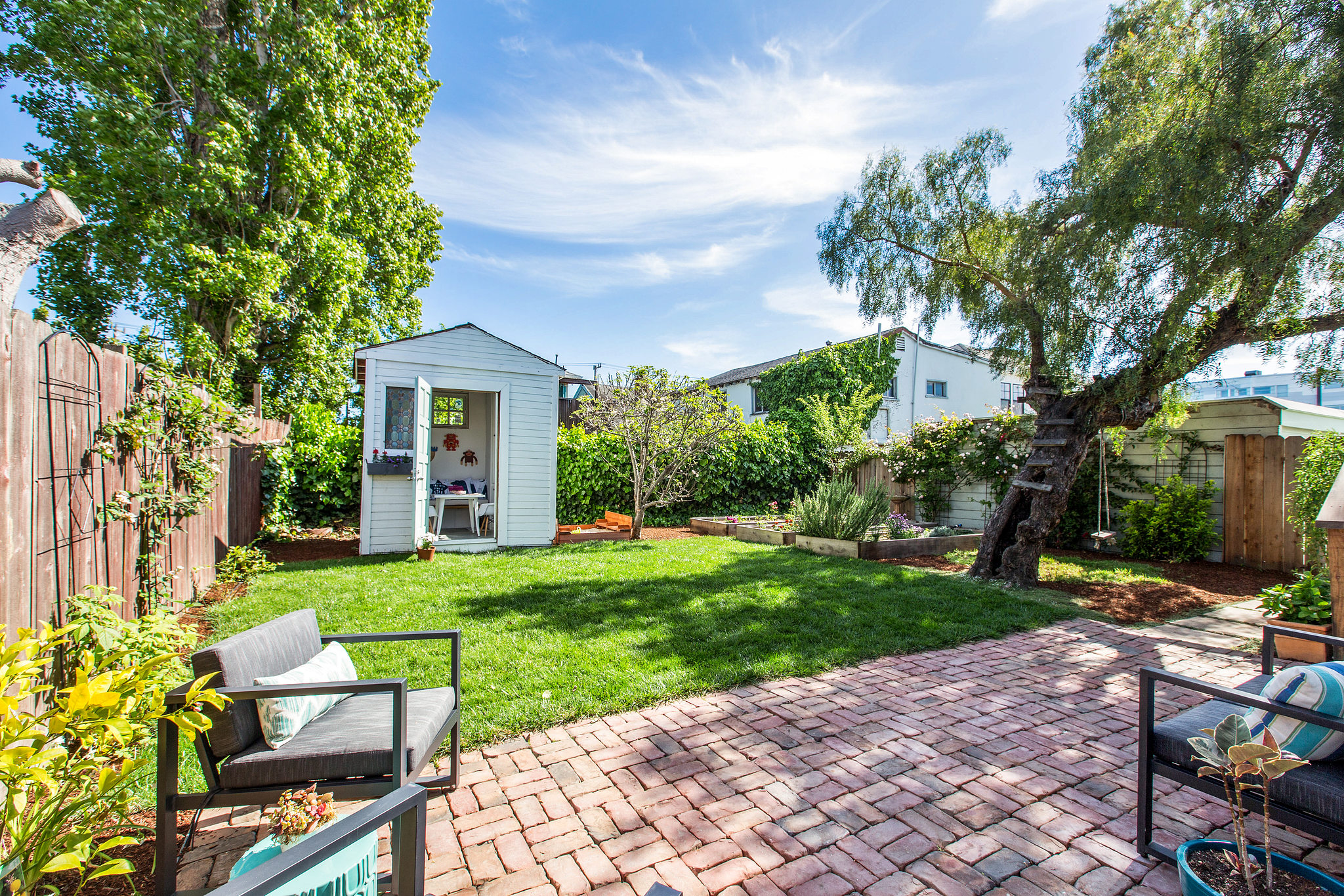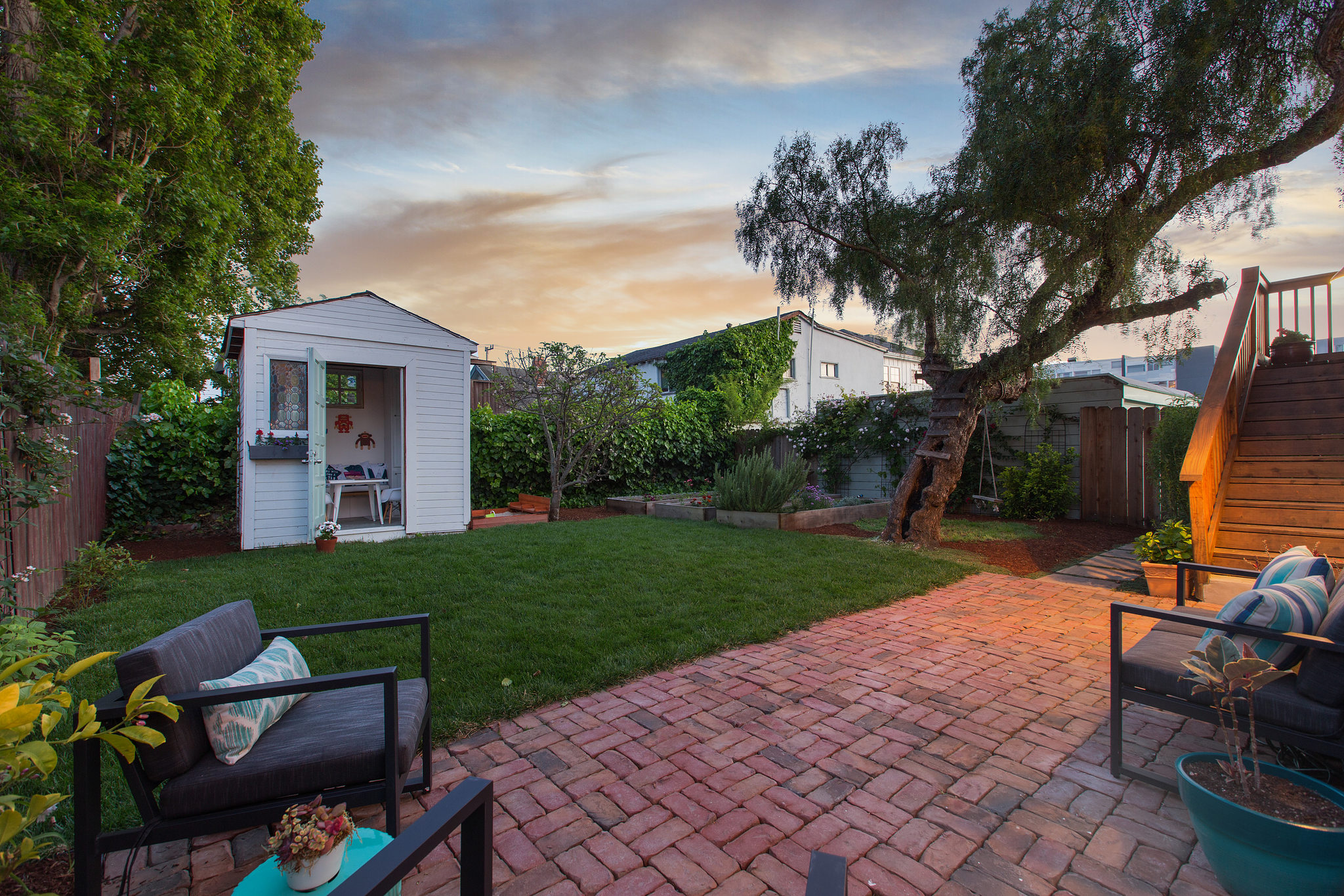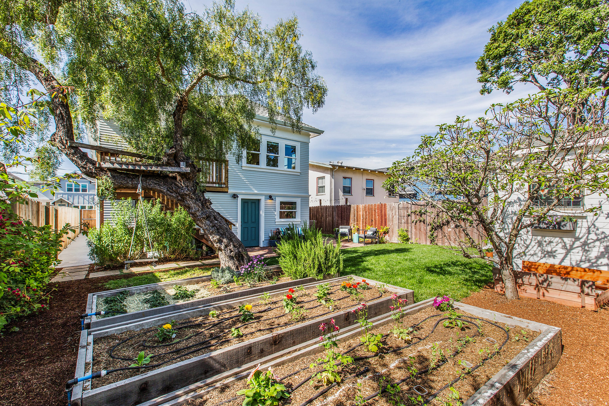 Urban garden includes: 2 lemon trees, 2 plum trees, 1 apple tree, 1 blackberry, 1 raspberry, 2 blueberries, 3 raised vegetable beds