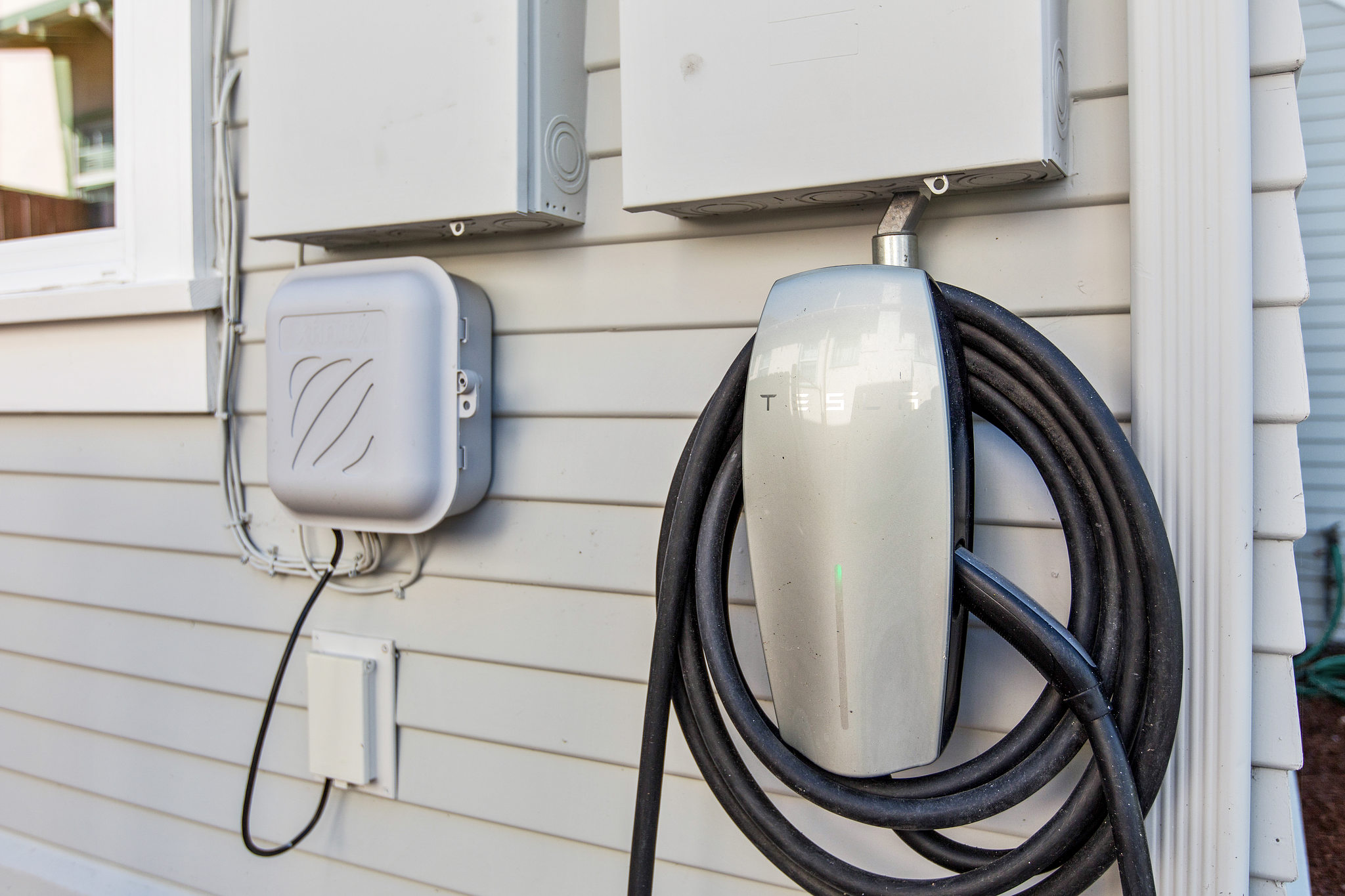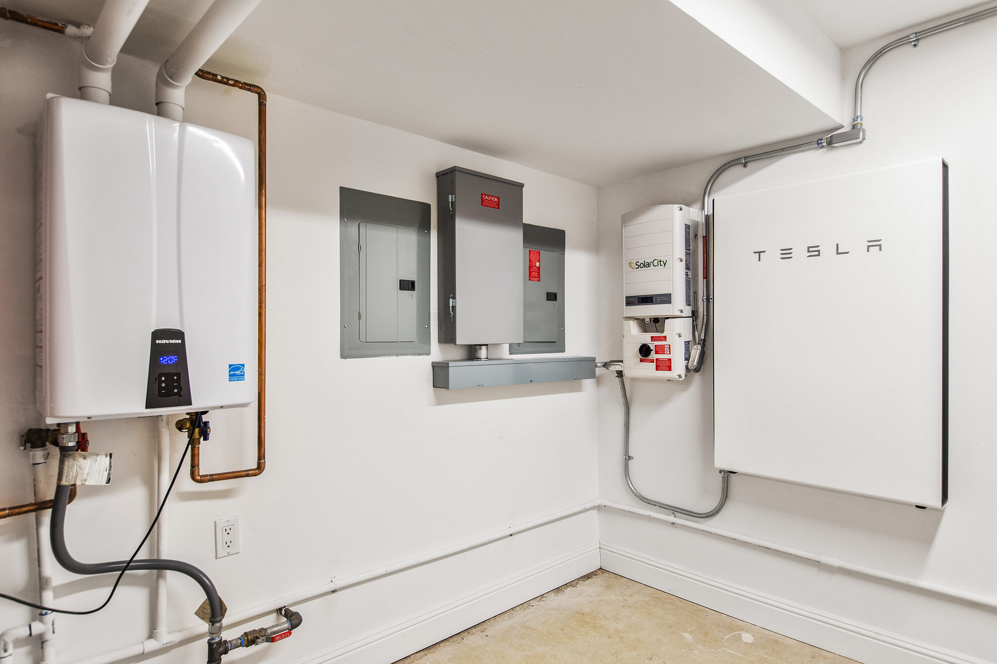 Tesla Powerwall battery (13.5 kWh) powers the upstairs at night and during power outages (including PG&E fire danger shutoffs). Options to optimize battery use for sustainability or low cost power. 10 year warranty.