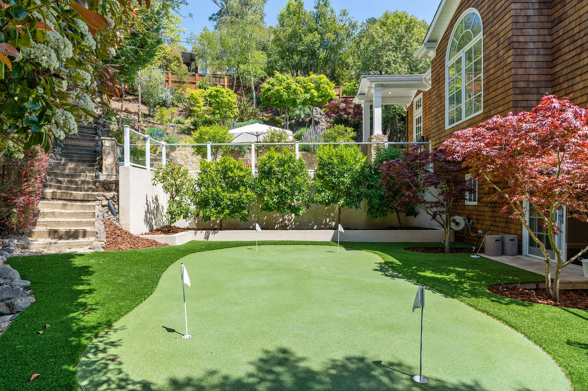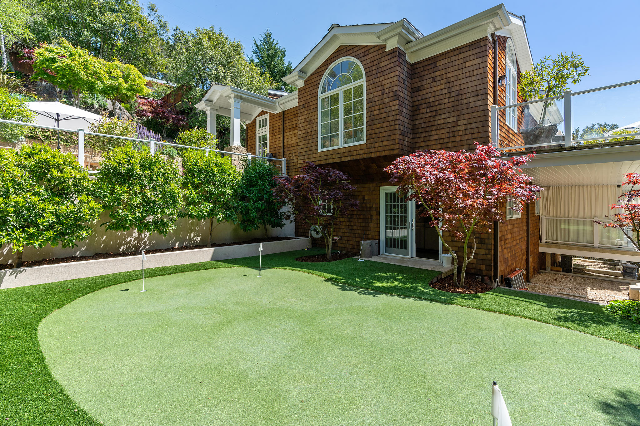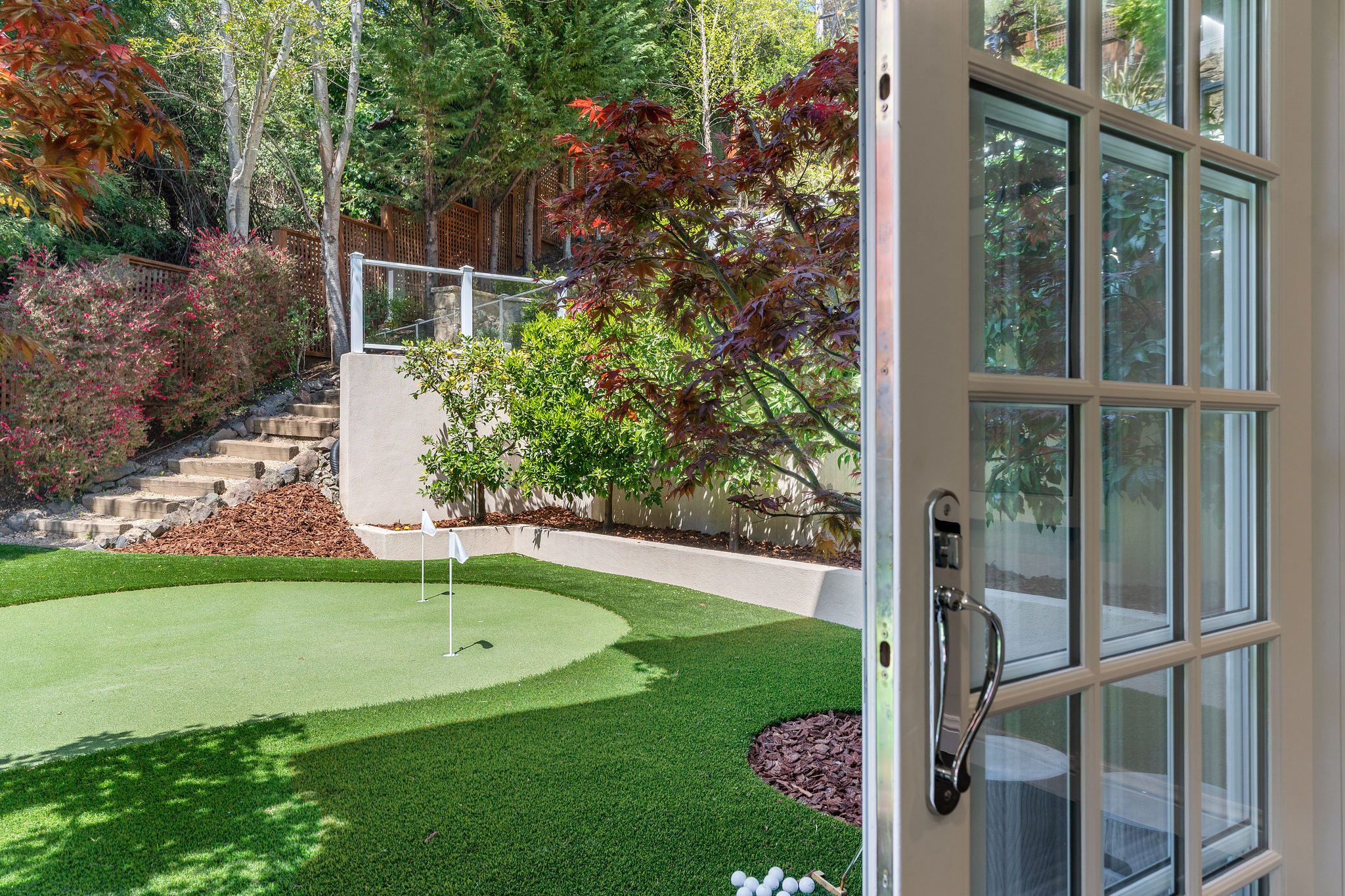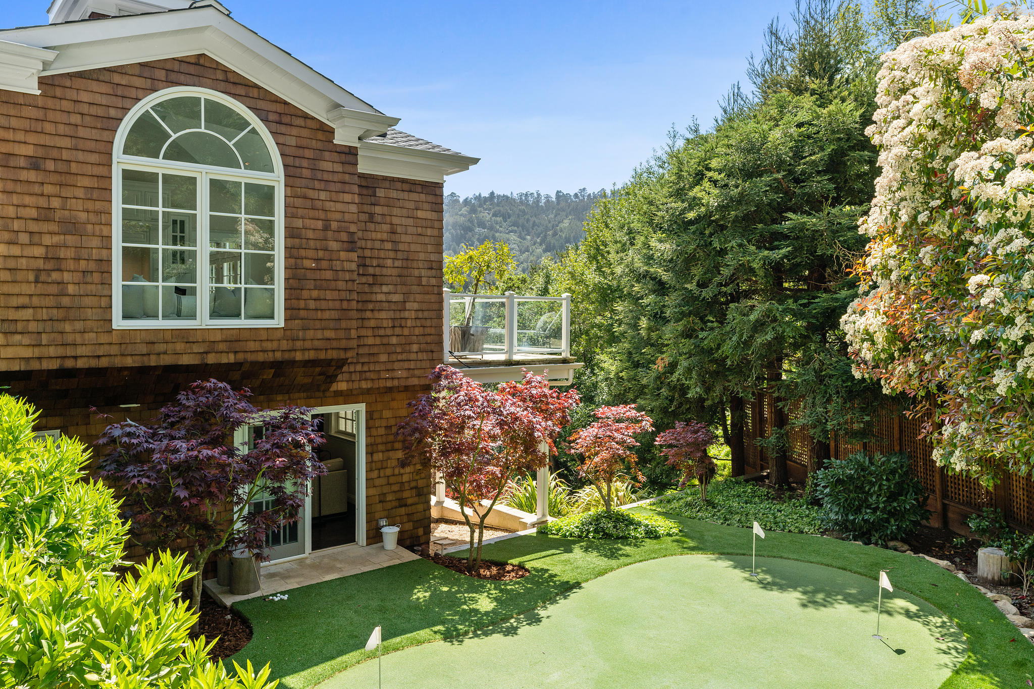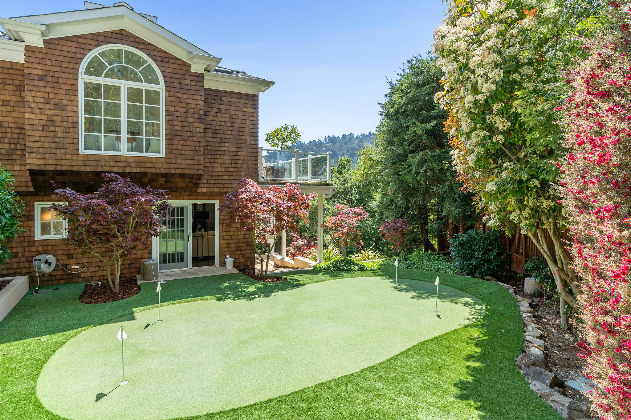 The generous primary bedroom suite opens to a private deck with privacy curtains as an outdoor exercise space and has a spacious walk-in closet. The Silestone quartz bath has a separate shower and steam feature, double sinks, and a separate tub. The fourth bedroom, currently used as a den has an ensuite bathroom with a large shower. There is a sliding door to the side yard with access to a putting green and garden.