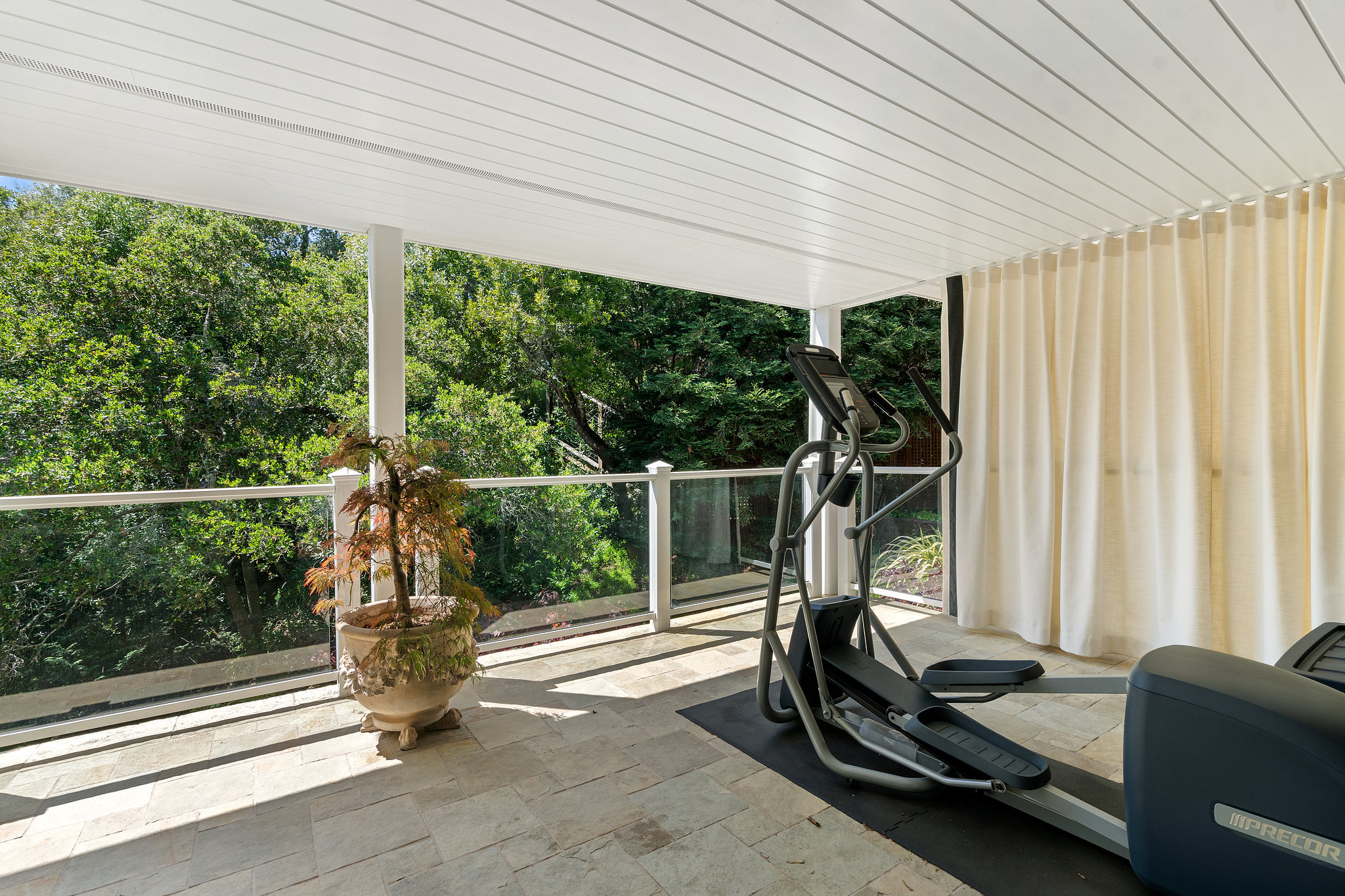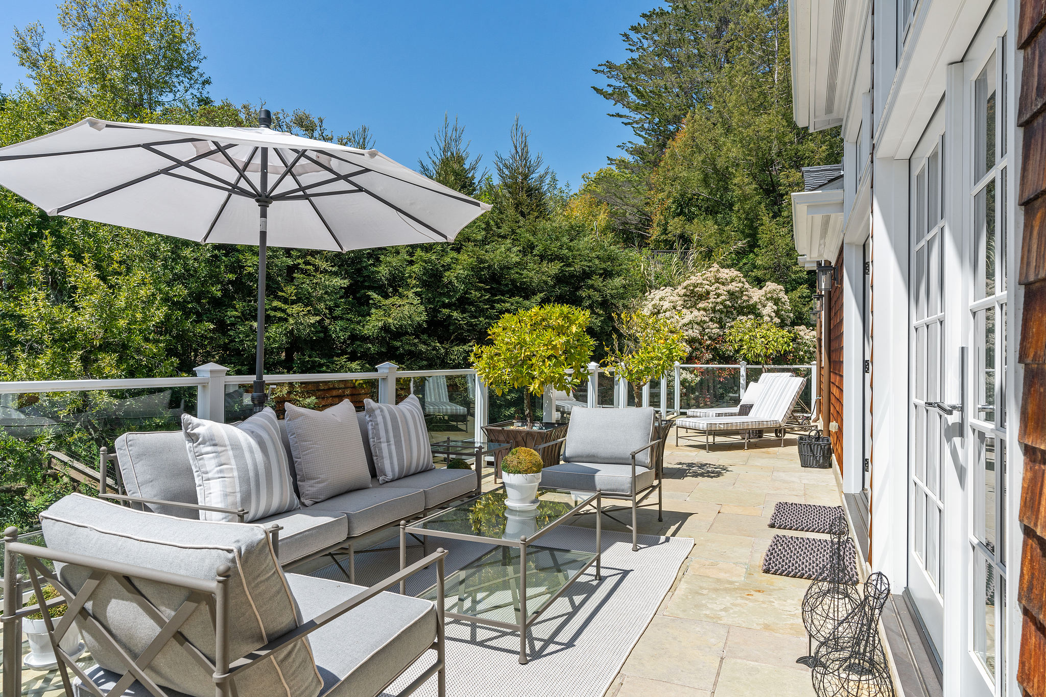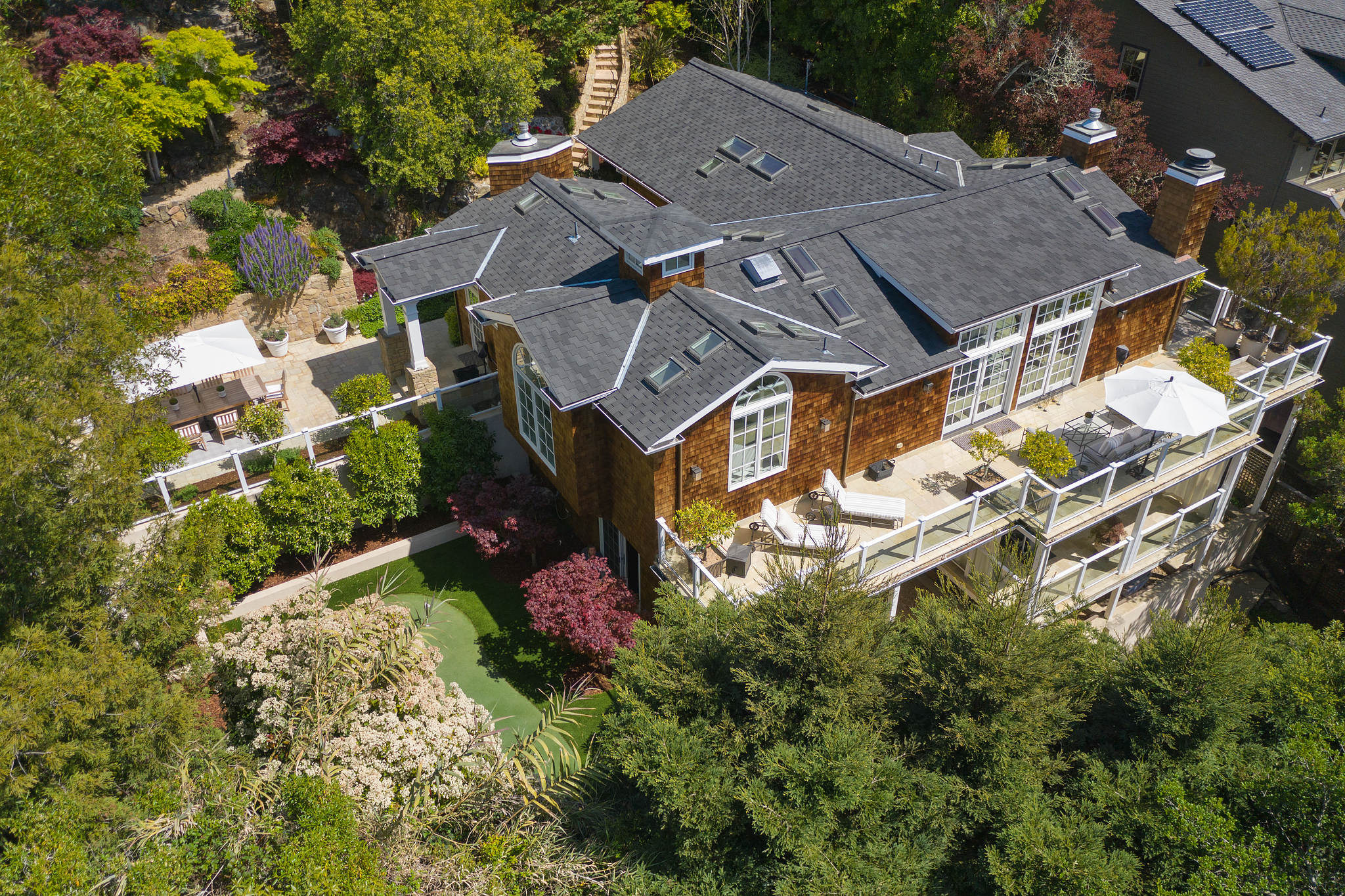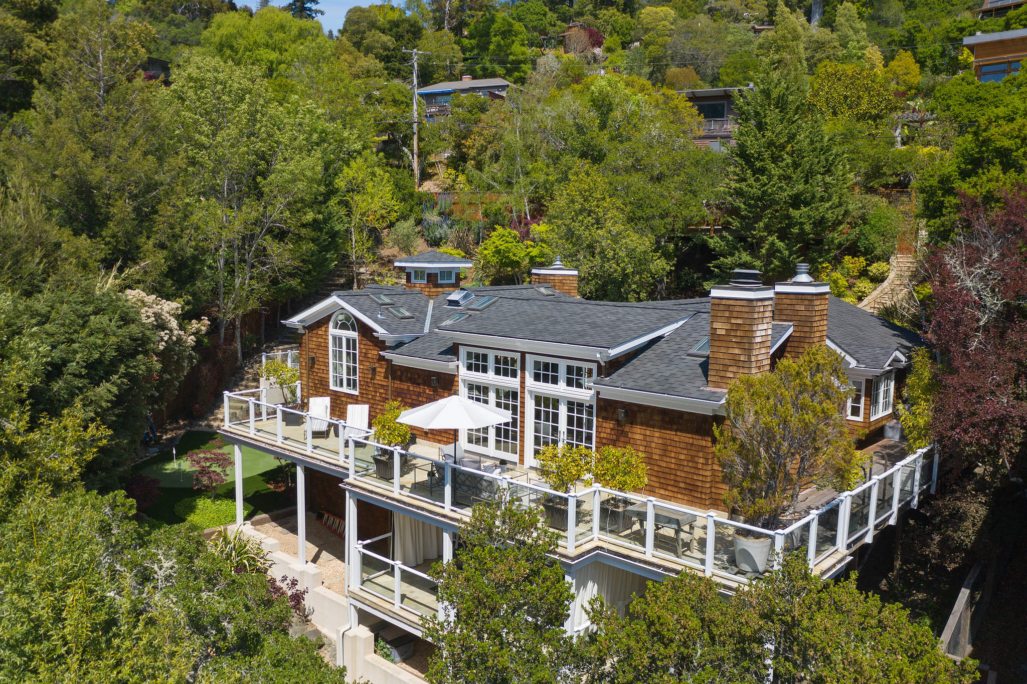 The generous primary bedroom suite opens to a private deck with privacy curtains as an outdoor exercise space and has a spacious walk-in closet. The Silestone quartz bath has a separate shower and steam feature, double sinks, and a separate tub. The fourth bedroom, currently used as a den has an ensuite bathroom with a large shower. There is a sliding door to the side yard with access to a putting green and garden.