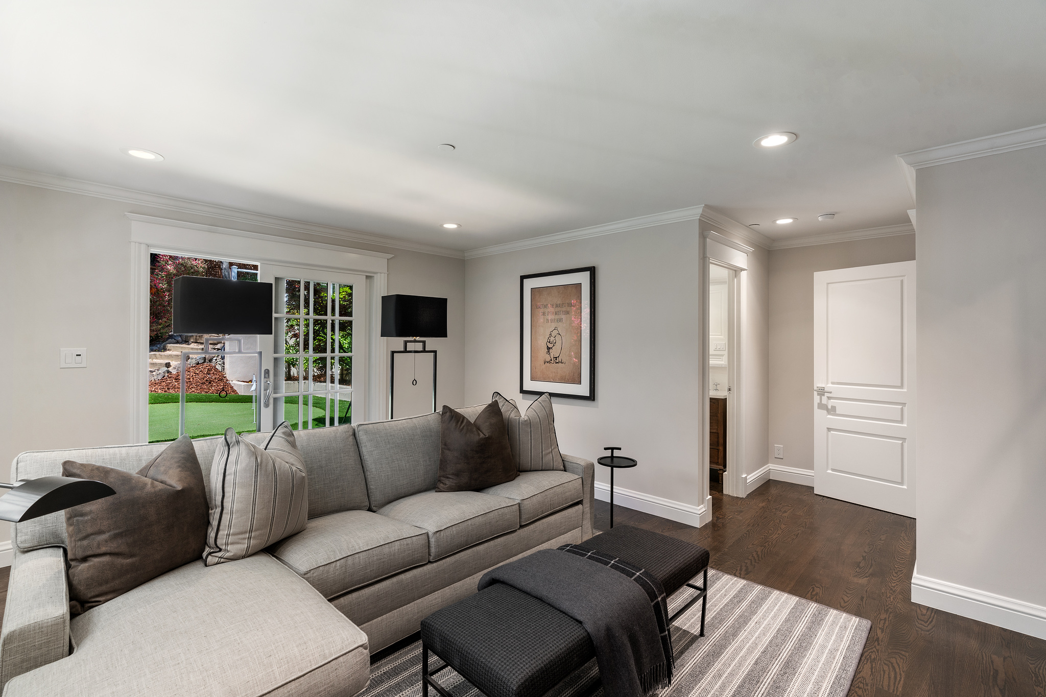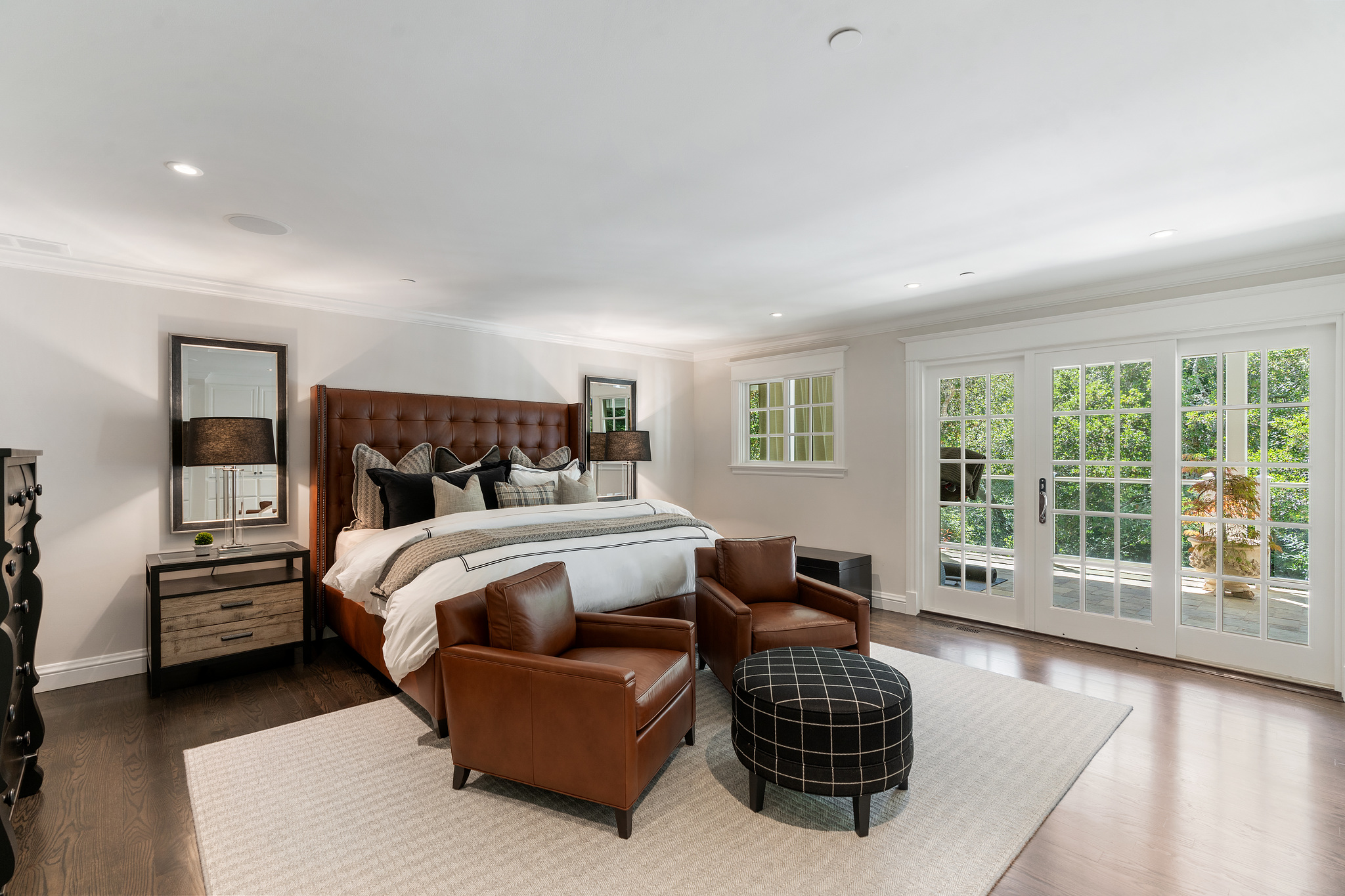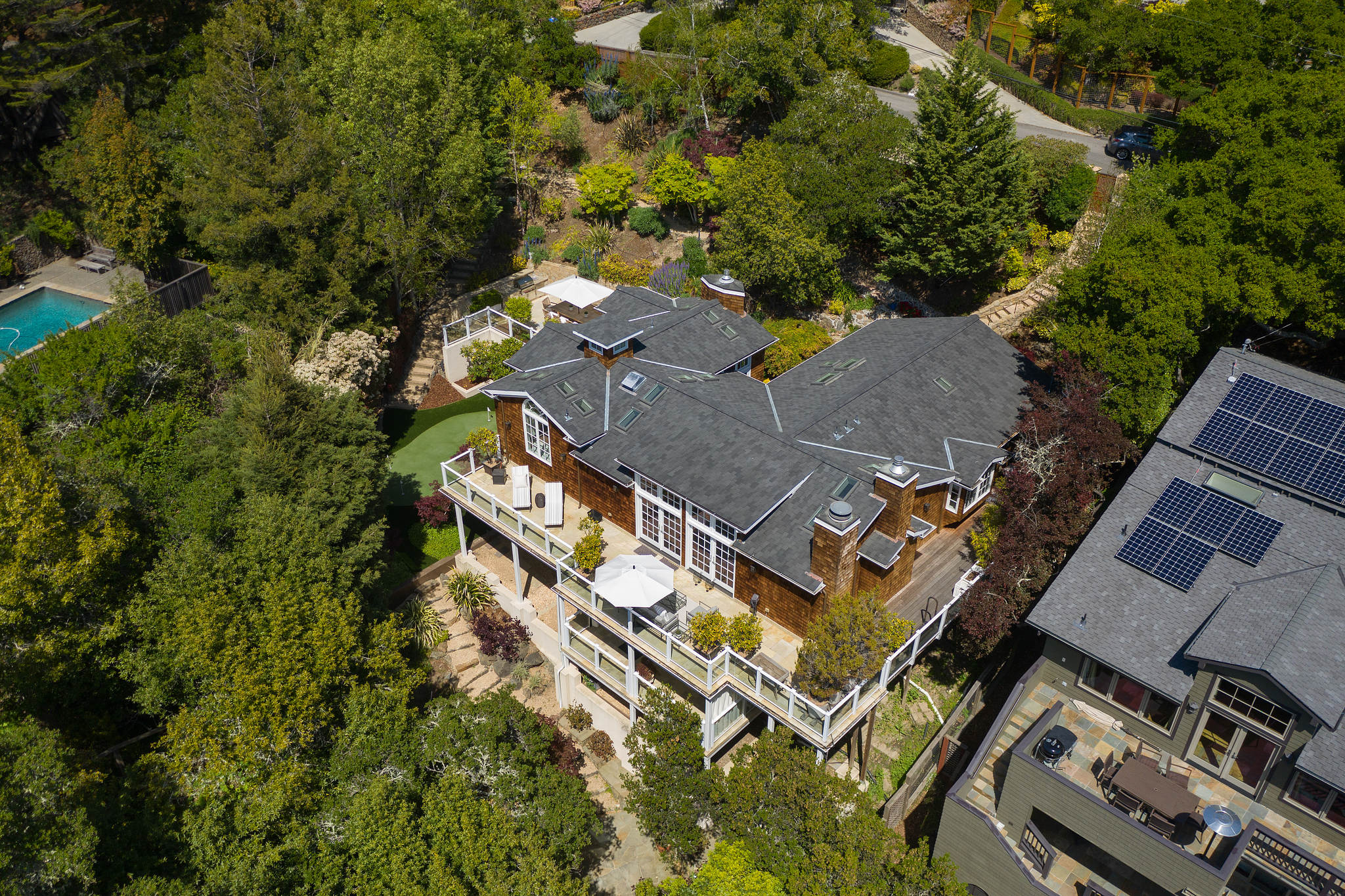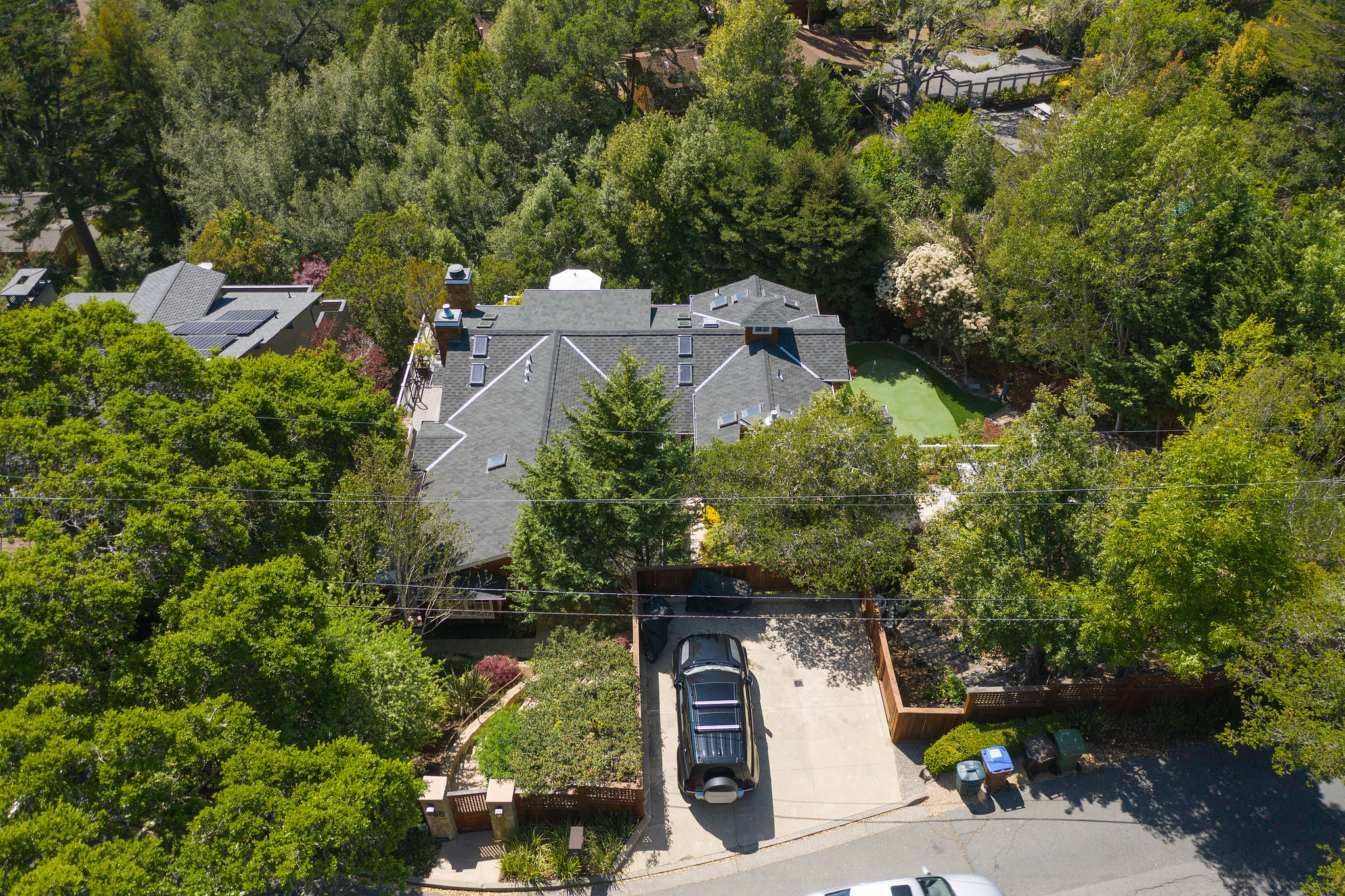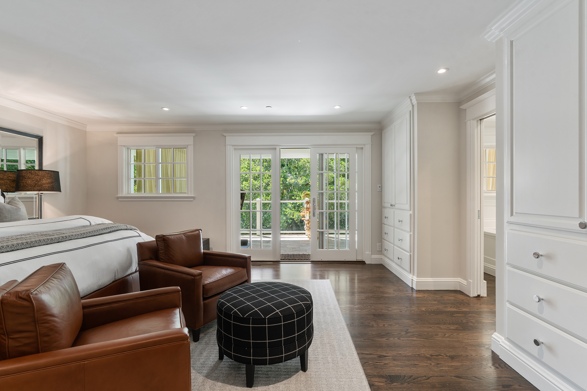The generous primary bedroom suite opens to a private deck with privacy curtains as an outdoor exercise space and has a spacious walk-in closet. The Silestone quartz bath has a separate shower and steam feature, double sinks, and a separate tub. The fourth bedroom, currently used as a den has an ensuite bathroom with a large shower. There is a sliding door to the side yard with access to a putting green and garden.