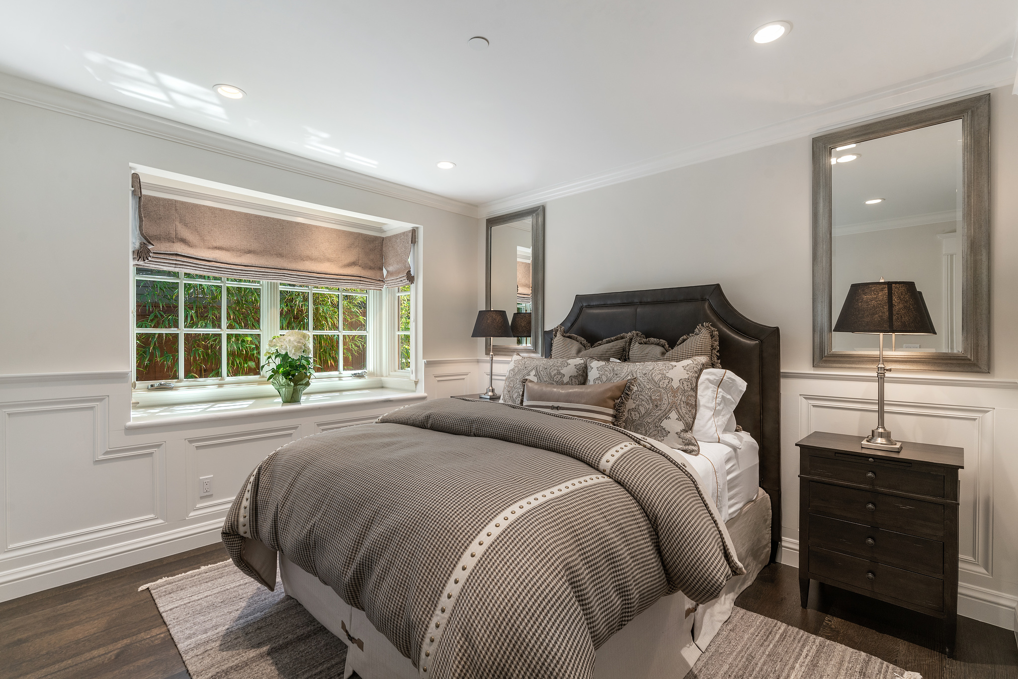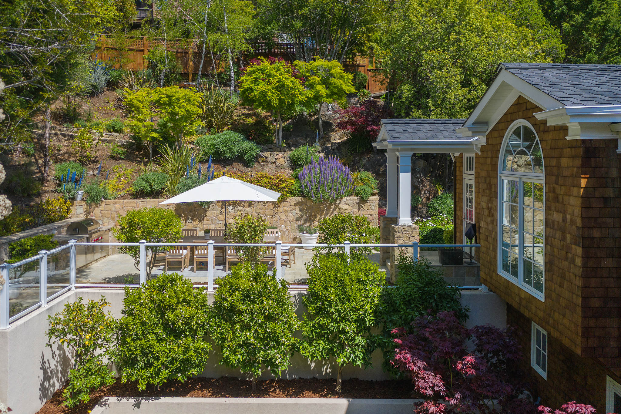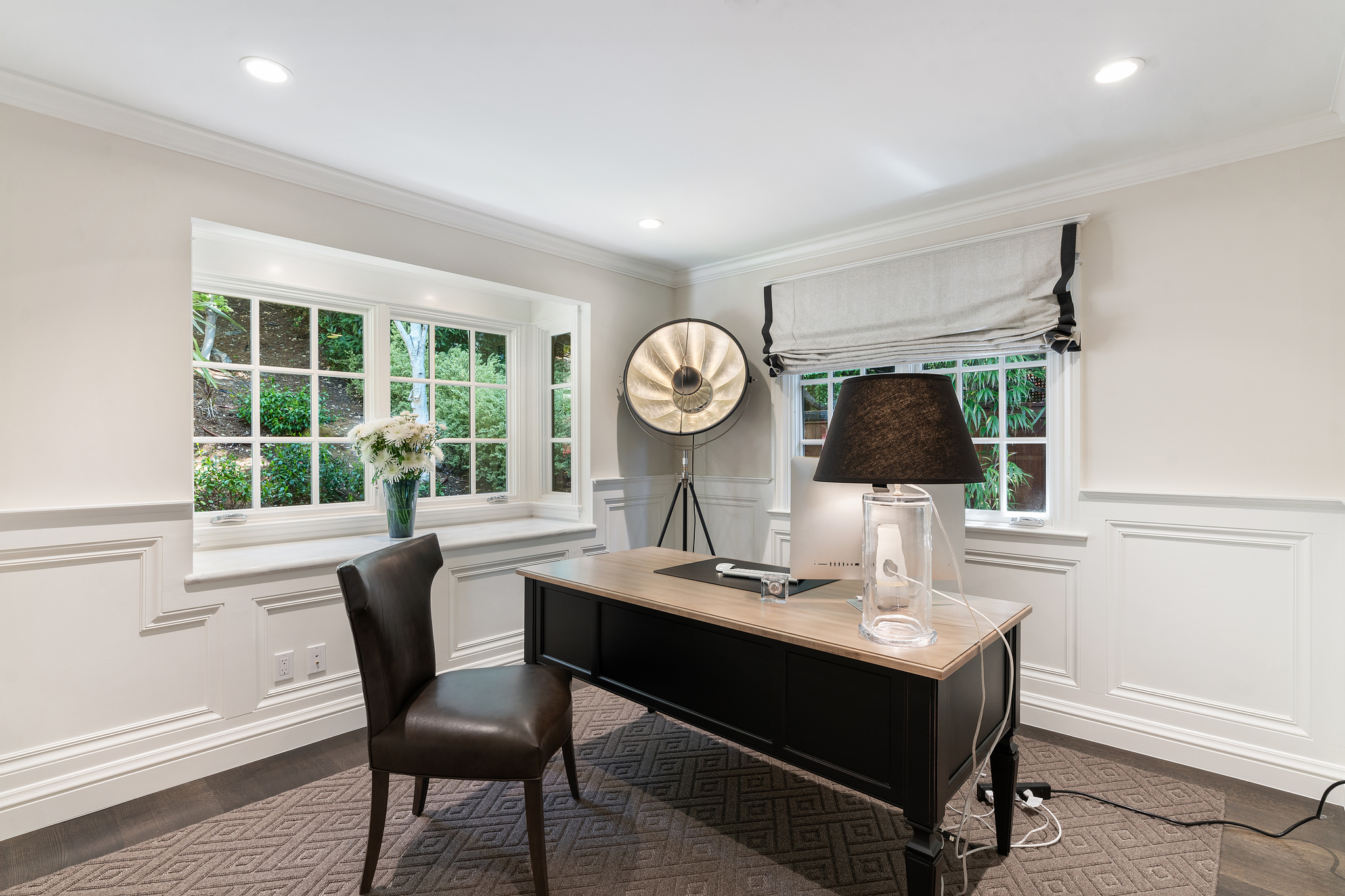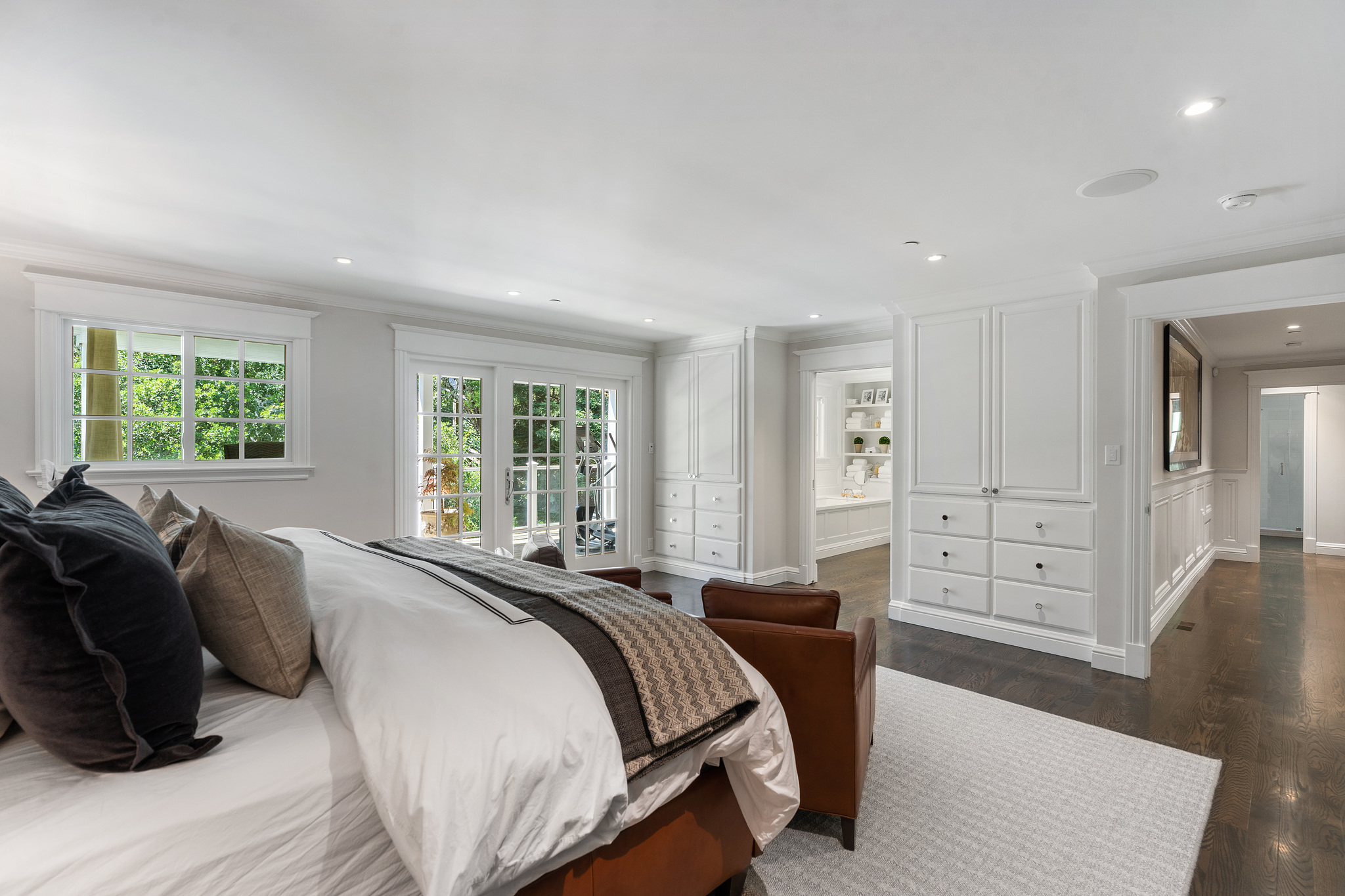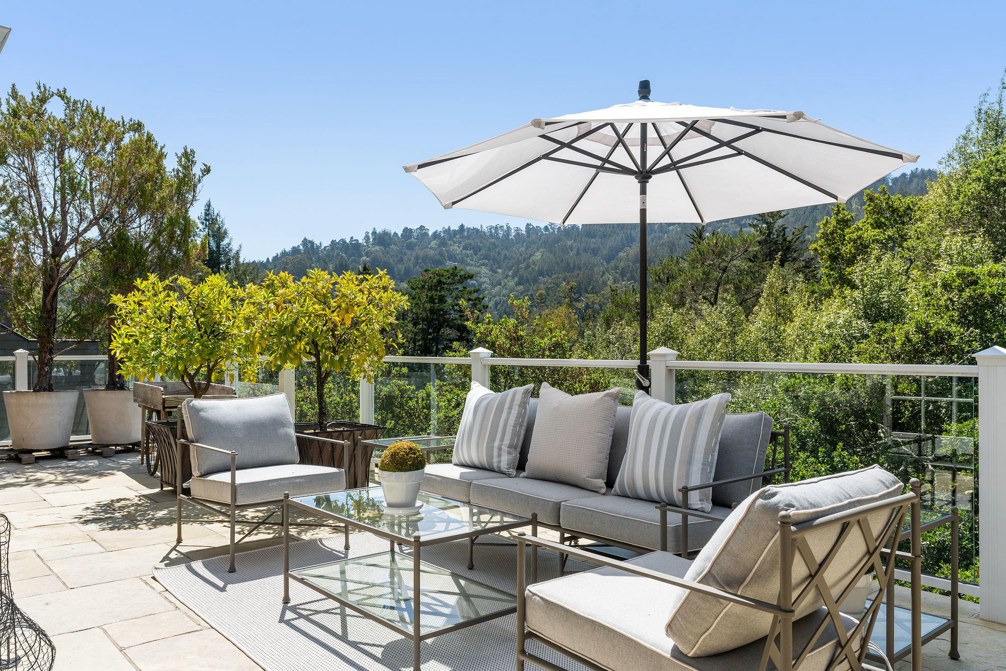 The generous primary bedroom suite opens to a private deck with privacy curtains as an outdoor exercise space and has a spacious walk-in closet. The Silestone quartz bath has a separate shower and steam feature, double sinks, and a separate tub. The fourth bedroom, currently used as a den has an ensuite bathroom with a large shower. There is a sliding door to the side yard with access to a putting green and garden.