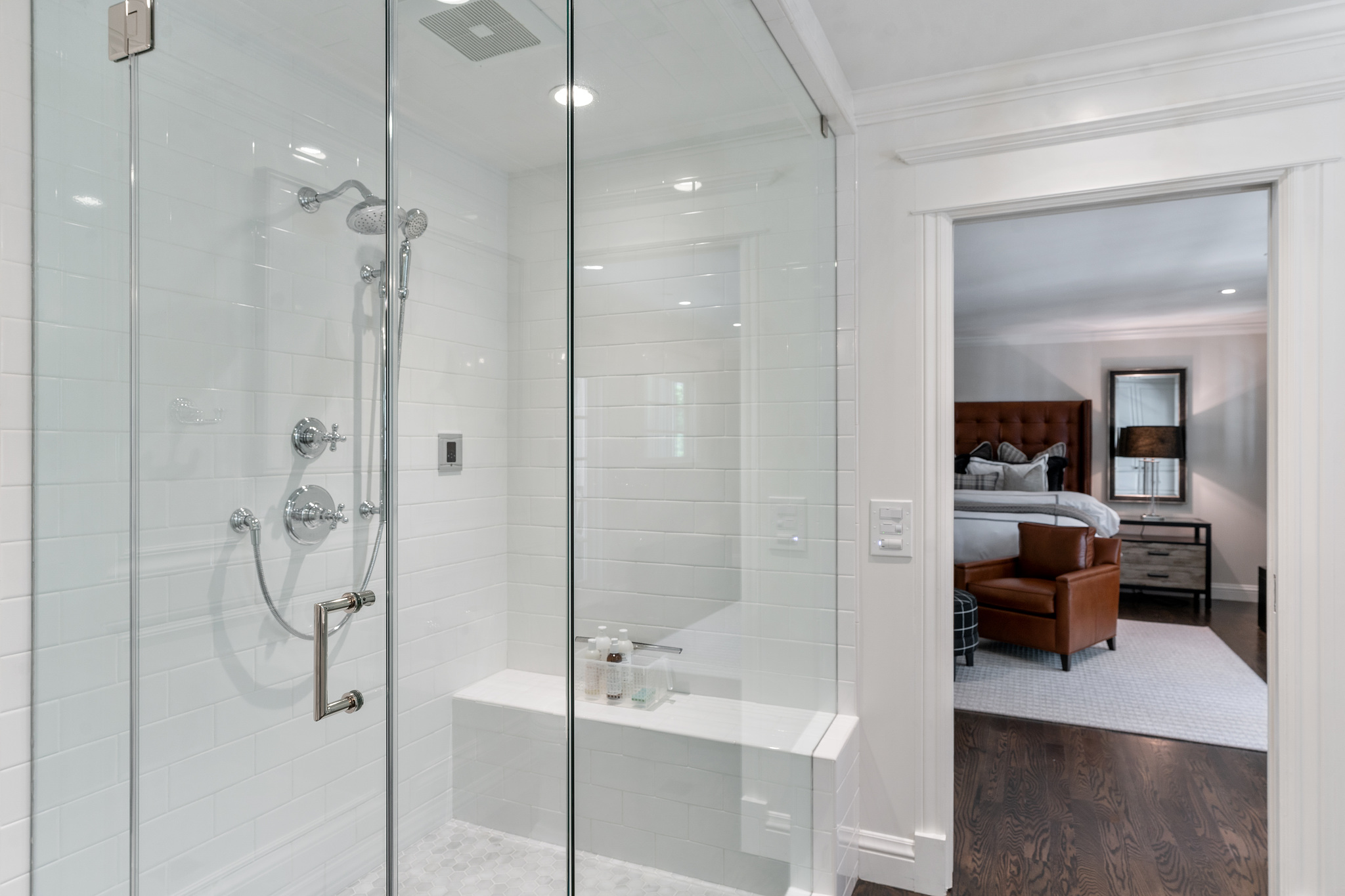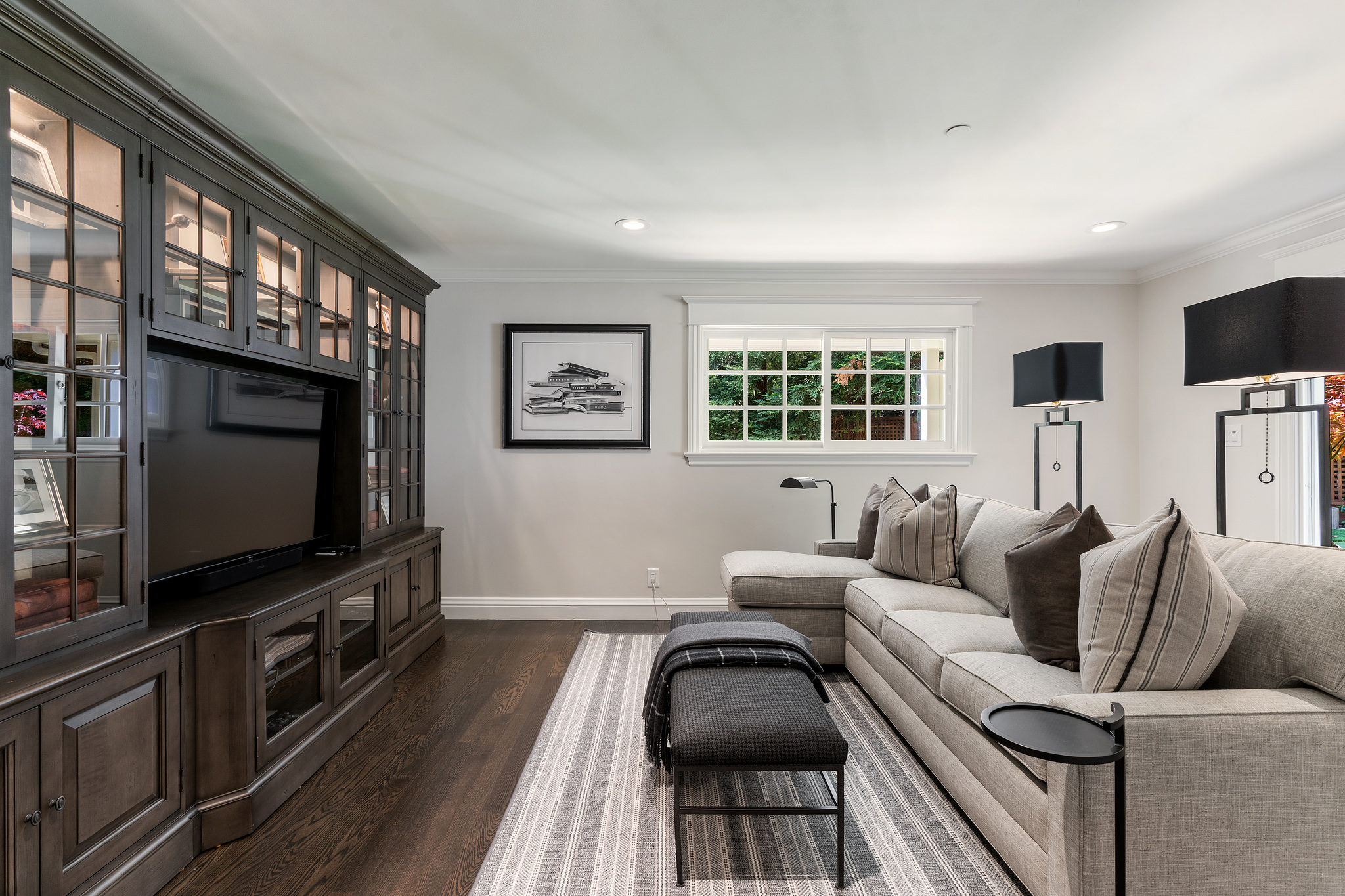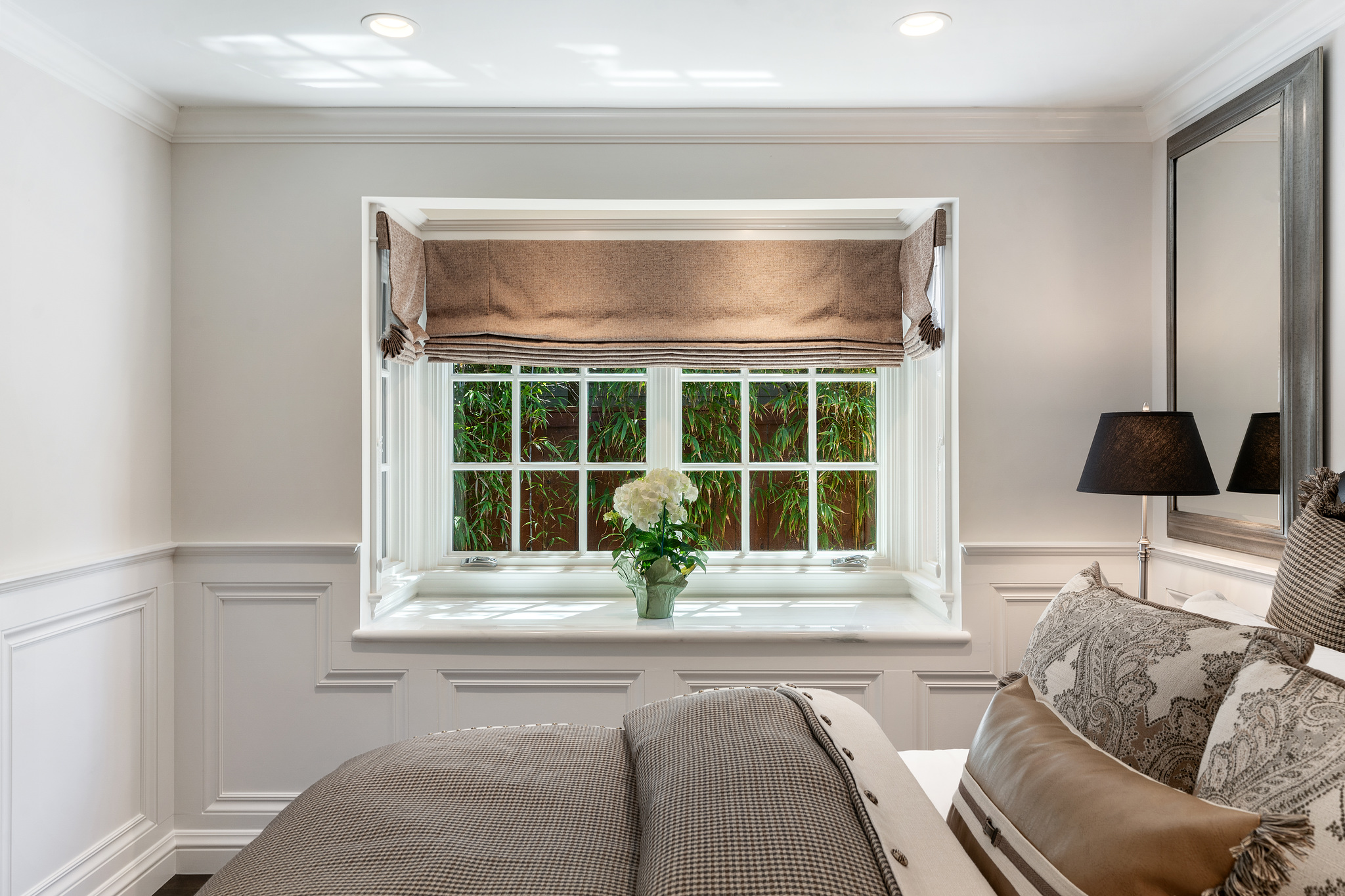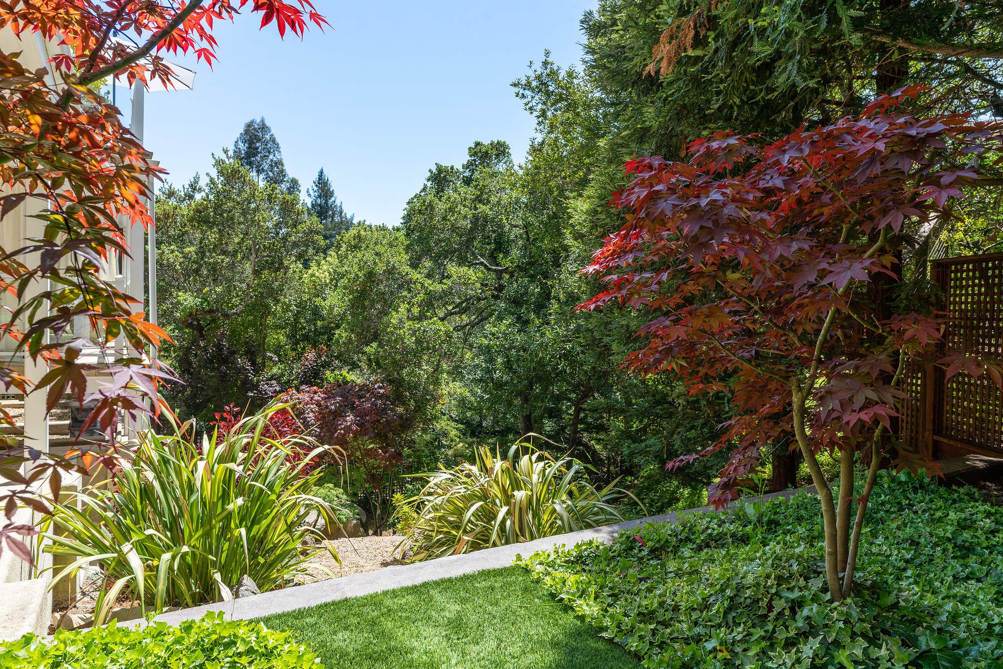 The generous primary bedroom suite opens to a private deck with privacy curtains as an outdoor exercise space and has a spacious walk-in closet. The Silestone quartz bath has a separate shower and steam feature, double sinks, and a separate tub. The fourth bedroom, currently used as a den has an ensuite bathroom with a large shower. There is a sliding door to the side yard with access to a putting green and garden.