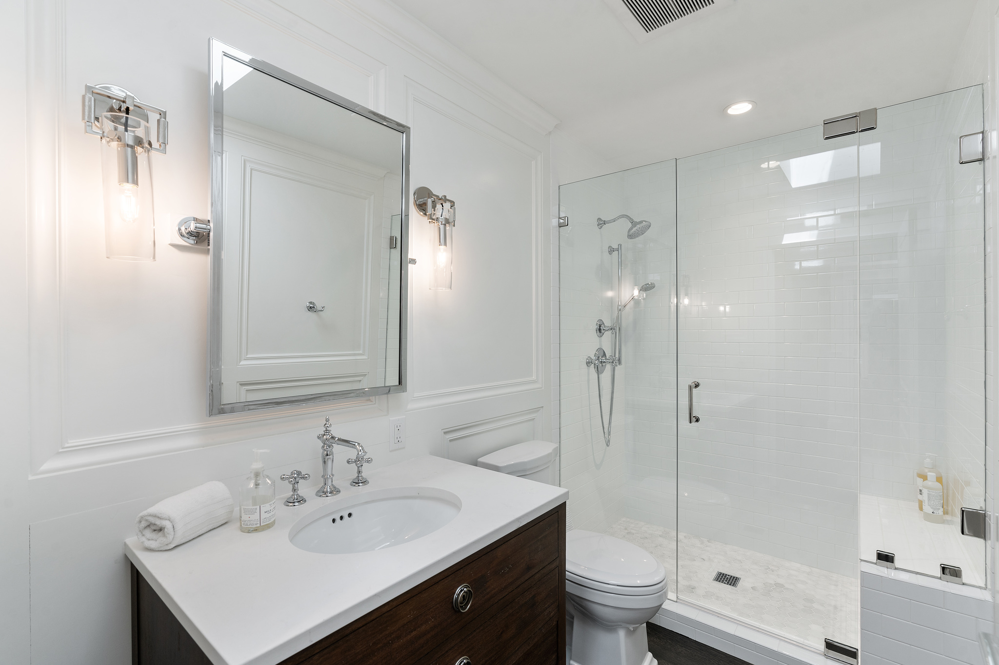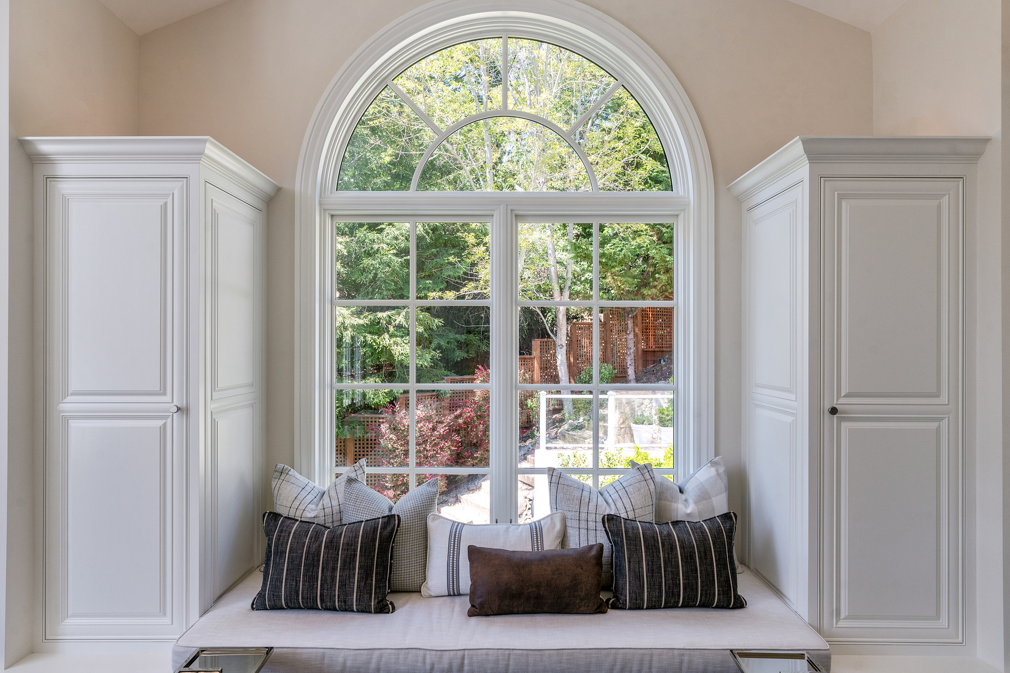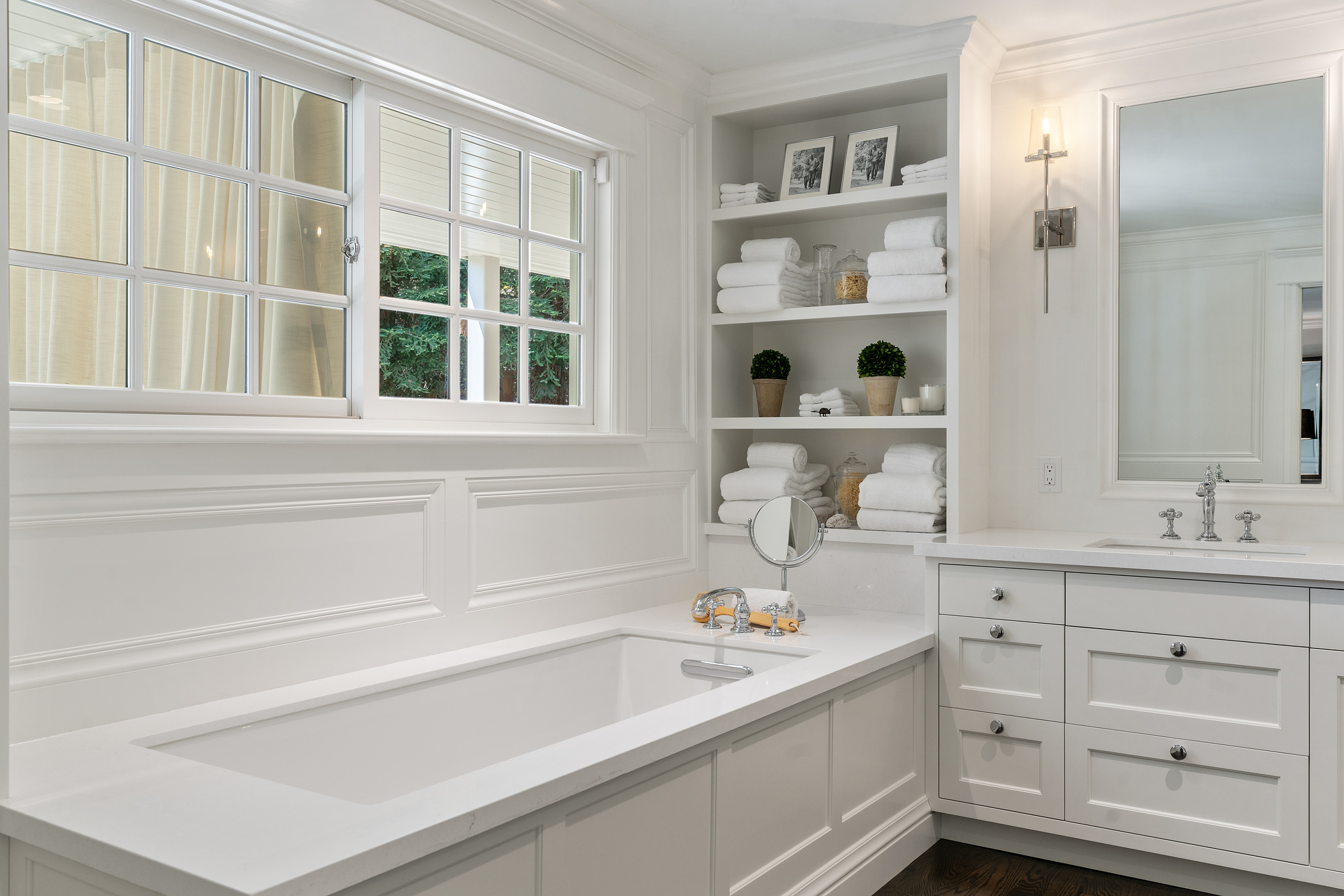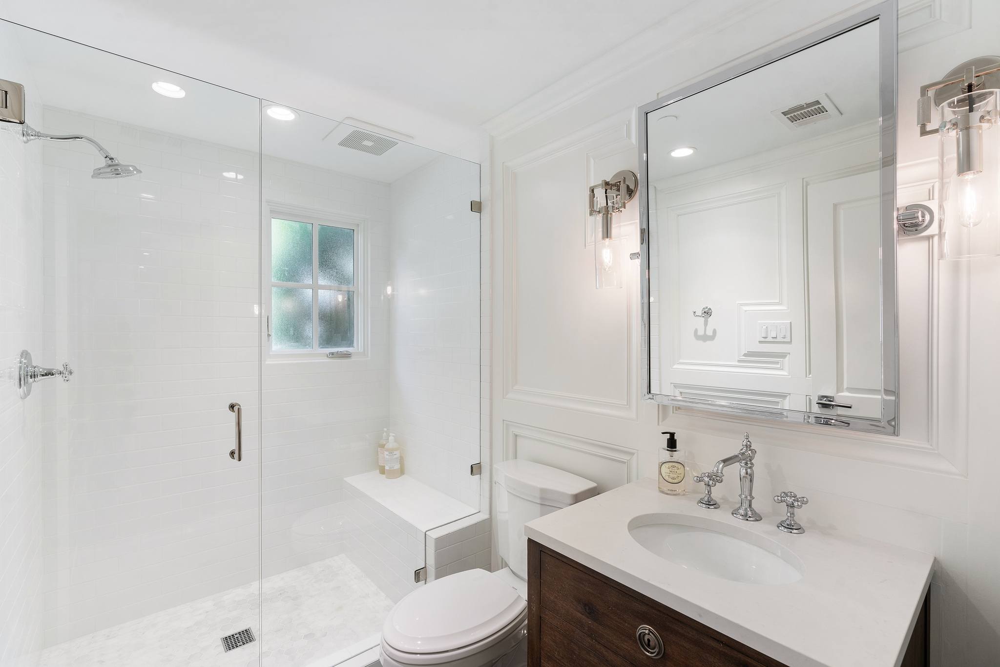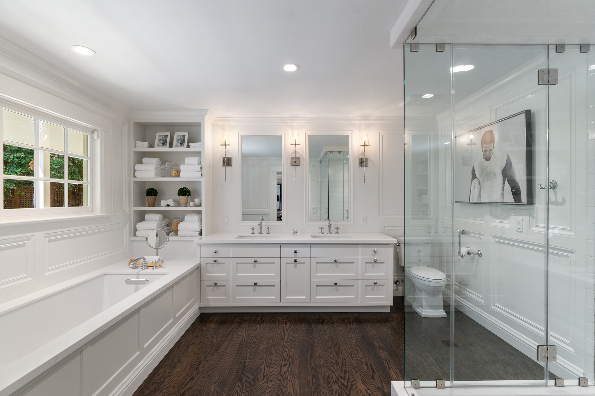 The generous primary bedroom suite opens to a private deck with privacy curtains as an outdoor exercise space and has a spacious walk-in closet. The Silestone quartz bath has a separate shower and steam feature, double sinks, and a separate tub. The fourth bedroom, currently used as a den has an ensuite bathroom with a large shower. There is a sliding door to the side yard with access to a putting green and garden.