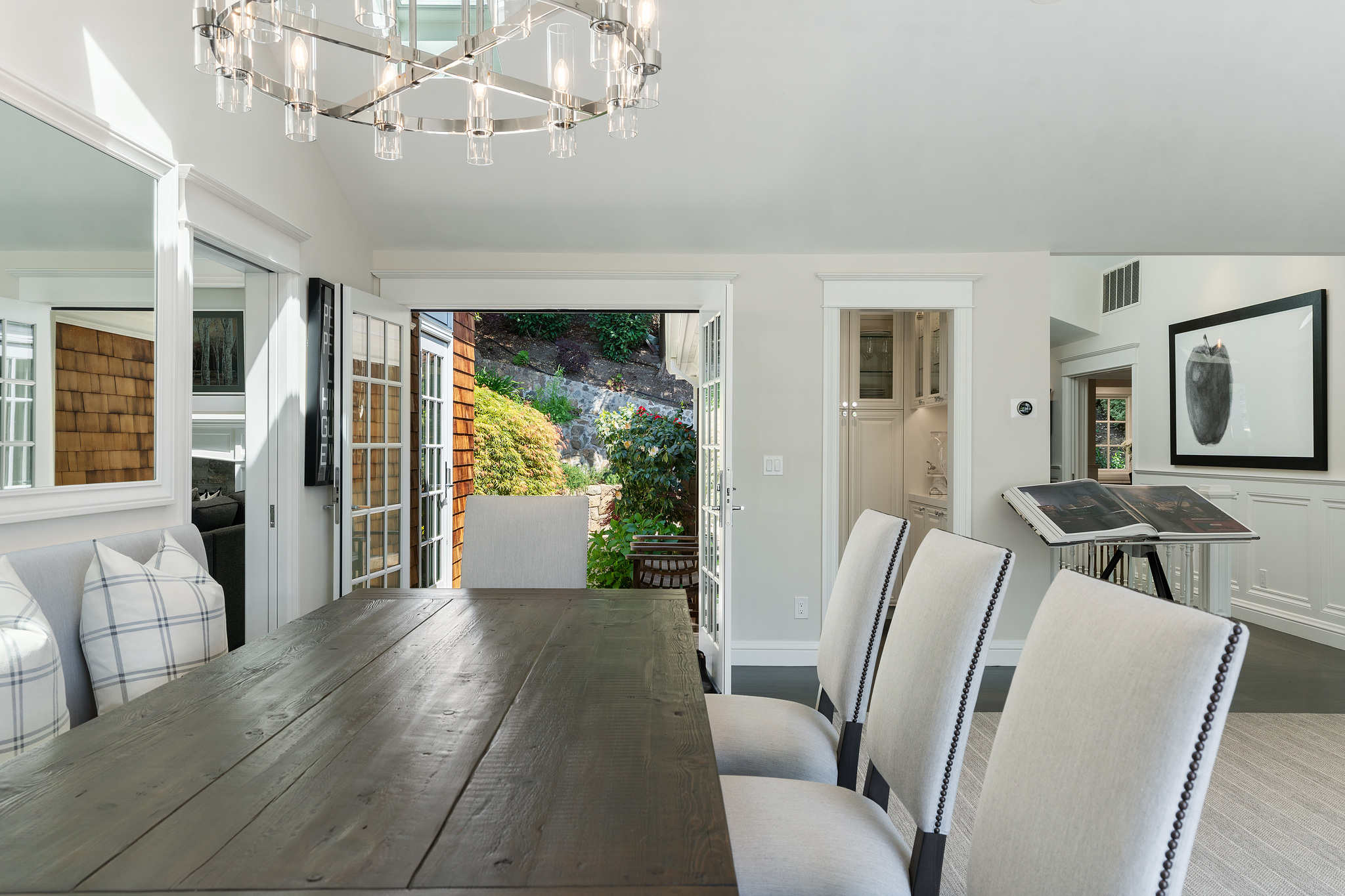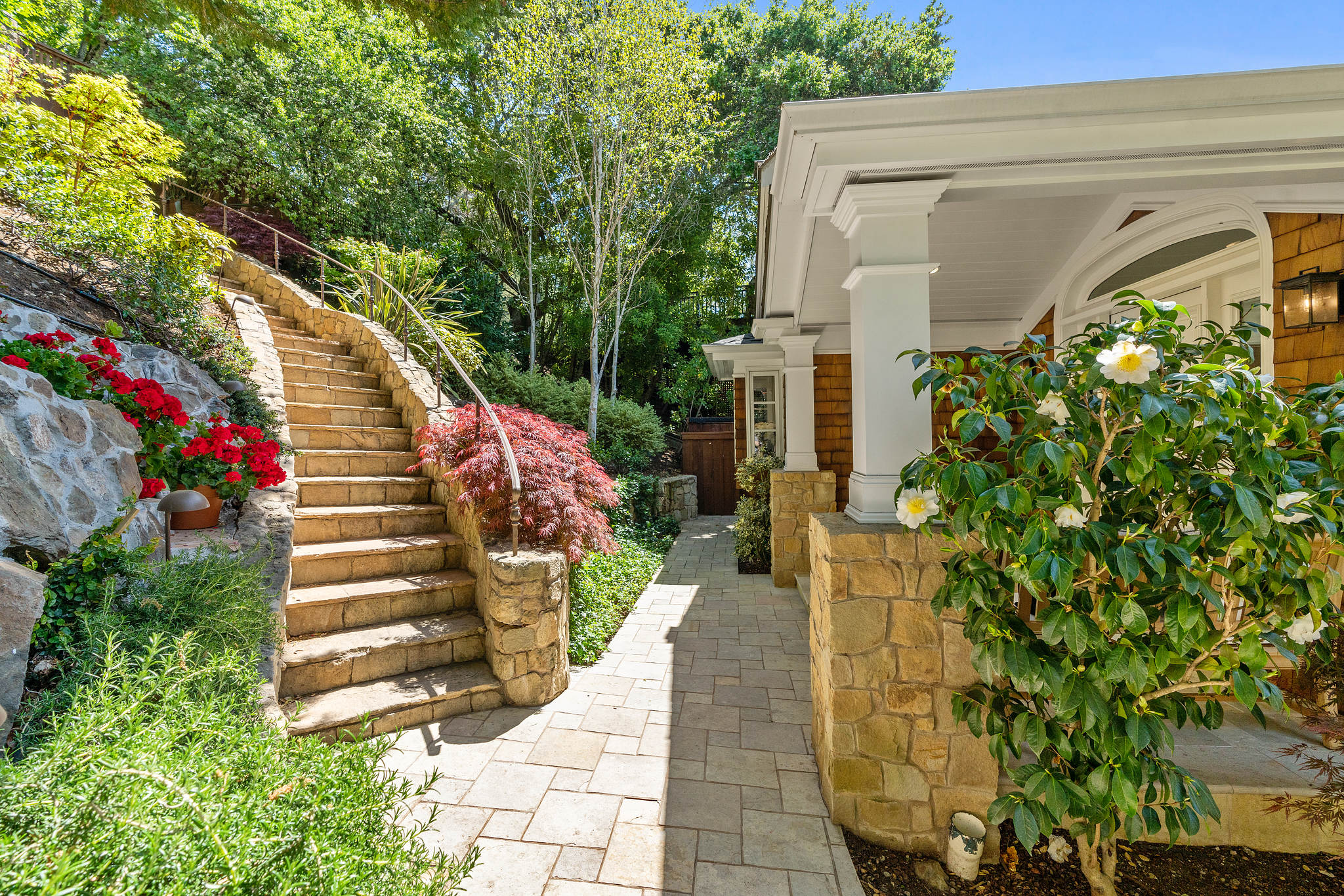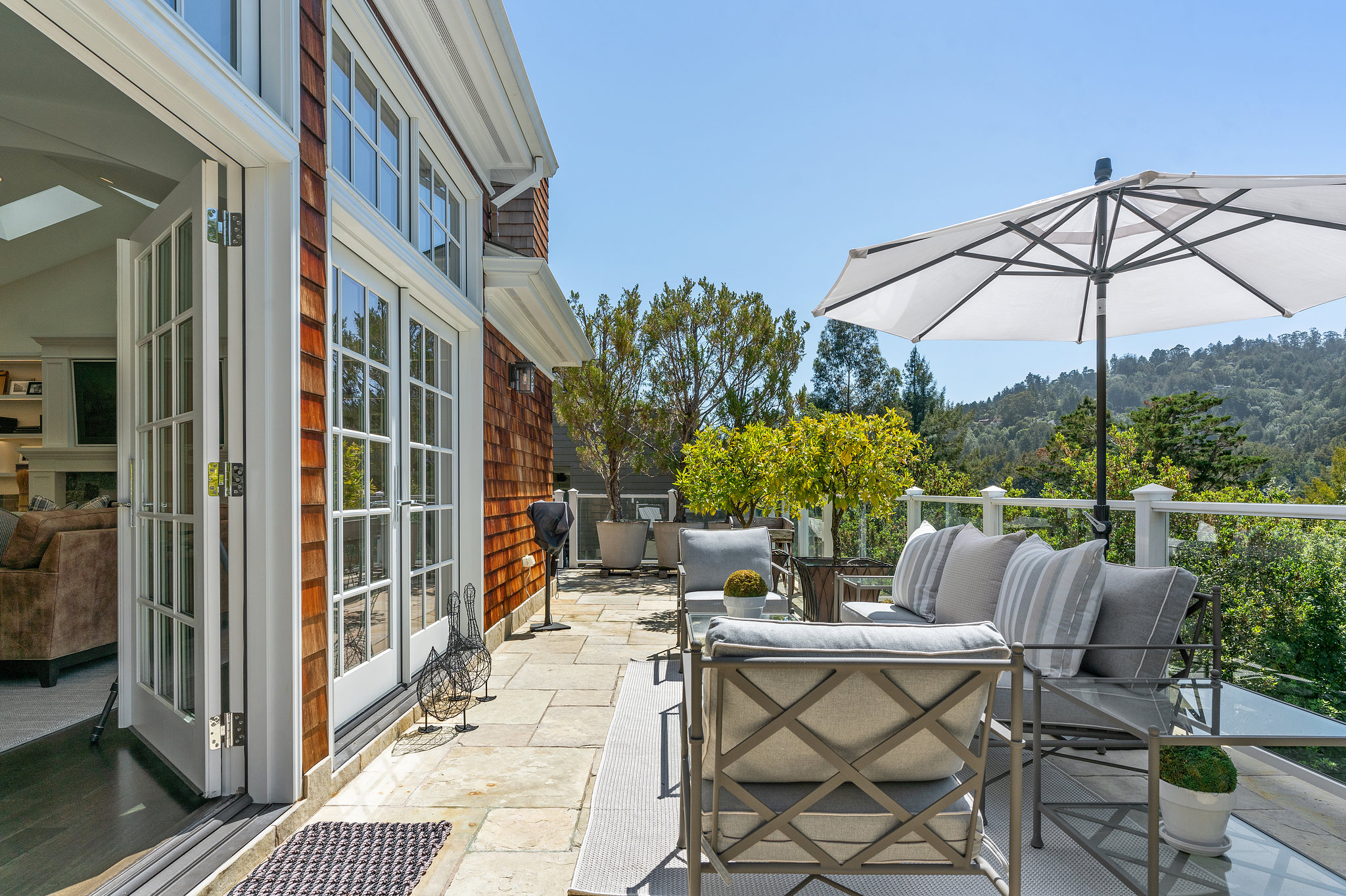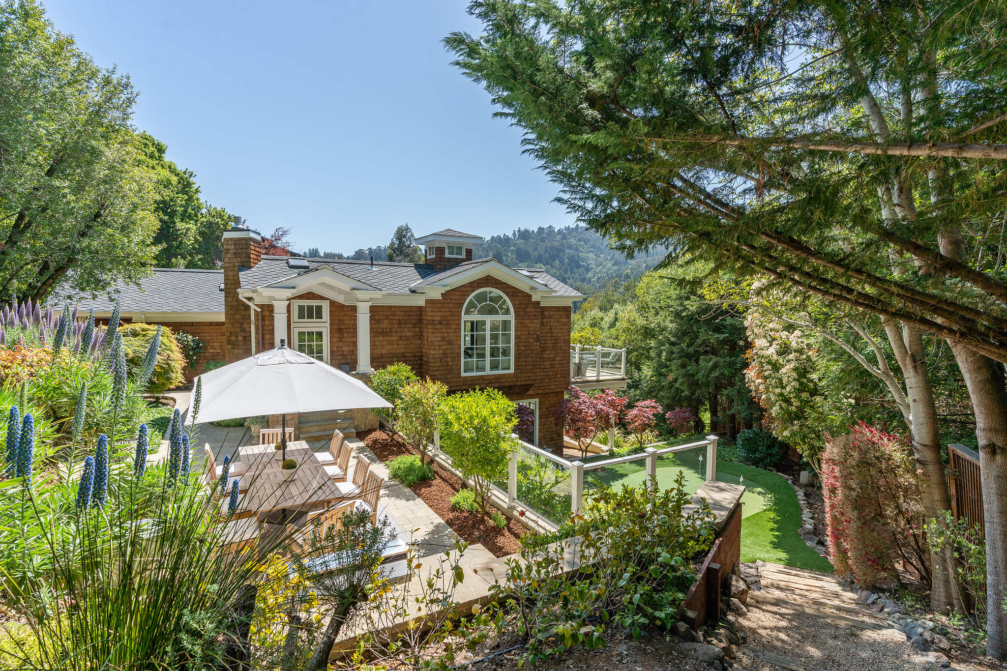 Quintessential Mill Valley home close to downtown and all the sought-after amenities that Mill Valley has to offer. This traditional styled home has been meticulously renovated with the finest of finishes and attention to detail to showcase the floorplan and verdant setting. The front porch invites you into the home and draws you to the floor to ceiling windows that frame the verdant surroundings. ;The oversized living room with Montana Glacier Creek hand cut stone fireplace, cathedral ceilings and French doors to the deck and views. The open floor plan dining room has a bench seating on one side, a butler’s pantry to the side, and access to the yard. ;;The remodeled chef’s kitchen with Wolf stove and oven, Subzero refrigerator, Cambria quartz counters, a large island, a bench area to sit, and a coffee /expresso station. ;The family room is framed by a Glacier Creek stone fireplace opening to the garden and stone patio with an outdoor kitchen featuring Wolf and Subzero appliances and the same Glacier Creek stone counter for the indoor-outdoor lifestyle. ;Additionally, there are 2 bedrooms and a full bath on this level, one bedroom is currently being used as an office. A visitor’s half bath completes this floor.