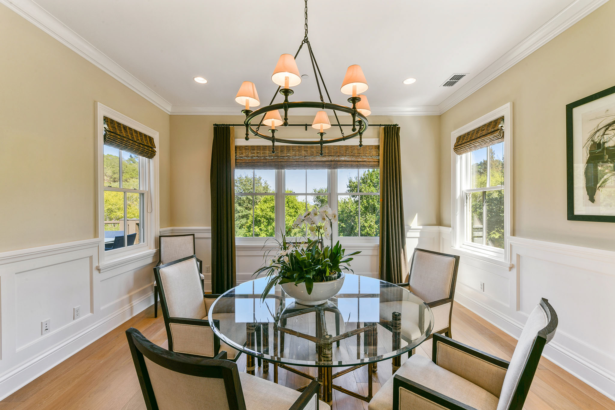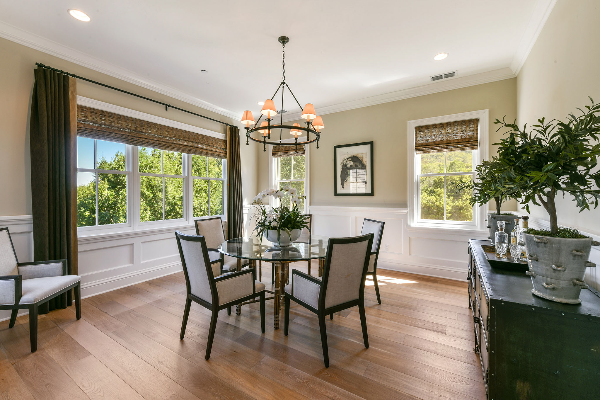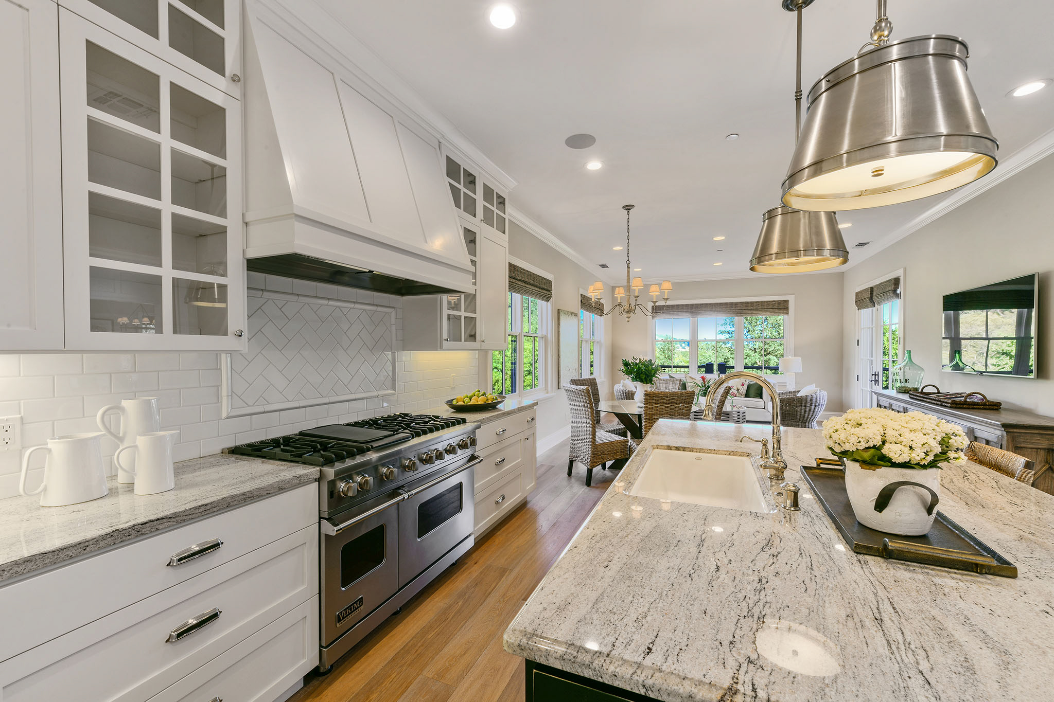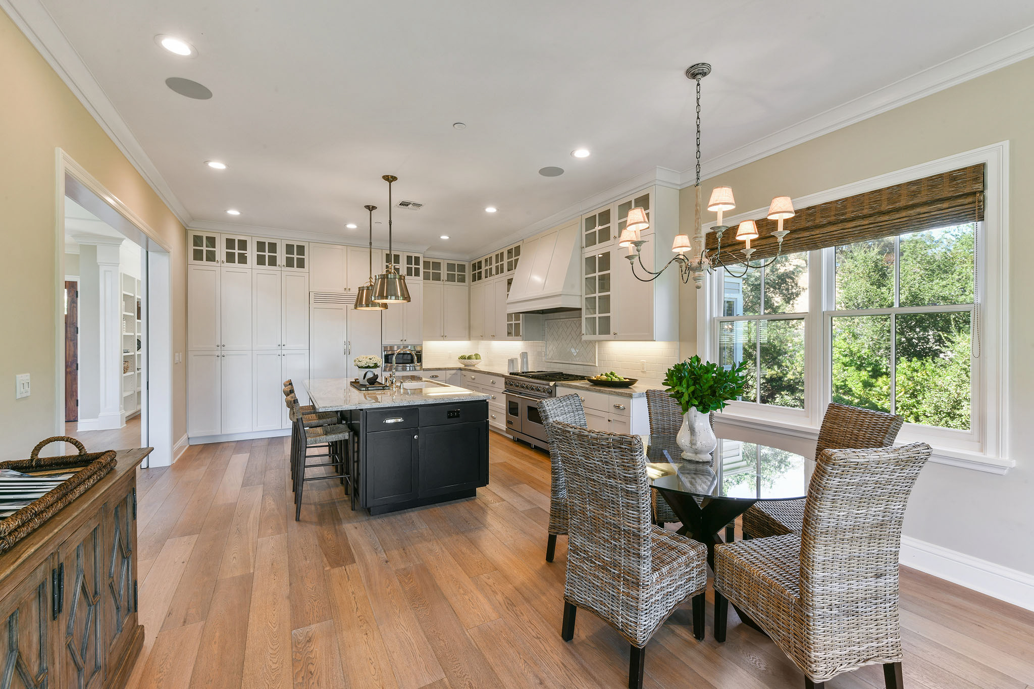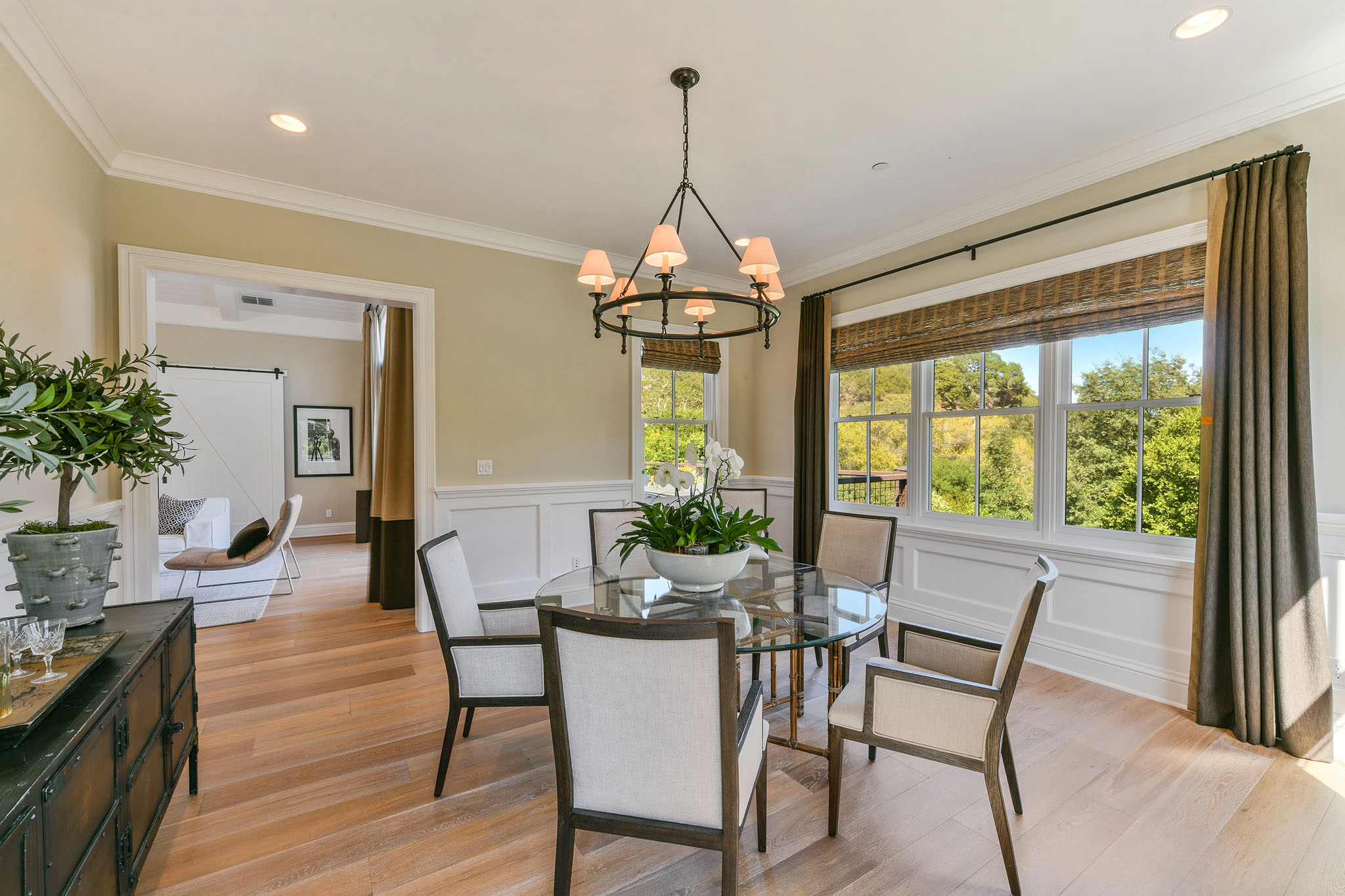 The gorgeous living room with fireplace, boxed beam cathedral ceiling and oversized hanging barn doors lead to an outdoor deck surrounded by trees and views of Mount Diablo. Enjoy dinner in the formal dining room with classic waist-high wainscoting while taking in grand views. Adjacent is a gourmet chef’s eat-in kitchen/great room with beautiful white cabinetry, granite countertops with custom designed backsplash, an oversized island with double hung pendant lighting. Gather in the adjacent family room as meals are prepared and conversations are had with friends and family and enjoy the garden views and access to the spacious deck These formal and casual spaces are perfect for indoor/outdoor entertaining.;;