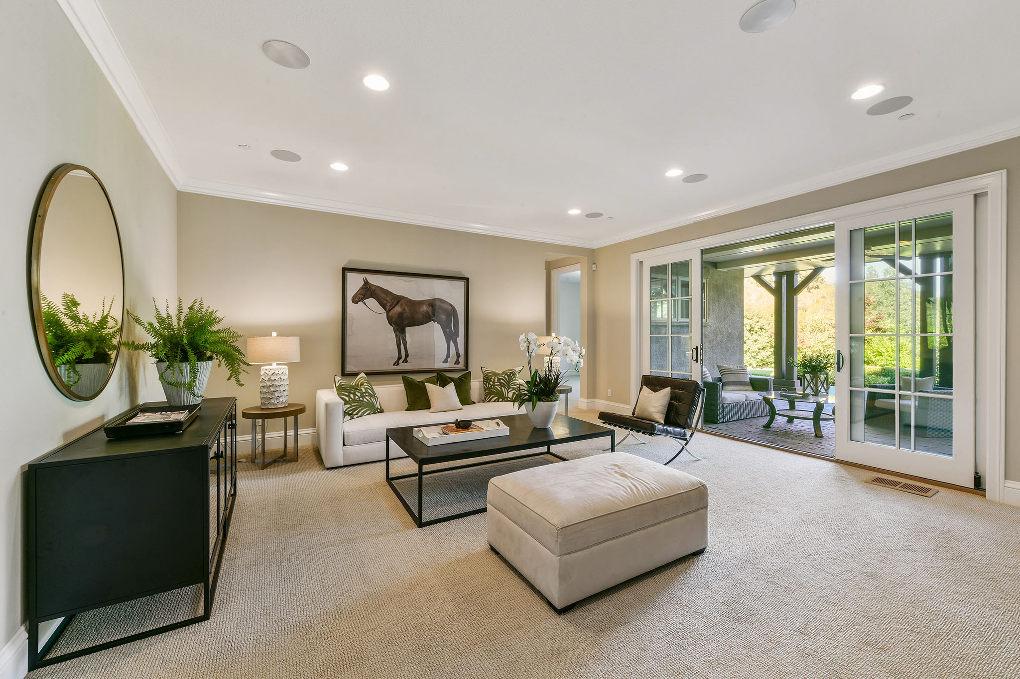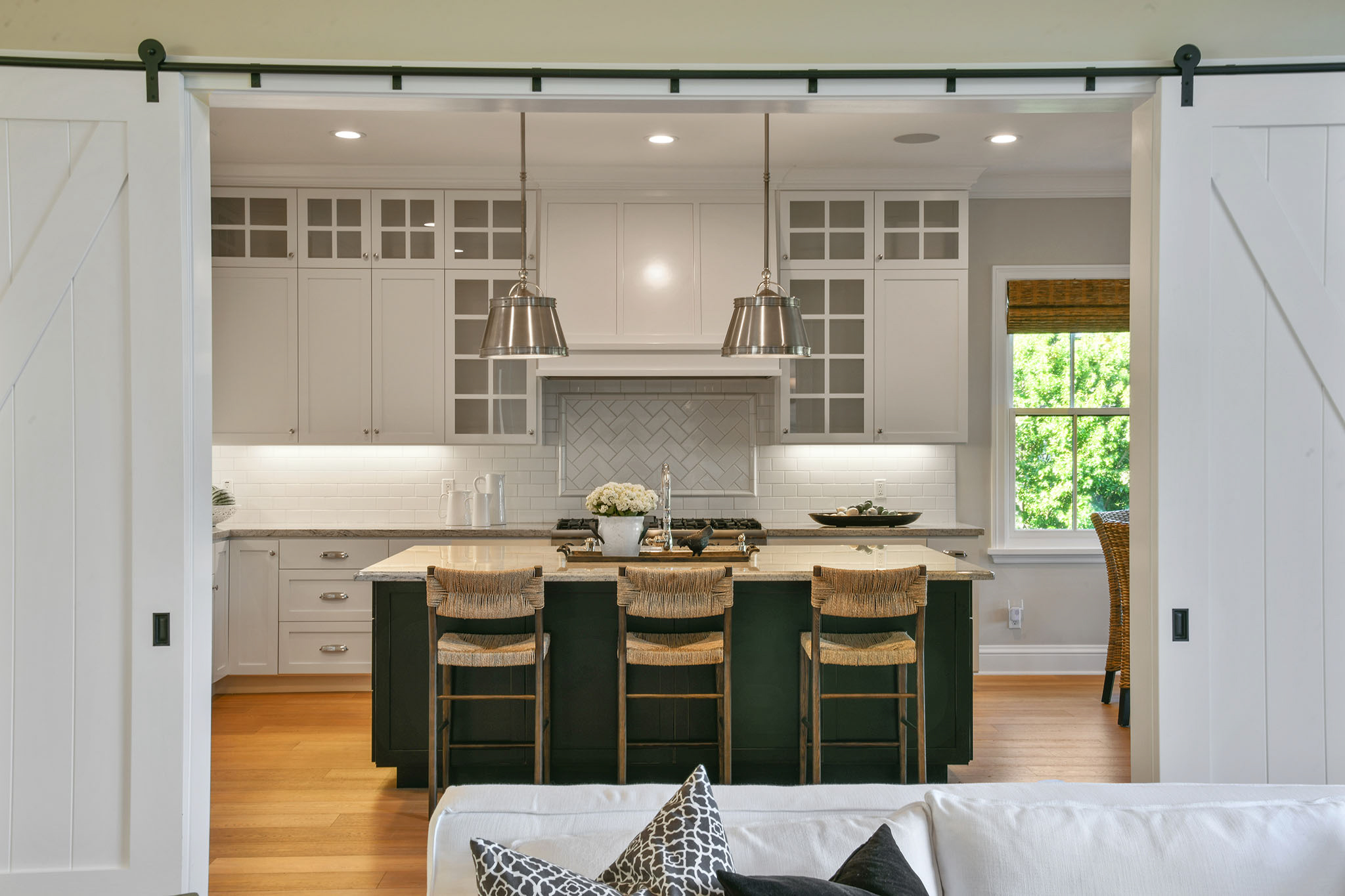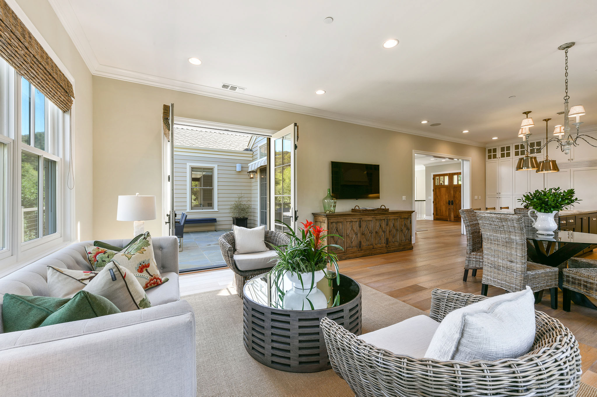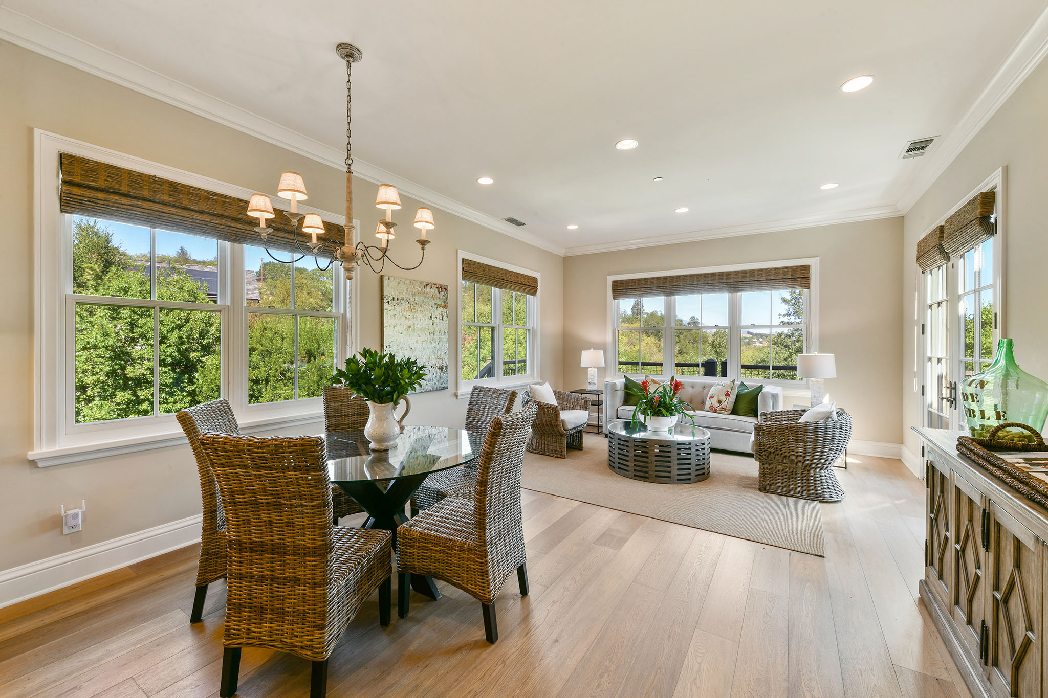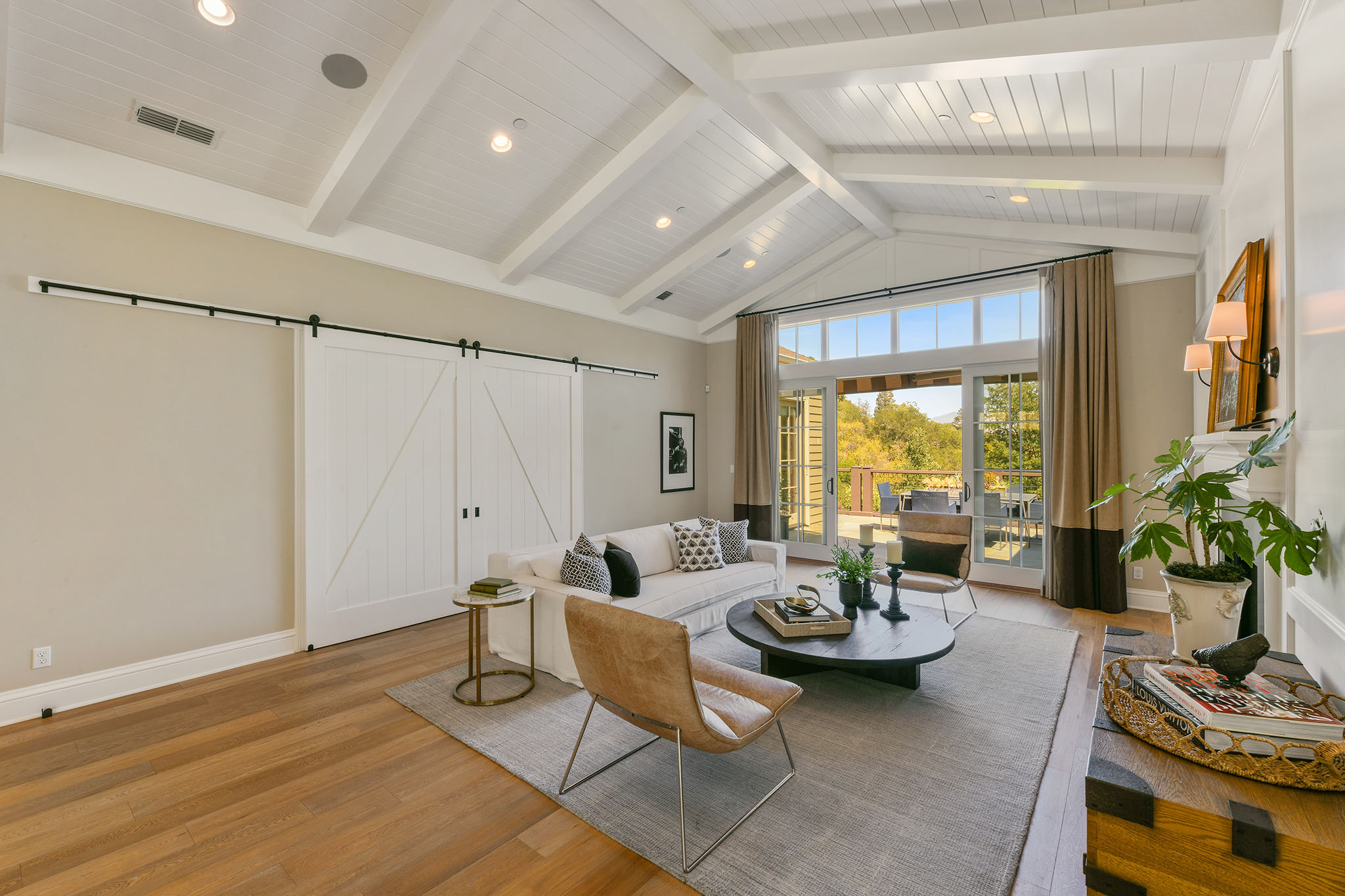 The gorgeous living room with fireplace, boxed beam cathedral ceiling and oversized hanging barn doors lead to an outdoor deck surrounded by trees and views of Mount Diablo. Enjoy dinner in the formal dining room with classic waist-high wainscoting while taking in grand views. Adjacent is a gourmet chef’s eat-in kitchen/great room with beautiful white cabinetry, granite countertops with custom designed backsplash, an oversized island with double hung pendant lighting. Gather in the adjacent family room as meals are prepared and conversations are had with friends and family and enjoy the garden views and access to the spacious deck These formal and casual spaces are perfect for indoor/outdoor entertaining.;;