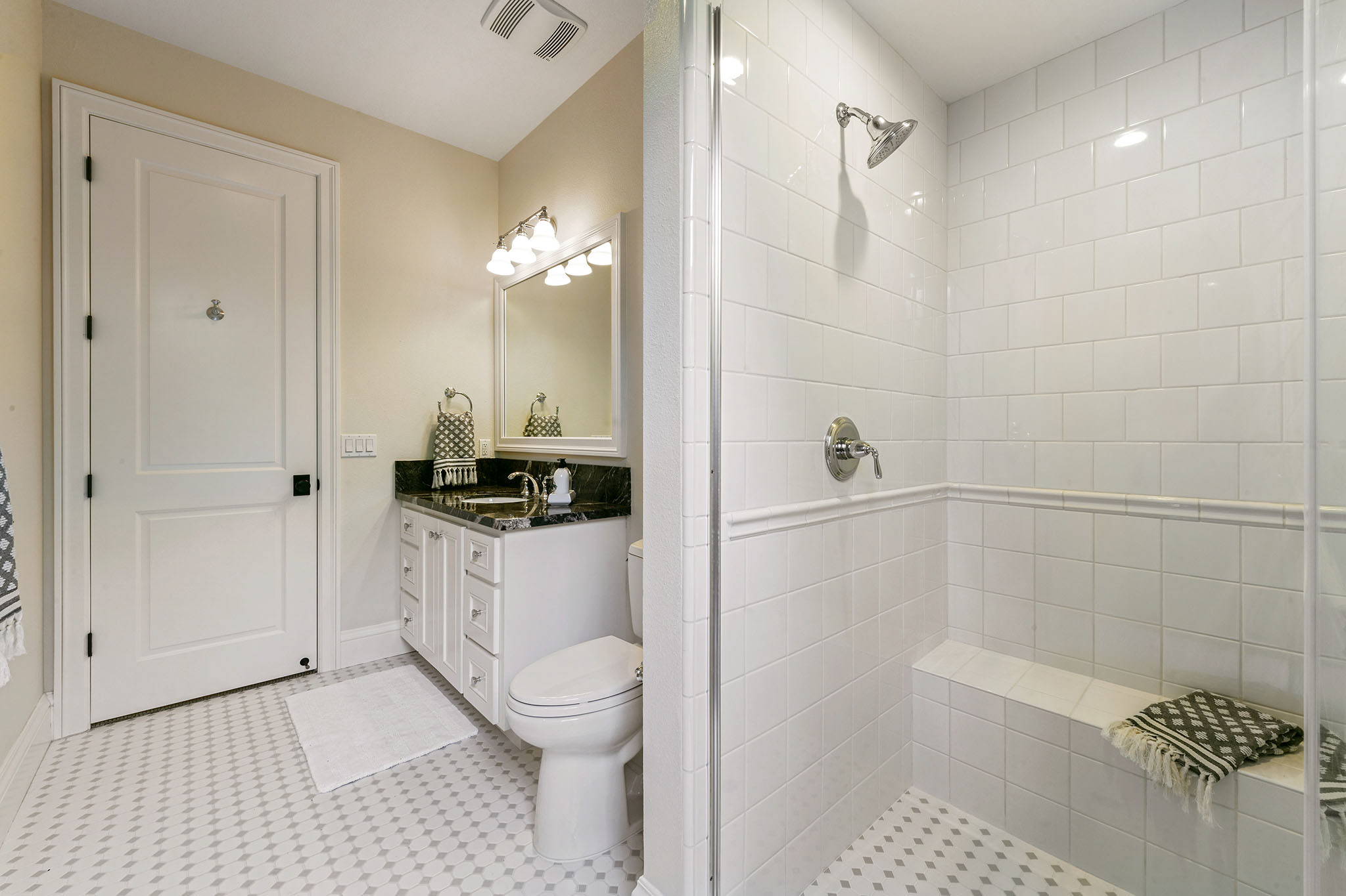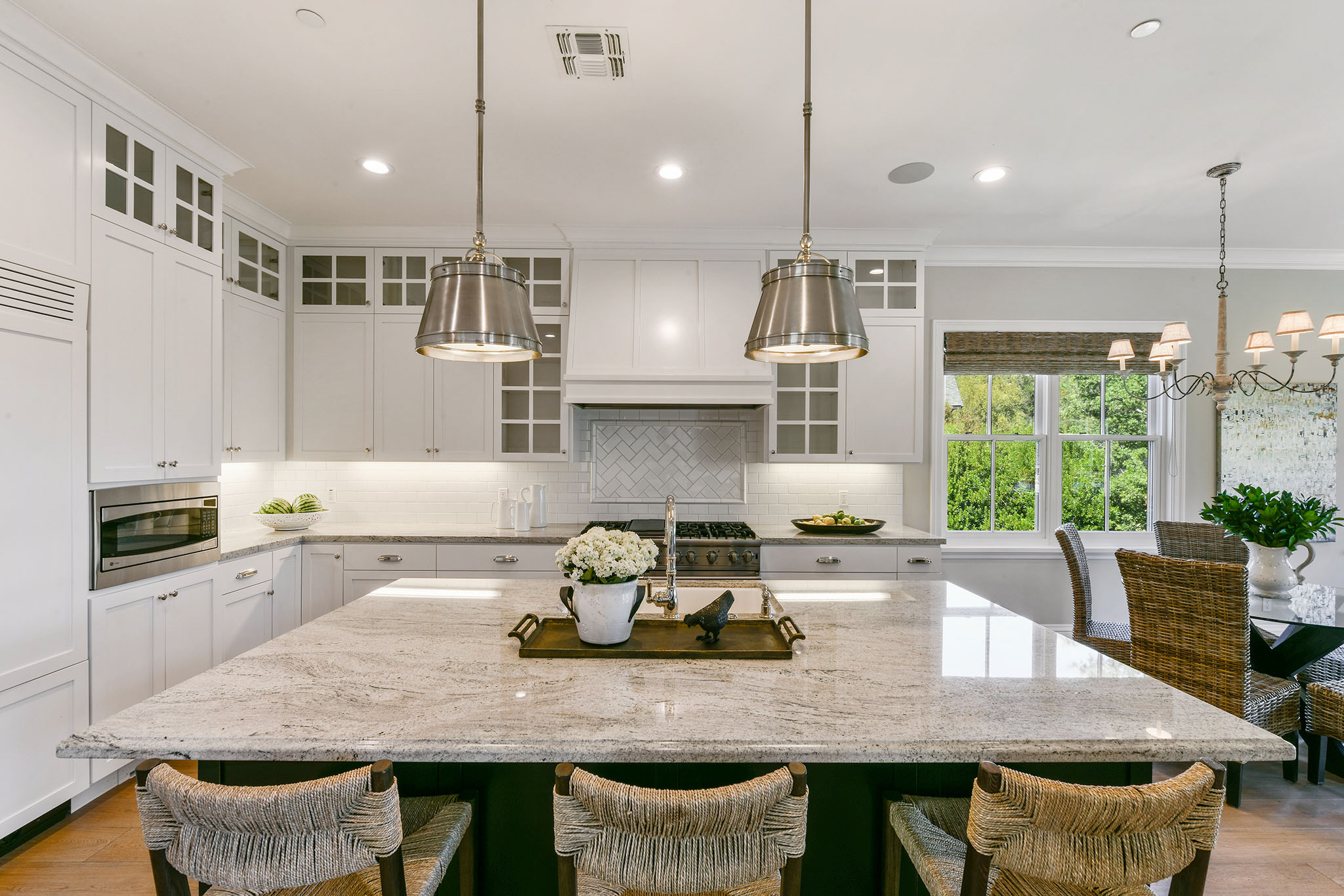 - Granite kitchen counters with ceramic herringbone backsplash;