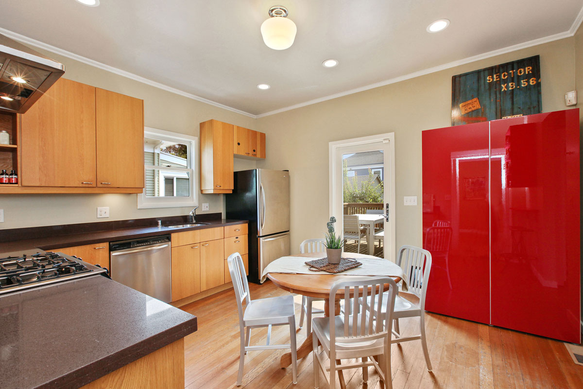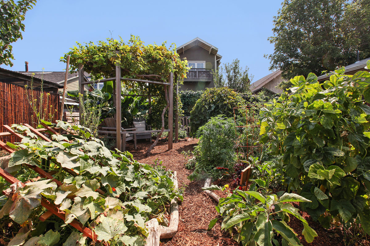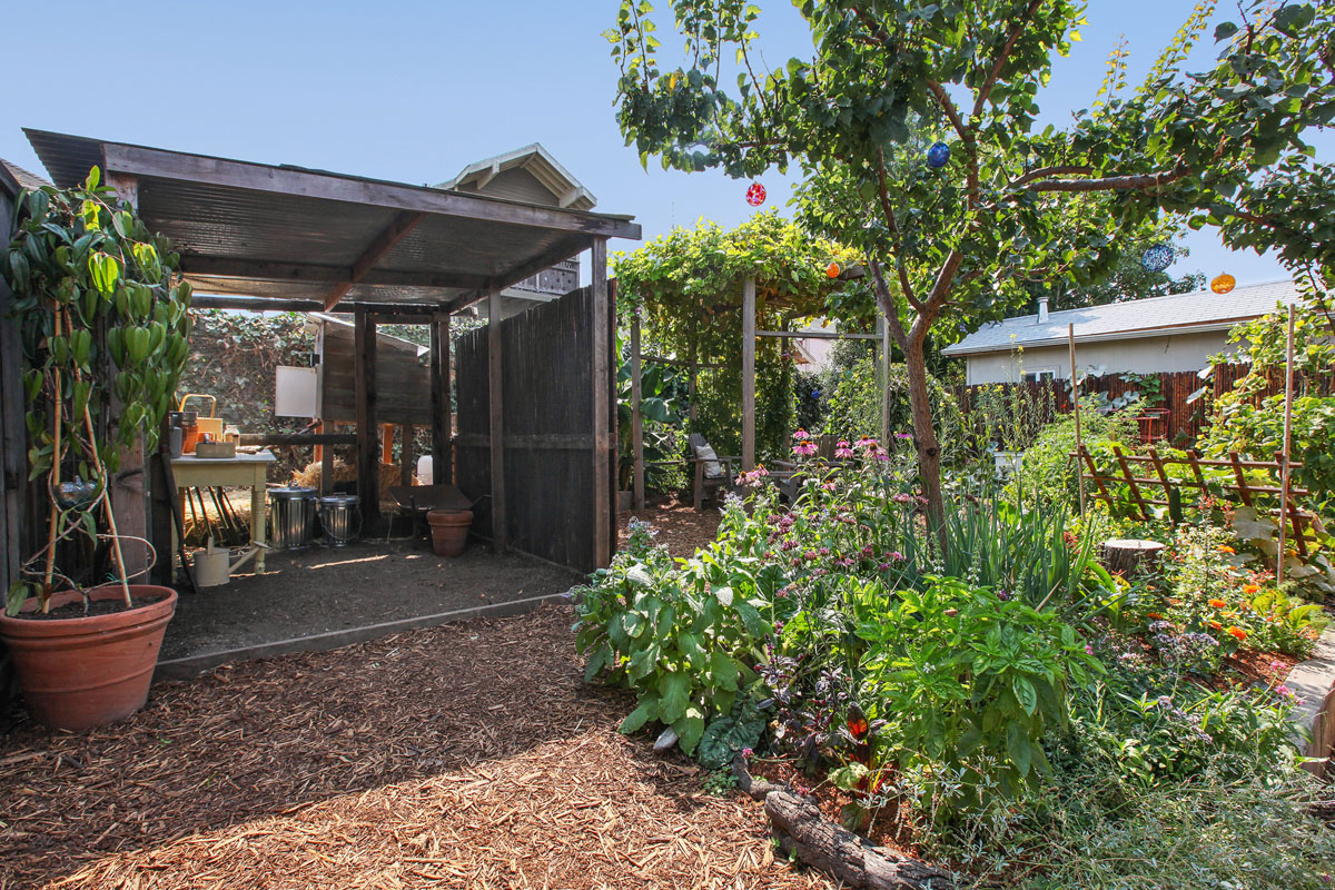 The south facing Redwood deck off the kitchen is nestled into an enchanting back yard that is a downright edible masterpiece. Stroll around the thoughtfully planted, natural bounty; in sections, one finds a variety of vegetables, cooking herbs, grapes, citruses, and native flowers to name a few. To help pollinate;everything;there is a beehive. On the opposite end of the yard there is an active;chicken coop complete with 4 healthy (and extremely cute) chickens. Did someone say fresh eggs?