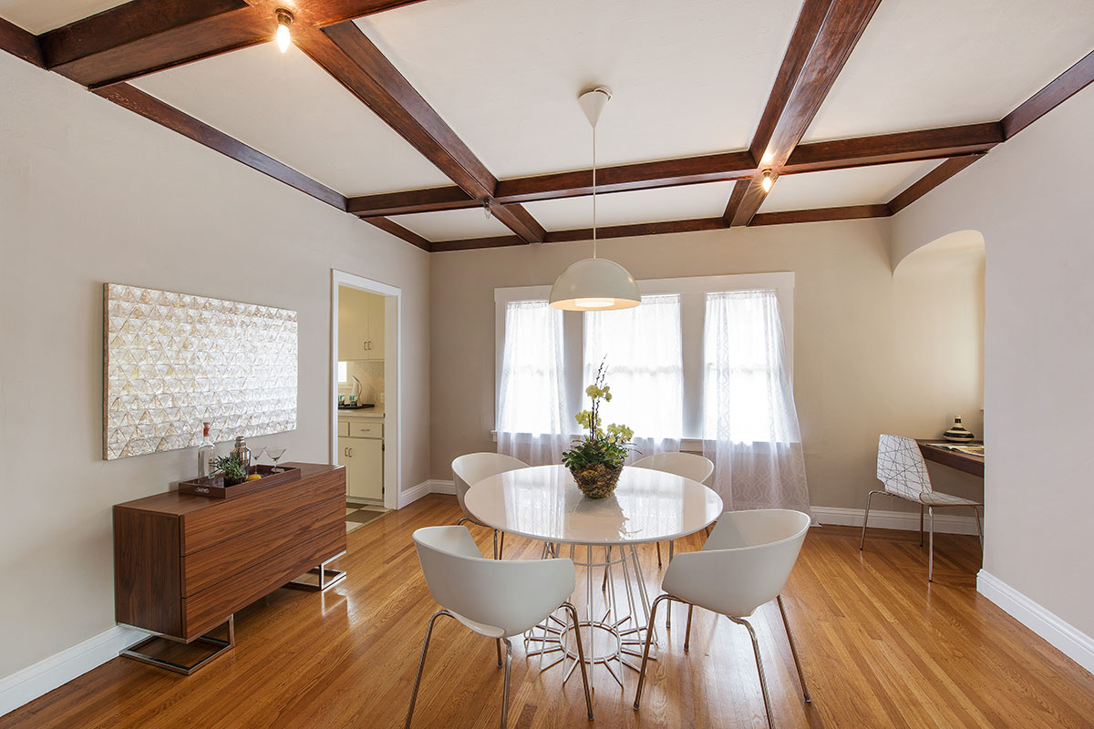 This 2 bed 1 bath with hardwood floors has a large living room, a wood burning;fireplace and an office nook.; An exposed box beam ceiling in the dining room that is roomy enough for entertaining.;Updated bath with a tub. Well sized eat-in kitchen. 2 bedrooms with windows that face south/west.; Outside is accessed off kitchen and flows easily;onto the sunny, private yard and patio. Laundry room. Interior garage and storage.;