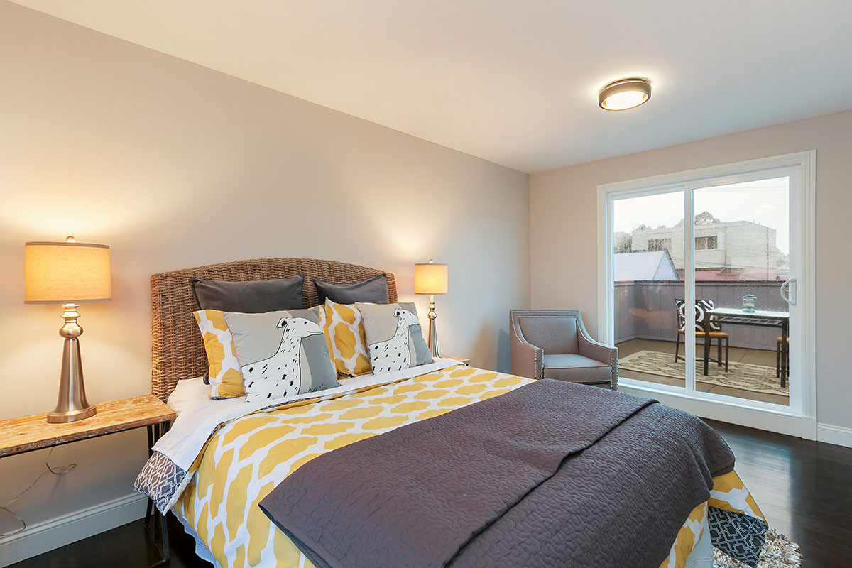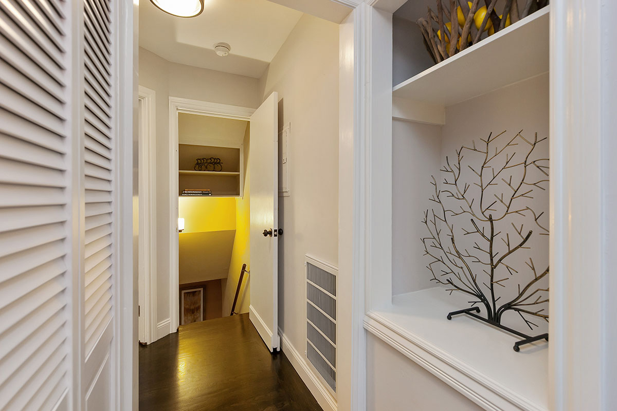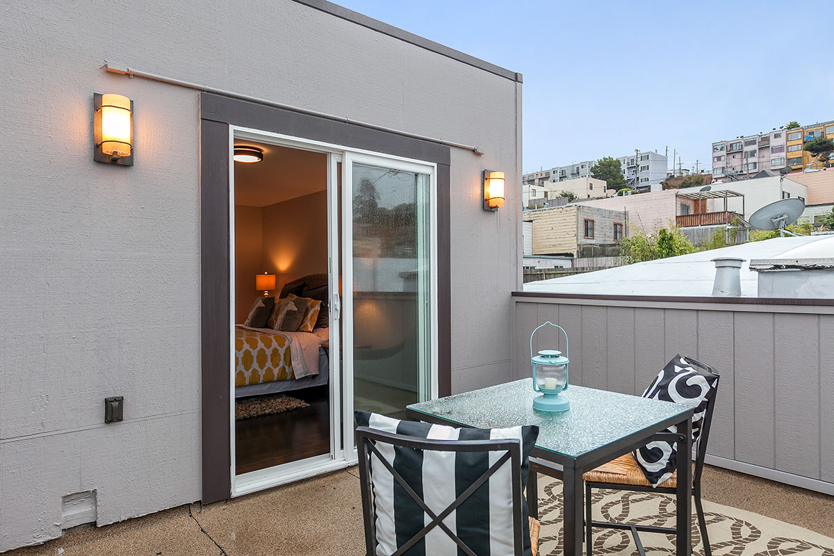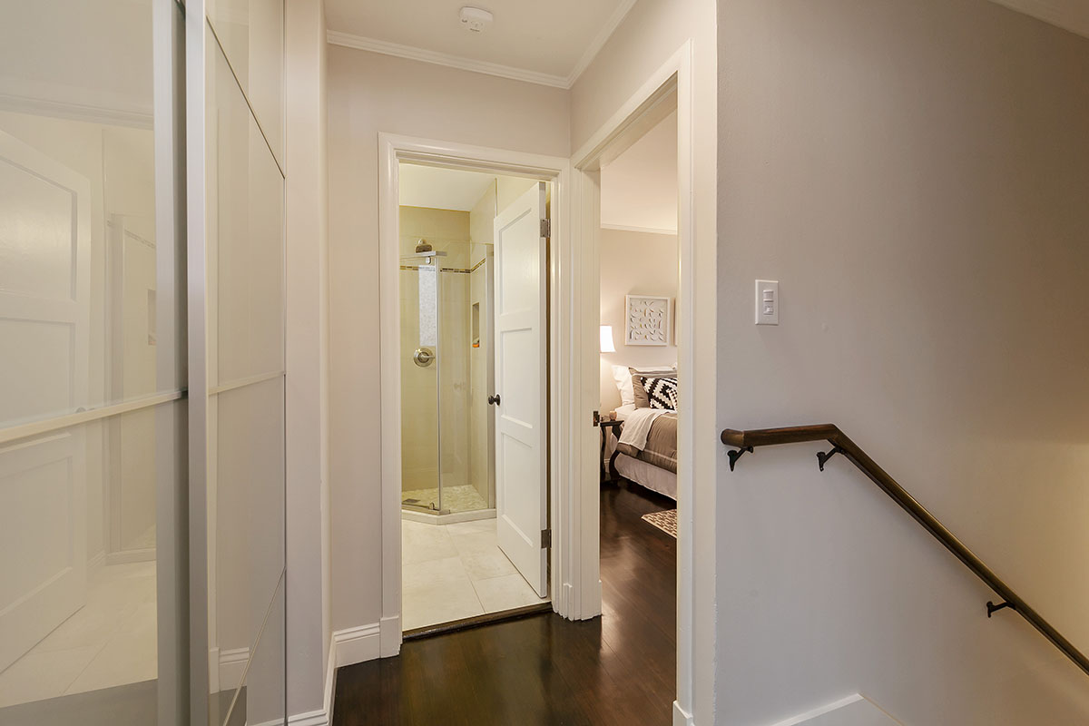 Sweeping broad stairs lead around and up to the upper level - with two additional bedrooms, a mod hall closet with frosted-glass sliding doors, and a fully outfitted bath. The master bedroom features a walk-in closet and a private roof deck with views of the city.